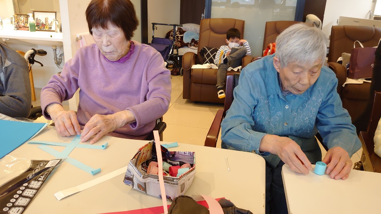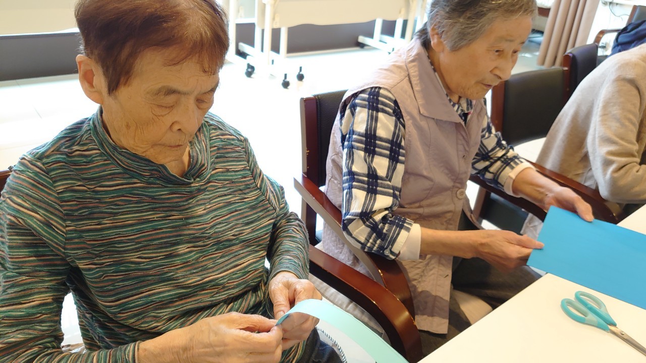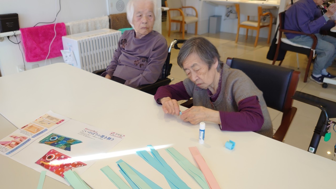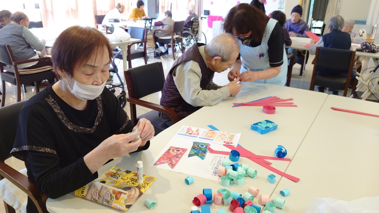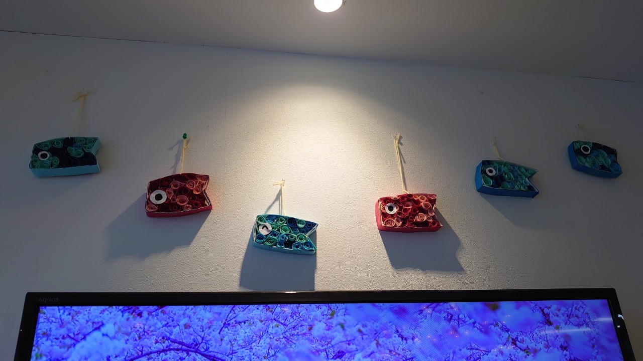 本日から5月です。デイサービスの壁画アートも季節ごとに変わります。今月のテーマはこいのぼりです。画用紙の短冊をくるくる巻いて、うろこを作ります。デイサービスの利用者さまがお作りになられ、もくもくと作業をされているときはまるでカニを食べているような静かさで集中されていました。大雑把な私が作るとうろこの枚数の少ないこいのぼりになるんだろうな~w