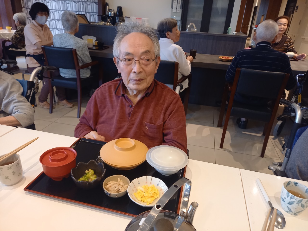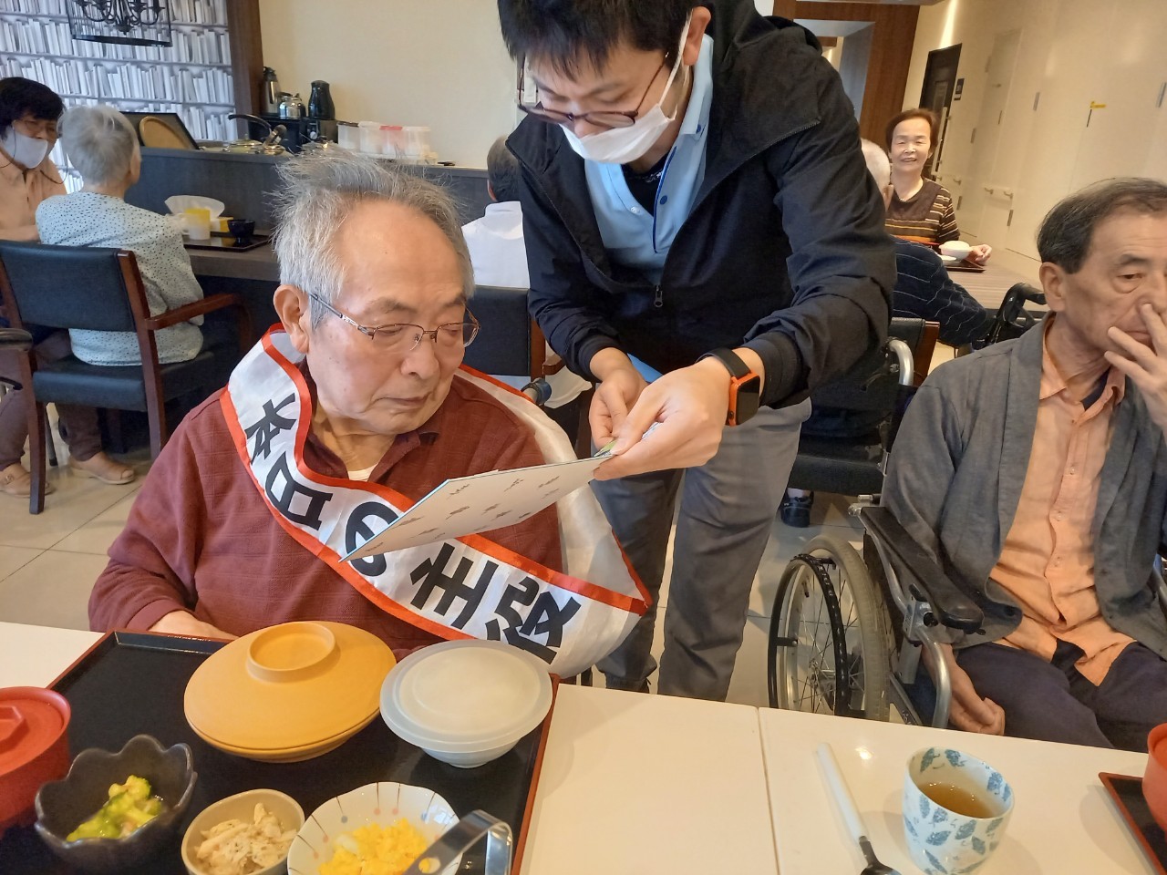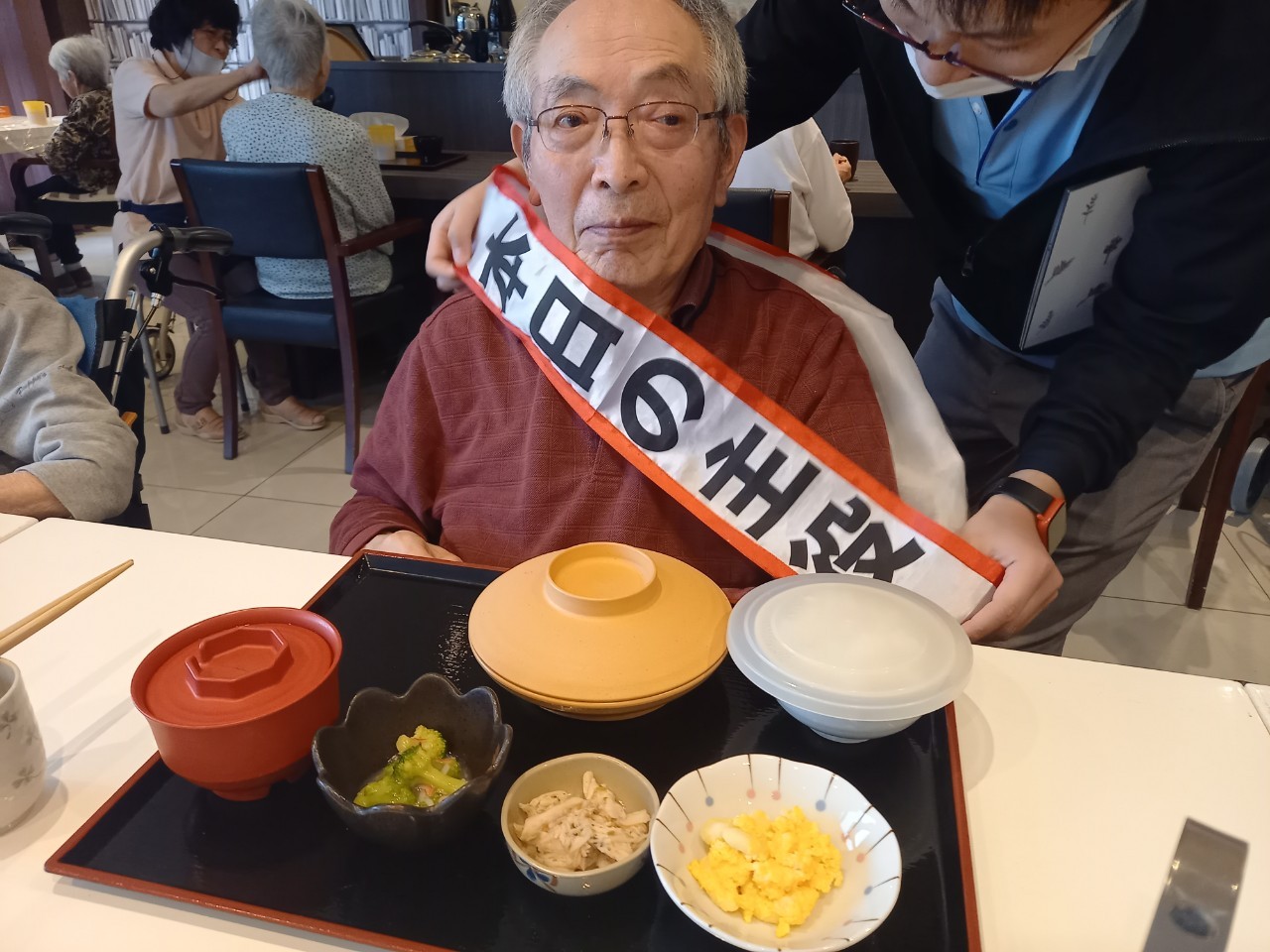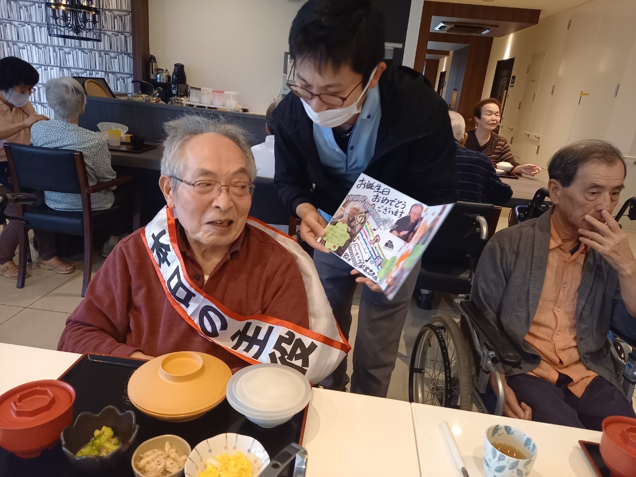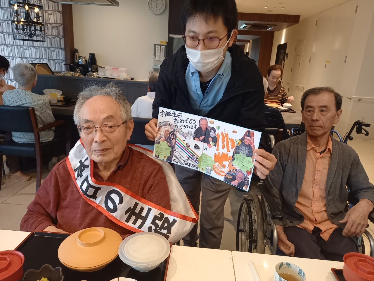 本日は男性の入居者様のお誕生日です。普段は歩くリハビリを頑張っておられ、お誕生日の記念スピーチでもリハビリについてお話いただきました。いつまでもお元気にお過ごしください(^^♪