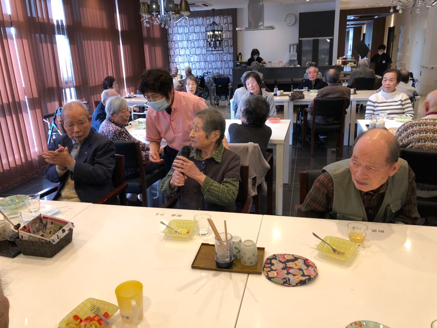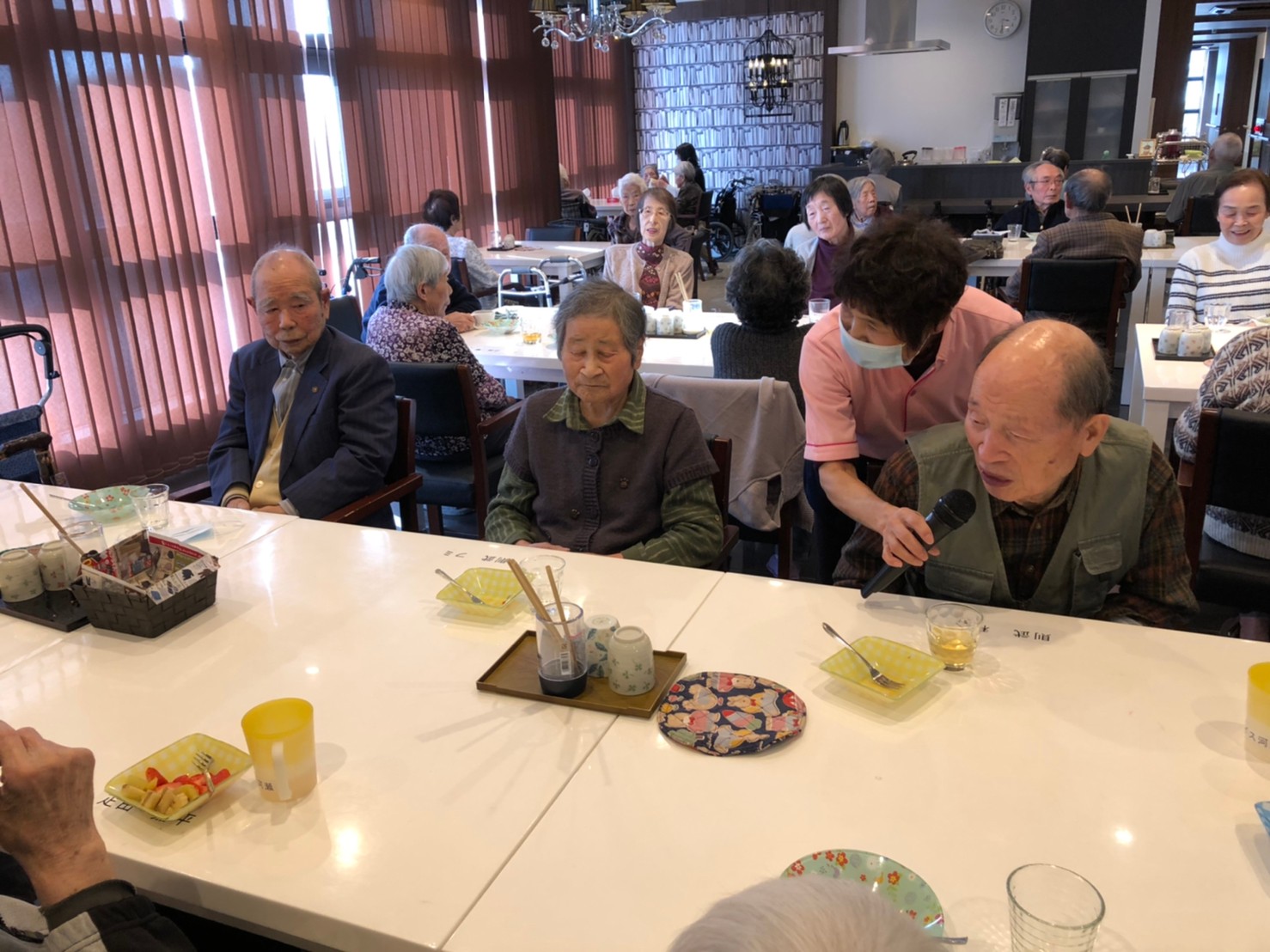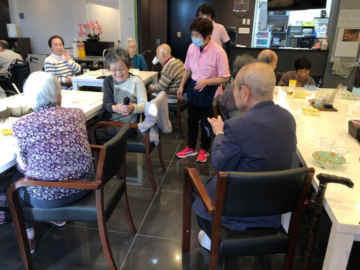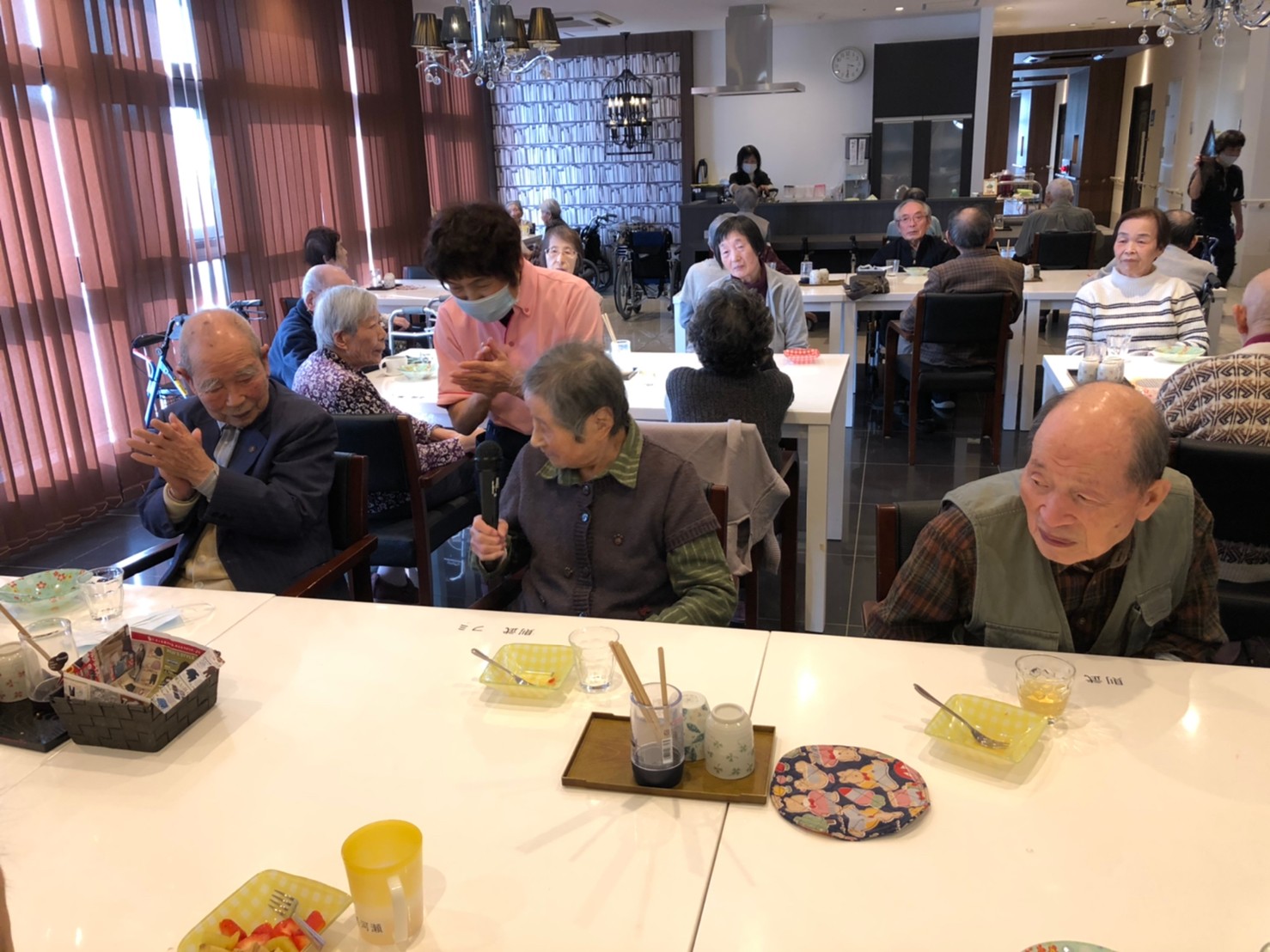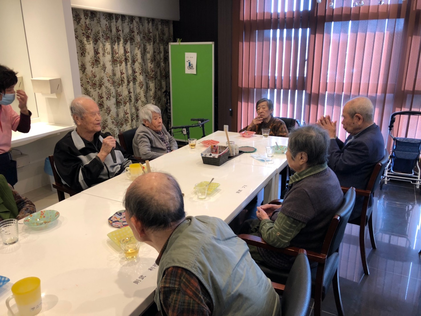 本日よりサニープレイス河瀬に新しいご入居者が増えました。九州のご出身の利用者さまは同県の出身の利用者さまと、スタッフとすぐに打ち解けておられました。最初こそ緊張されていましたが、ウェルカムパーティーが始まりカラオケ大会になるころにはすっかり普段のお姿でお話されておられました。これからも穏やかにお過ごしされるお手伝いを末永くさせていただきます。よろしくお願い致します。