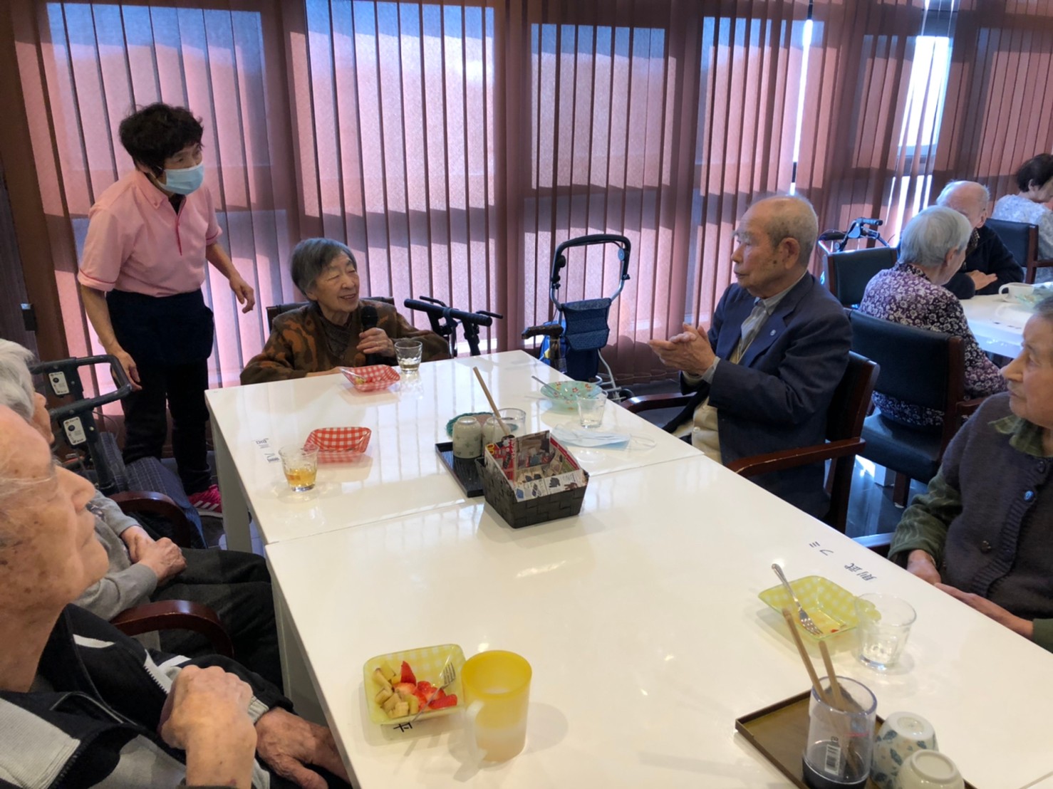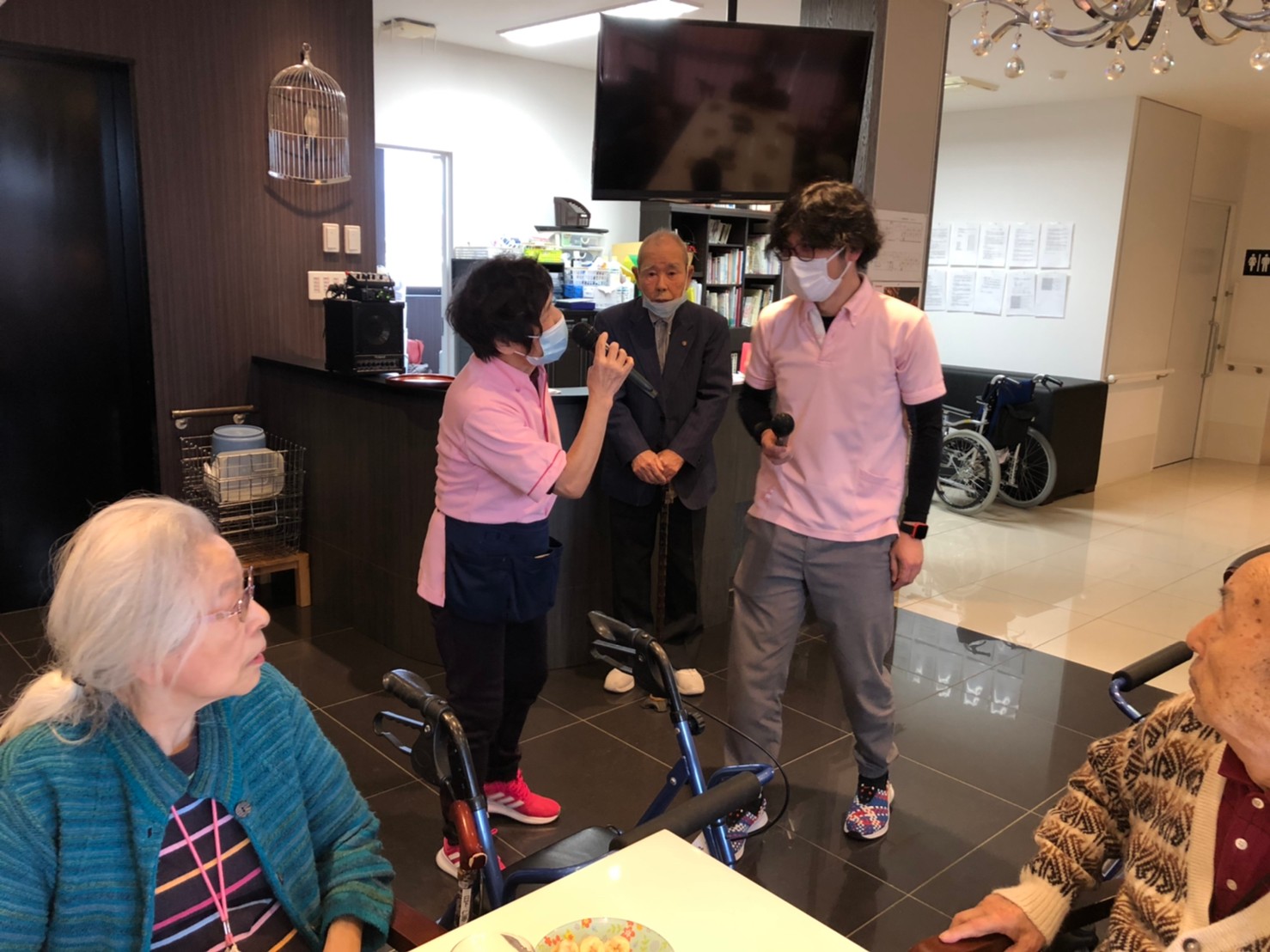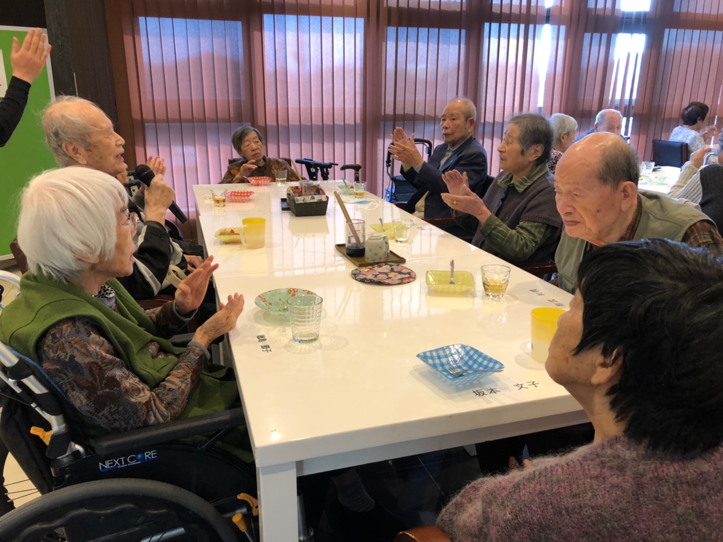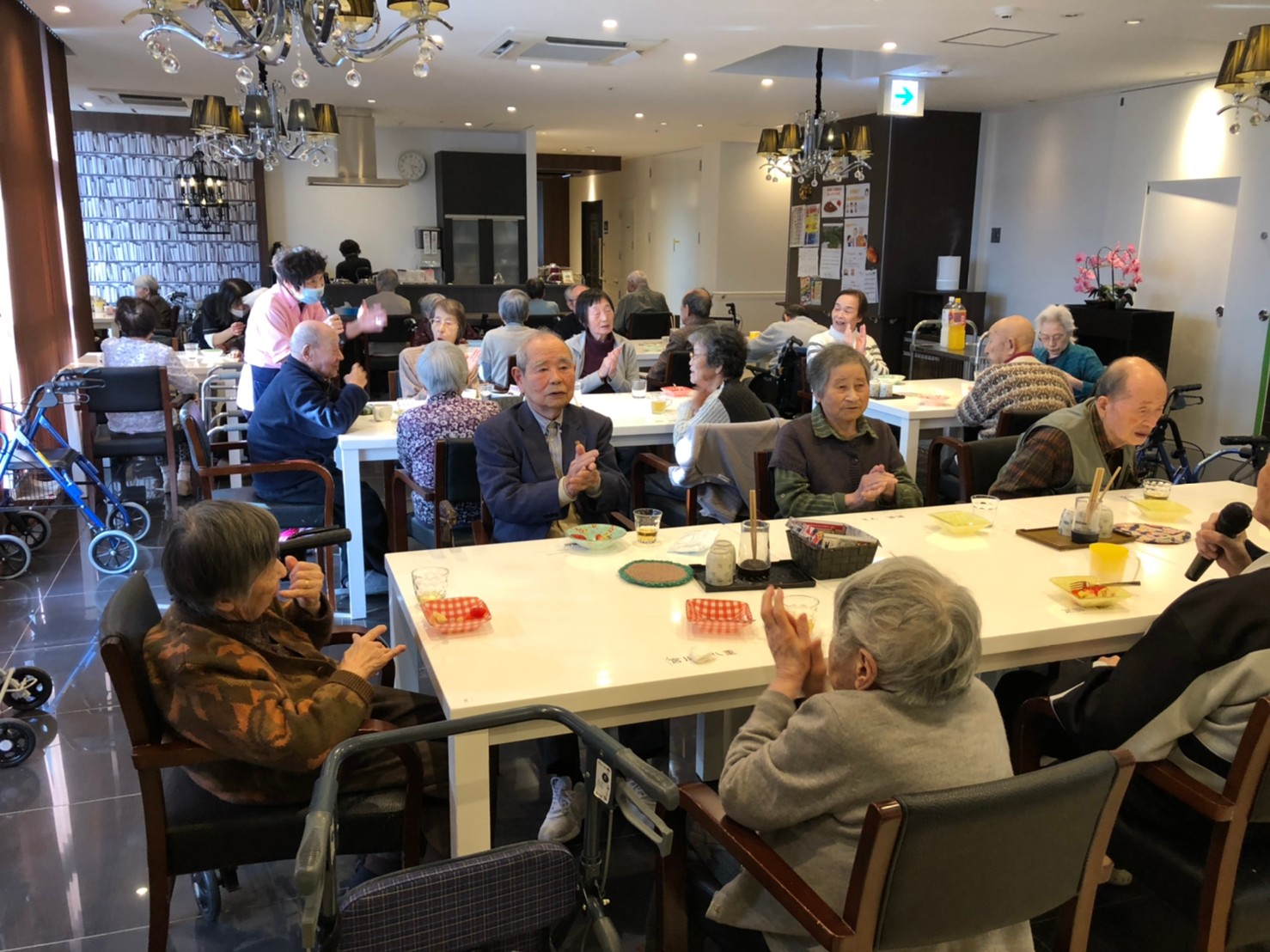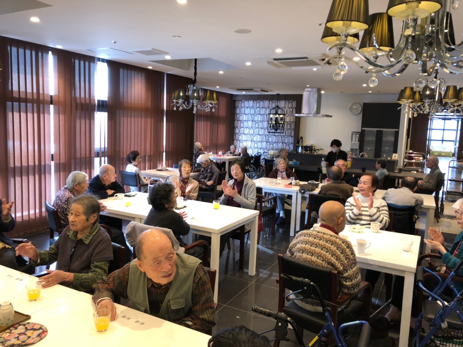本日よりサニープレイス河瀬に新しいご入居者が増えました。九州のご出身の利用者さまは同県の出身の利用者さまと、スタッフとすぐに打ち解けておられました。最初こそ緊張されていましたが、ウェルカムパーティーが始まりカラオケ大会になるころにはすっかり普段のお姿でお話されておられました。これからも穏やかにお過ごしされるお手伝いを末永くさせていただきます。よろしくお願い致します。