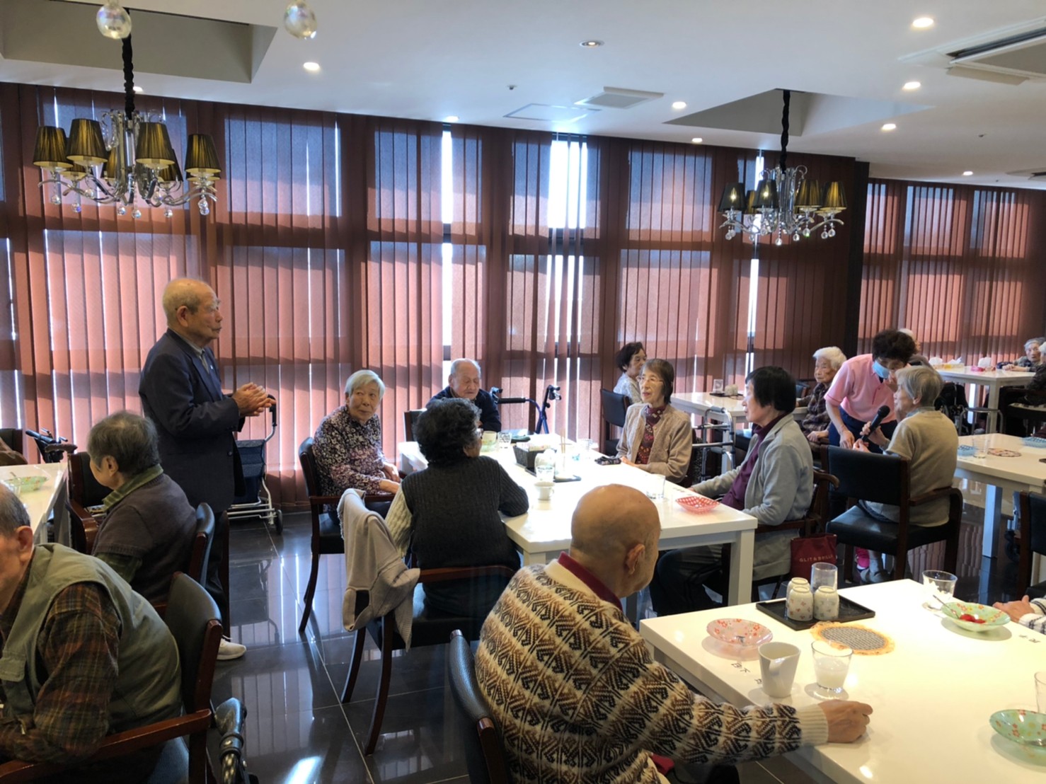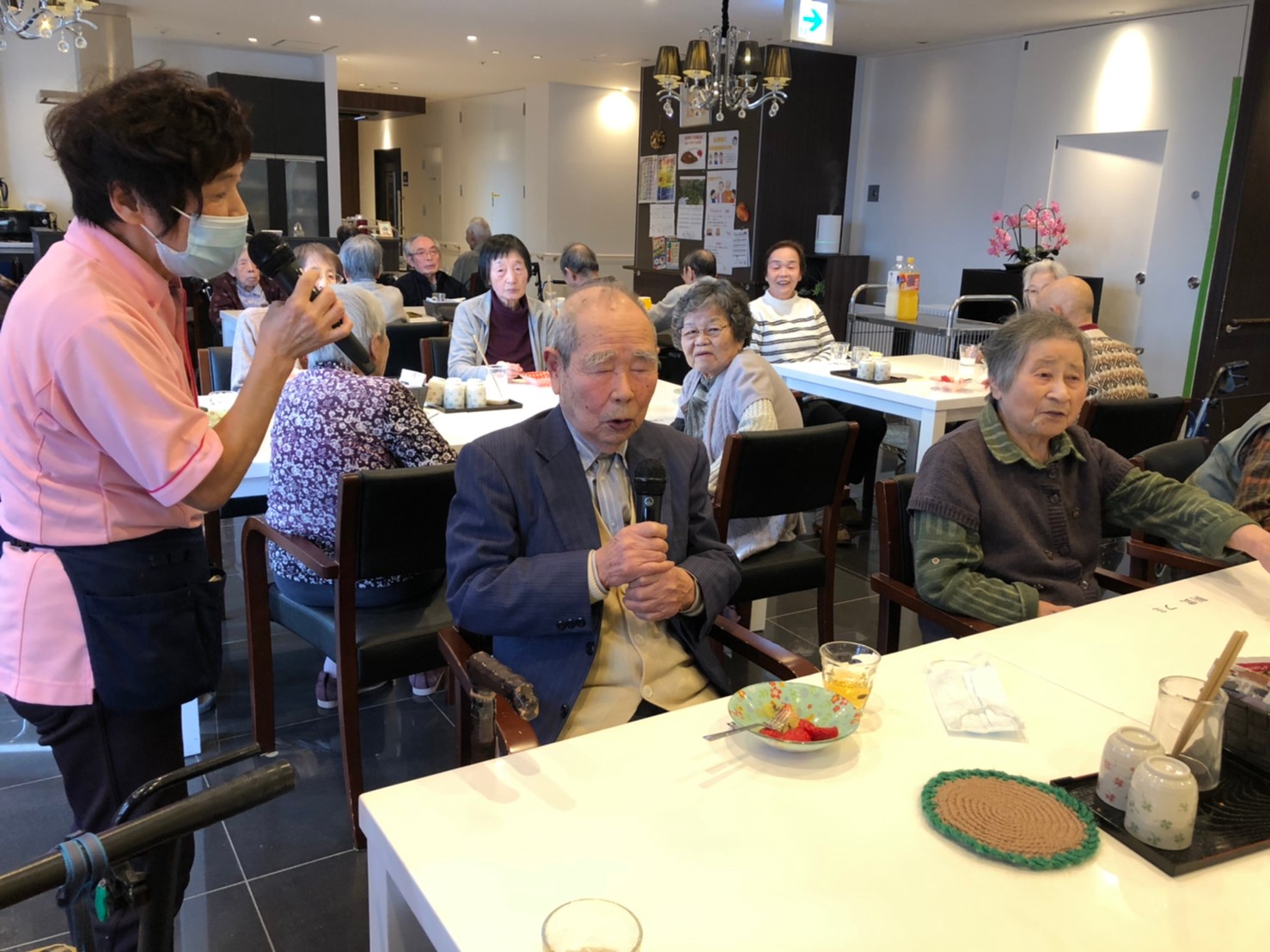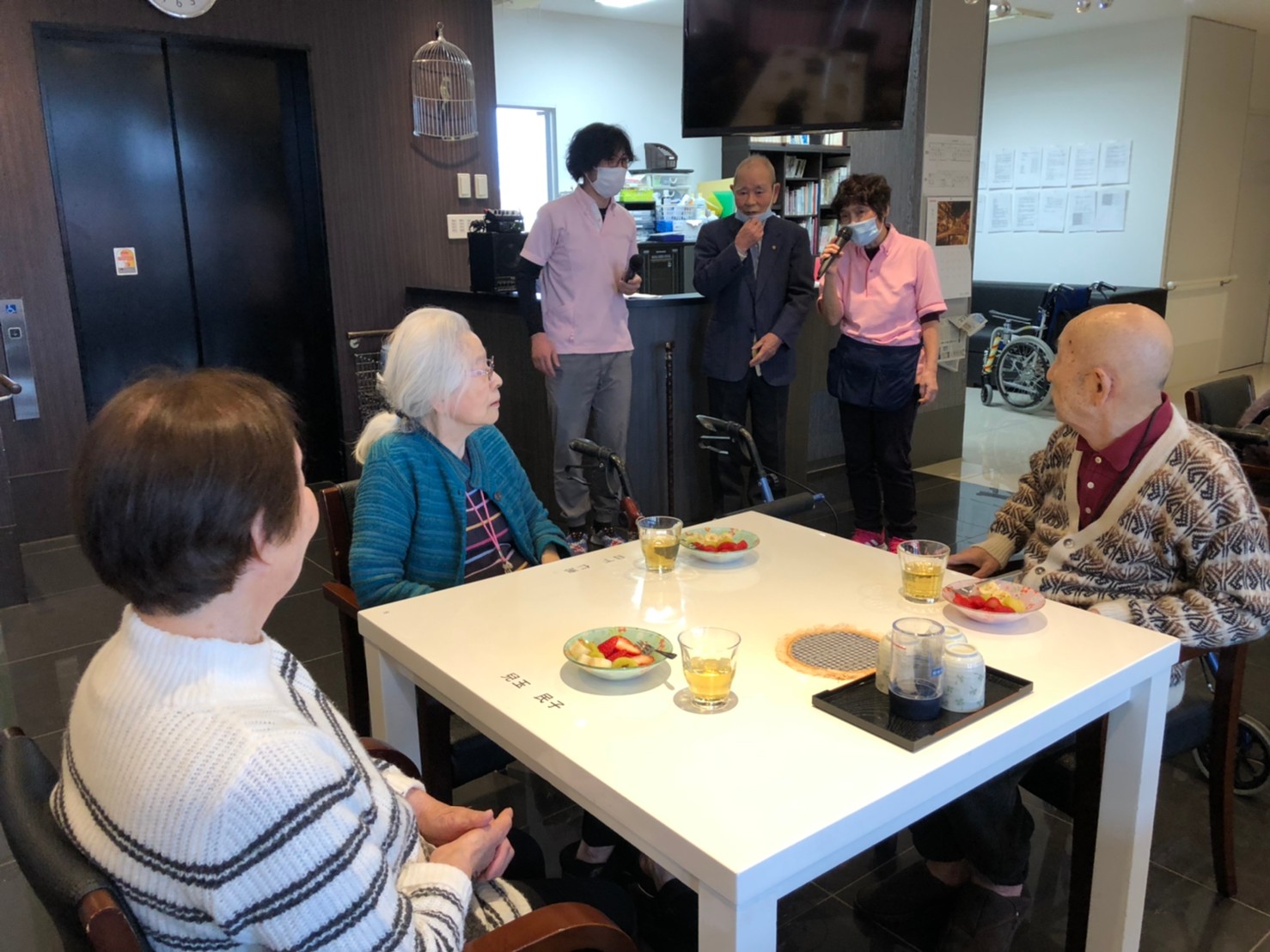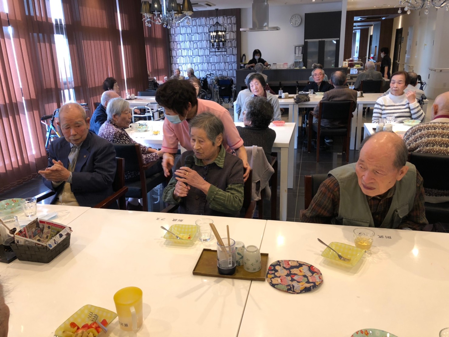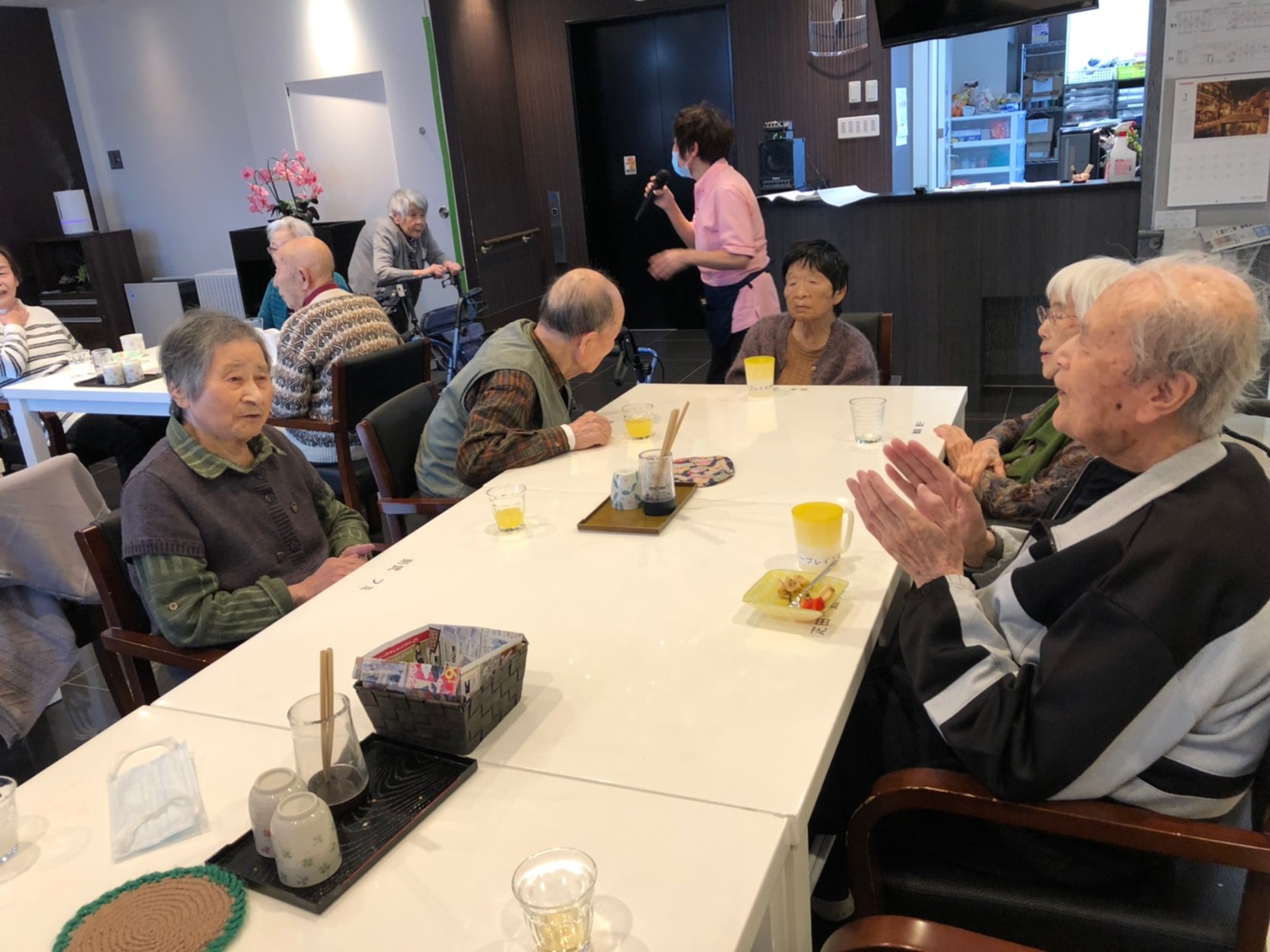 本日よりサニープレイス河瀬に新しいご入居者が増えました。九州のご出身の利用者さまは同県の出身の利用者さまと、スタッフとすぐに打ち解けておられました。最初こそ緊張されていましたが、ウェルカムパーティーが始まりカラオケ大会になるころにはすっかり普段のお姿でお話されておられました。これからも穏やかにお過ごしされるお手伝いを末永くさせていただきます。よろしくお願い致します。