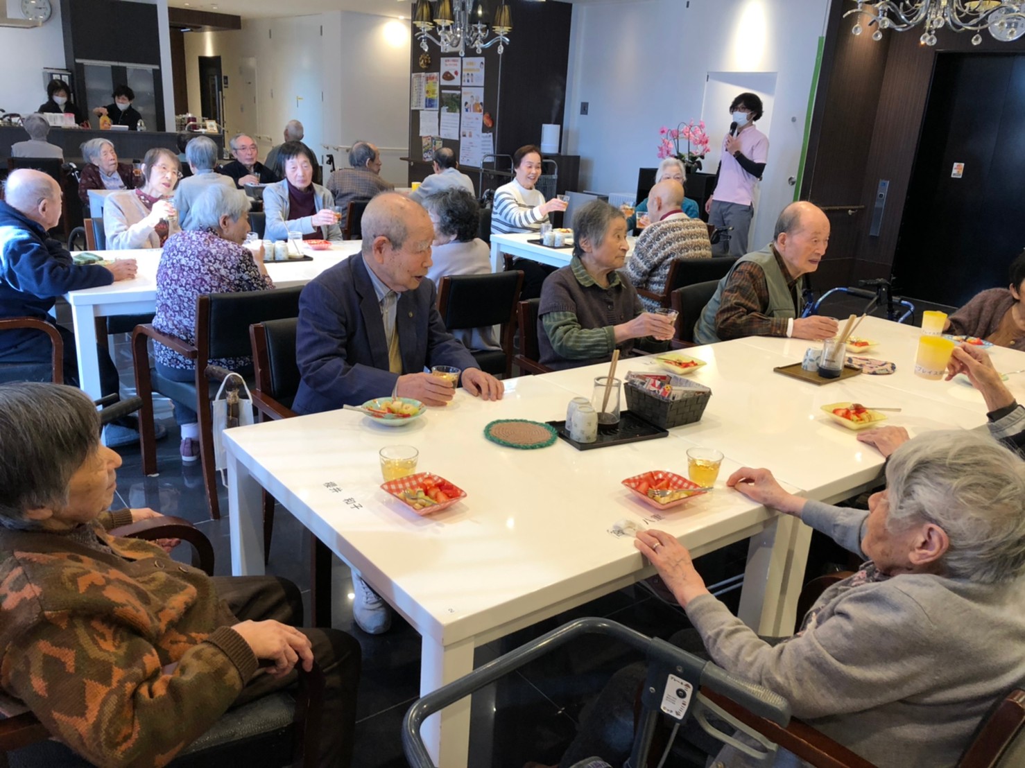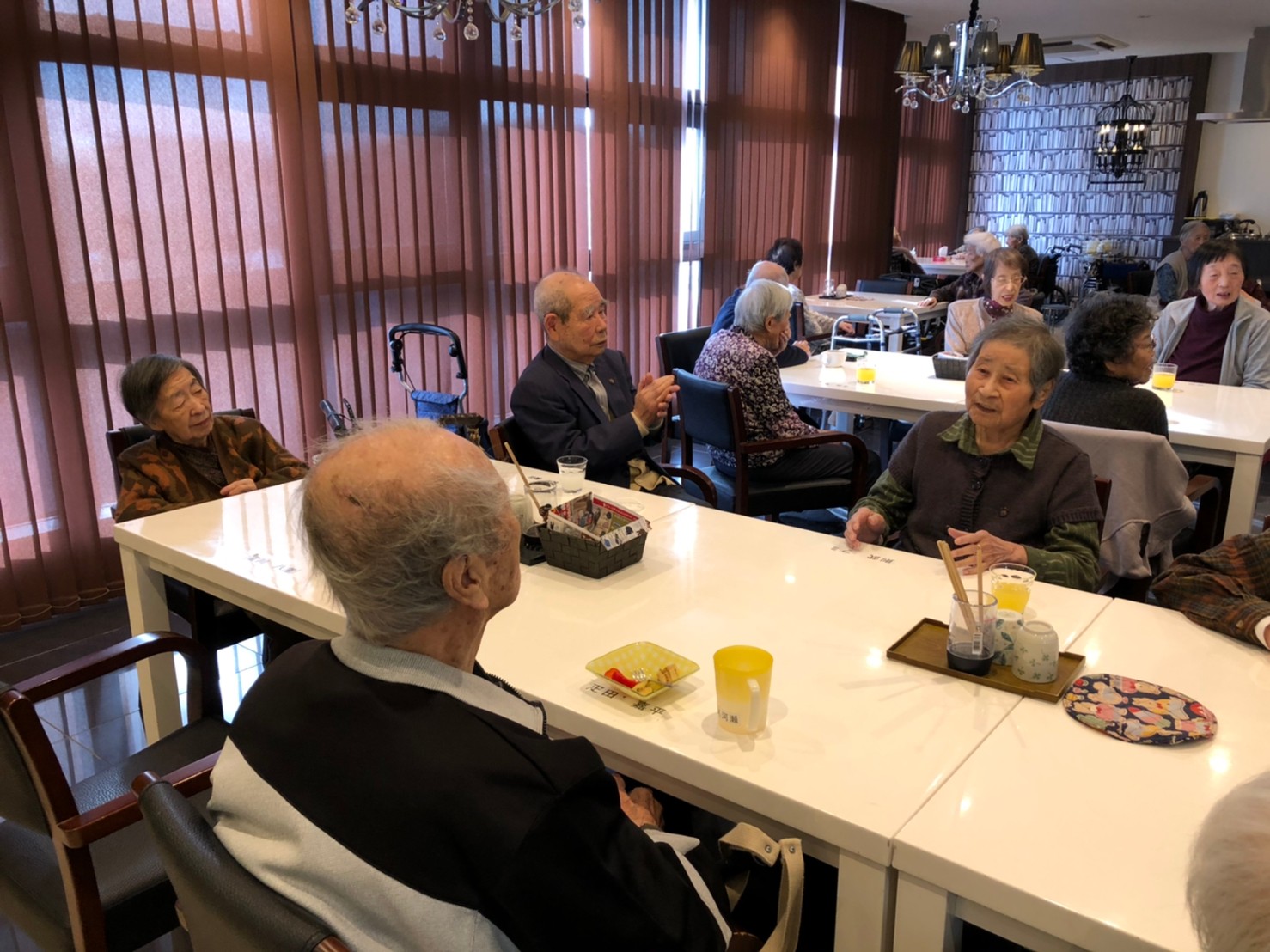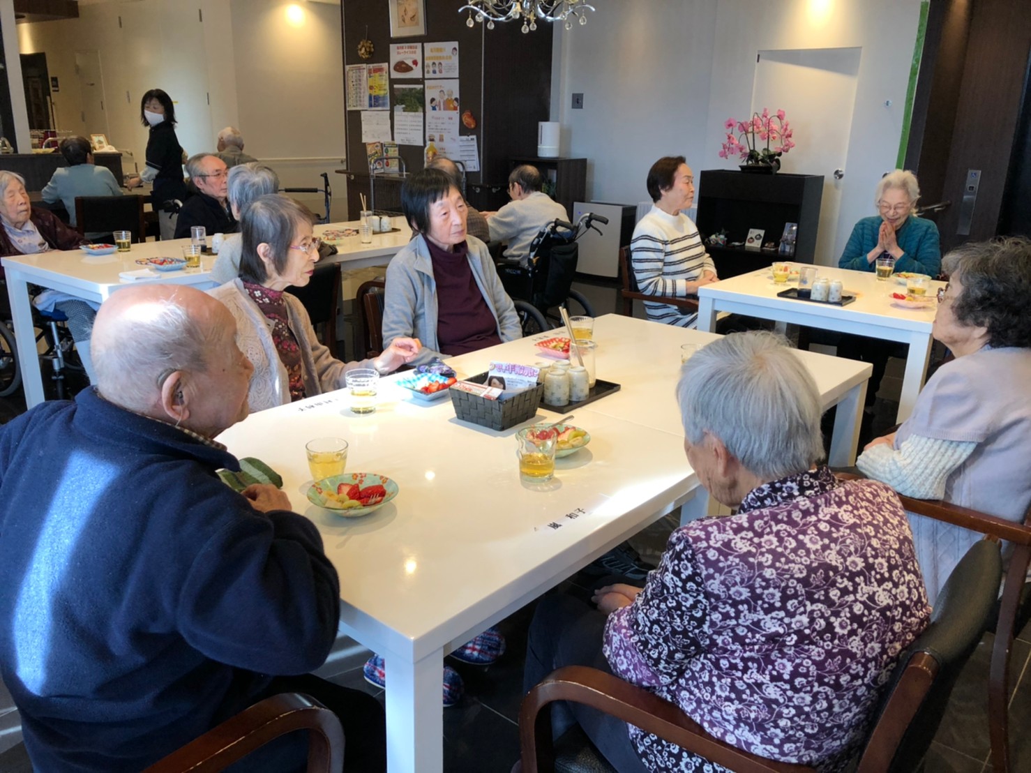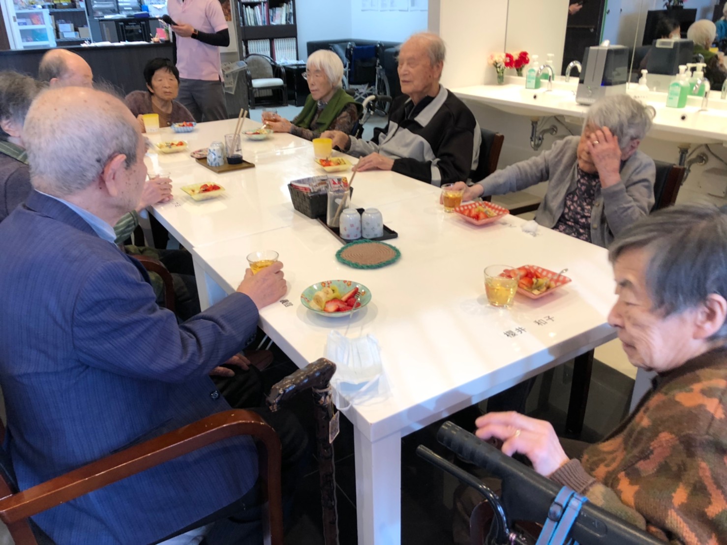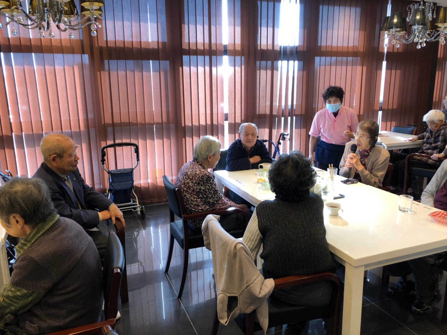 本日よりサニープレイス河瀬に新しいご入居者が増えました。九州のご出身の利用者さまは同県の出身の利用者さまと、スタッフとすぐに打ち解けておられました。最初こそ緊張されていましたが、ウェルカムパーティーが始まりカラオケ大会になるころにはすっかり普段のお姿でお話されておられました。これからも穏やかにお過ごしされるお手伝いを末永くさせていただきます。よろしくお願い致します。
