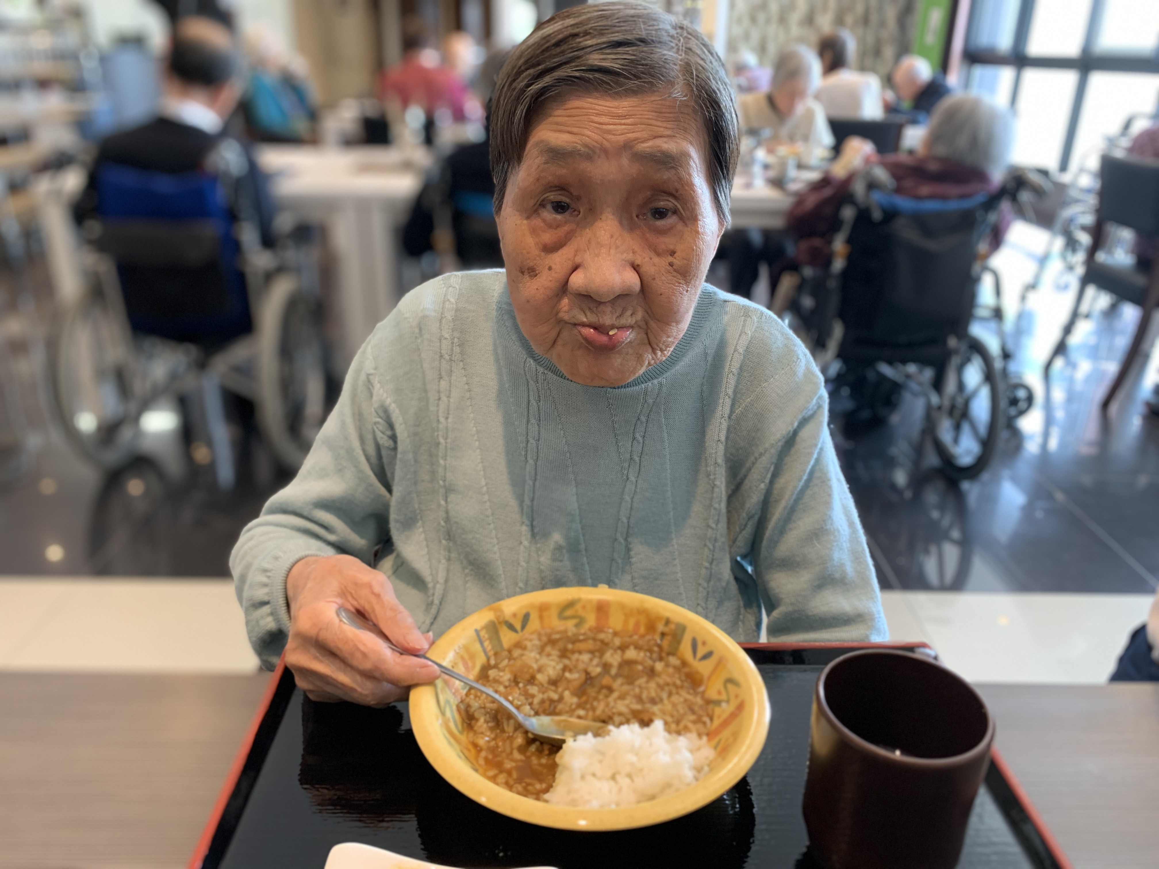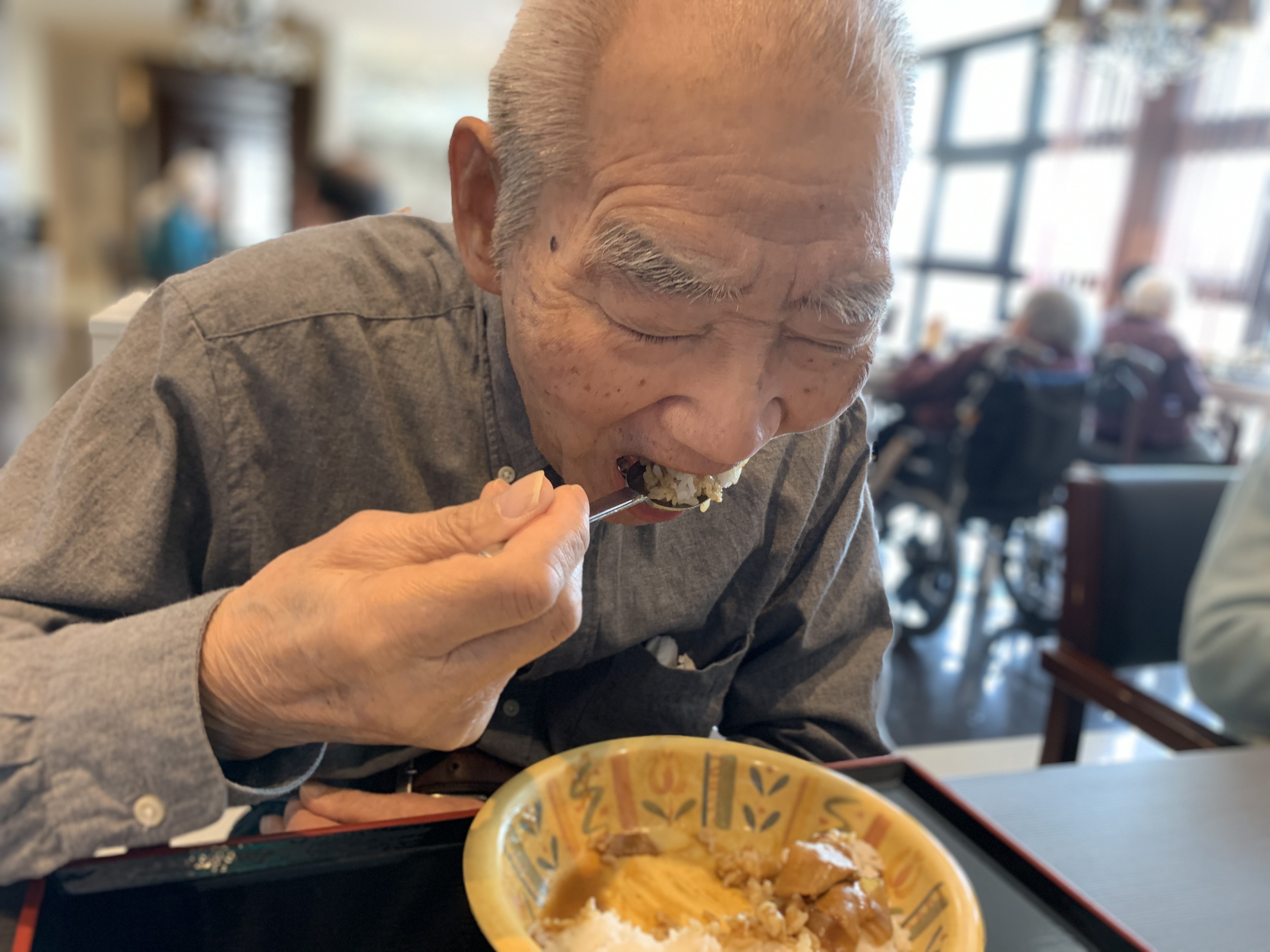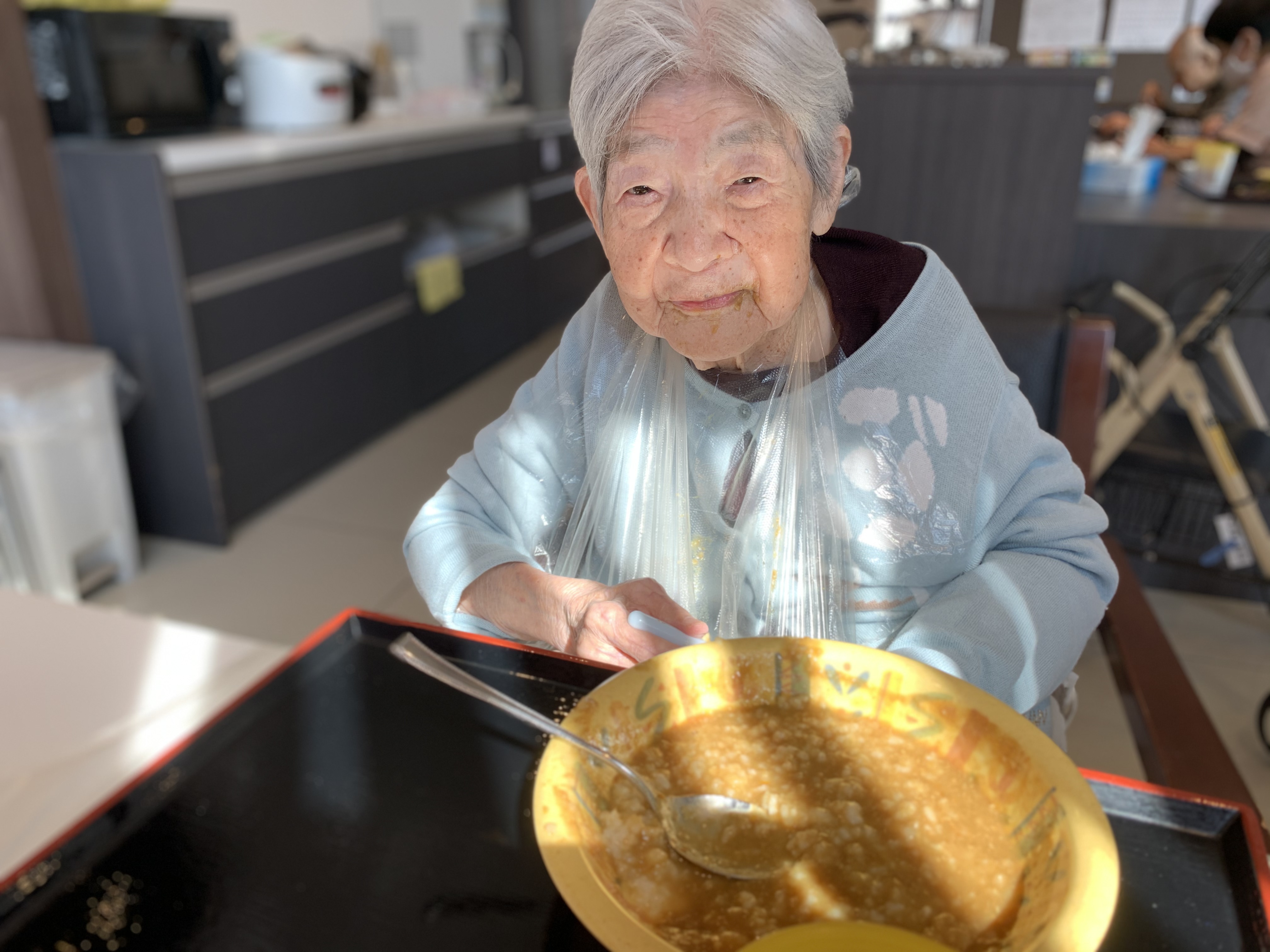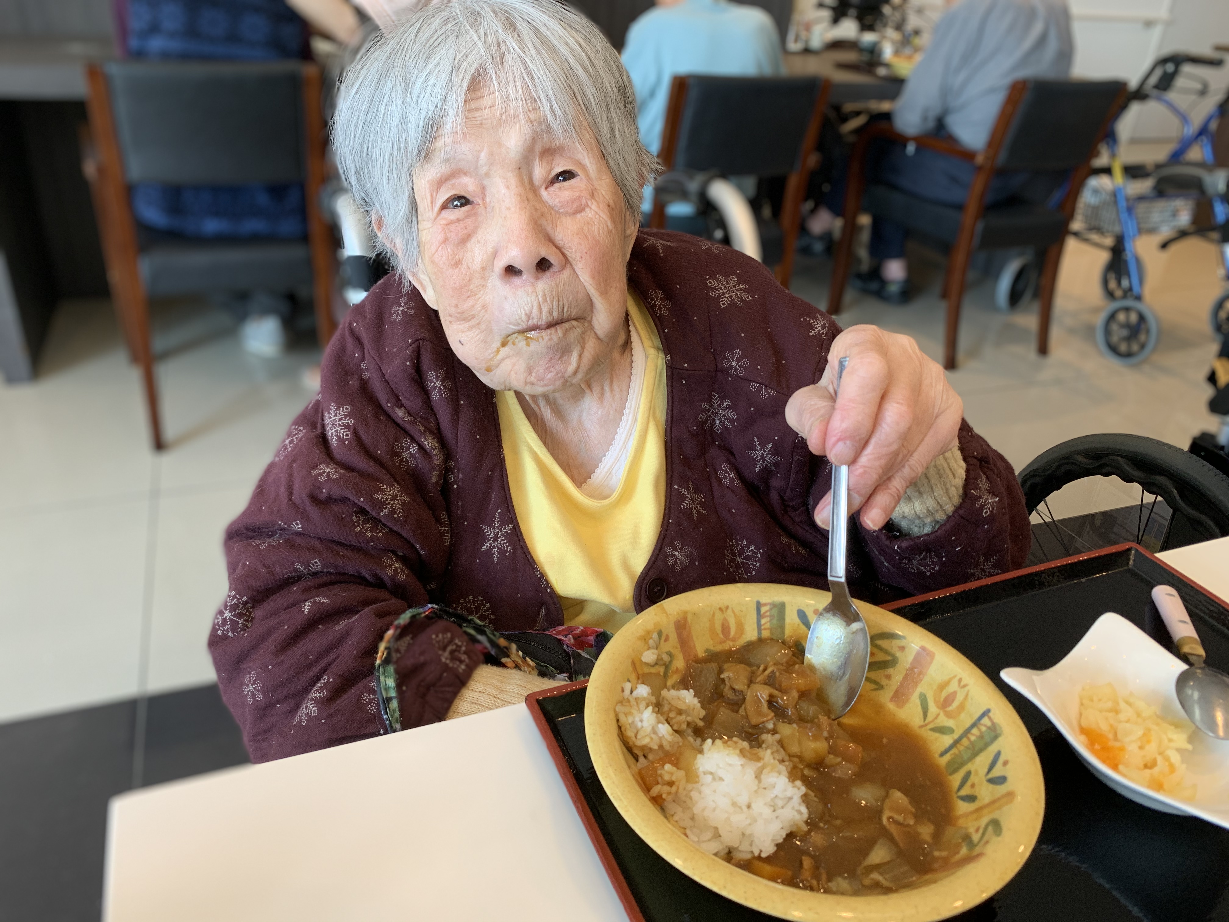 今日は手作りカレーの日です。利用者さまがお野菜を切っていただき、職員が煮込んだカレーを召し上がっていただきました。お味はお写真に写った表情が物語っております。