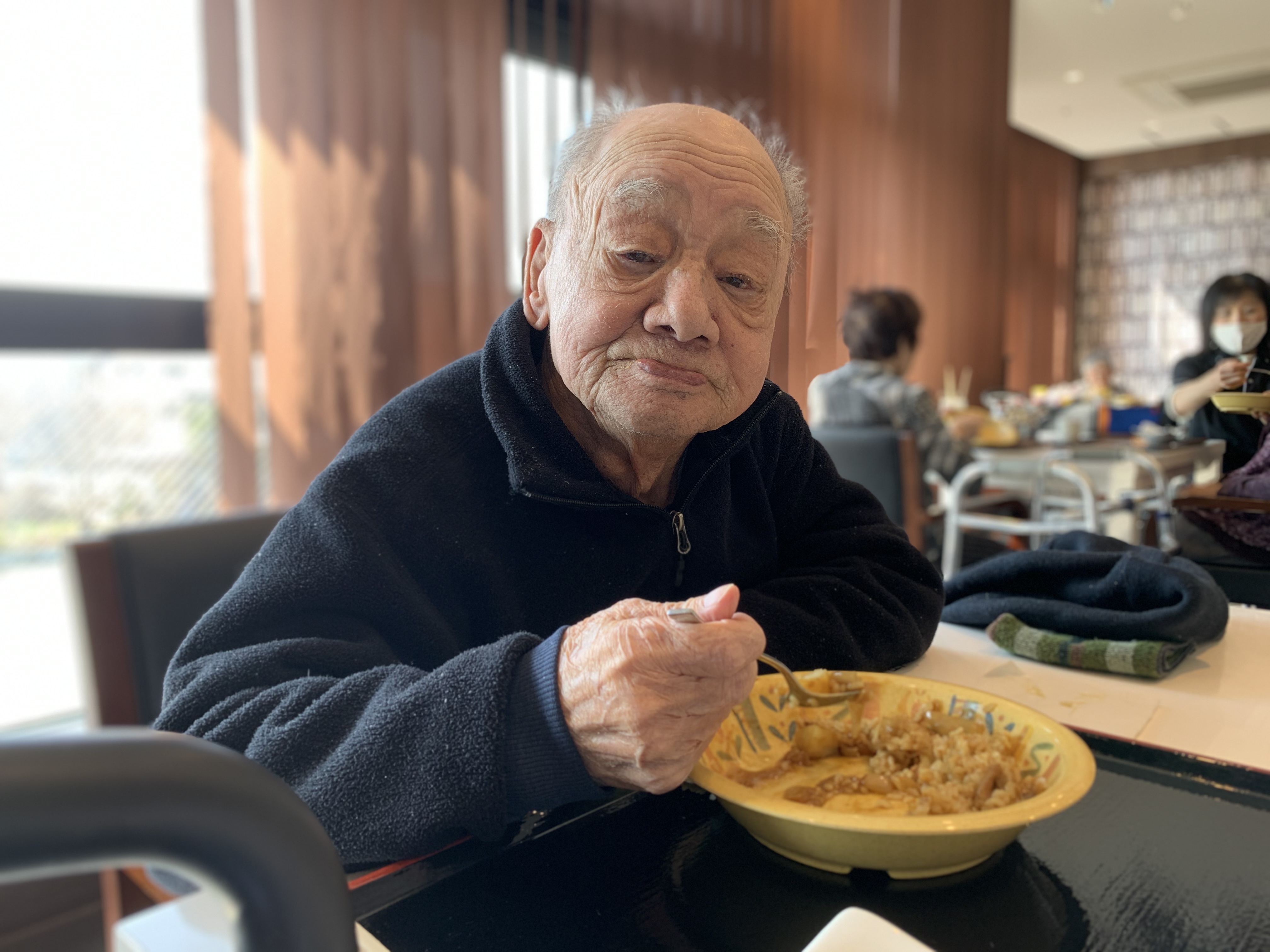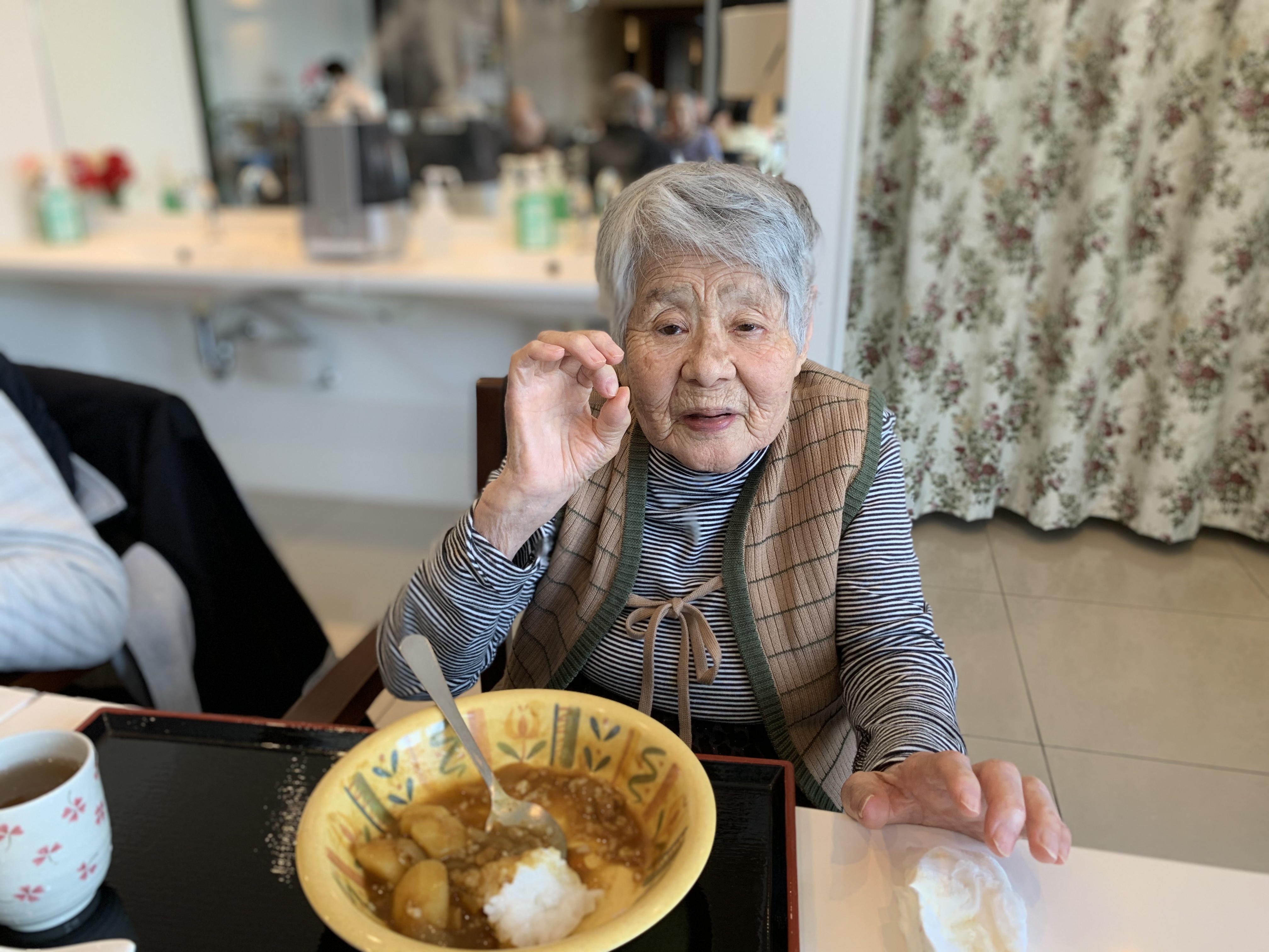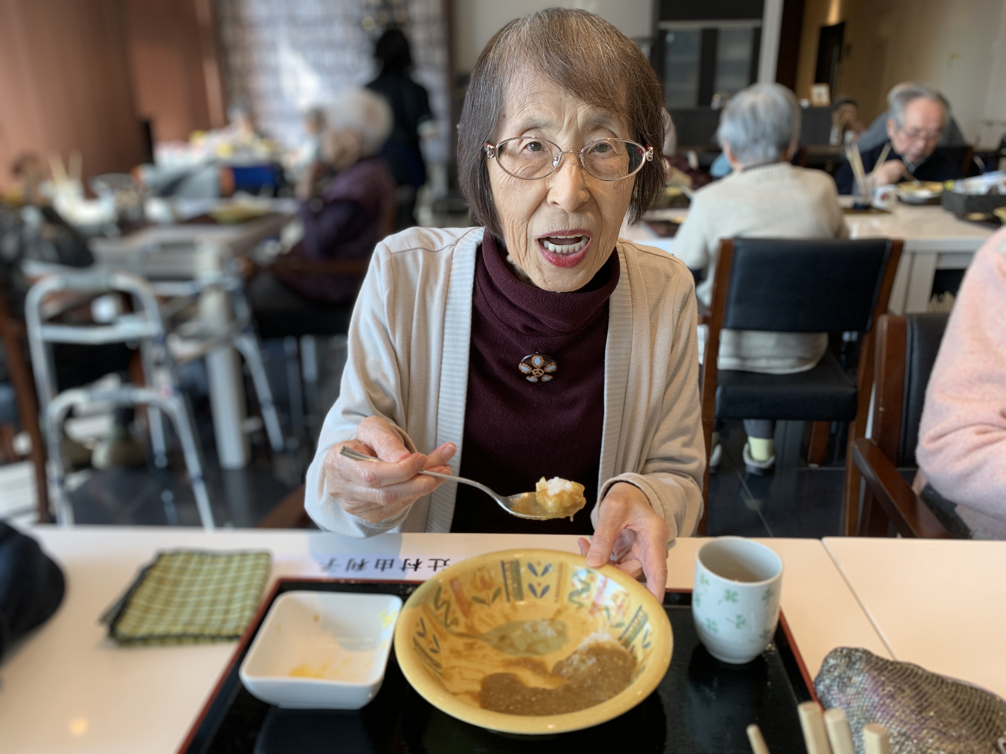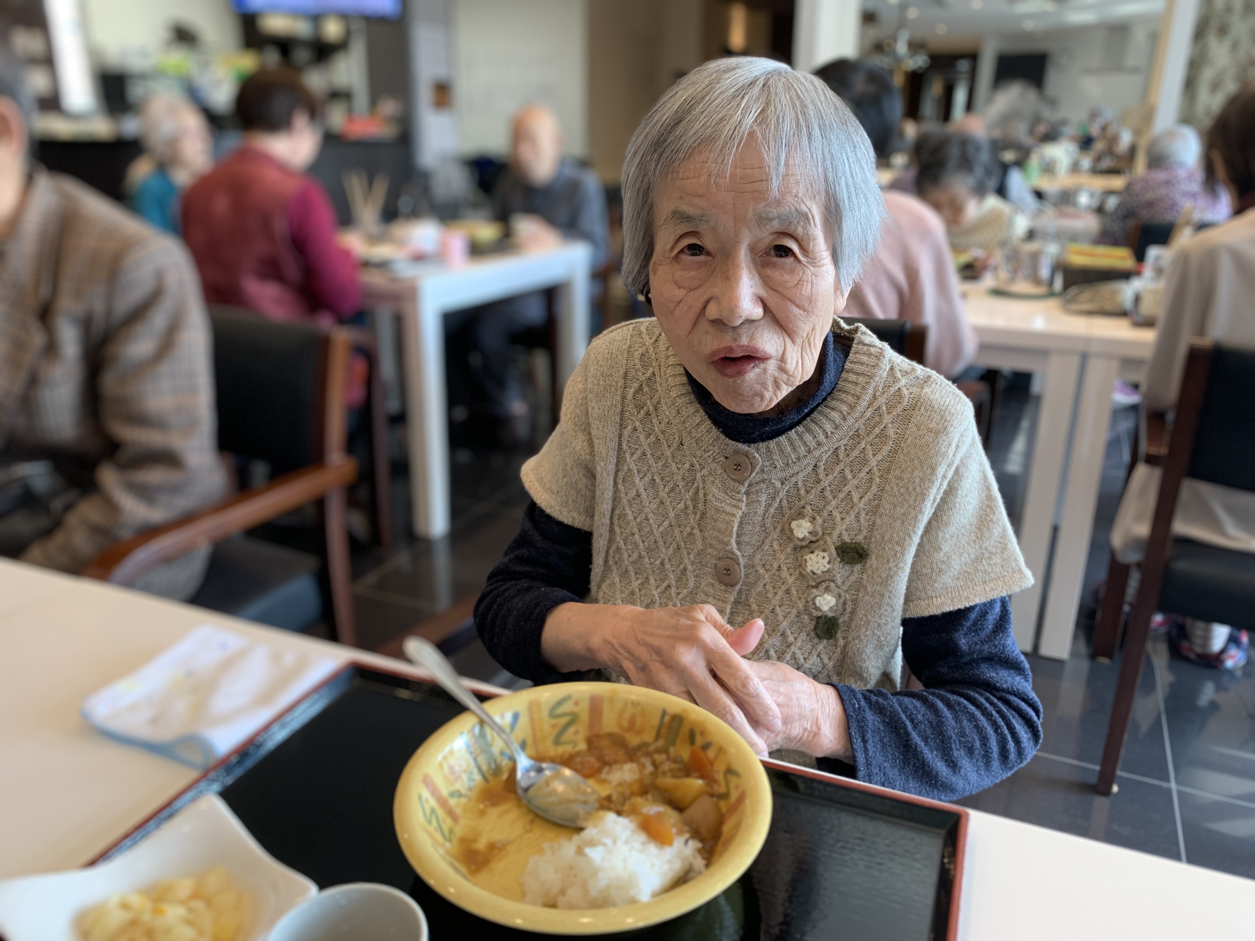 今日は手作りカレーの日です。利用者さまがお野菜を切っていただき、職員が煮込んだカレーを召し上がっていただきました。お味はお写真に写った表情が物語っております。