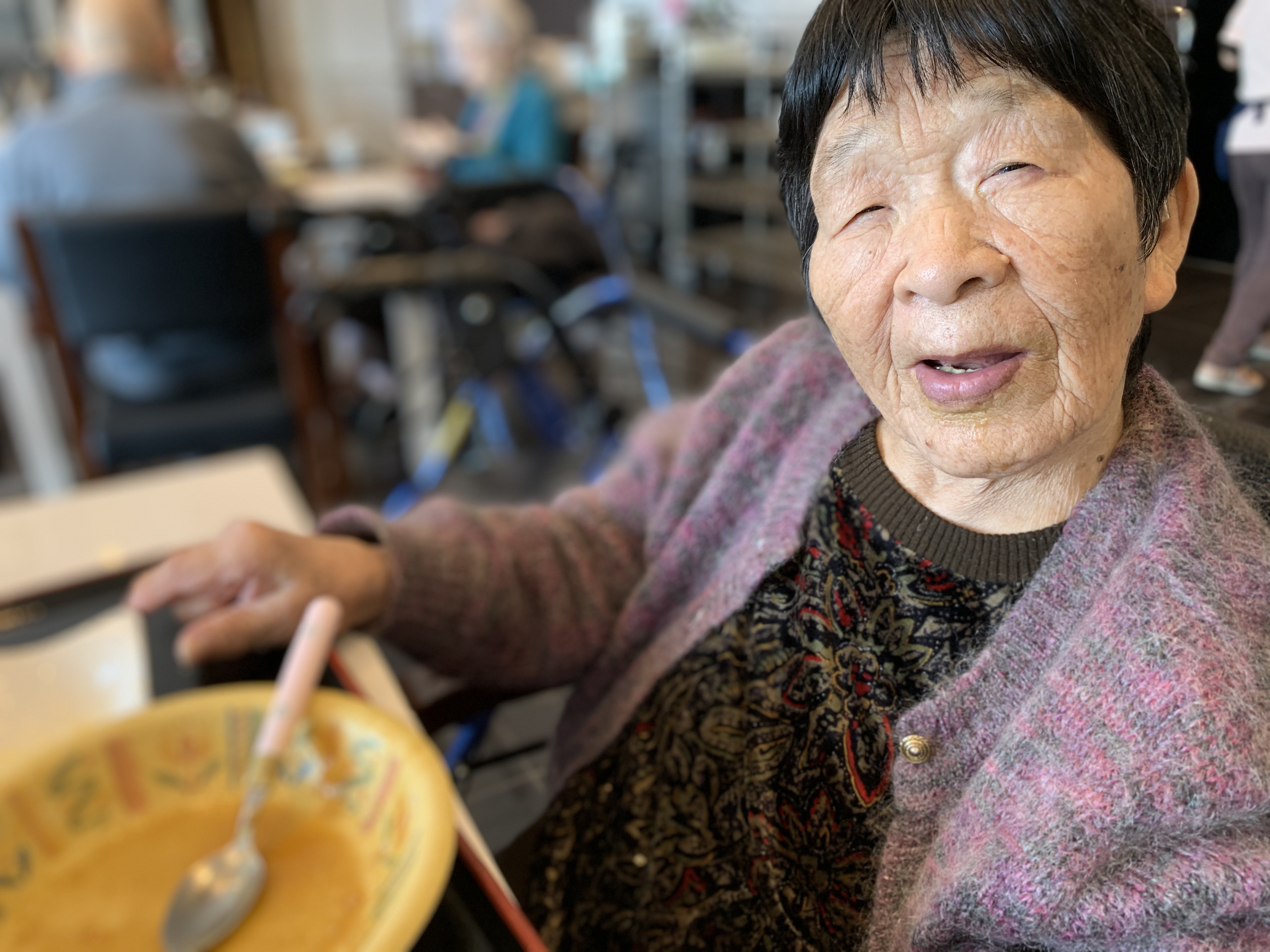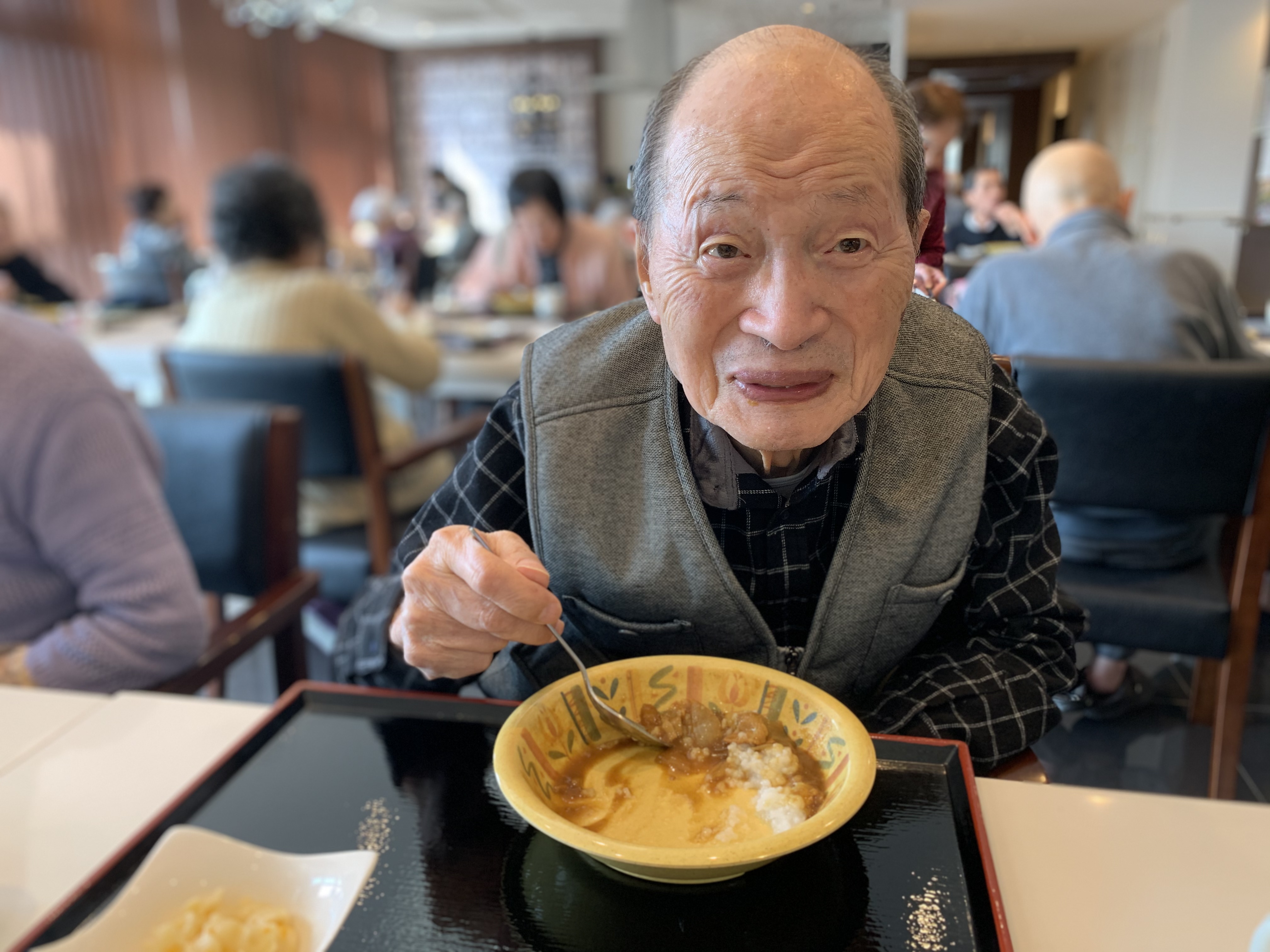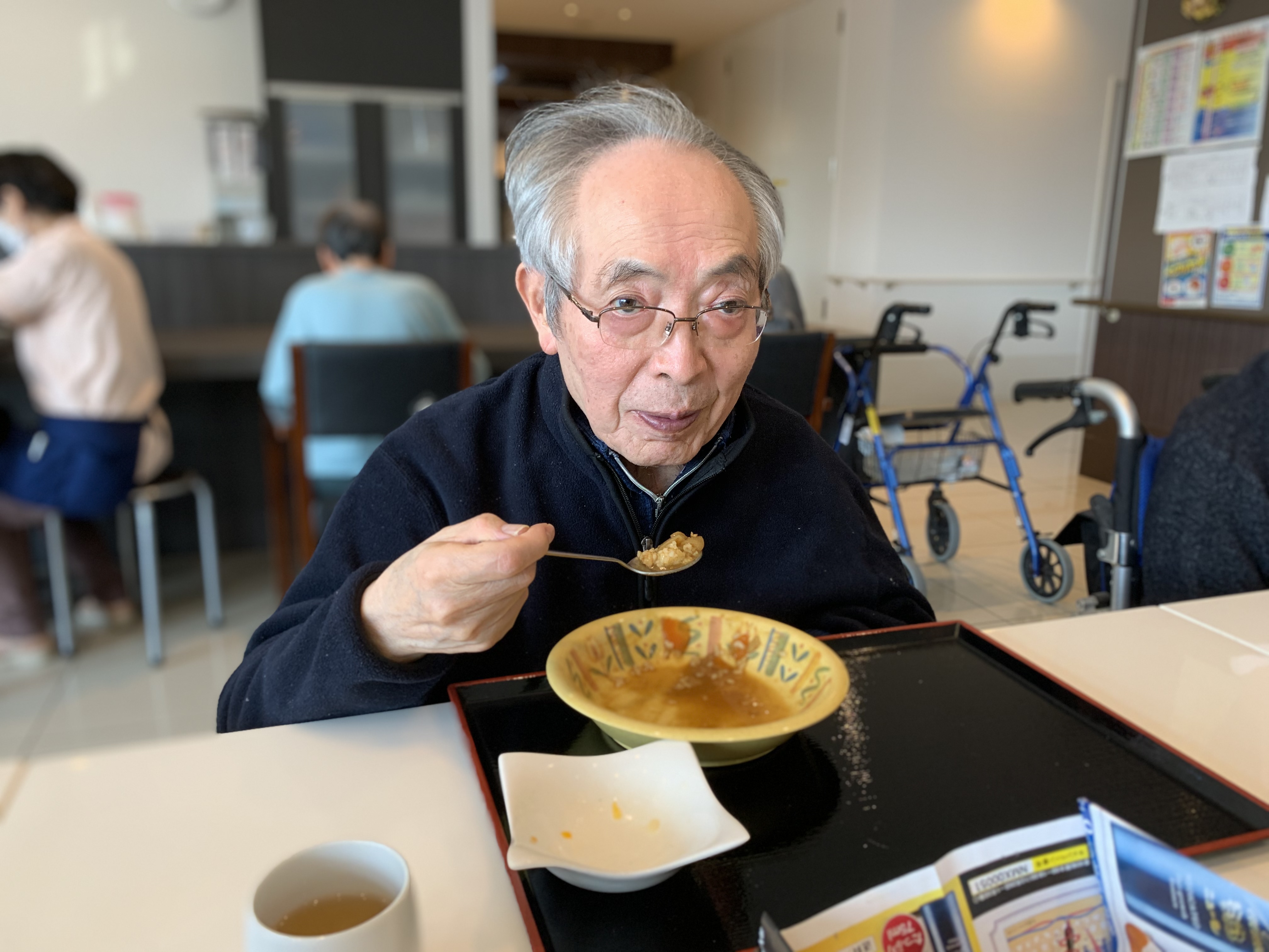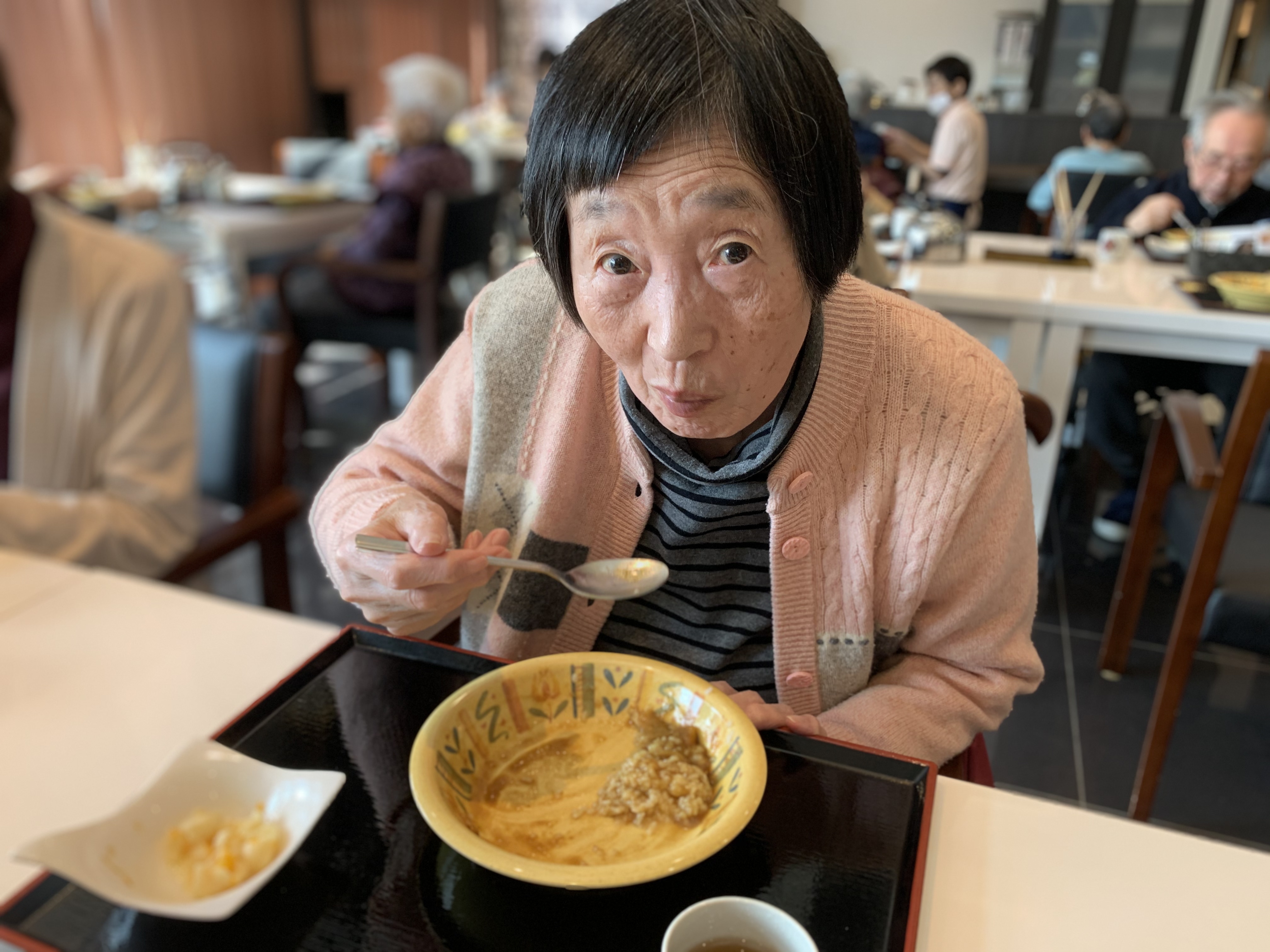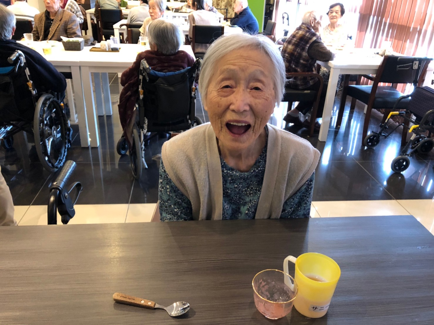 今日は手作りカレーの日です。利用者さまがお野菜を切っていただき、職員が煮込んだカレーを召し上がっていただきました。お味はお写真に写った表情が物語っております。