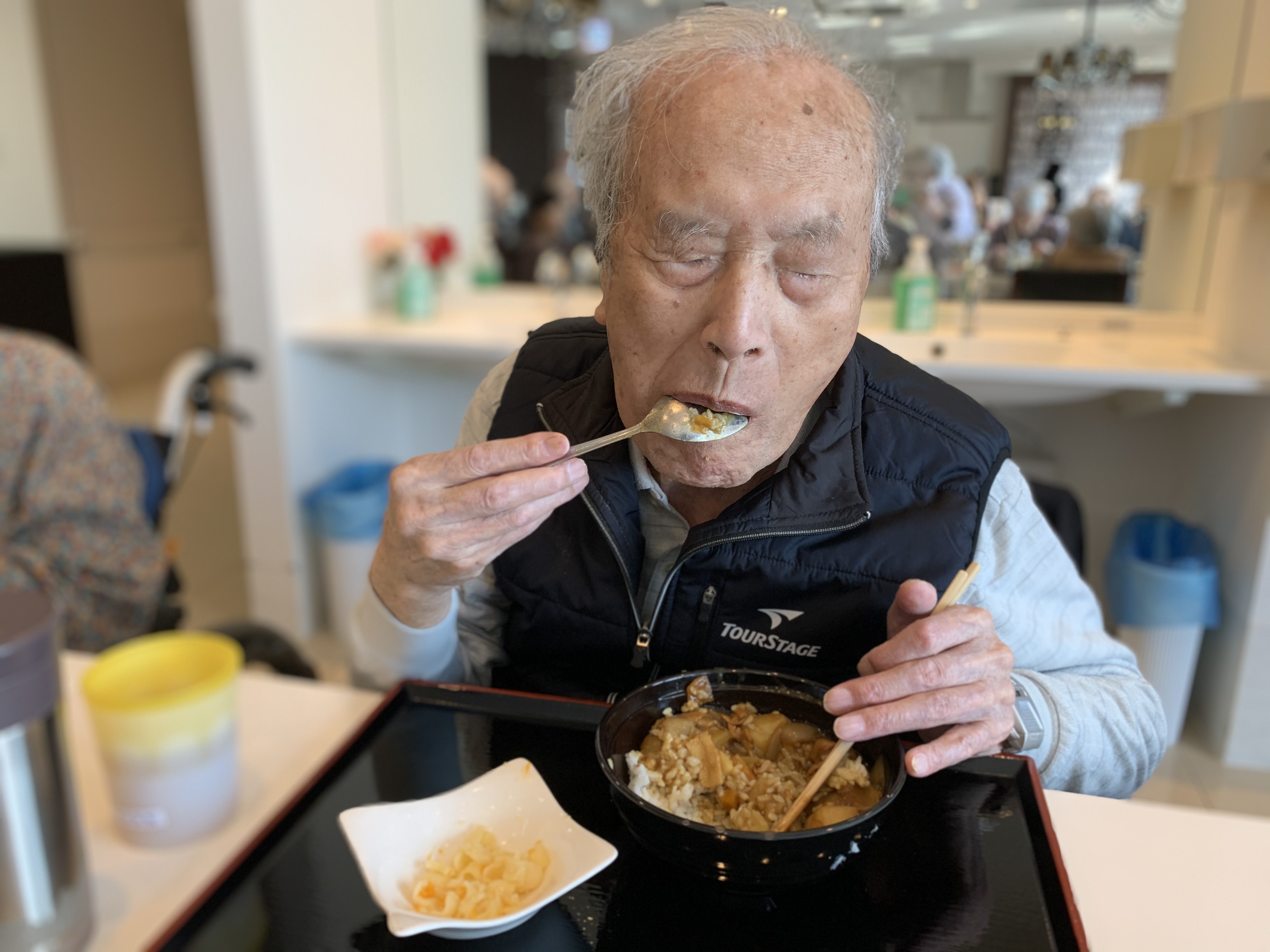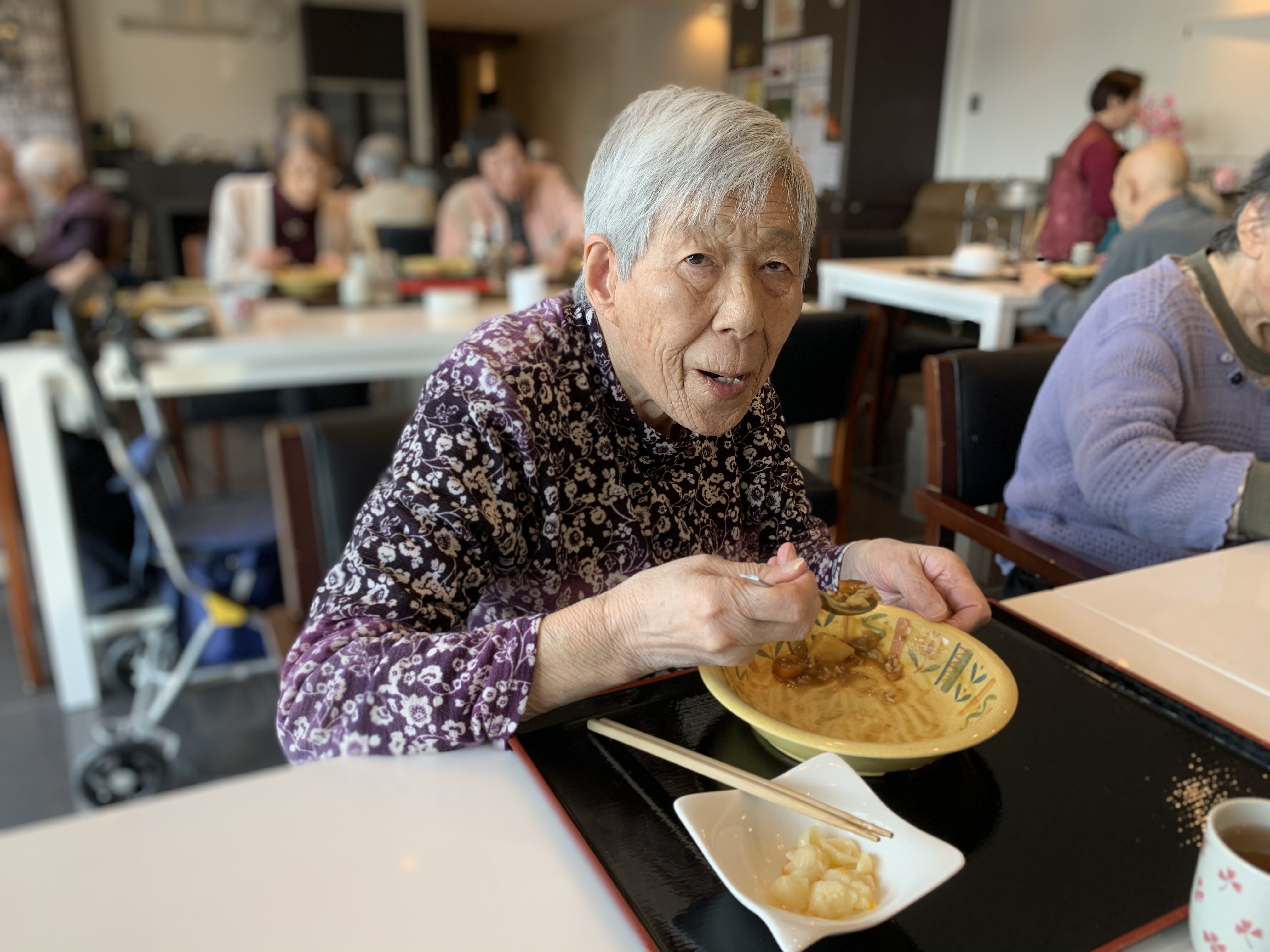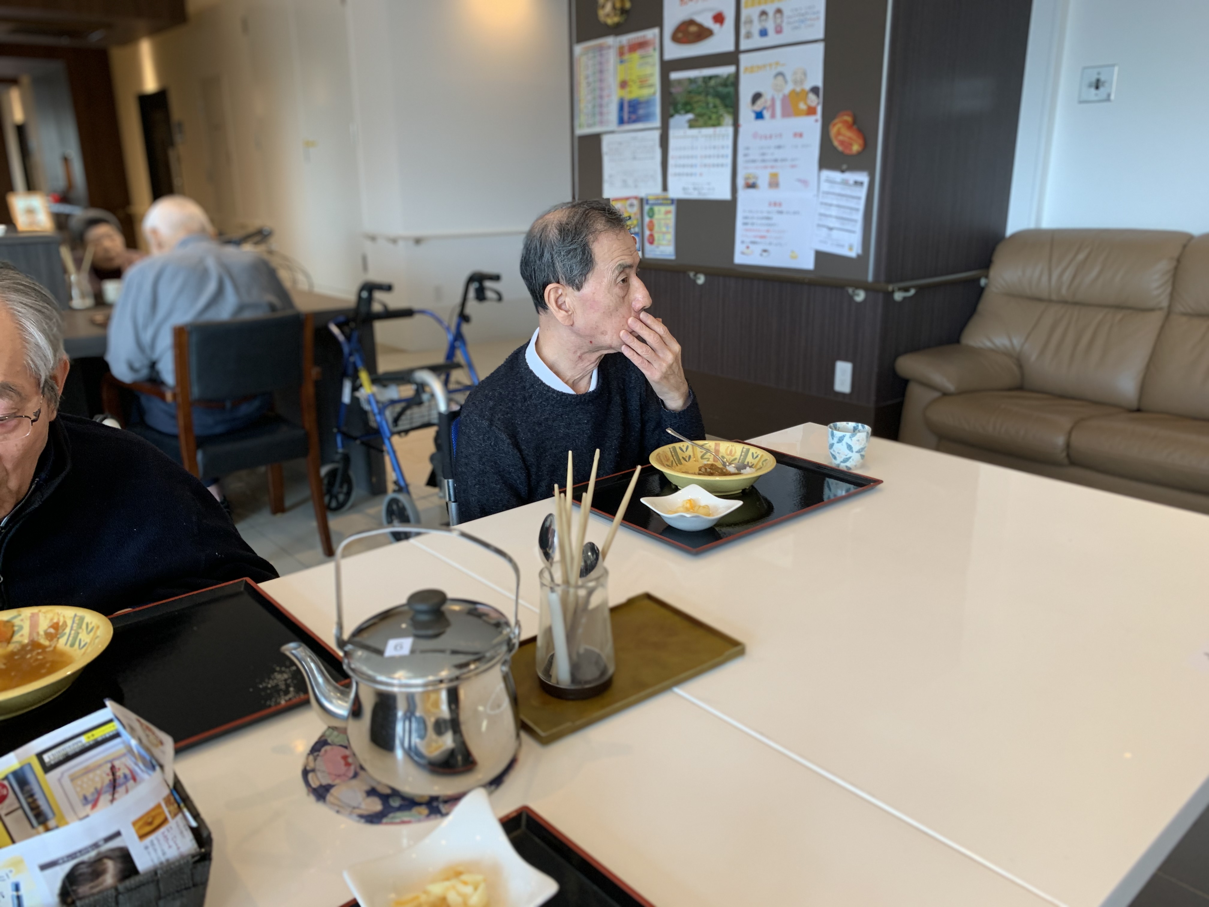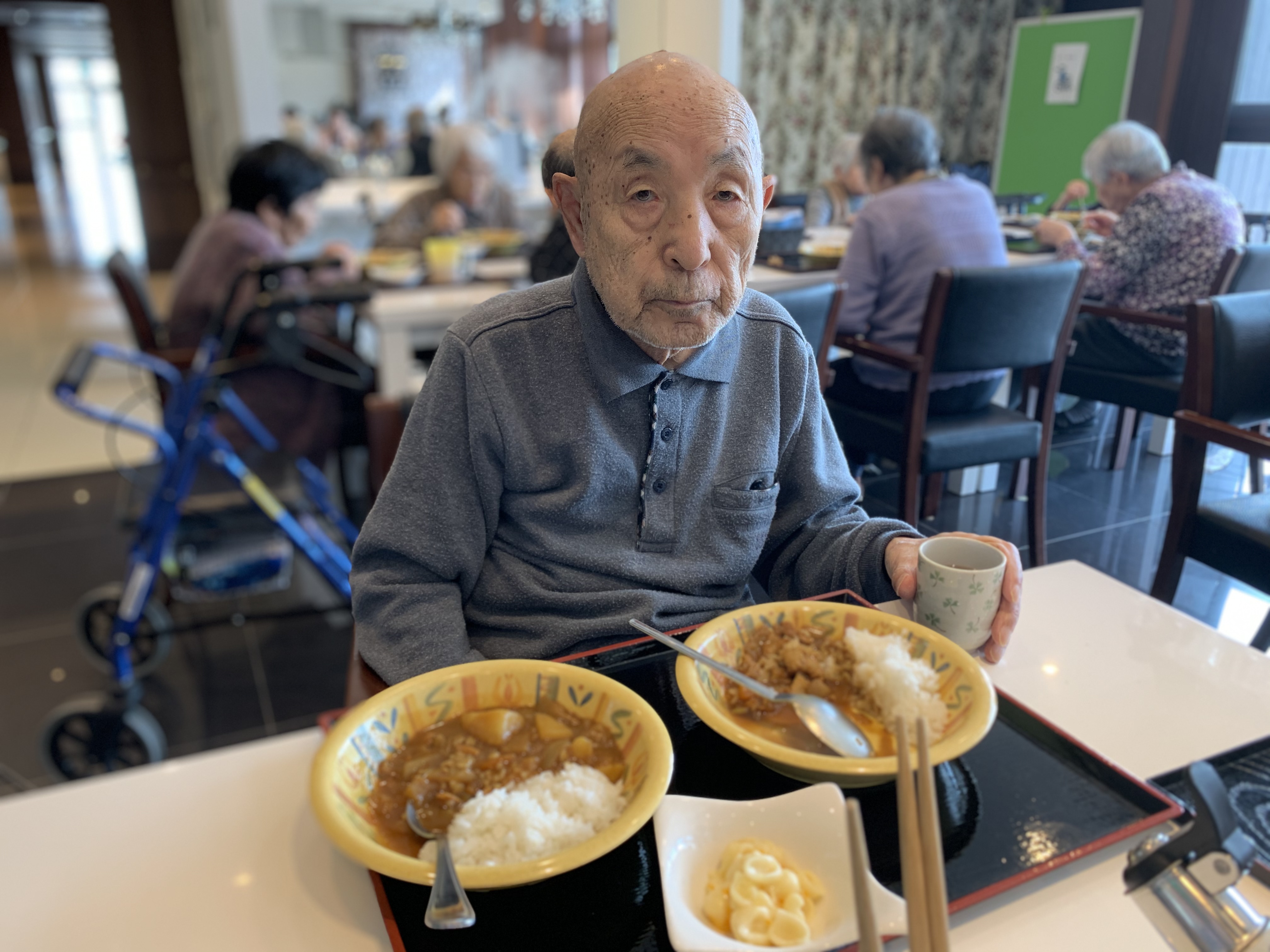 今日は手作りカレーの日です。利用者さまがお野菜を切っていただき、職員が煮込んだカレーを召し上がっていただきました。お味はお写真に写った表情が物語っております。