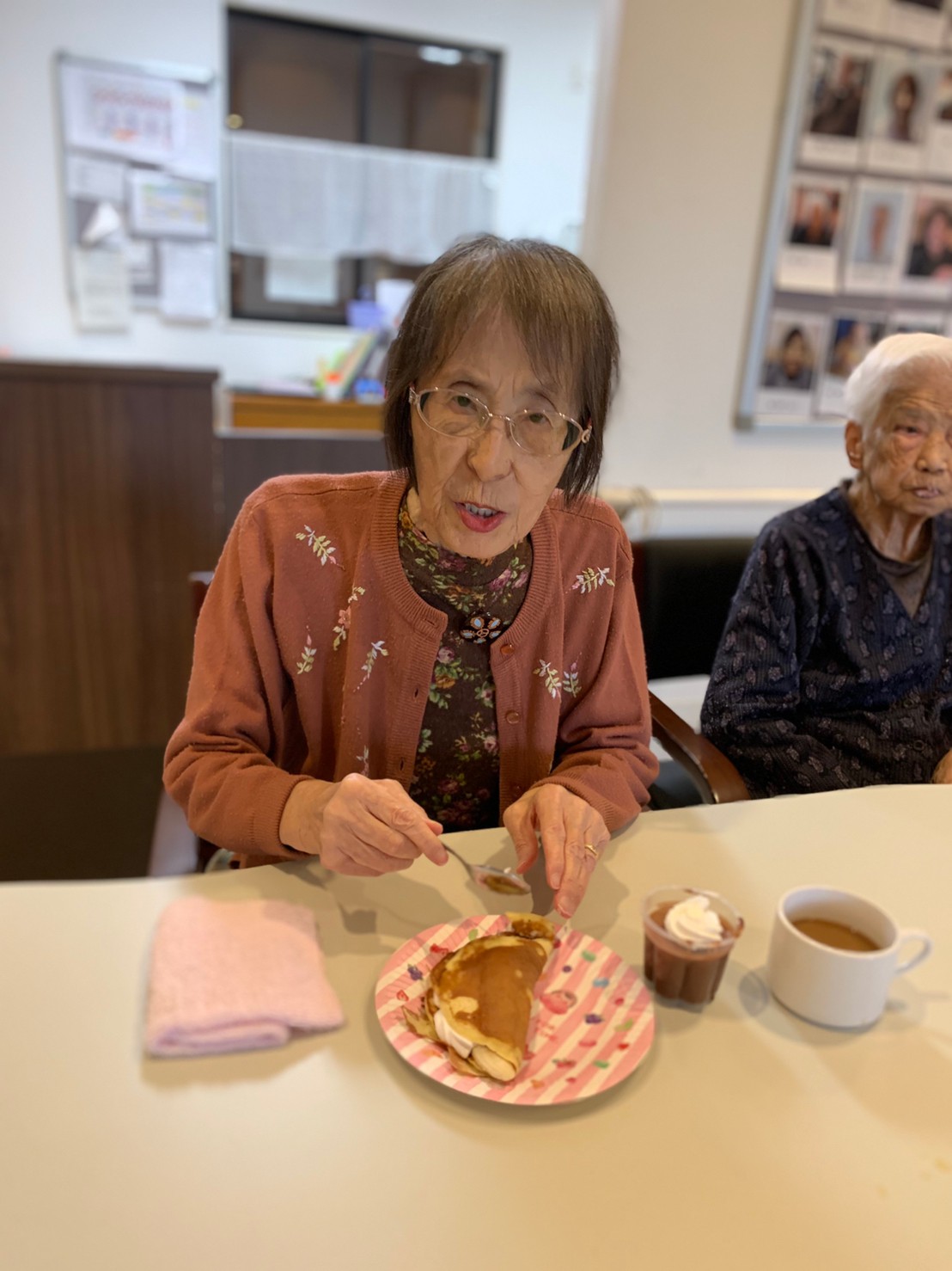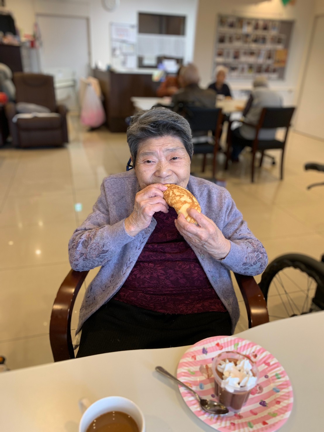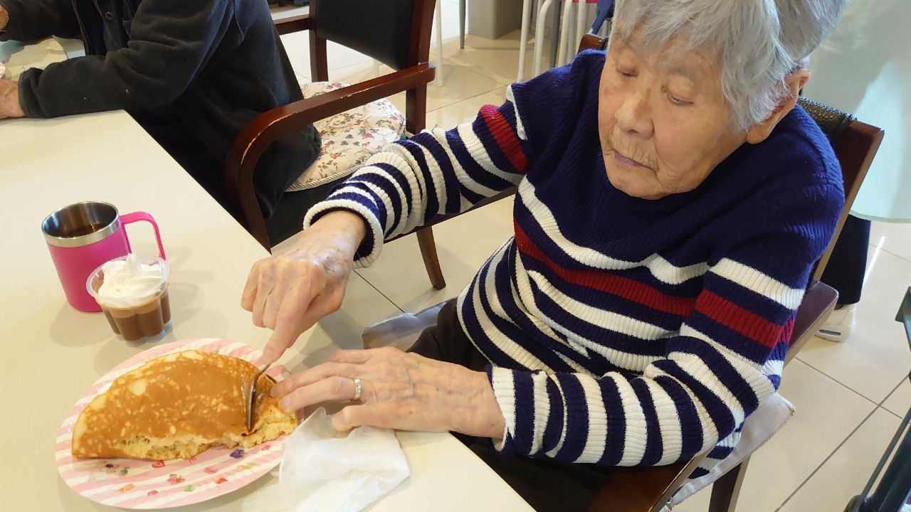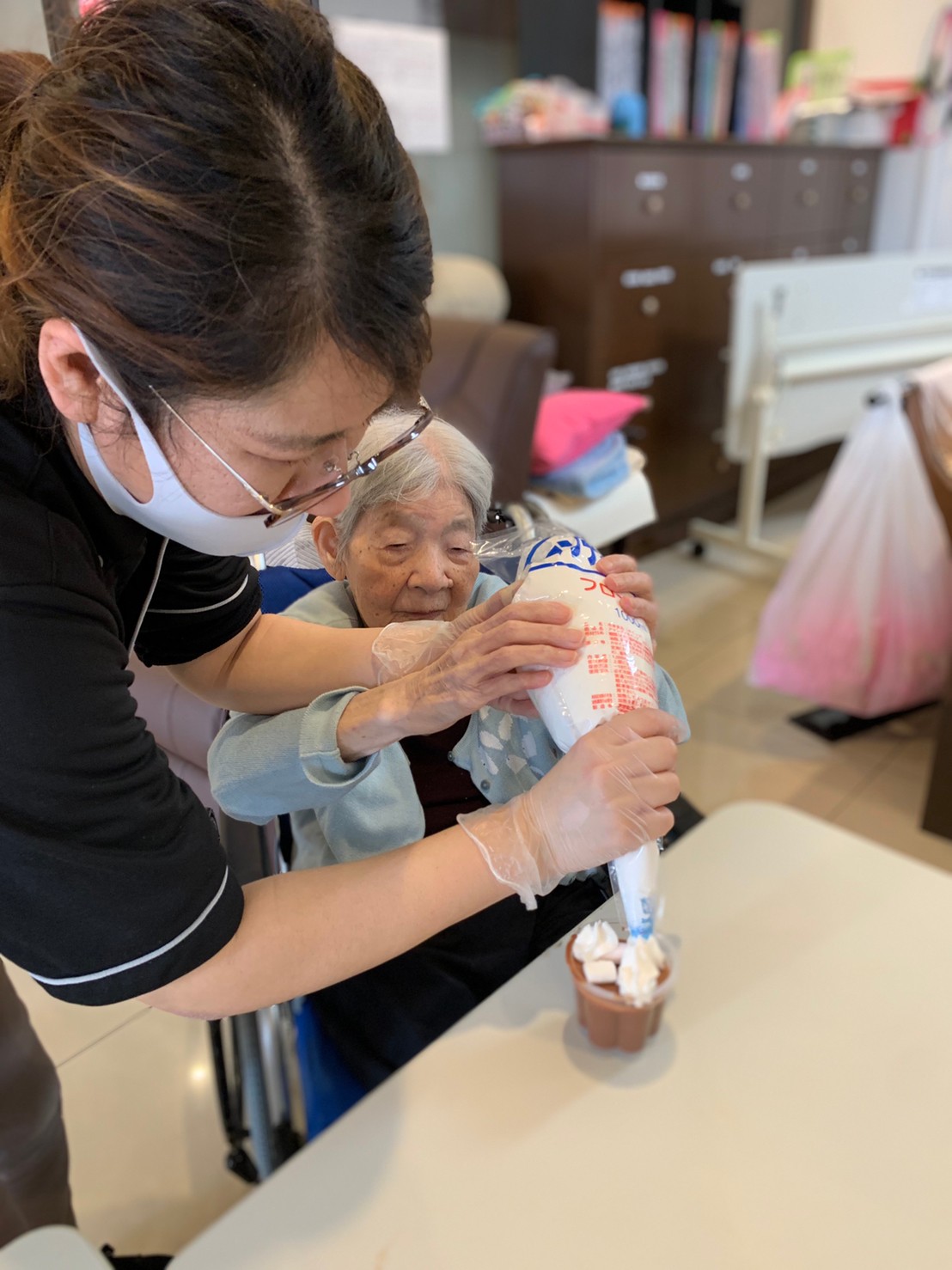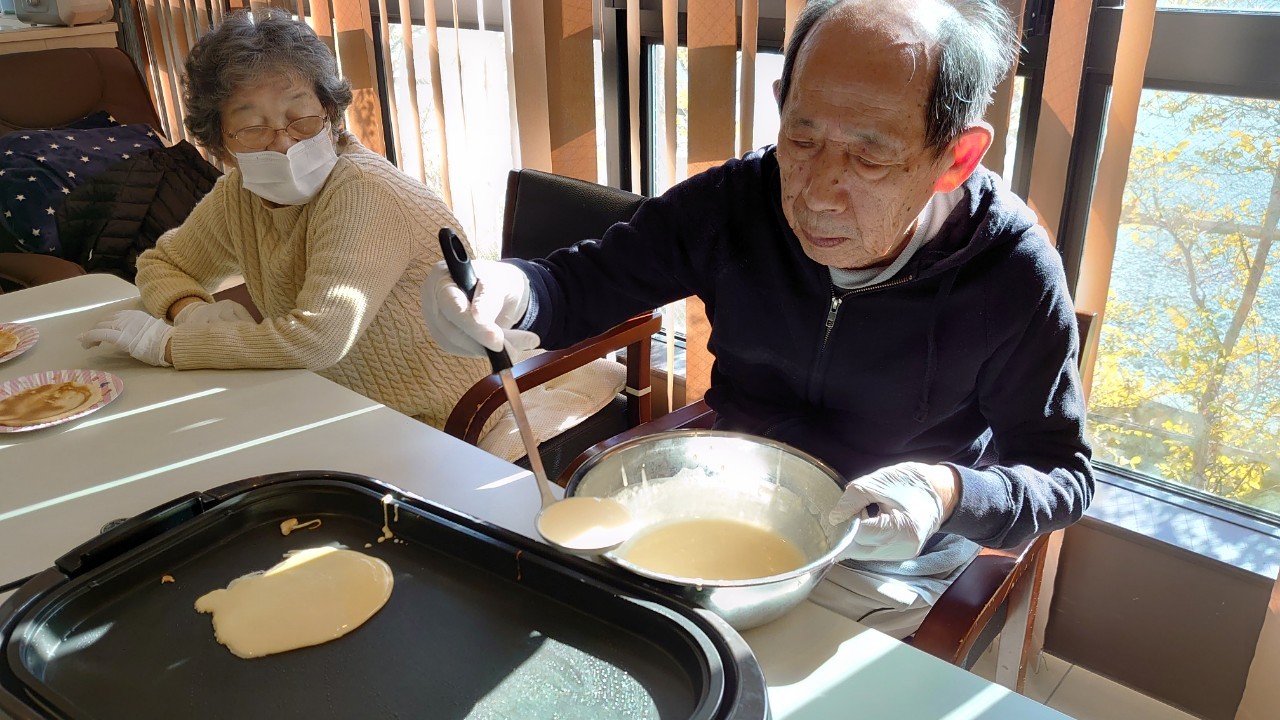 手作りおやつの日も二日目を迎えました。本日のお菓子は前日と変わらずチョコレートムースとバナナオムレットです。二日目となると利用者さまもスタッフも慣れて手際が良く、次はあれするんやろ??って聞いてくださり昨日よりも機能向上訓練の成果が出ているように感じます。おいしいお菓子と最高の笑顔ですごせた1日になりました(*´з`)