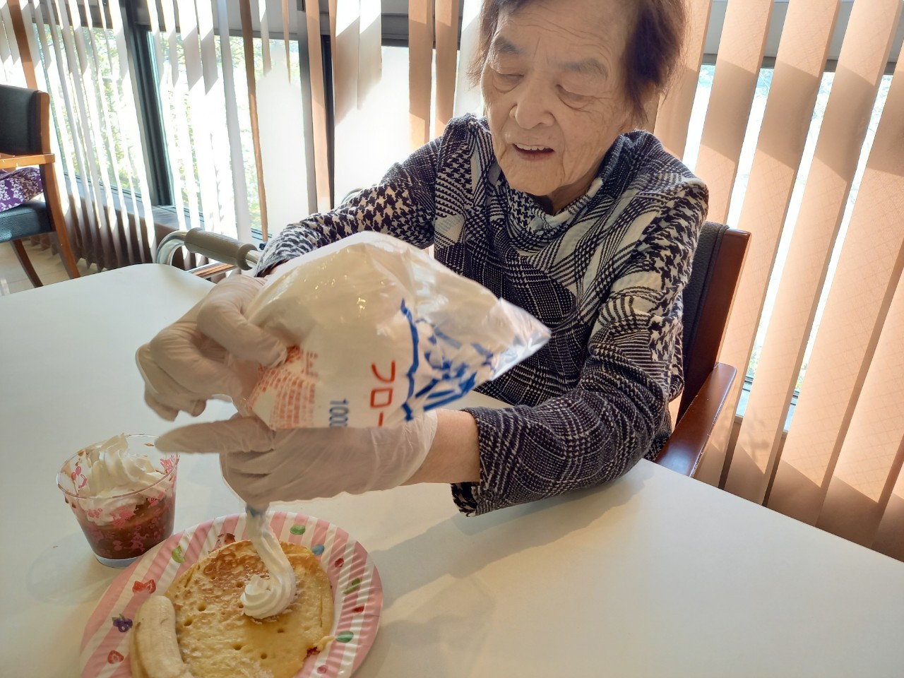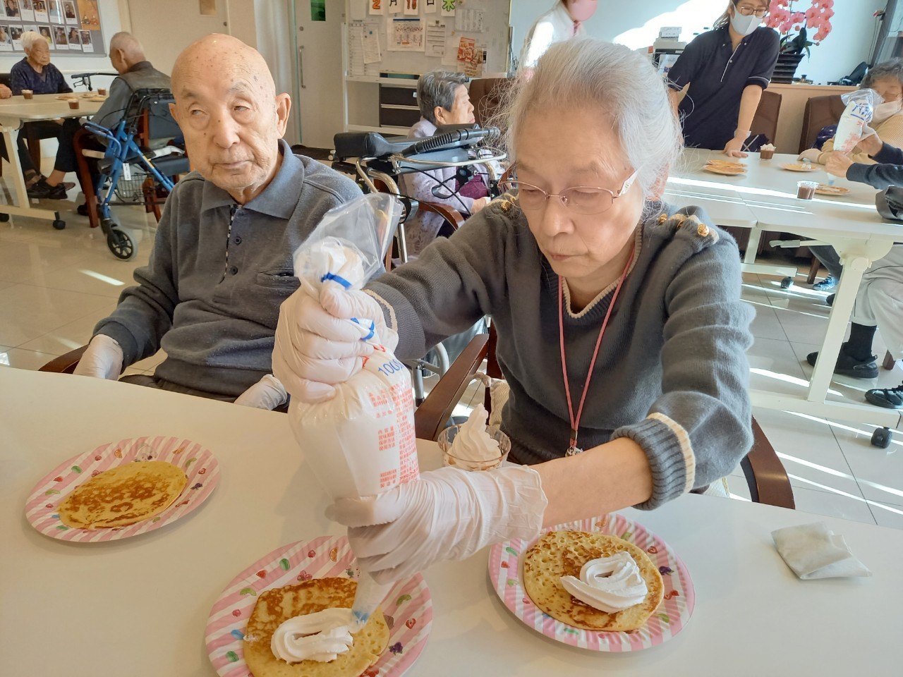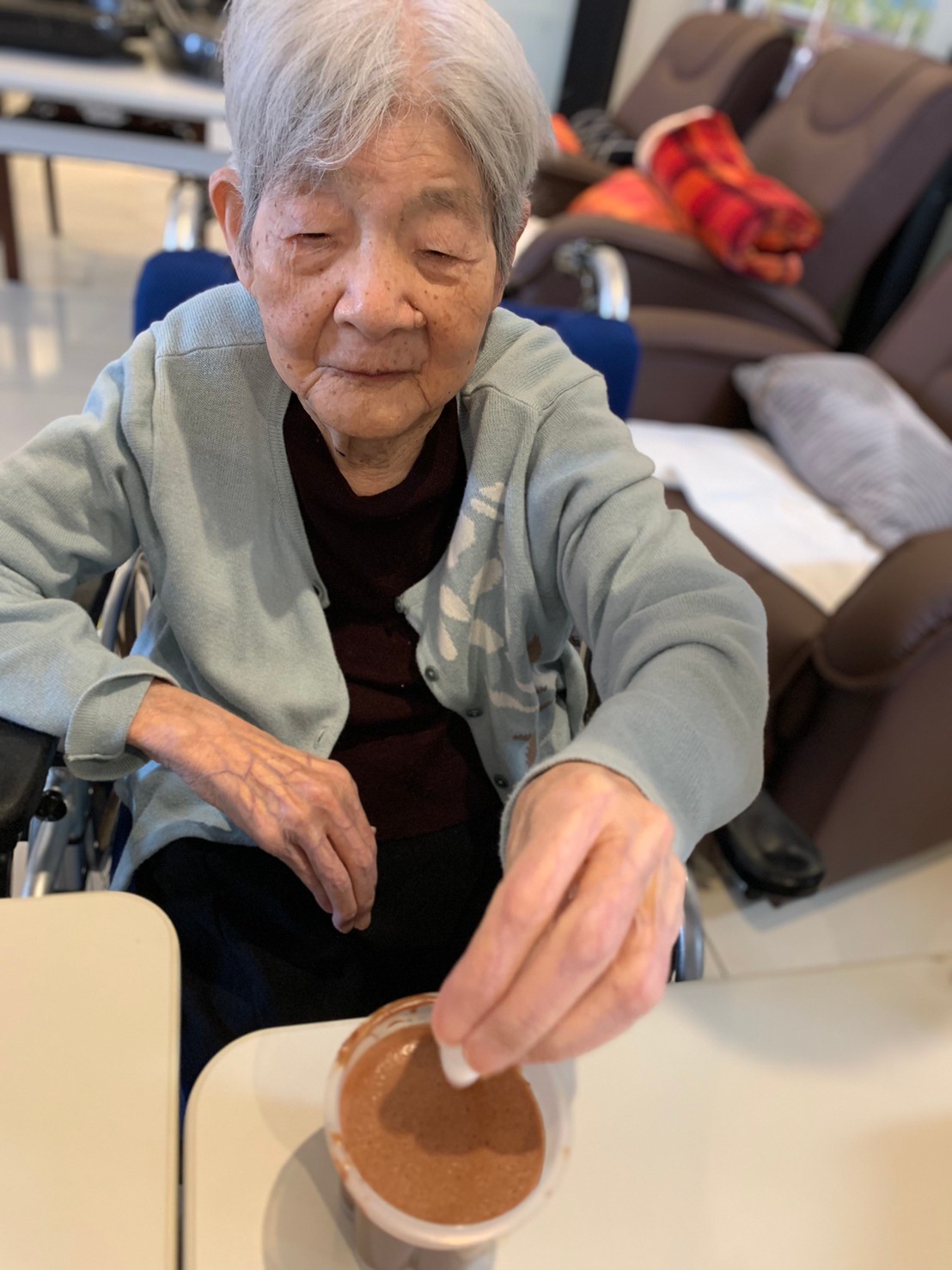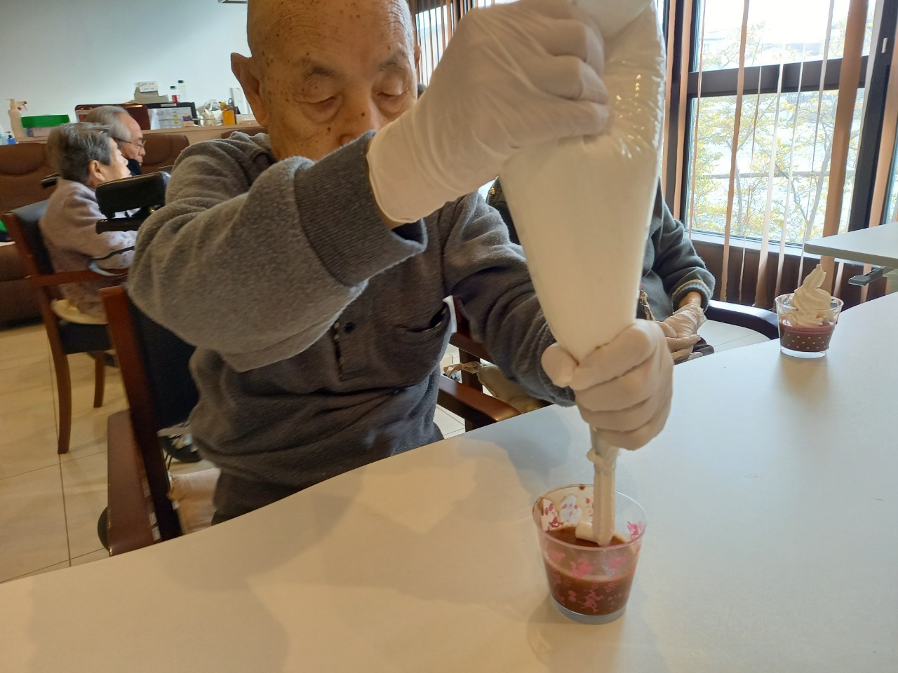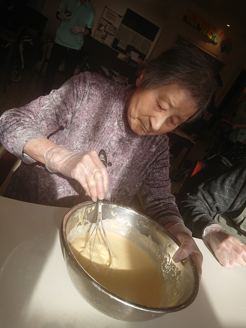 手作りおやつの日も二日目を迎えました。本日のお菓子は前日と変わらずチョコレートムースとバナナオムレットです。二日目となると利用者さまもスタッフも慣れて手際が良く、次はあれするんやろ??って聞いてくださり昨日よりも機能向上訓練の成果が出ているように感じます。おいしいお菓子と最高の笑顔ですごせた1日になりました(*´з`)