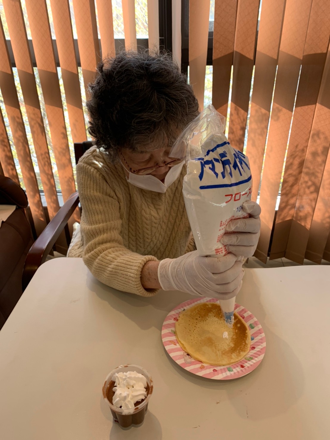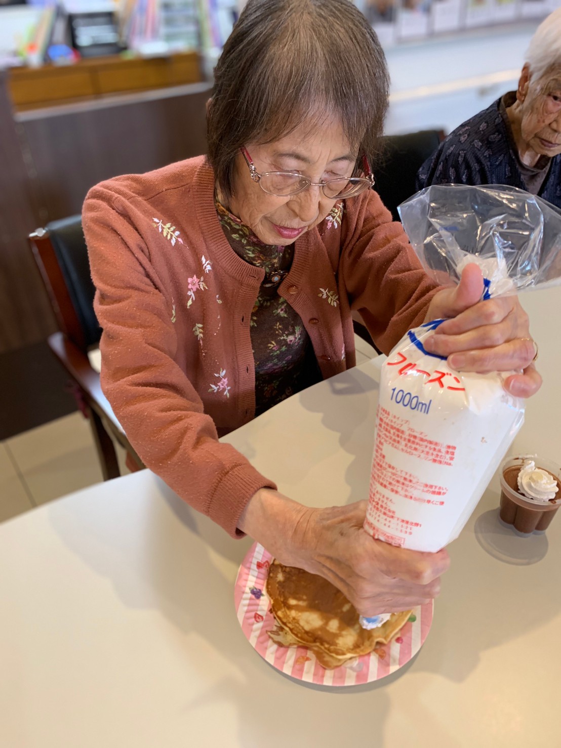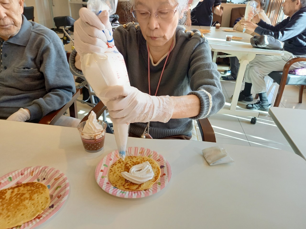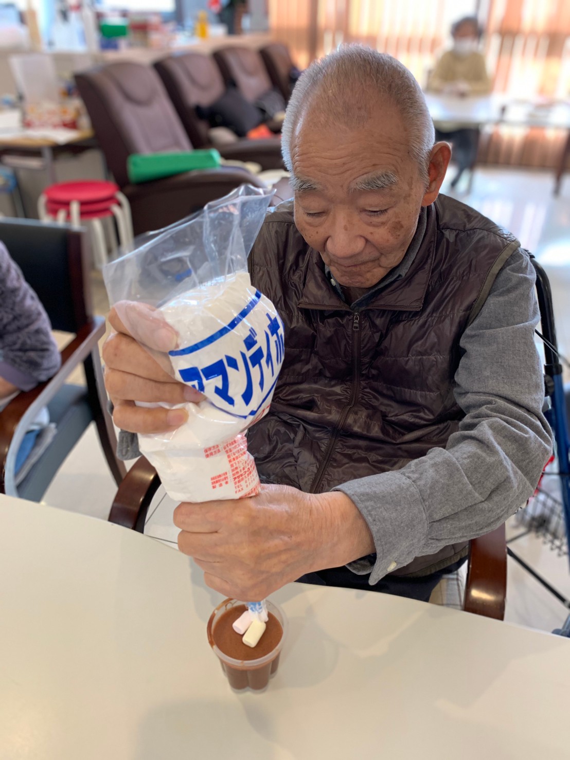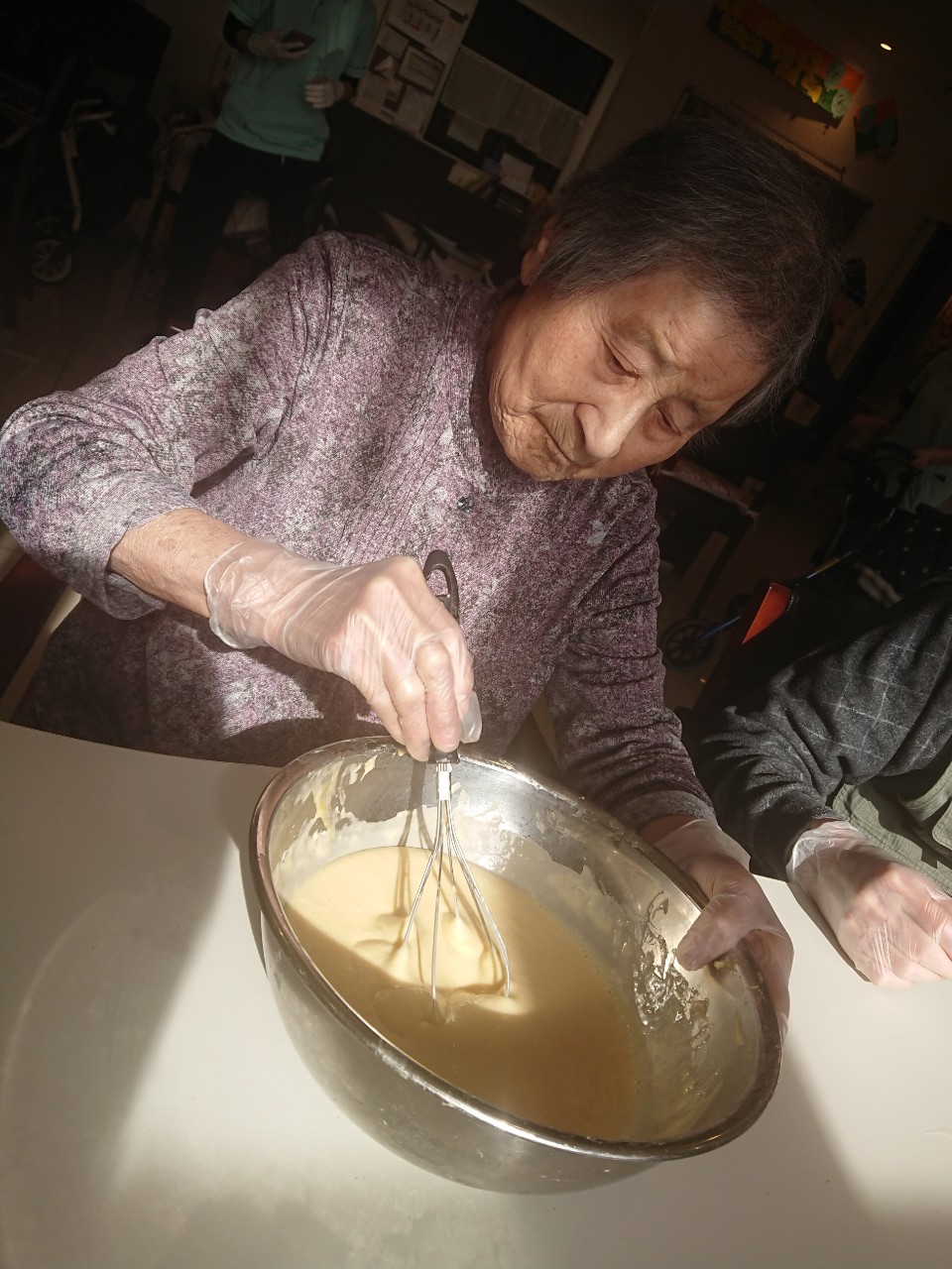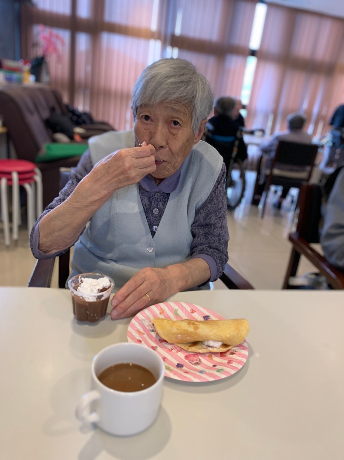 手作りおやつの日も二日目を迎えました。本日のお菓子は前日と変わらずチョコレートムースとバナナオムレットです。二日目となると利用者さまもスタッフも慣れて手際が良く、次はあれするんやろ??って聞いてくださり昨日よりも機能向上訓練の成果が出ているように感じます。おいしいお菓子と最高の笑顔ですごせた1日になりました(*´з`)