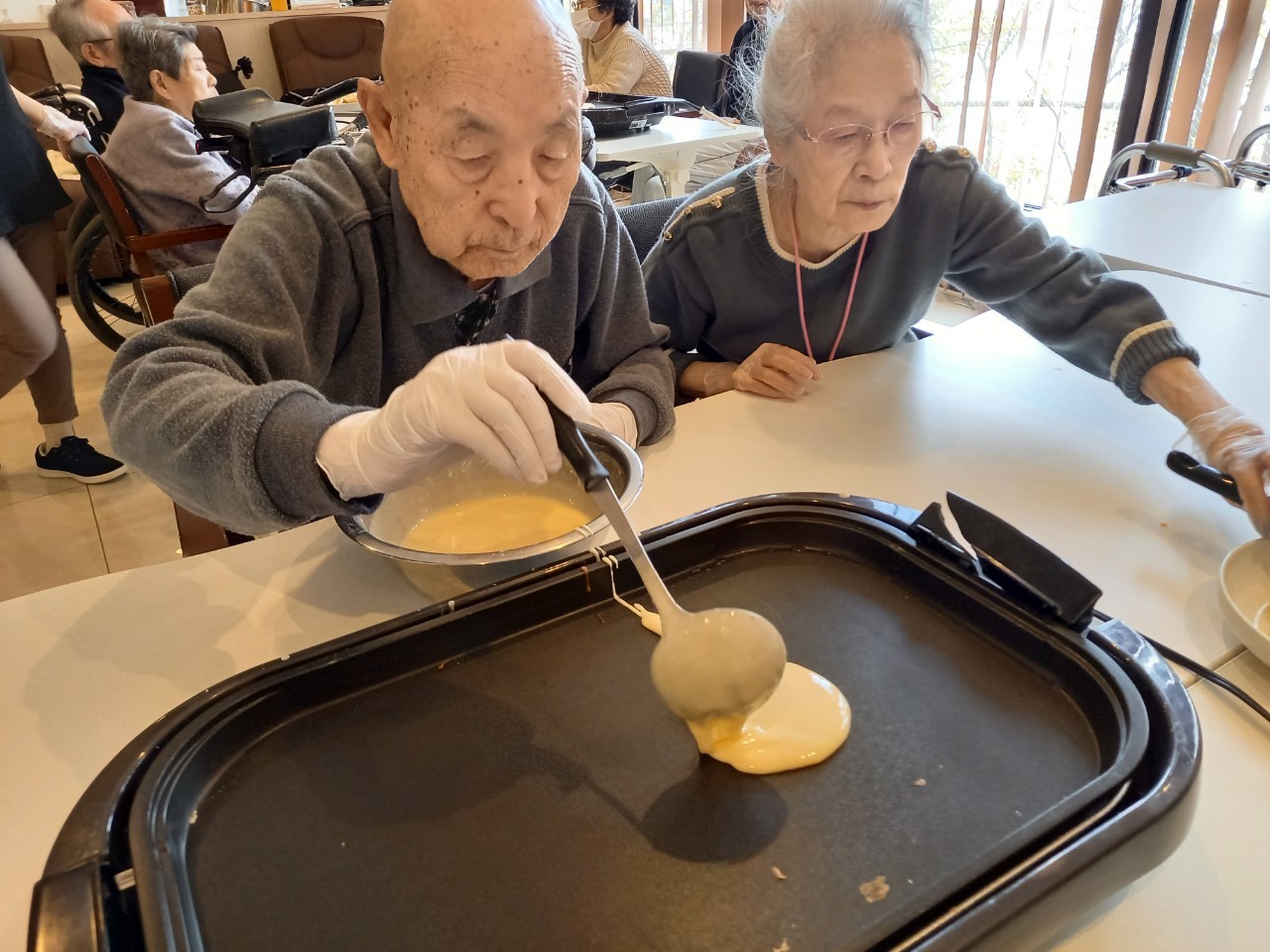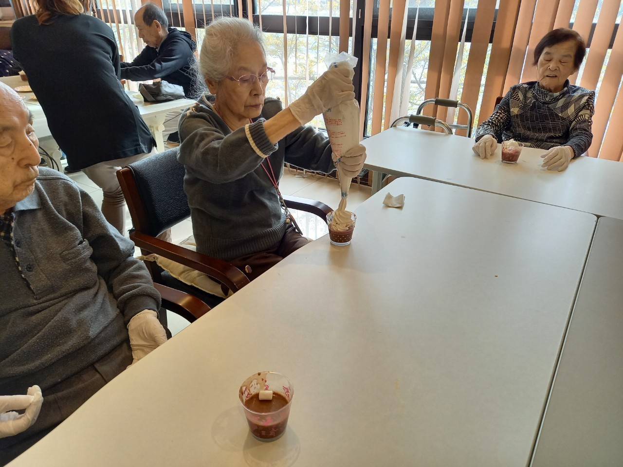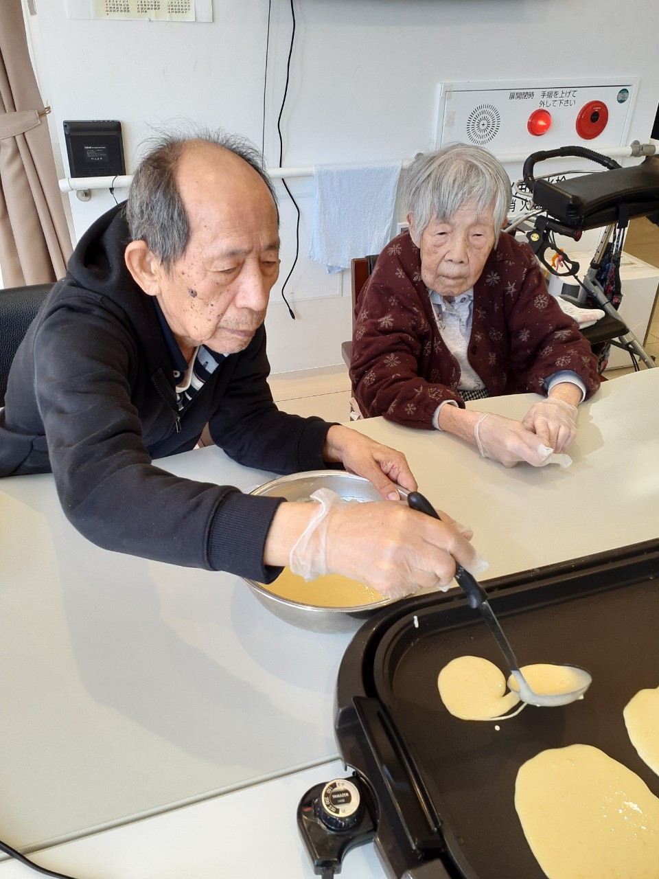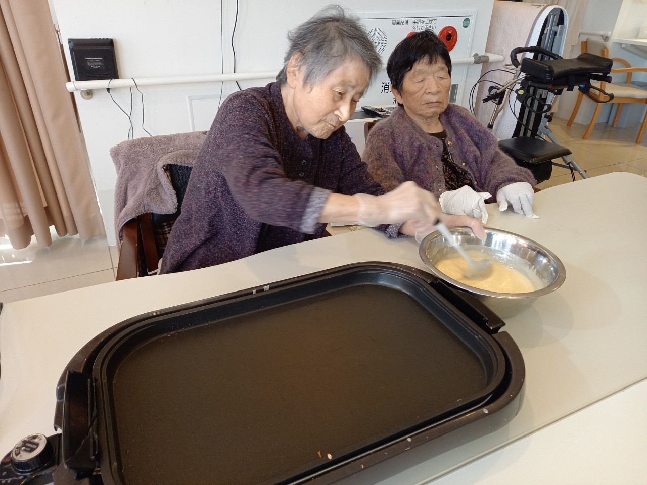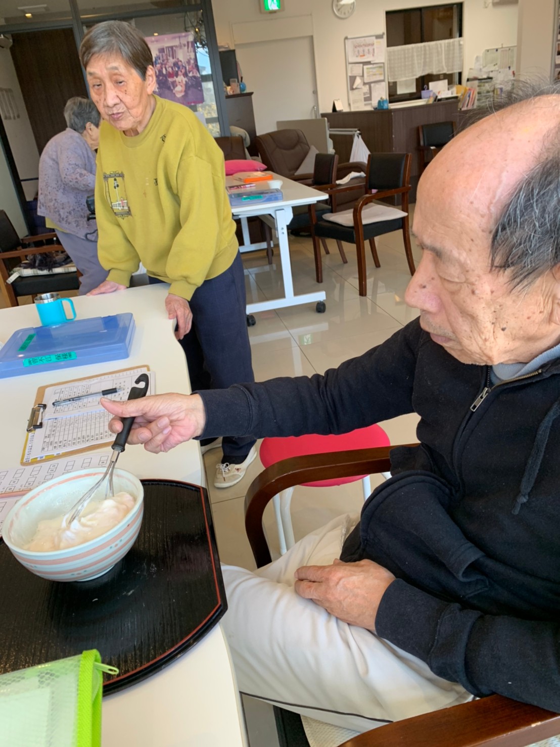 手作りおやつの日も二日目を迎えました。本日のお菓子は前日と変わらずチョコレートムースとバナナオムレットです。二日目となると利用者さまもスタッフも慣れて手際が良く、次はあれするんやろ??って聞いてくださり昨日よりも機能向上訓練の成果が出ているように感じます。おいしいお菓子と最高の笑顔ですごせた1日になりました(*´з`)