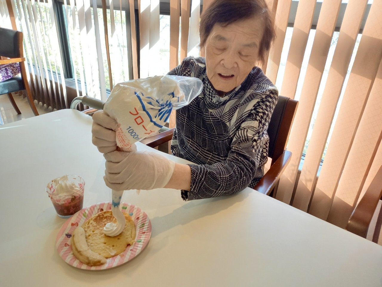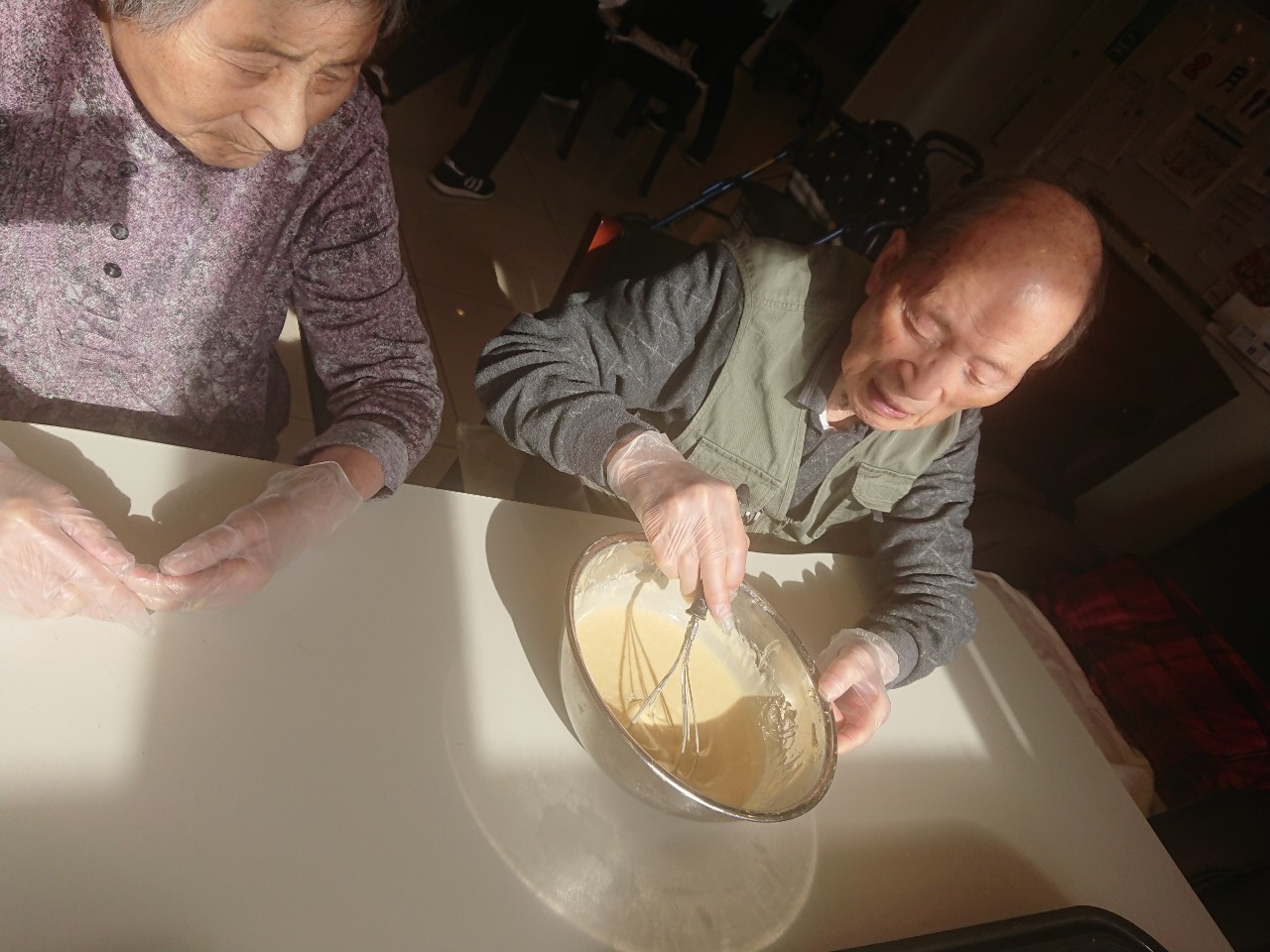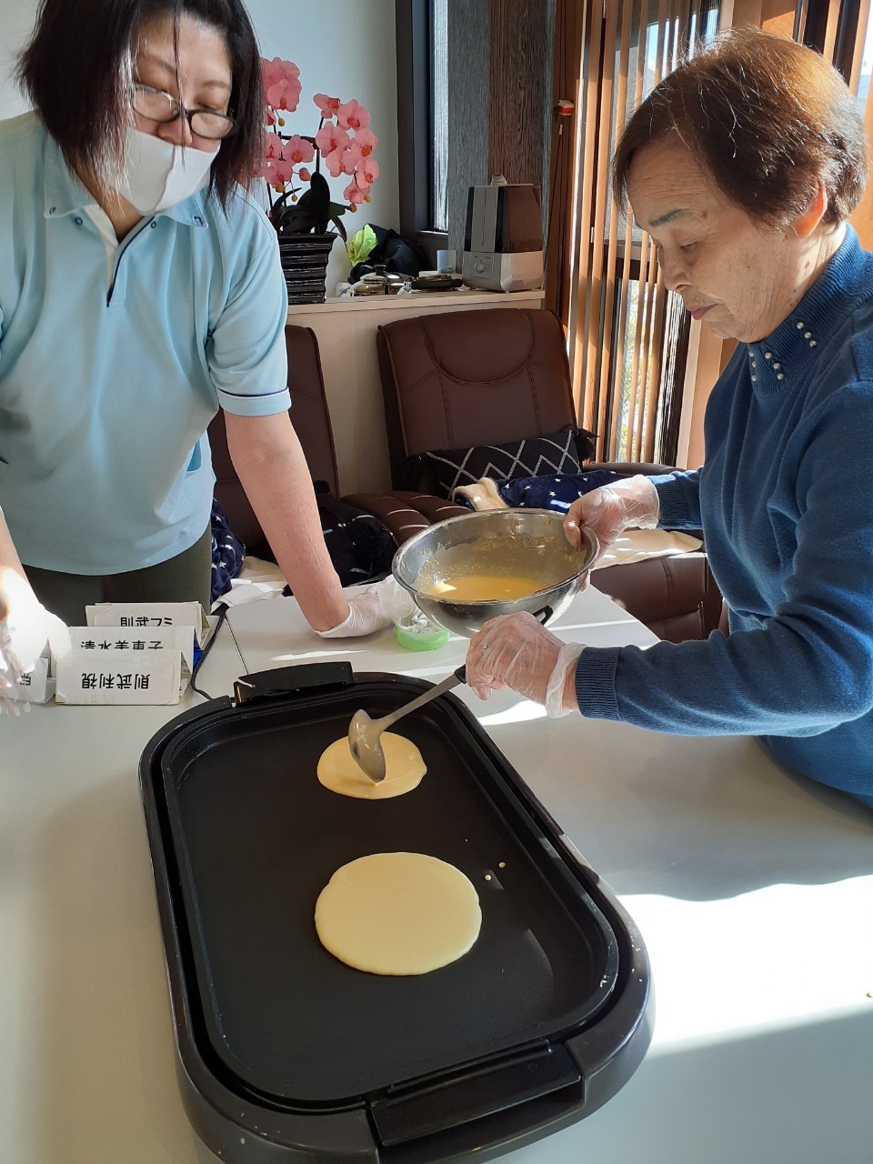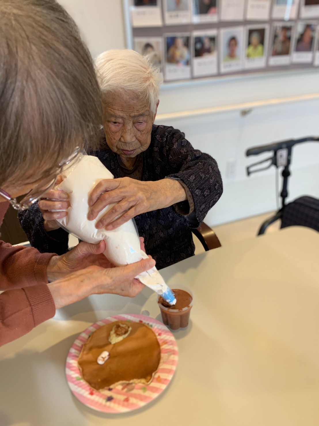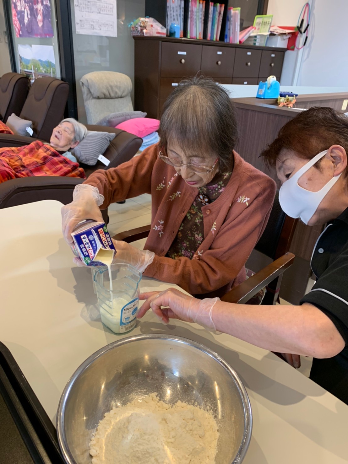 手作りおやつの日も二日目を迎えました。本日のお菓子は前日と変わらずチョコレートムースとバナナオムレットです。二日目となると利用者さまもスタッフも慣れて手際が良く、次はあれするんやろ??って聞いてくださり昨日よりも機能向上訓練の成果が出ているように感じます。おいしいお菓子と最高の笑顔ですごせた1日になりました(*´з`)