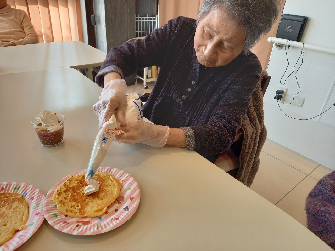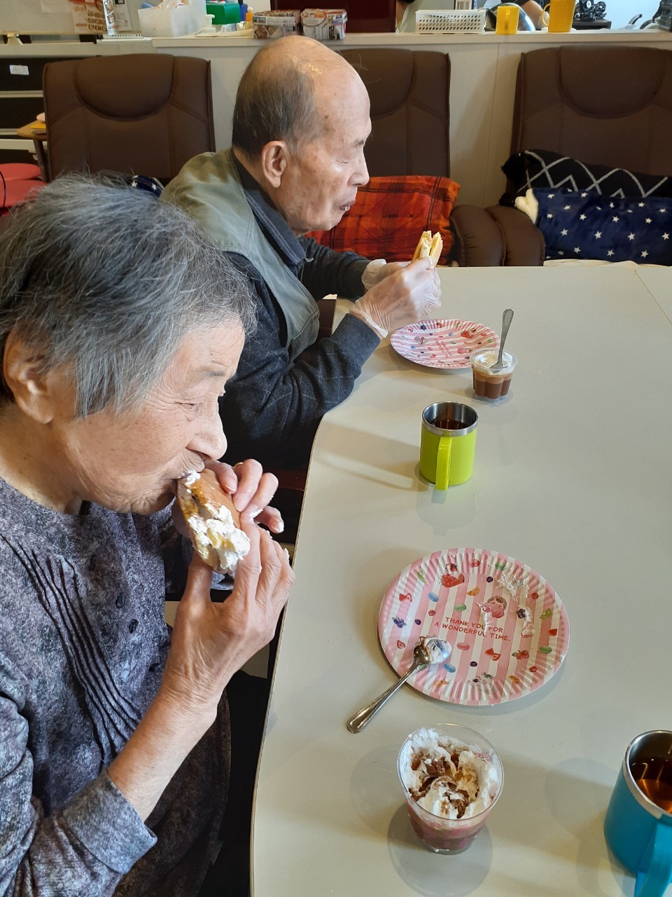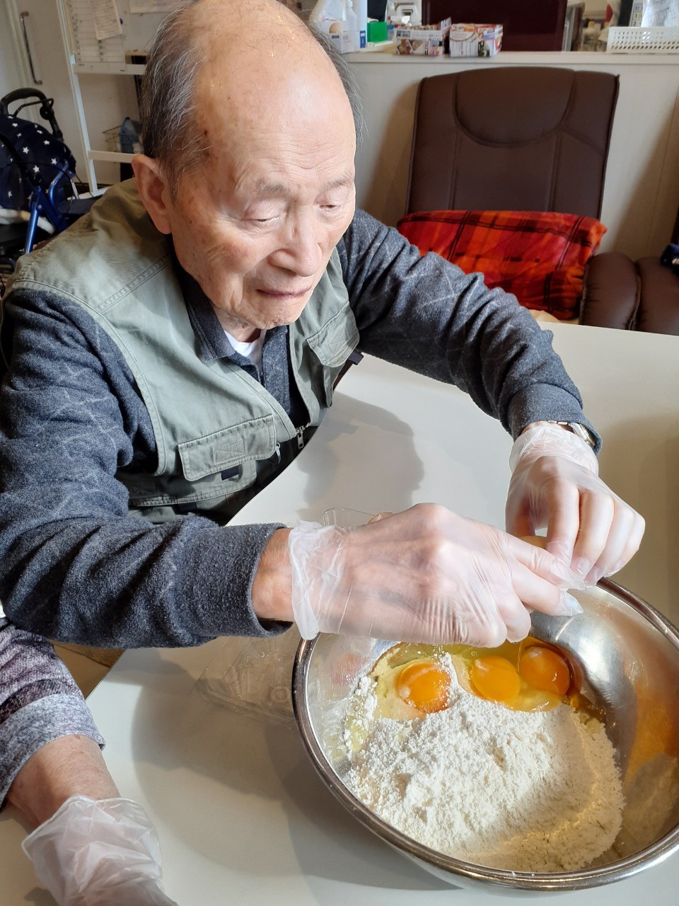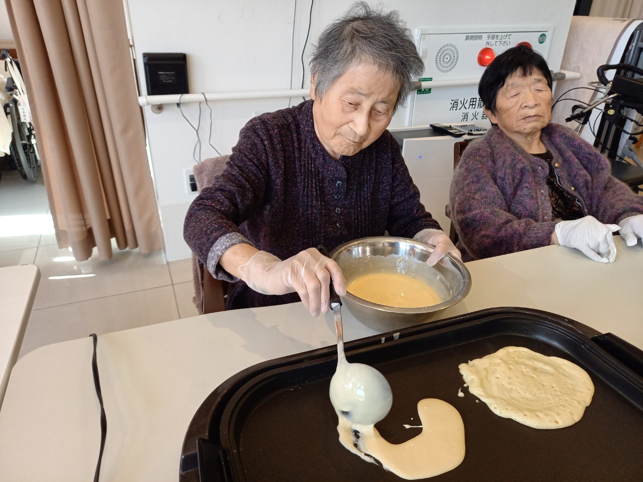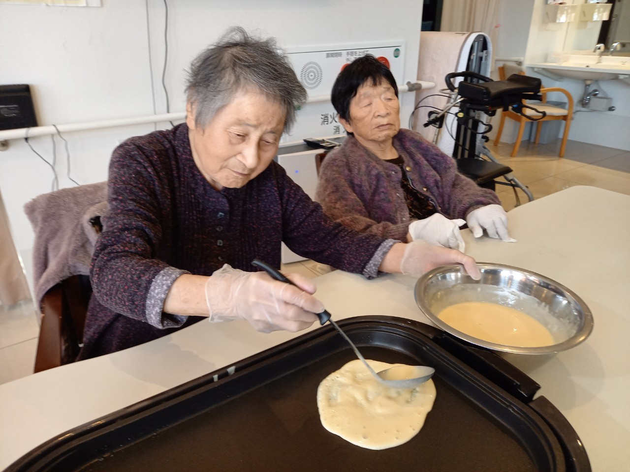 手作りおやつの日も二日目を迎えました。本日のお菓子は前日と変わらずチョコレートムースとバナナオムレットです。二日目となると利用者さまもスタッフも慣れて手際が良く、次はあれするんやろ??って聞いてくださり昨日よりも機能向上訓練の成果が出ているように感じます。おいしいお菓子と最高の笑顔ですごせた1日になりました(*´з`)