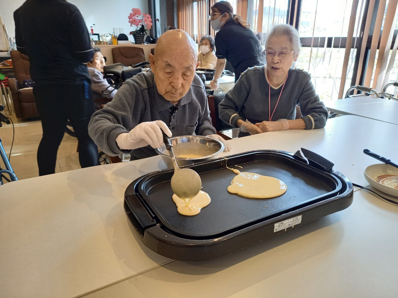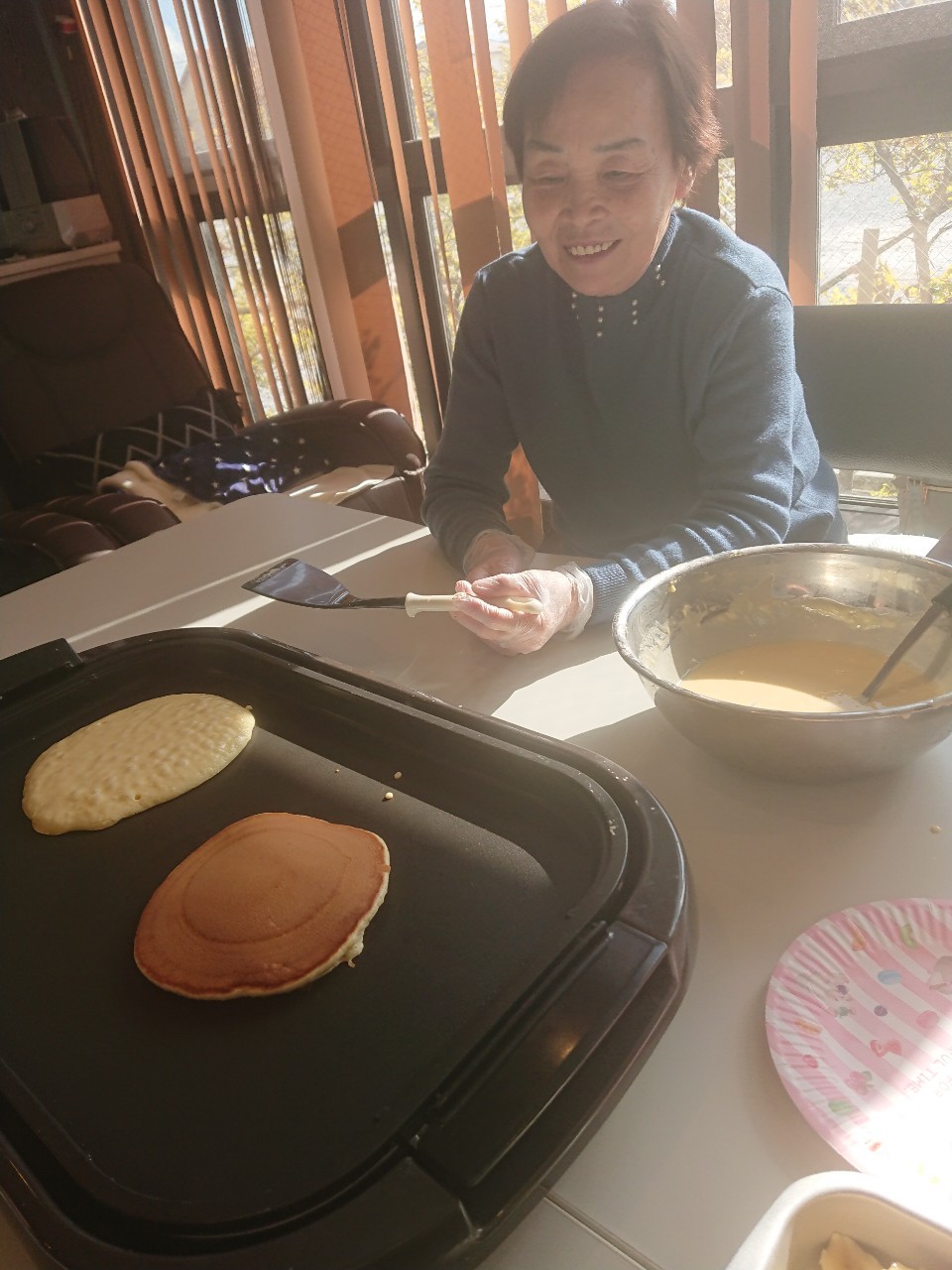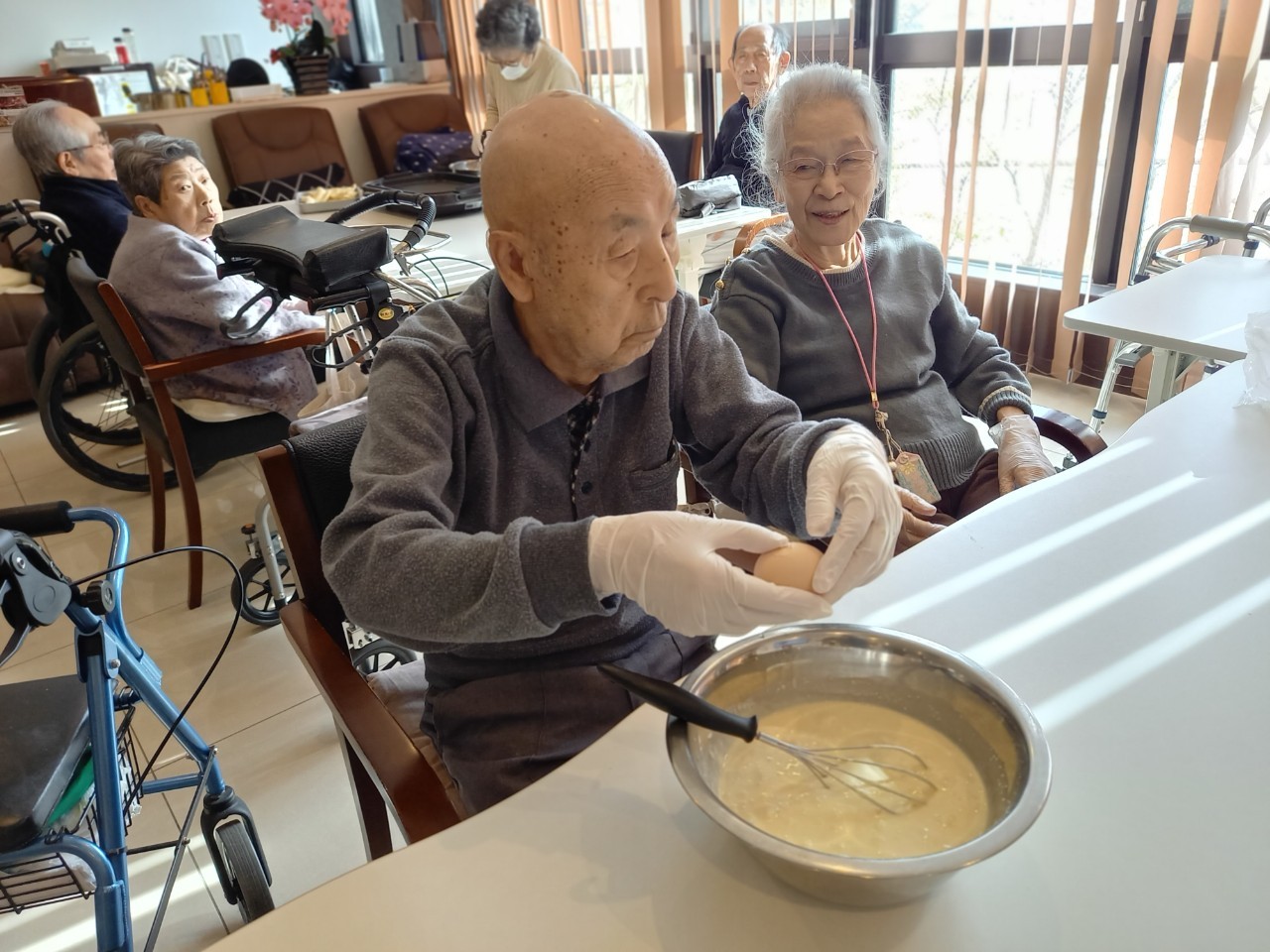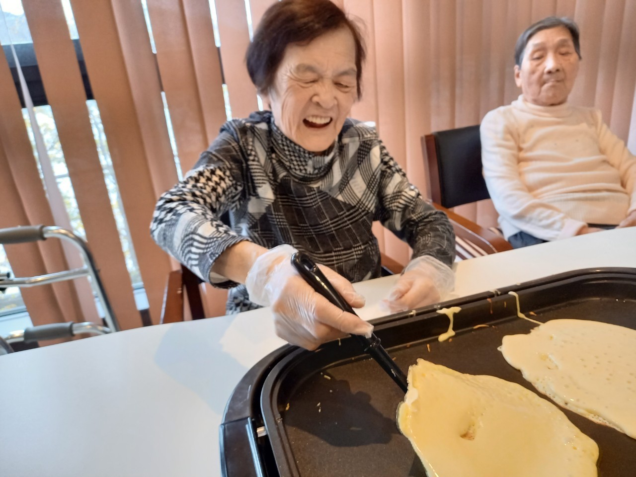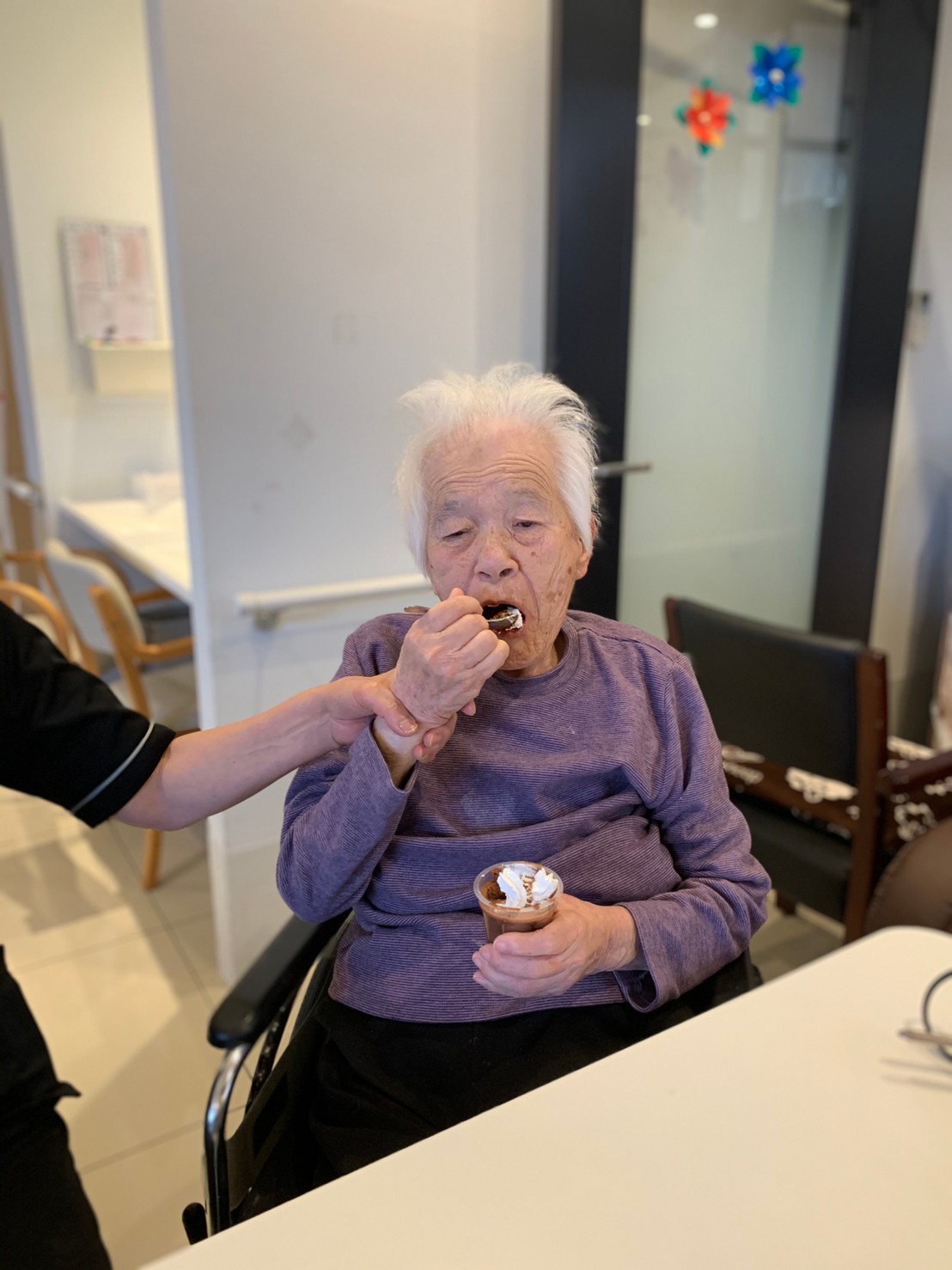 手作りおやつの日も二日目を迎えました。本日のお菓子は前日と変わらずチョコレートムースとバナナオムレットです。二日目となると利用者さまもスタッフも慣れて手際が良く、次はあれするんやろ??って聞いてくださり昨日よりも機能向上訓練の成果が出ているように感じます。おいしいお菓子と最高の笑顔ですごせた1日になりました(*´з`)