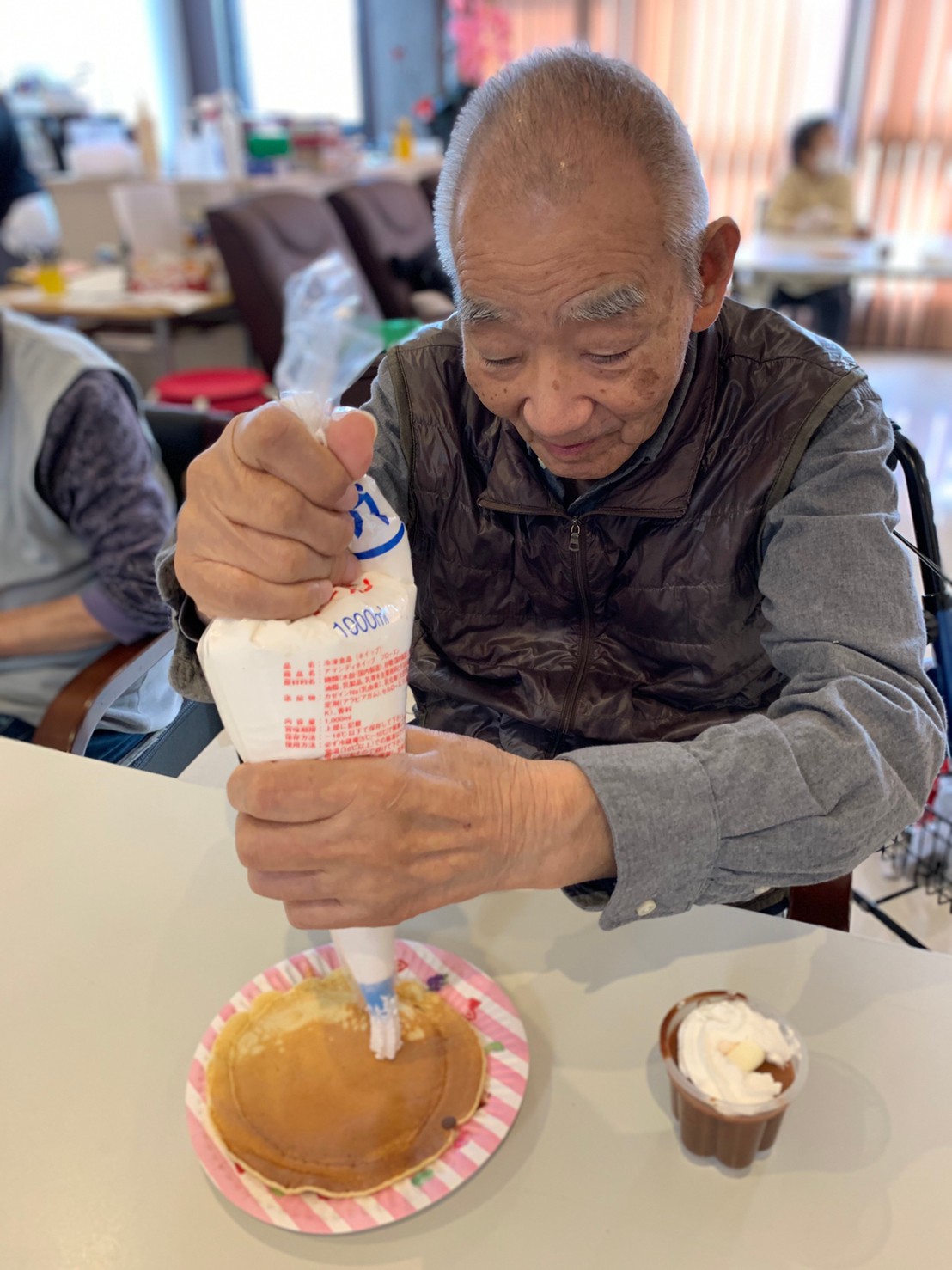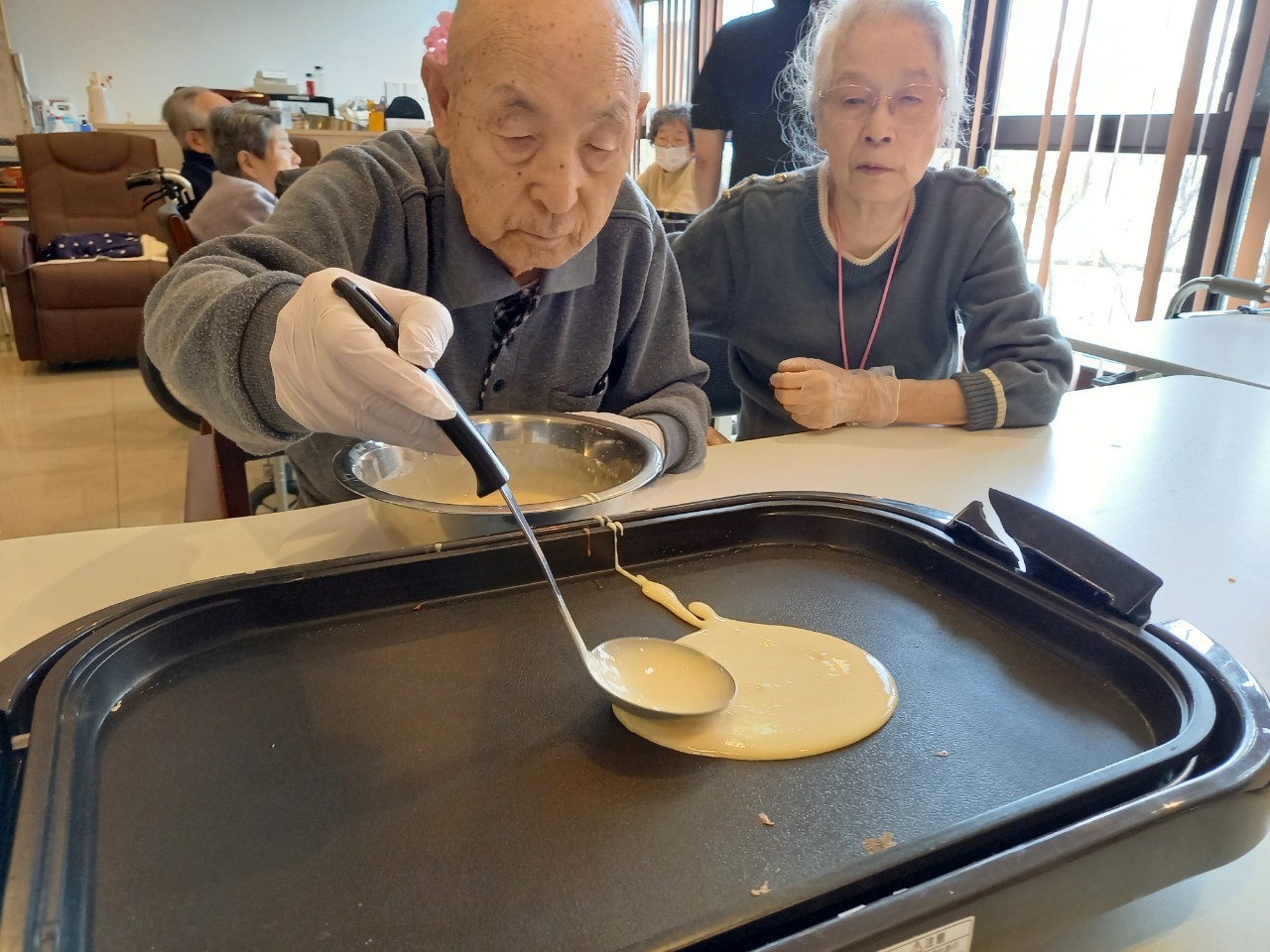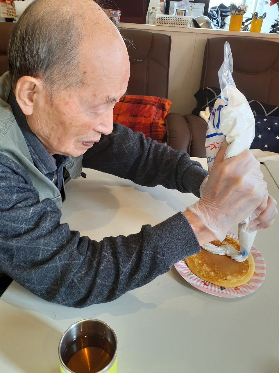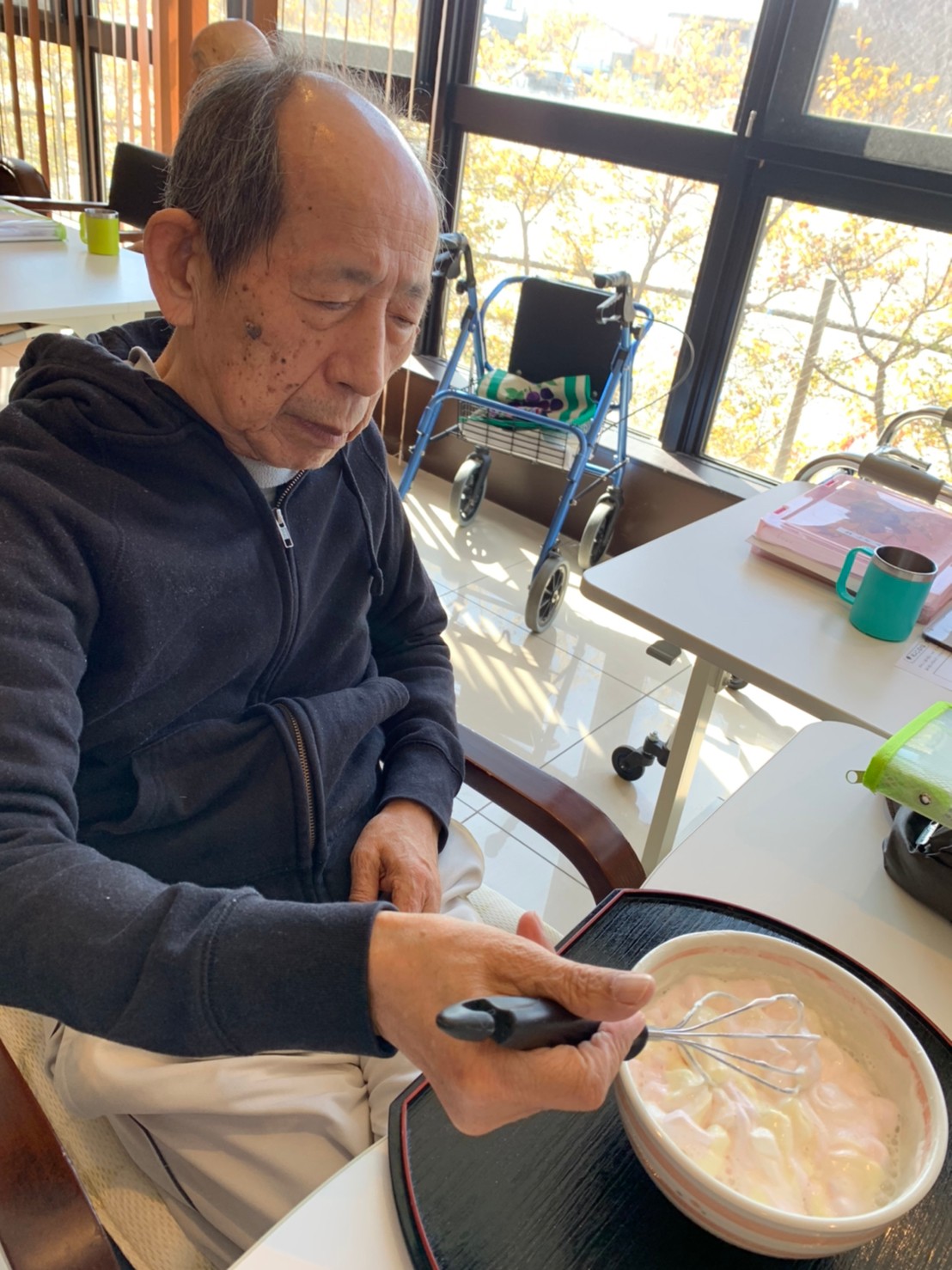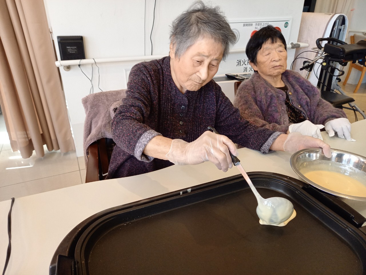 手作りおやつの日も二日目を迎えました。本日のお菓子は前日と変わらずチョコレートムースとバナナオムレットです。二日目となると利用者さまもスタッフも慣れて手際が良く、次はあれするんやろ??って聞いてくださり昨日よりも機能向上訓練の成果が出ているように感じます。おいしいお菓子と最高の笑顔ですごせた1日になりました(*´з`)