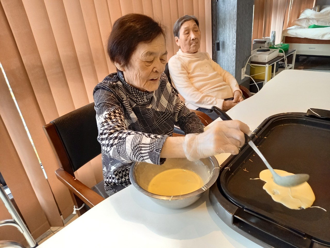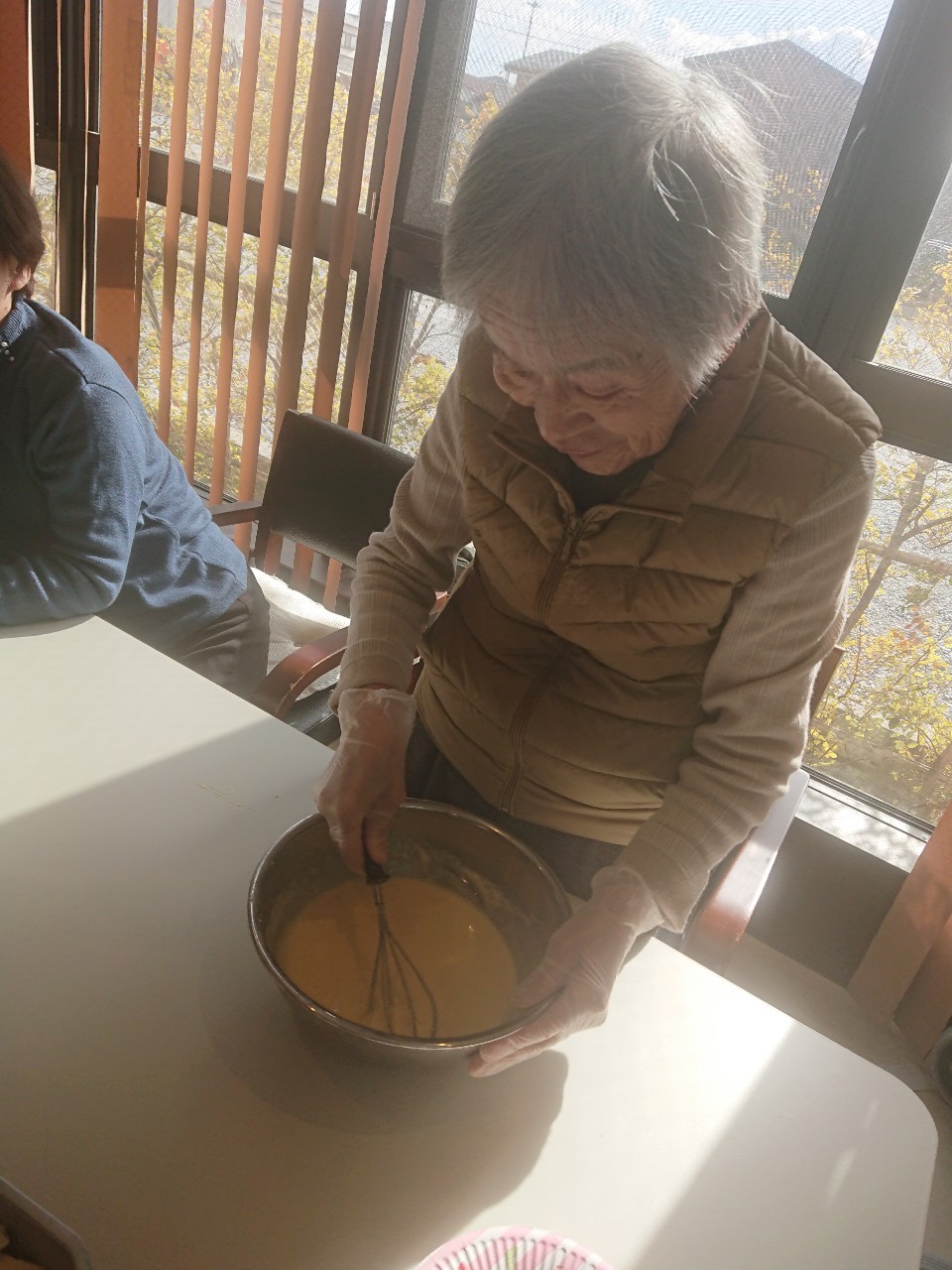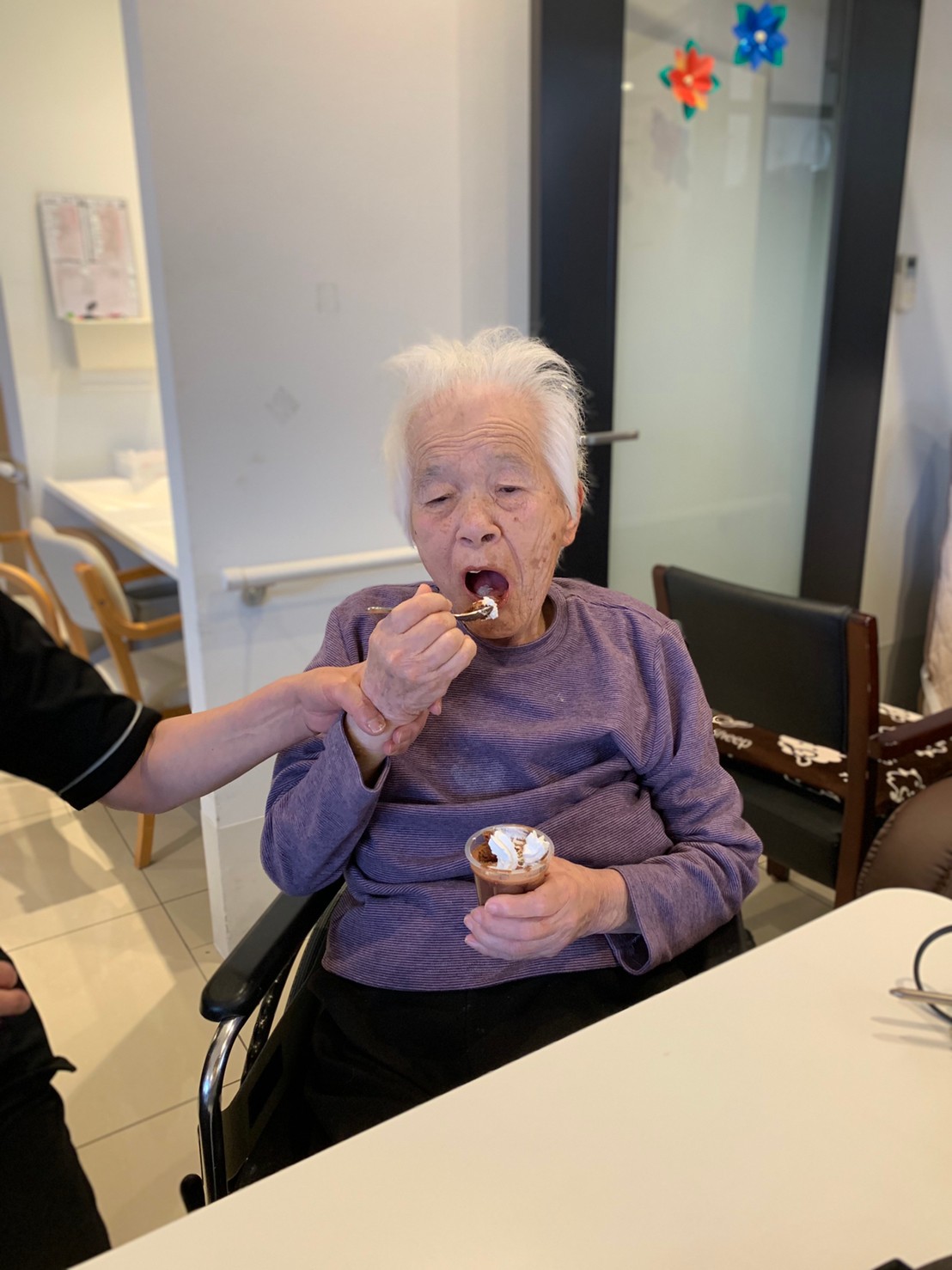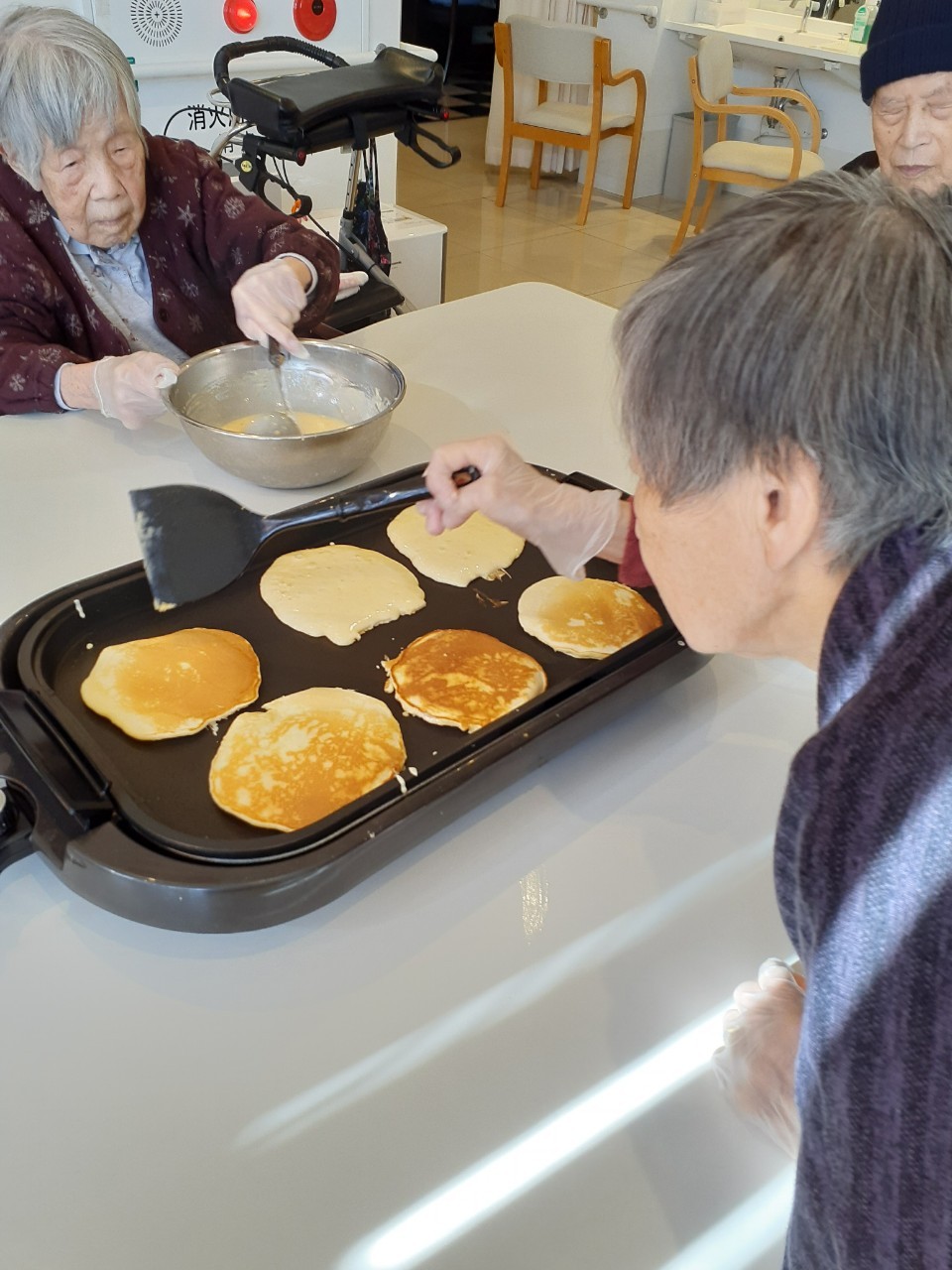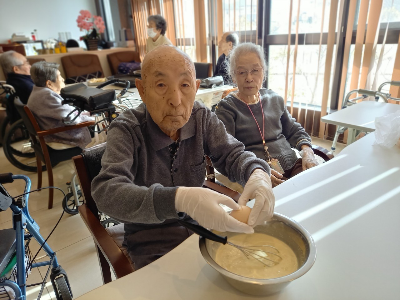 手作りおやつの日も二日目を迎えました。本日のお菓子は前日と変わらずチョコレートムースとバナナオムレットです。二日目となると利用者さまもスタッフも慣れて手際が良く、次はあれするんやろ??って聞いてくださり昨日よりも機能向上訓練の成果が出ているように感じます。おいしいお菓子と最高の笑顔ですごせた1日になりました(*´з`)