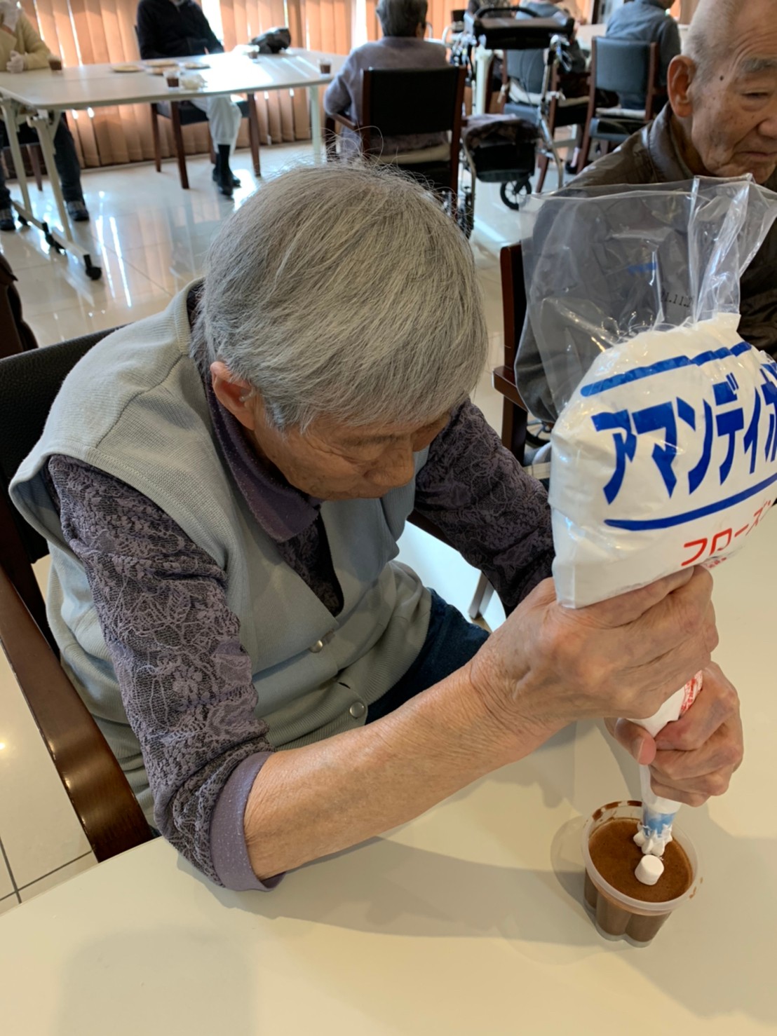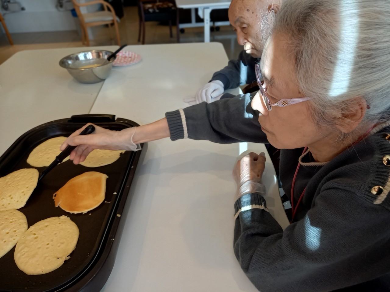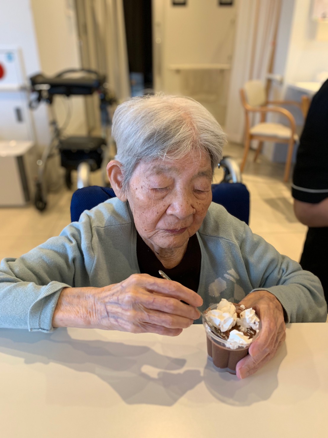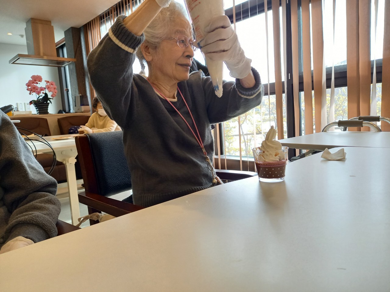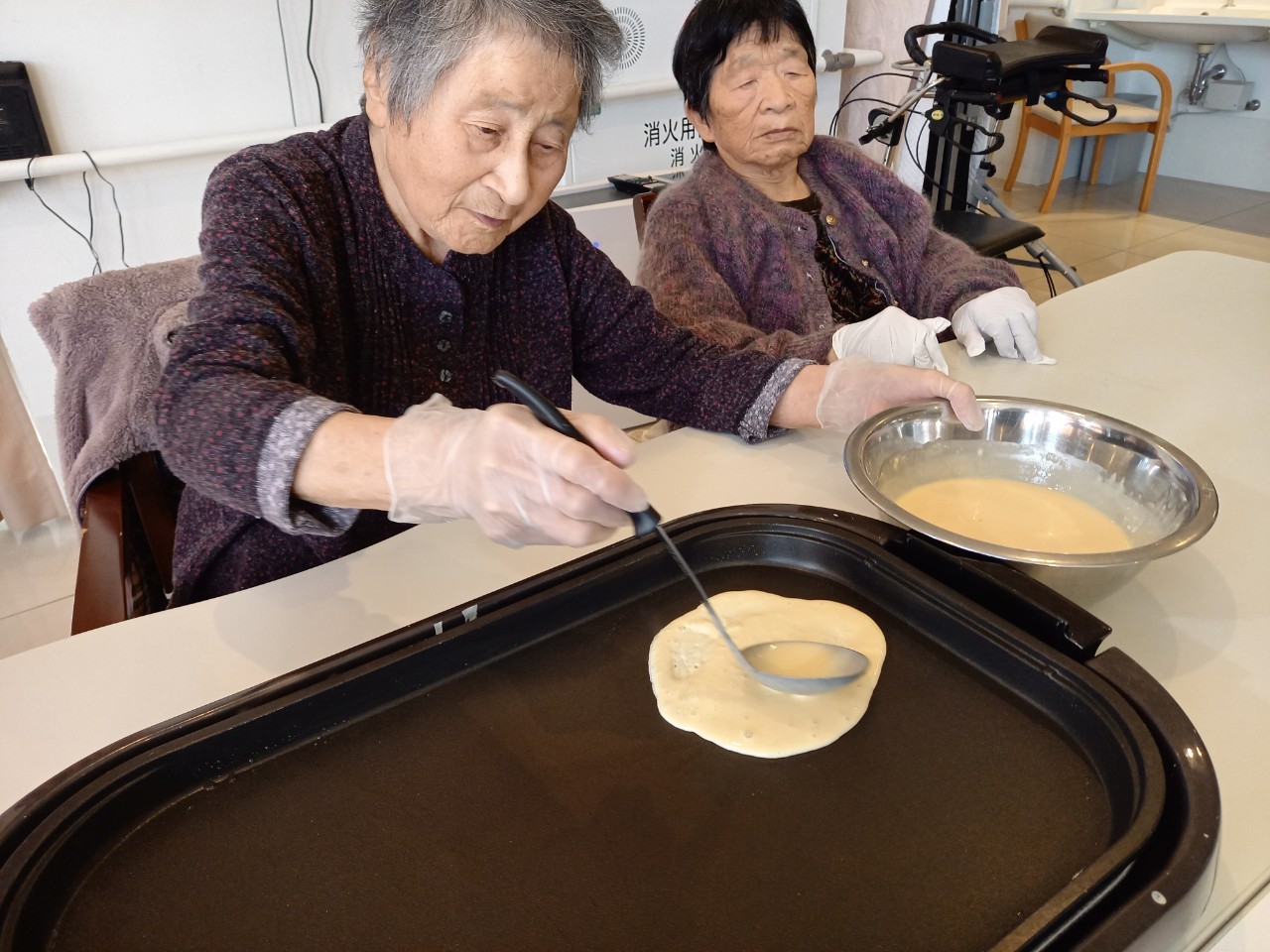 手作りおやつの日も二日目を迎えました。本日のお菓子は前日と変わらずチョコレートムースとバナナオムレットです。二日目となると利用者さまもスタッフも慣れて手際が良く、次はあれするんやろ??って聞いてくださり昨日よりも機能向上訓練の成果が出ているように感じます。おいしいお菓子と最高の笑顔ですごせた1日になりました(*´з`)