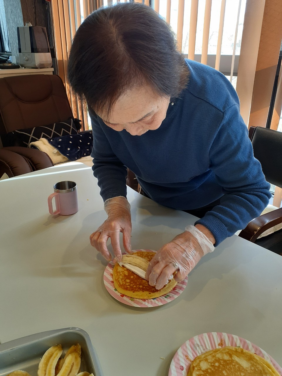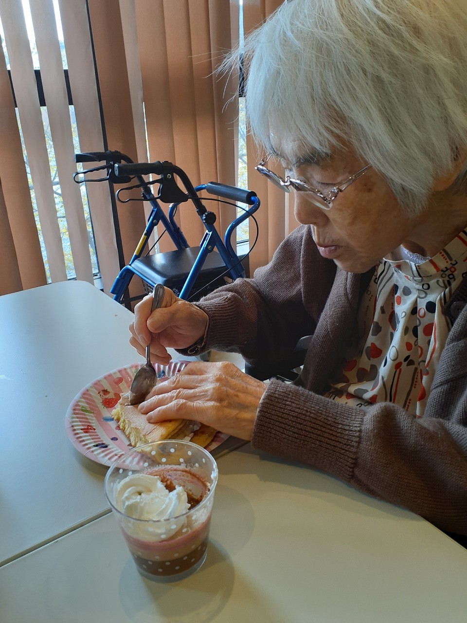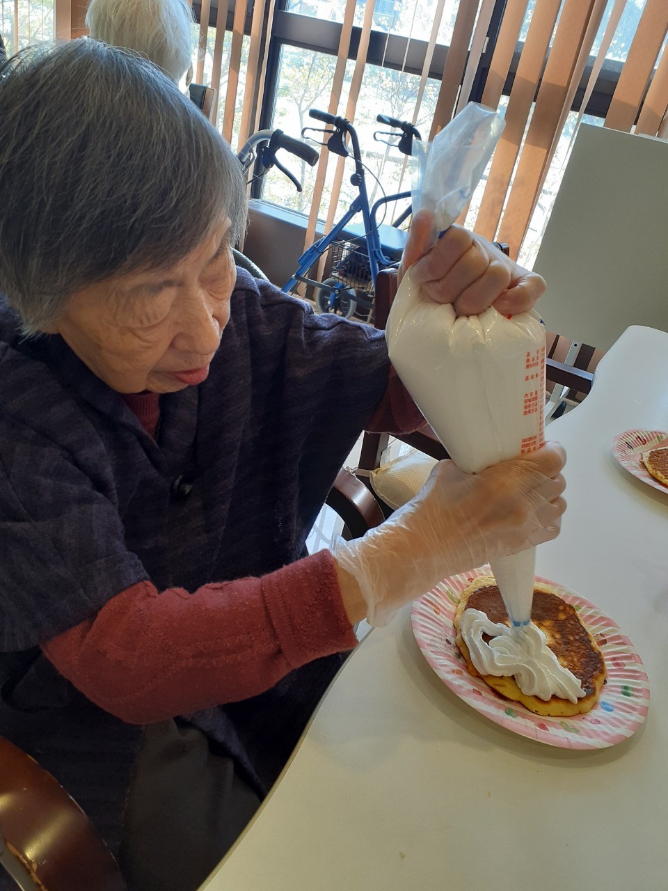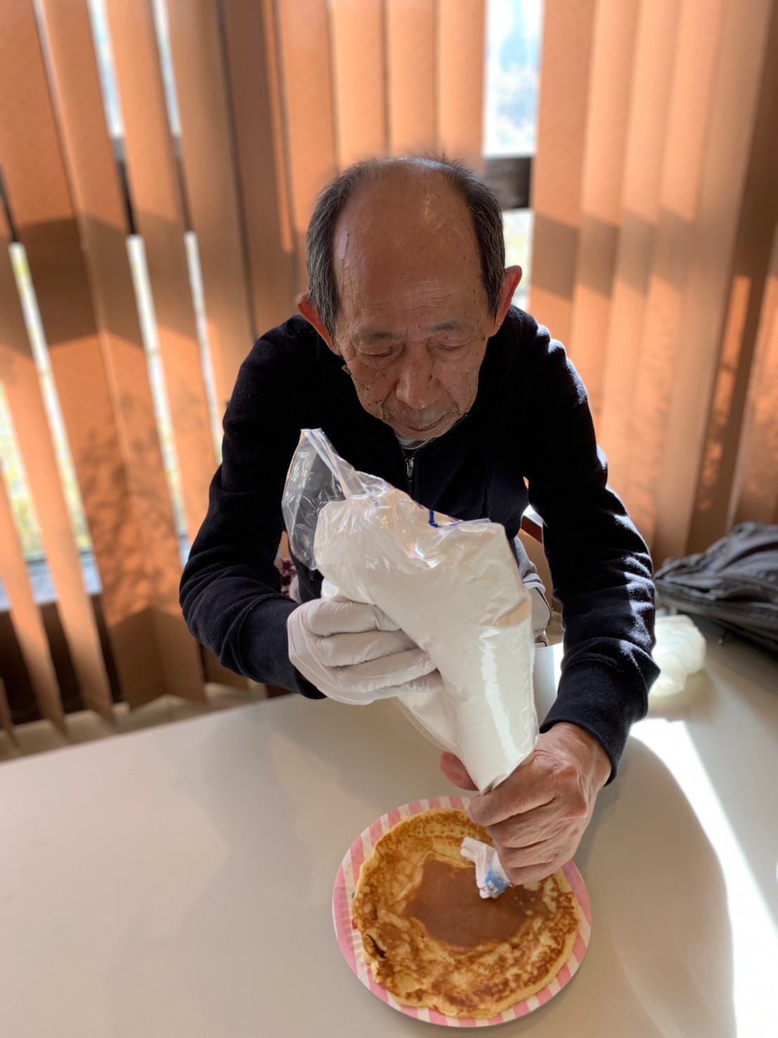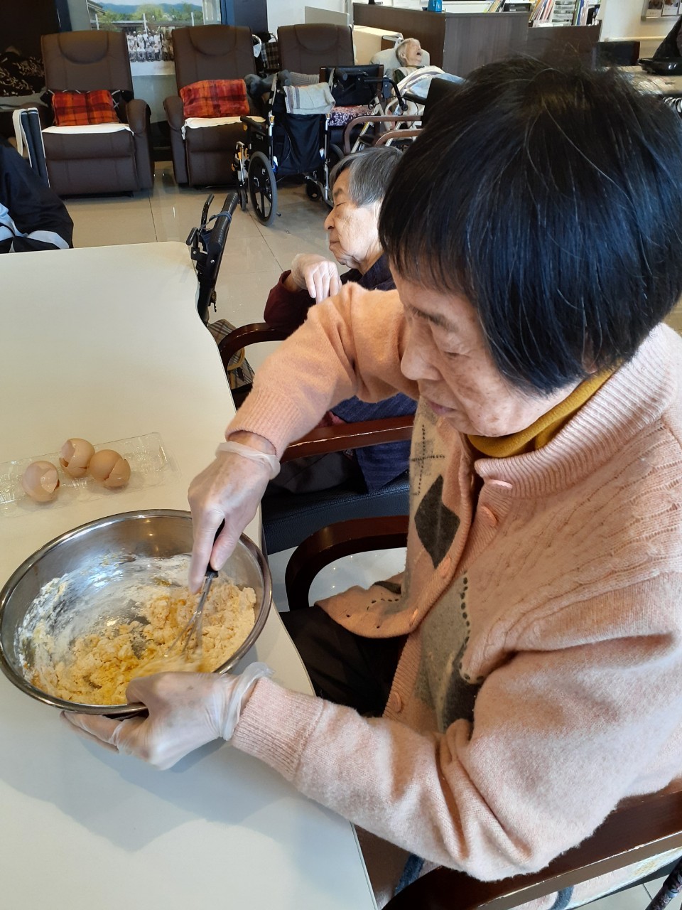 手作りおやつの日も二日目を迎えました。本日のお菓子は前日と変わらずチョコレートムースとバナナオムレットです。二日目となると利用者さまもスタッフも慣れて手際が良く、次はあれするんやろ??って聞いてくださり昨日よりも機能向上訓練の成果が出ているように感じます。おいしいお菓子と最高の笑顔ですごせた1日になりました(*´з`)