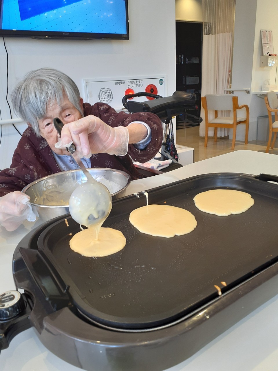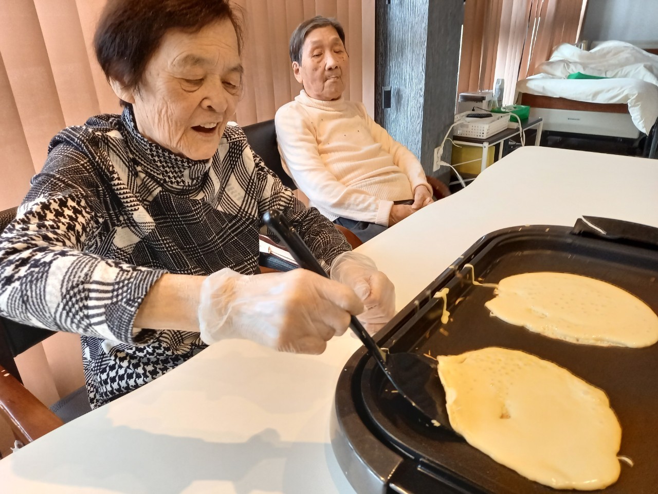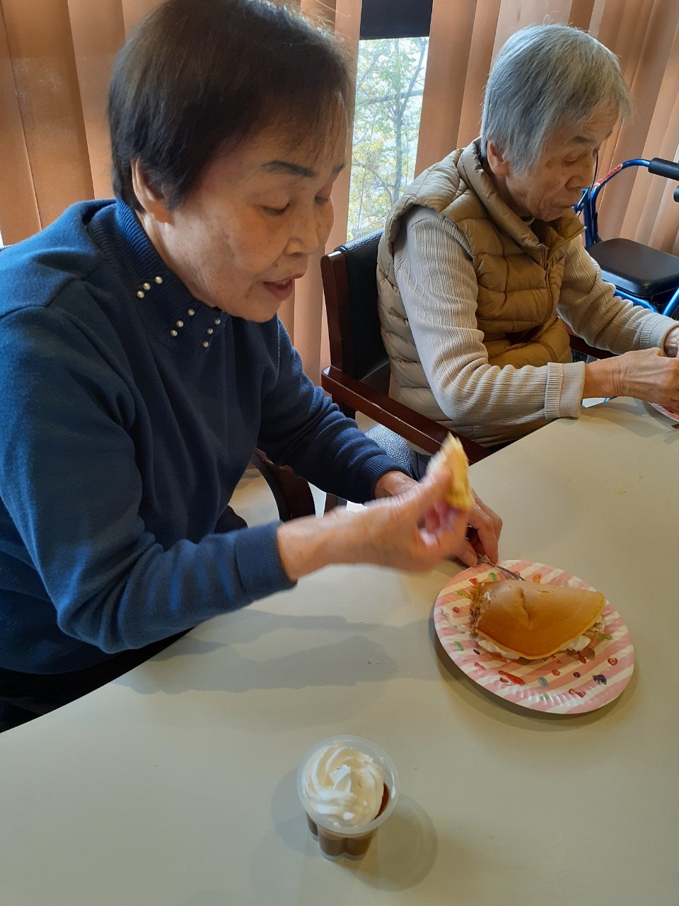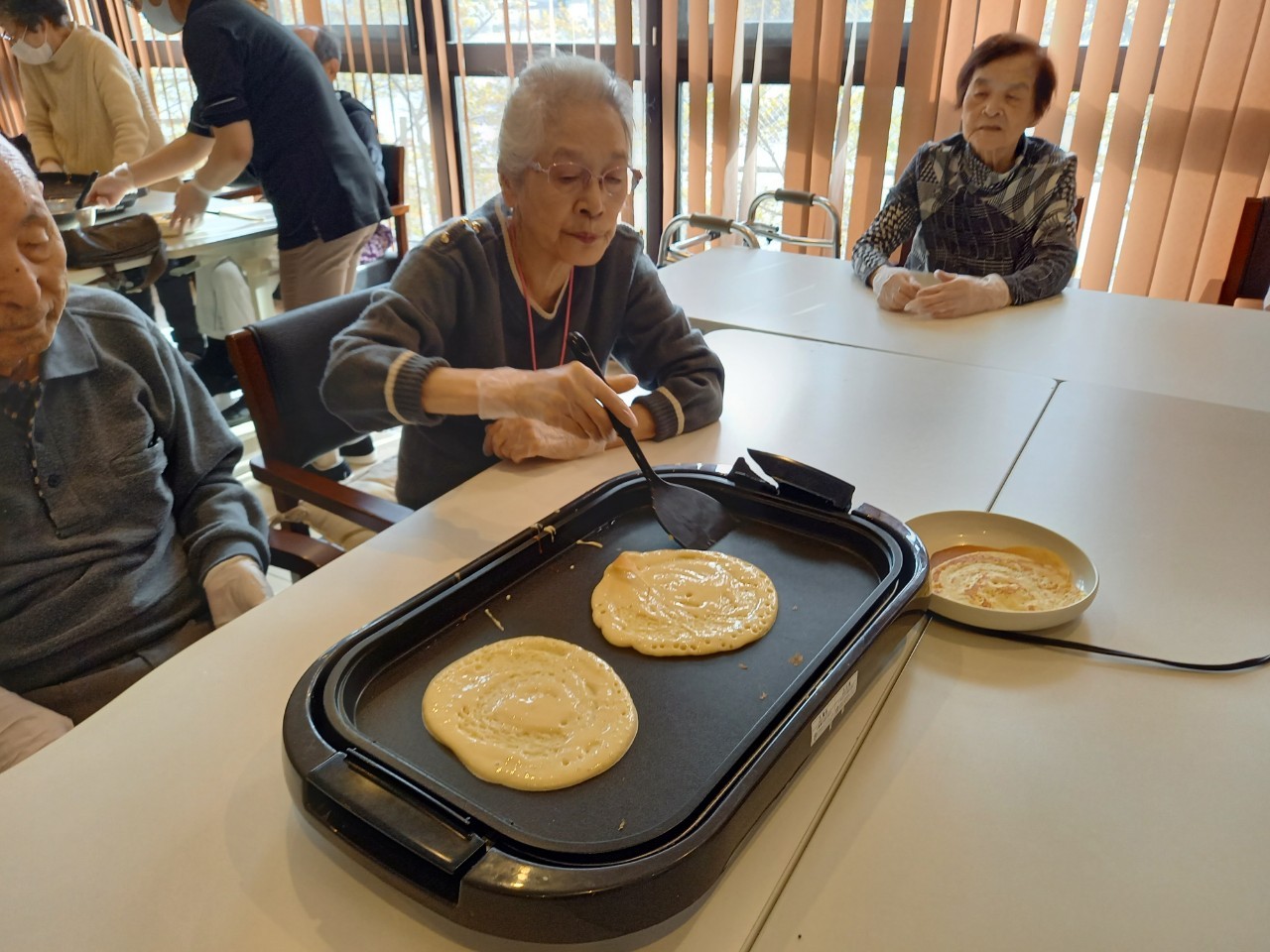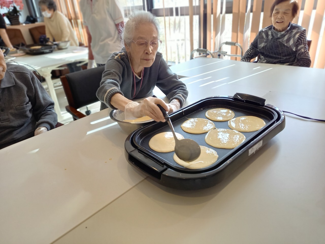 手作りおやつの日も二日目を迎えました。本日のお菓子は前日と変わらずチョコレートムースとバナナオムレットです。二日目となると利用者さまもスタッフも慣れて手際が良く、次はあれするんやろ??って聞いてくださり昨日よりも機能向上訓練の成果が出ているように感じます。おいしいお菓子と最高の笑顔ですごせた1日になりました(*´з`)