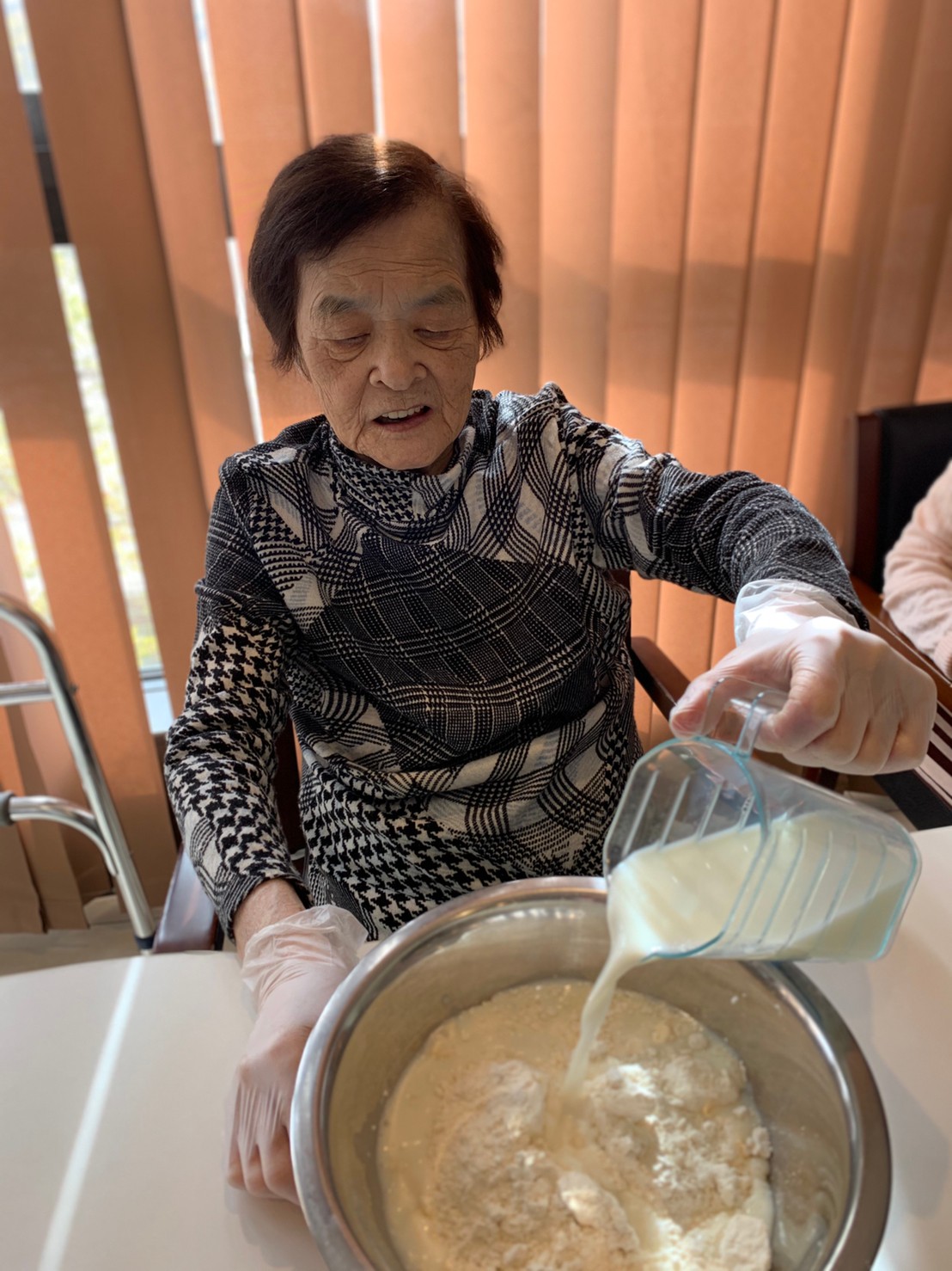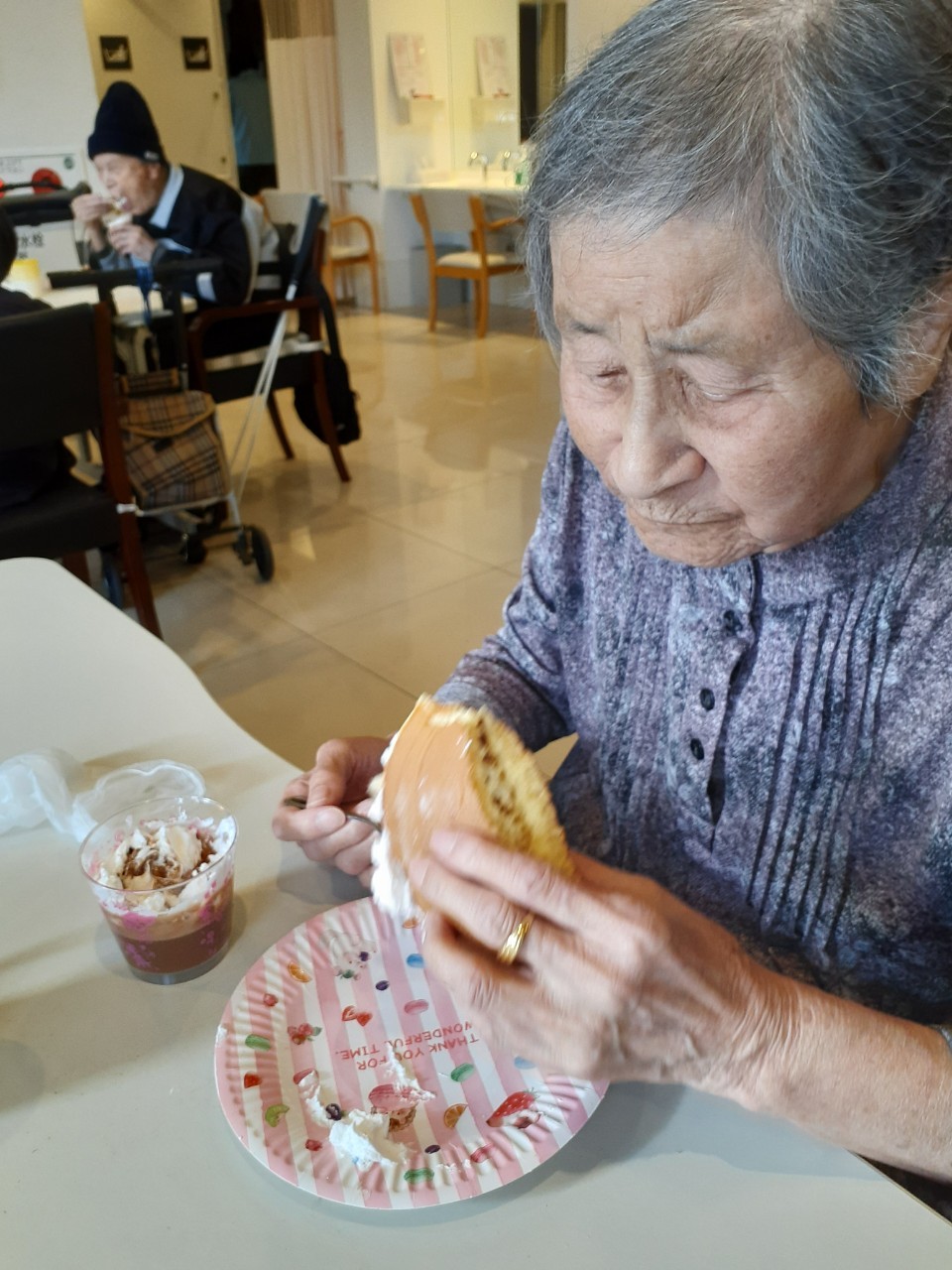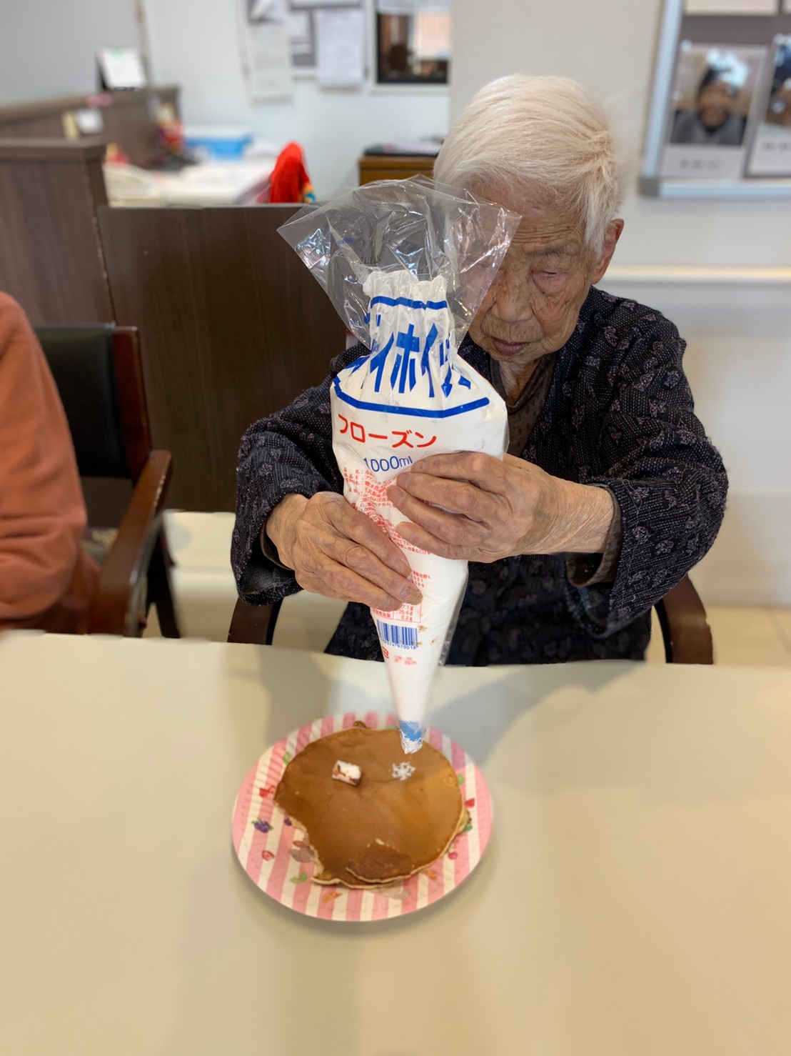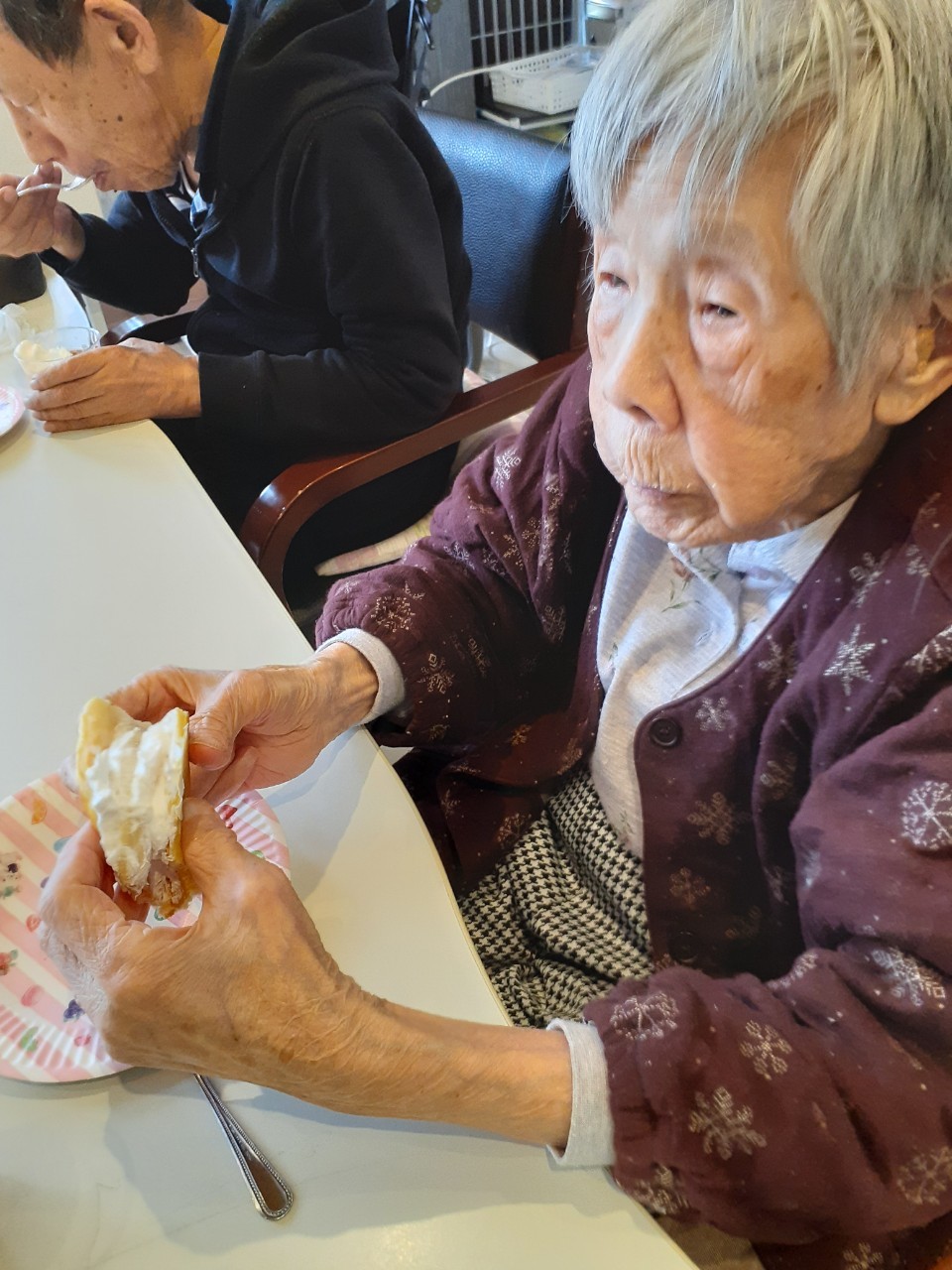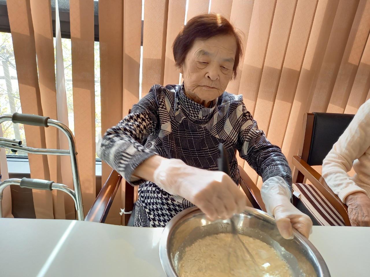 手作りおやつの日も二日目を迎えました。本日のお菓子は前日と変わらずチョコレートムースとバナナオムレットです。二日目となると利用者さまもスタッフも慣れて手際が良く、次はあれするんやろ??って聞いてくださり昨日よりも機能向上訓練の成果が出ているように感じます。おいしいお菓子と最高の笑顔ですごせた1日になりました(*´з`)