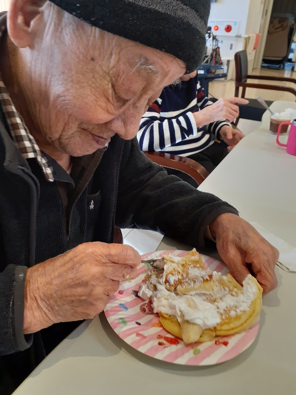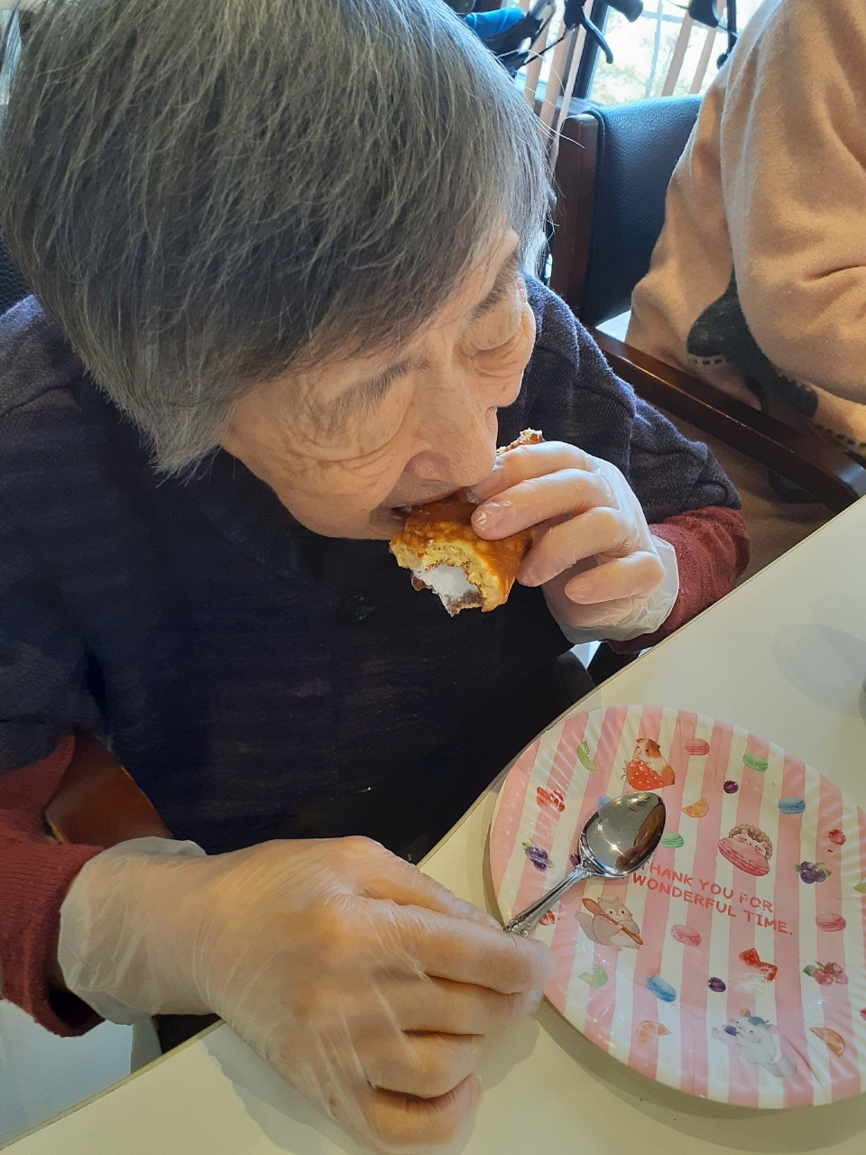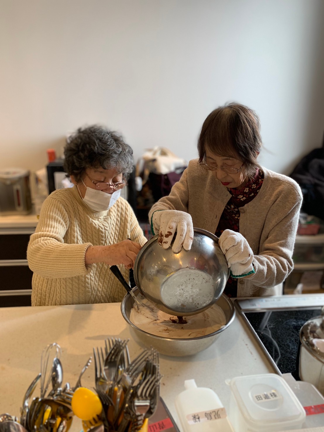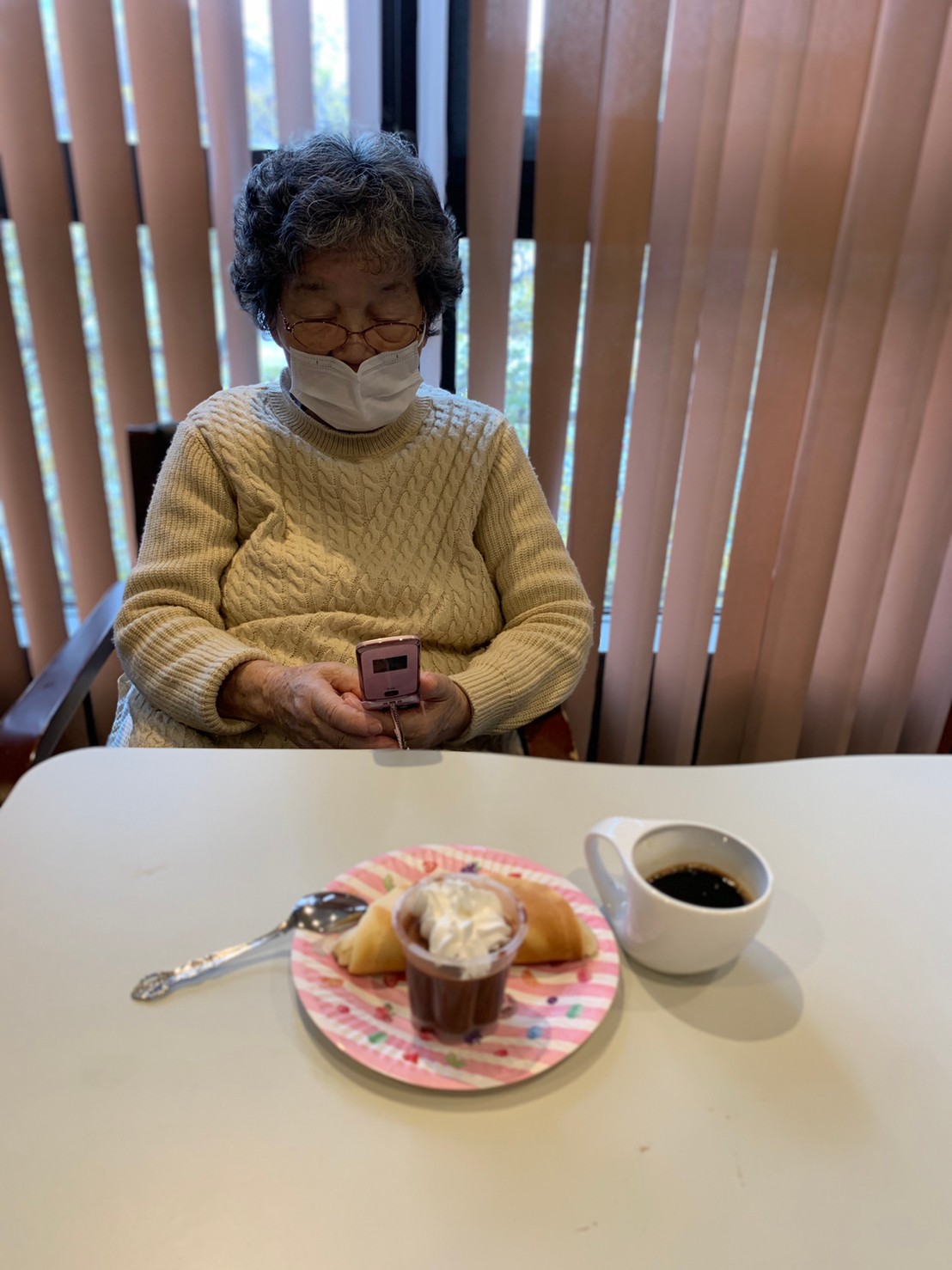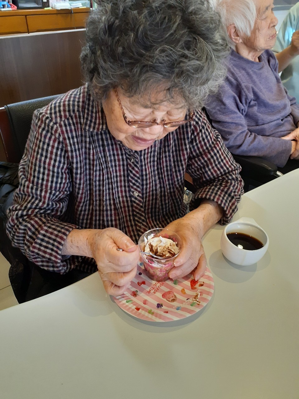 手作りおやつの日も二日目を迎えました。本日のお菓子は前日と変わらずチョコレートムースとバナナオムレットです。二日目となると利用者さまもスタッフも慣れて手際が良く、次はあれするんやろ??って聞いてくださり昨日よりも機能向上訓練の成果が出ているように感じます。おいしいお菓子と最高の笑顔ですごせた1日になりました(*´з`)