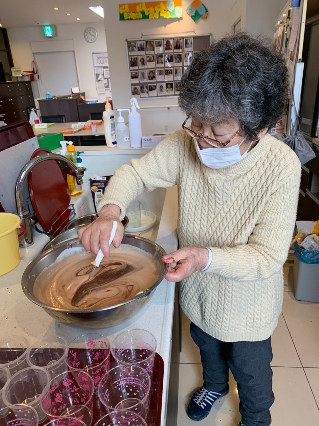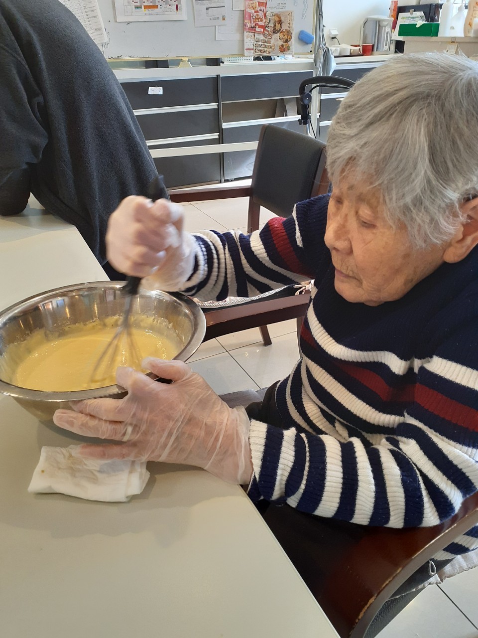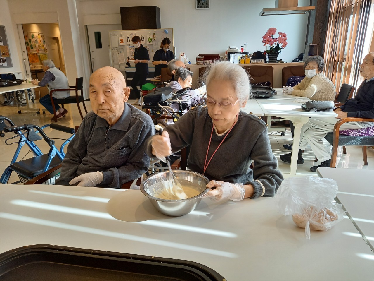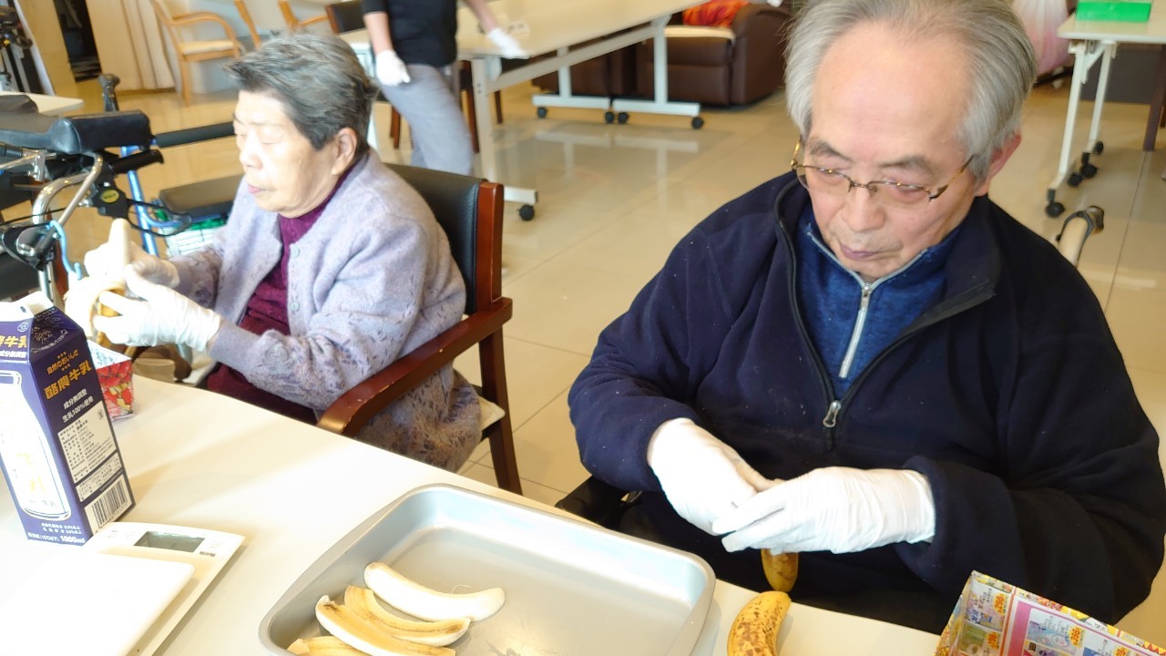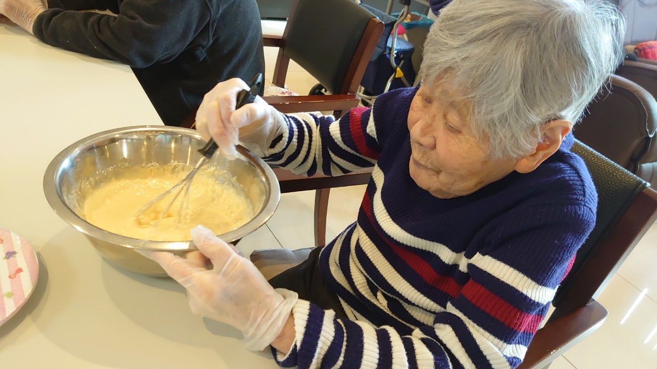 今日から2日に分けて手作りおやつの日を開催します。月に1回のレクリエーションとして利用者さまにお菓子を作っていただき、お茶会をしながらお召し上がりになられます。2月のお菓子はバレンタインデーにちなんでチョコレートムースとバナナオムレットです。