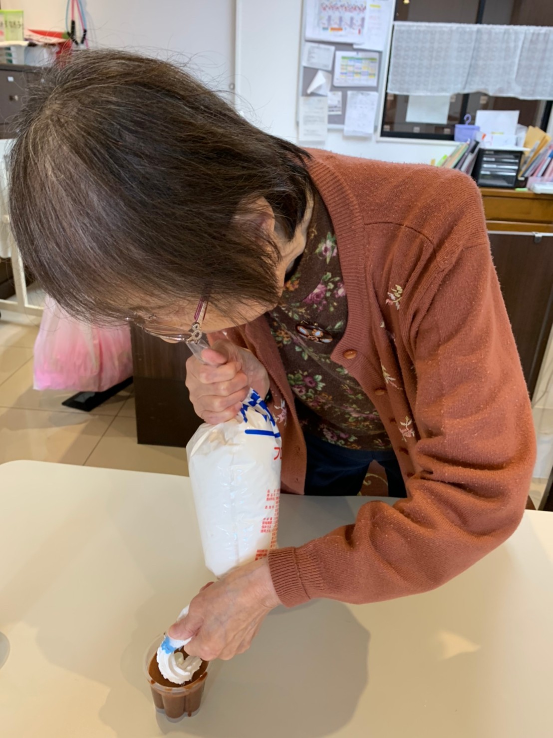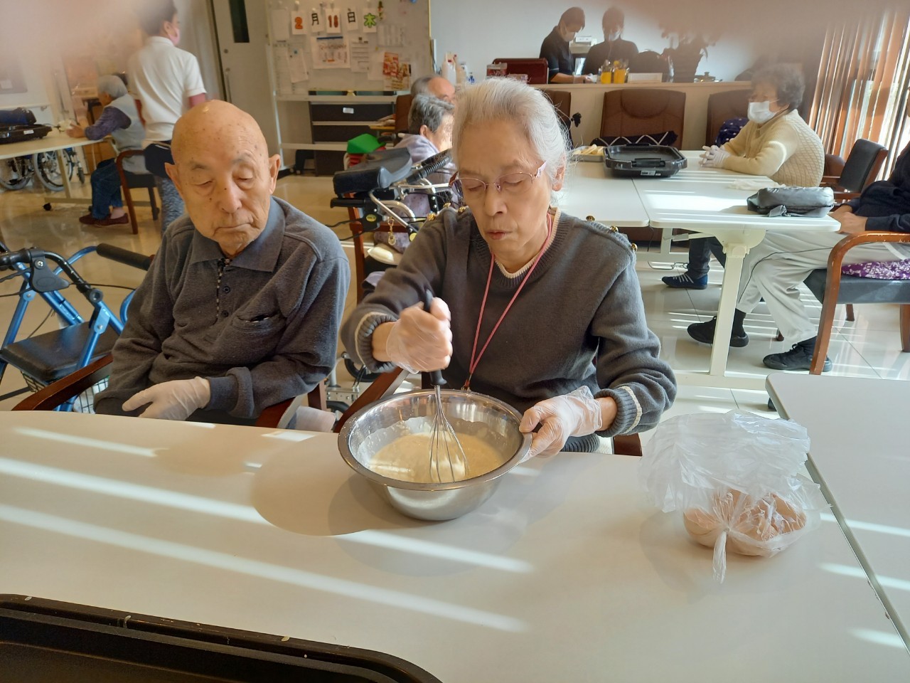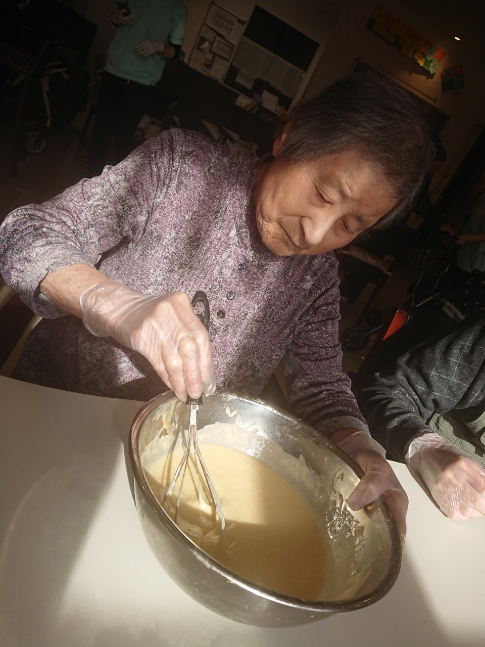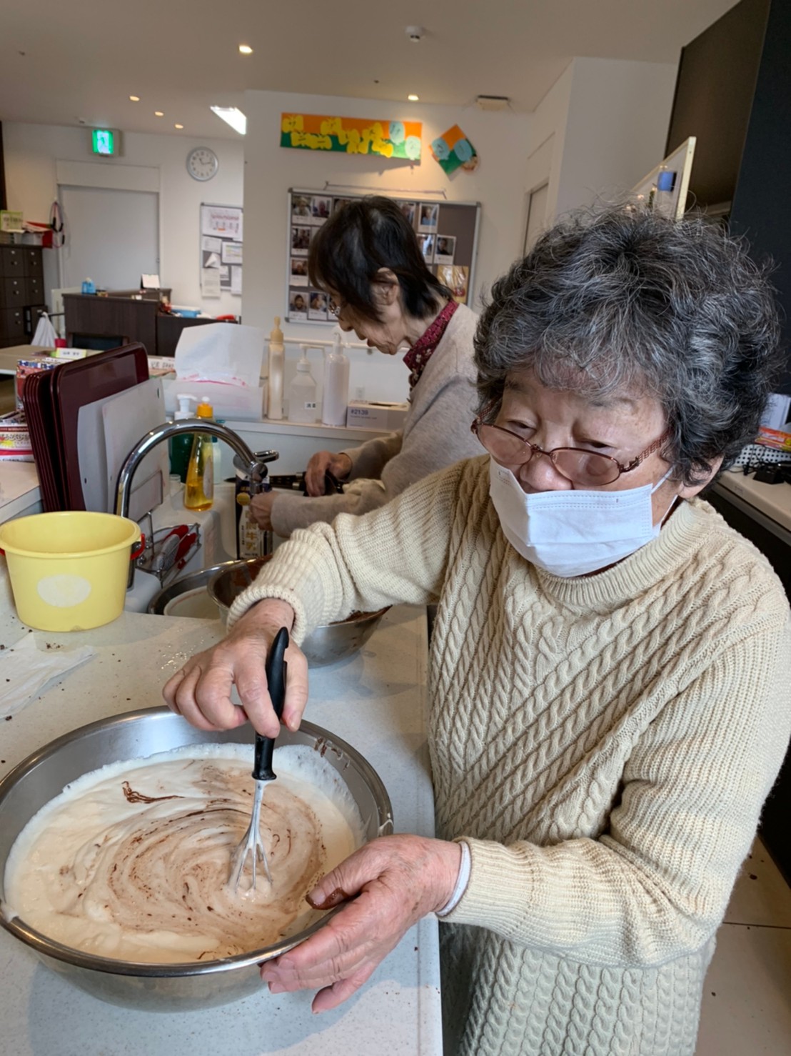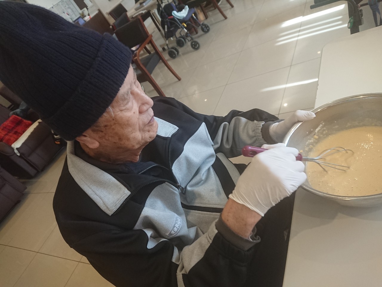今日から2日に分けて手作りおやつの日を開催します。月に1回のレクリエーションとして利用者さまにお菓子を作っていただき、お茶会をしながらお召し上がりになられます。2月のお菓子はバレンタインデーにちなんでチョコレートムースとバナナオムレットです。