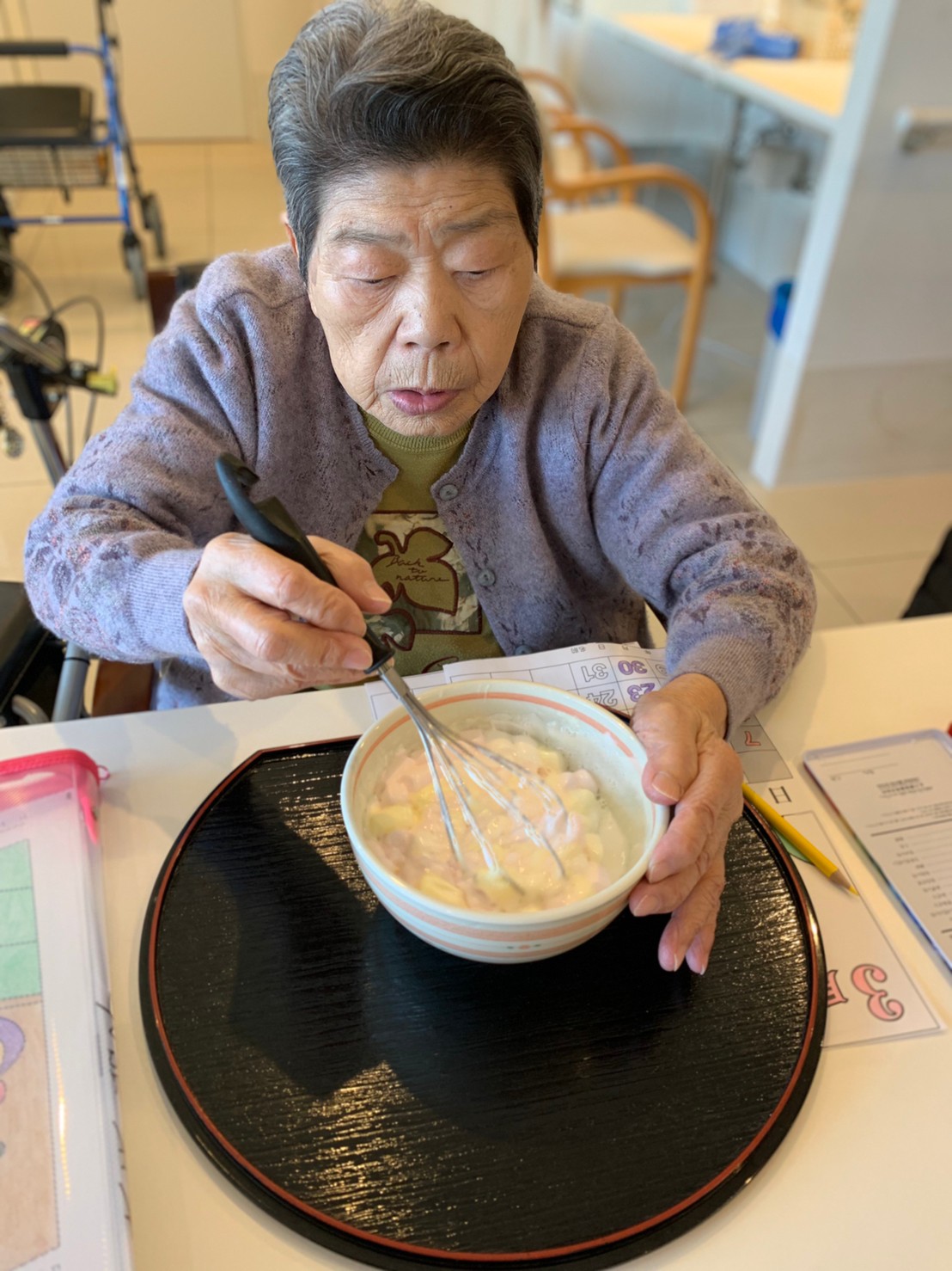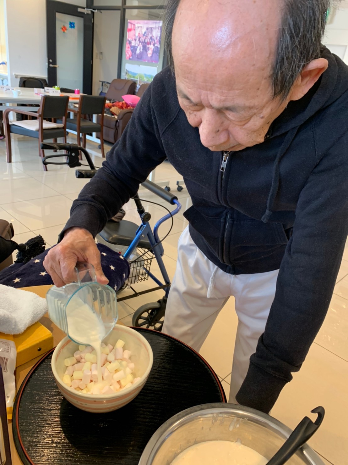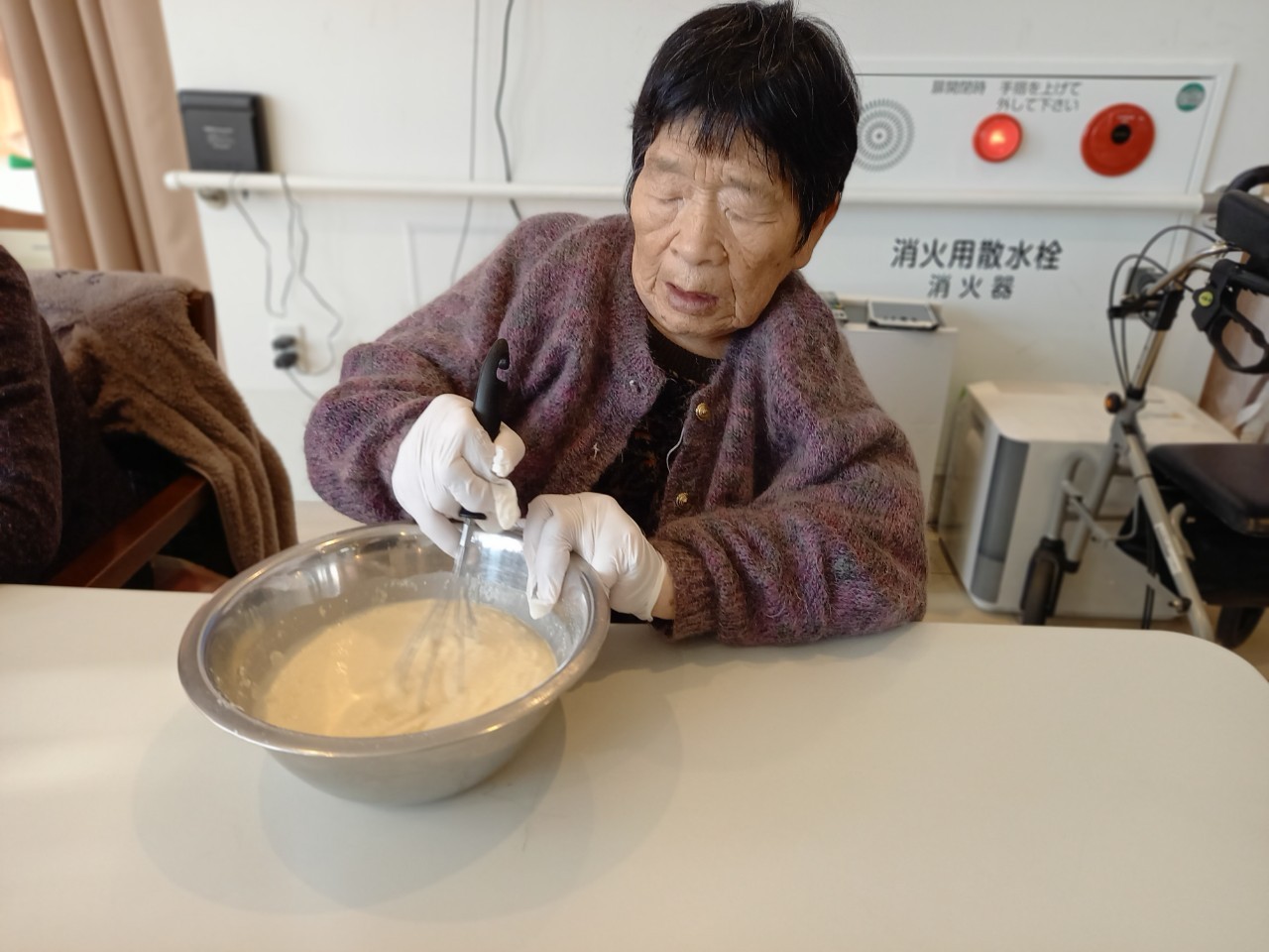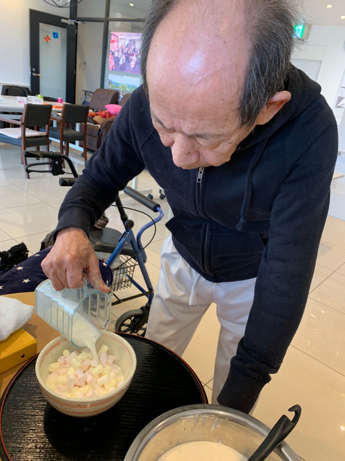 今日から2日に分けて手作りおやつの日を開催します。月に1回のレクリエーションとして利用者さまにお菓子を作っていただき、お茶会をしながらお召し上がりになられます。2月のお菓子はバレンタインデーにちなんでチョコレートムースとバナナオムレットです。