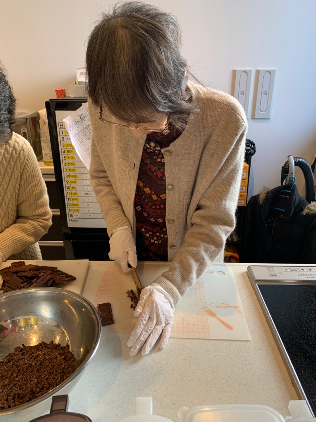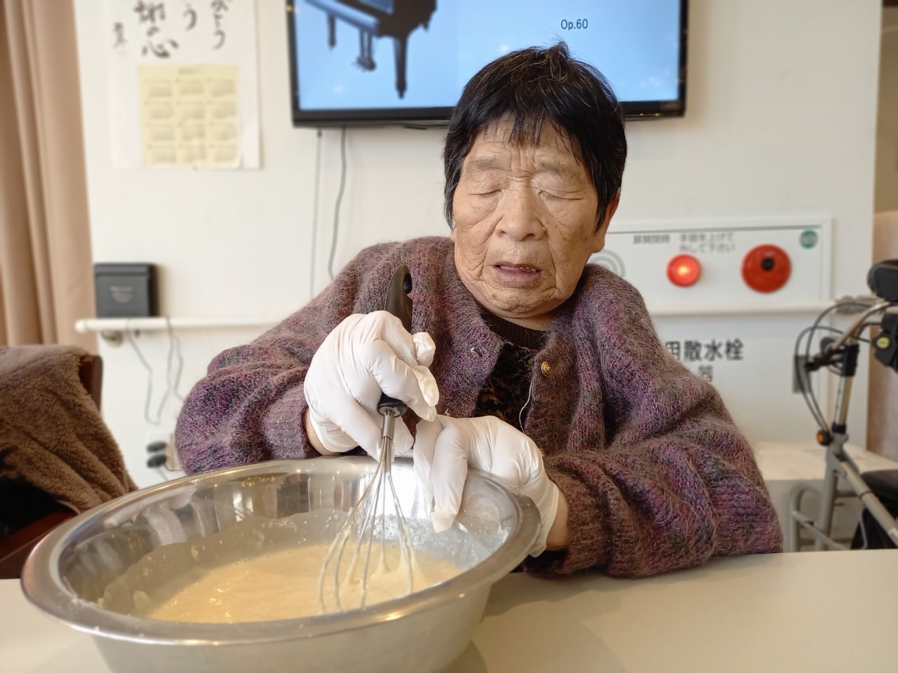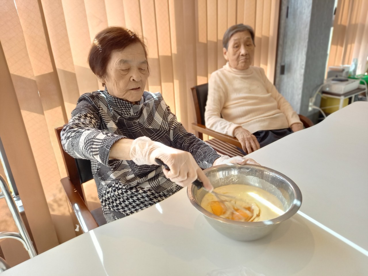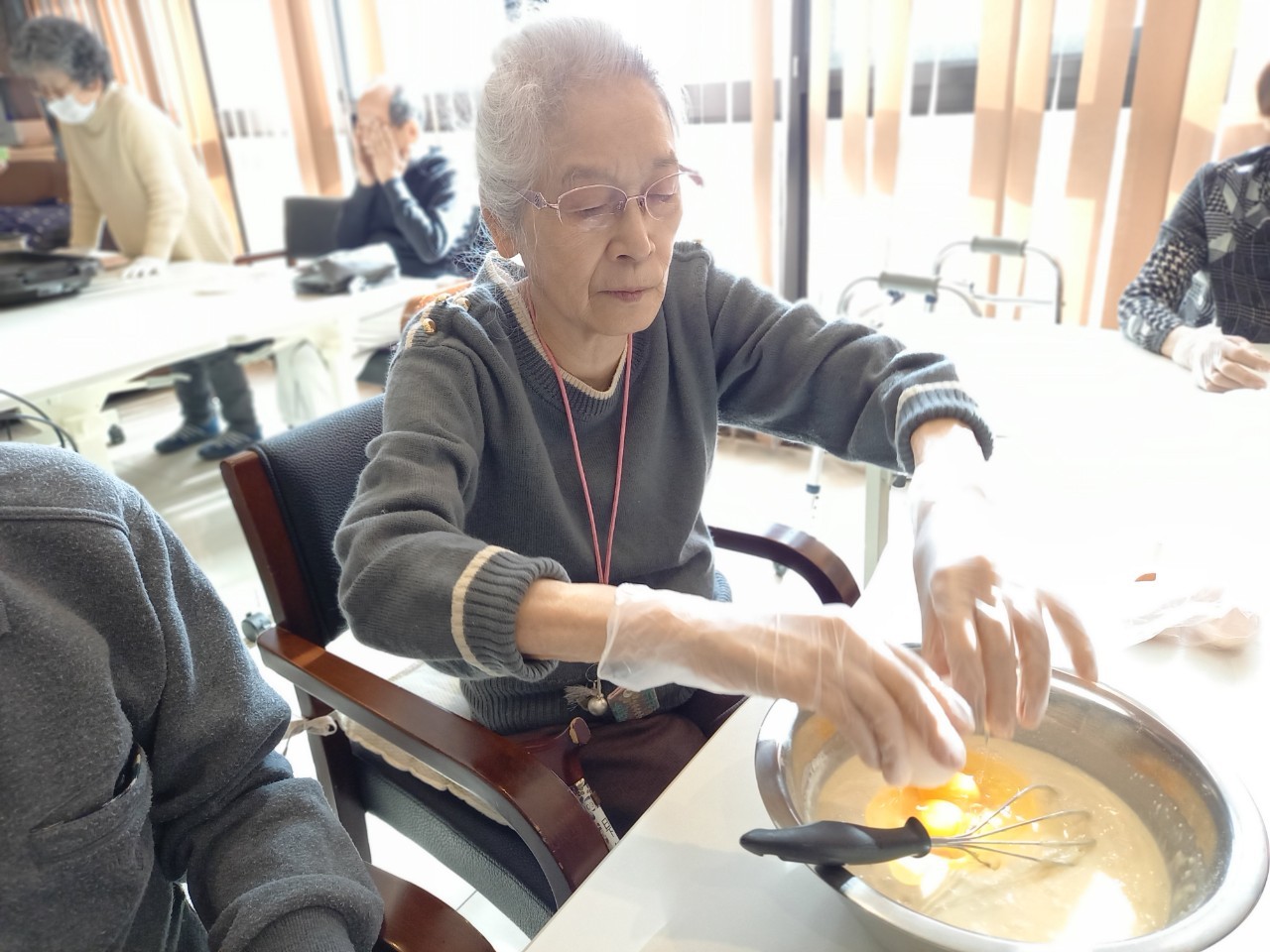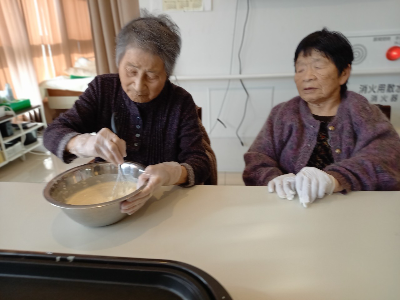 今日から2日に分けて手作りおやつの日を開催します。月に1回のレクリエーションとして利用者さまにお菓子を作っていただき、お茶会をしながらお召し上がりになられます。2月のお菓子はバレンタインデーにちなんでチョコレートムースとバナナオムレットです。