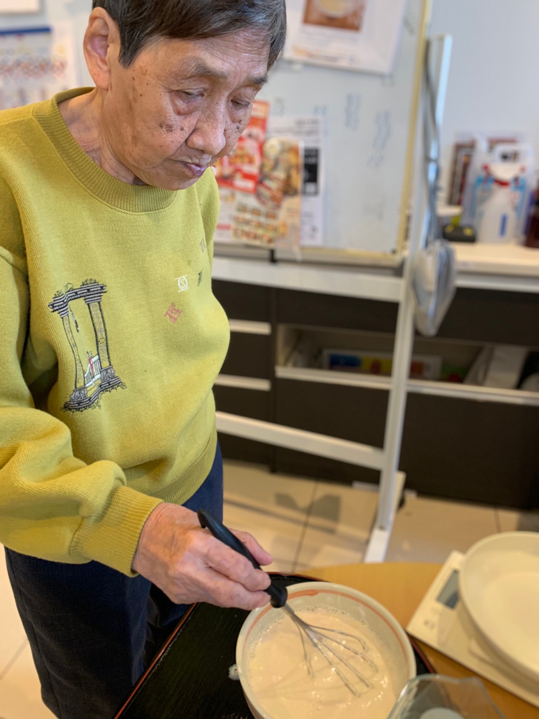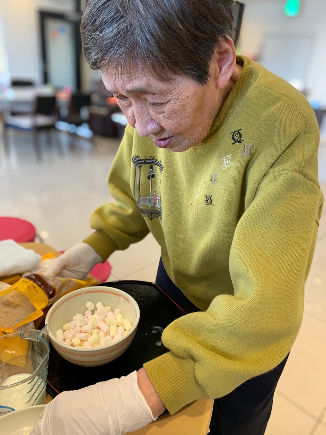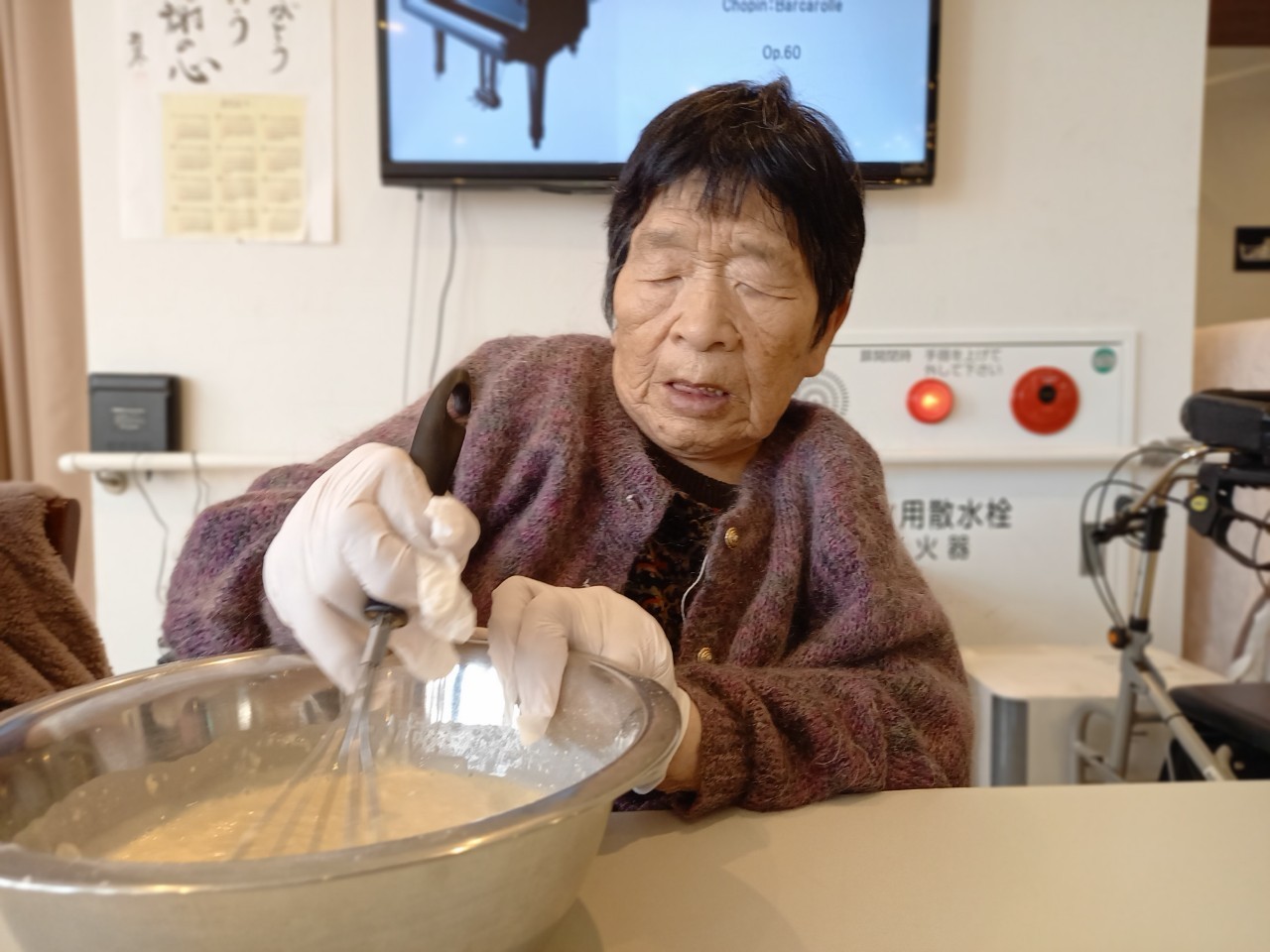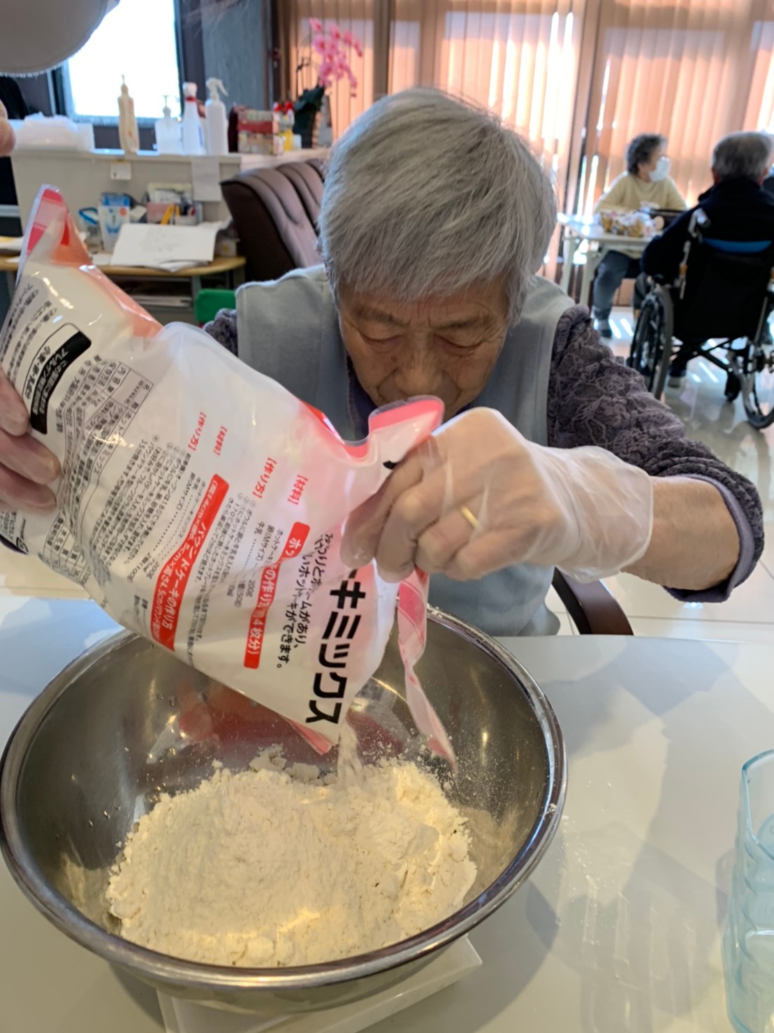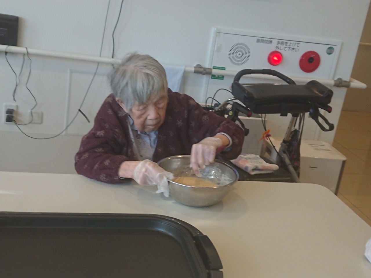 今日から2日に分けて手作りおやつの日を開催します。月に1回のレクリエーションとして利用者さまにお菓子を作っていただき、お茶会をしながらお召し上がりになられます。2月のお菓子はバレンタインデーにちなんでチョコレートムースとバナナオムレットです。