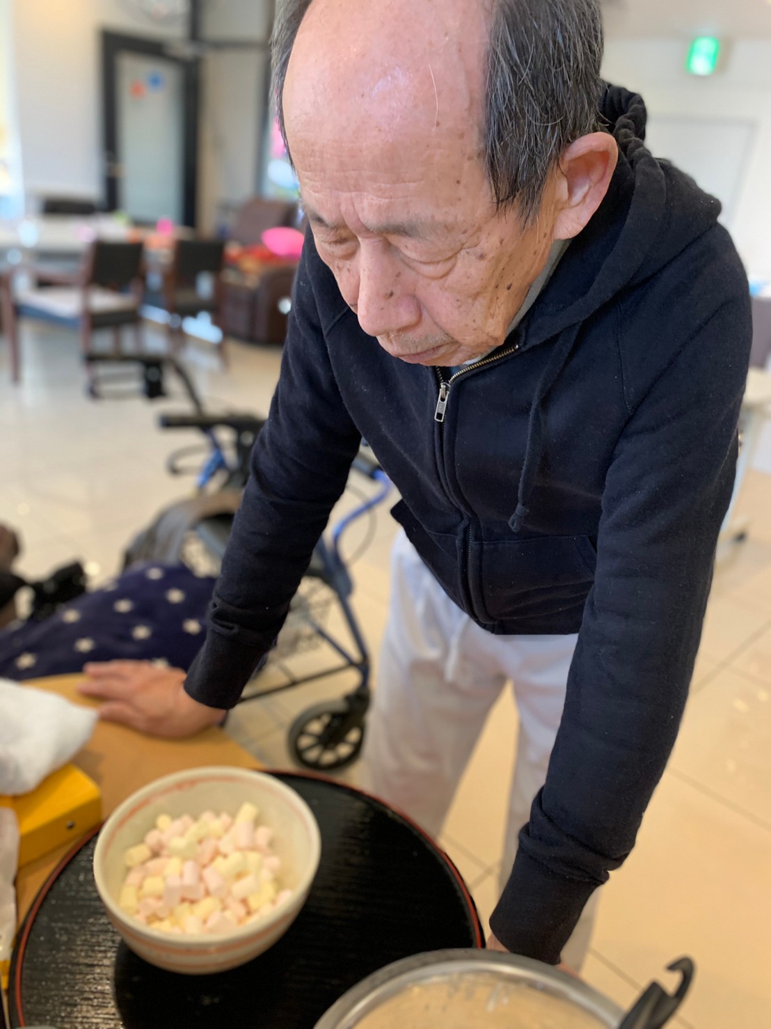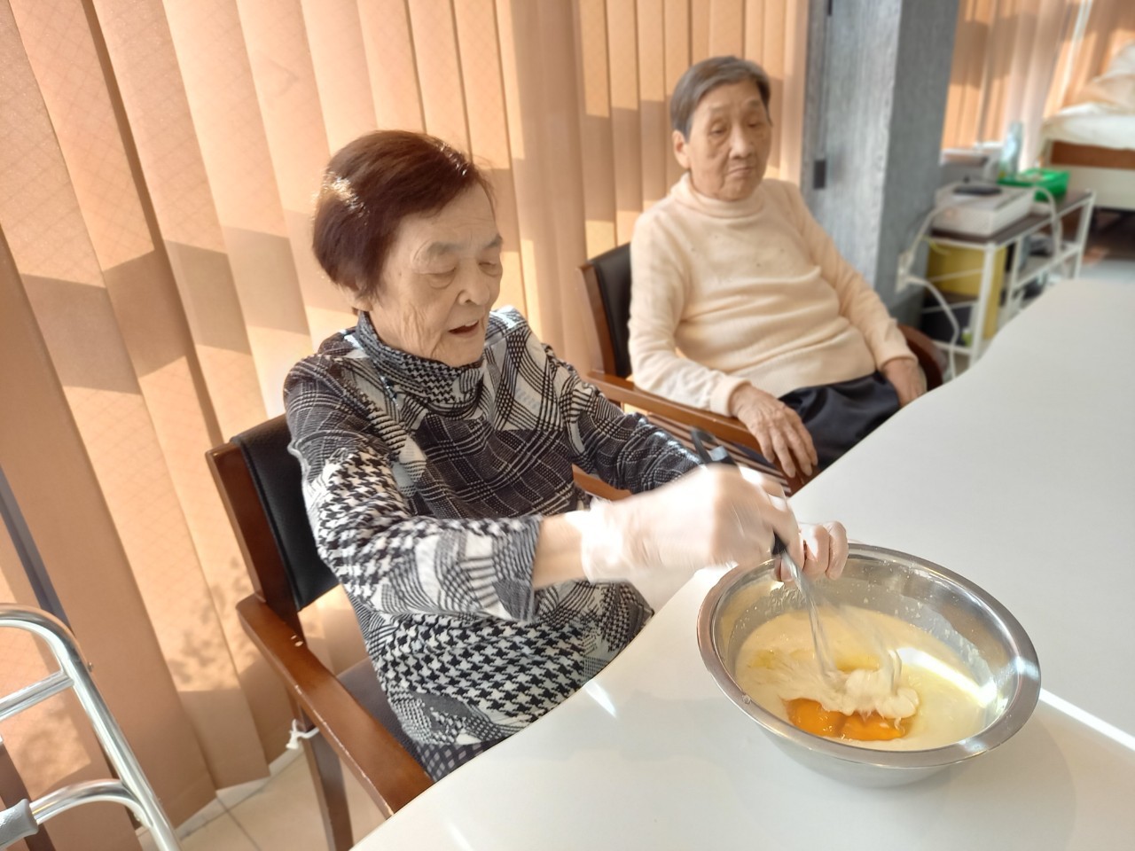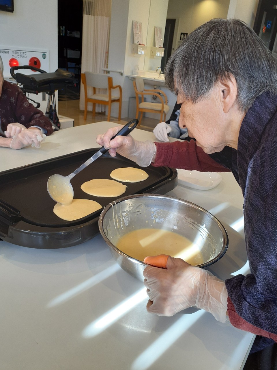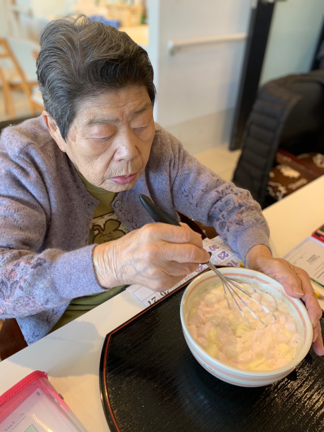 今日から2日に分けて手作りおやつの日を開催します。月に1回のレクリエーションとして利用者さまにお菓子を作っていただき、お茶会をしながらお召し上がりになられます。2月のお菓子はバレンタインデーにちなんでチョコレートムースとバナナオムレットです。