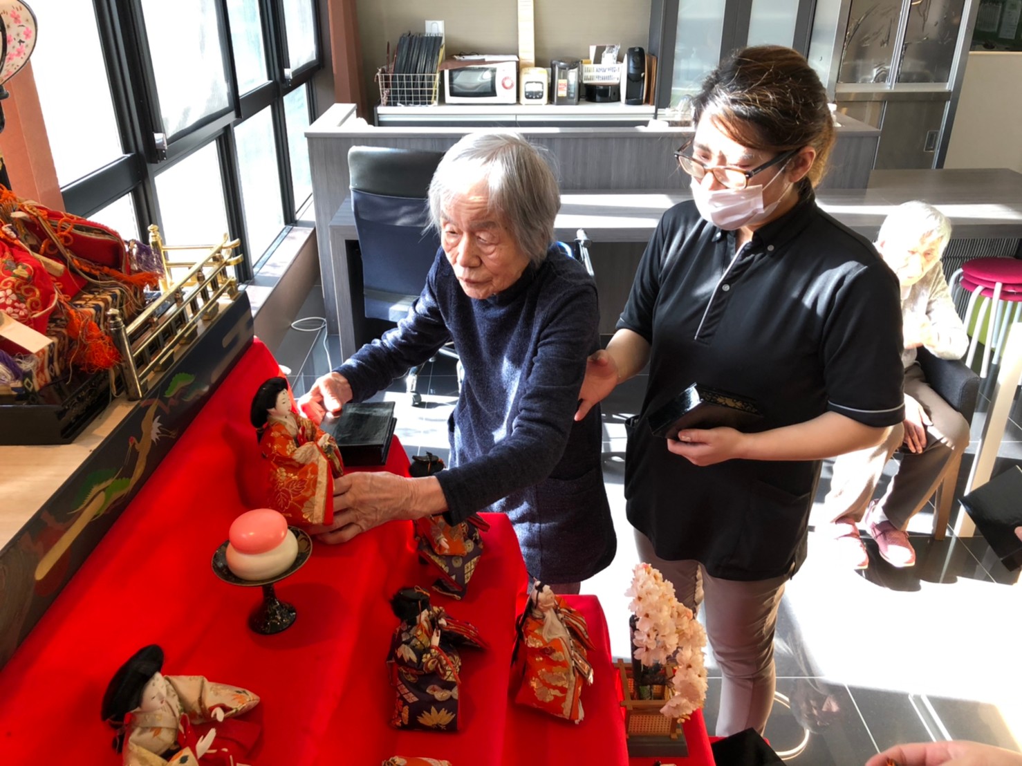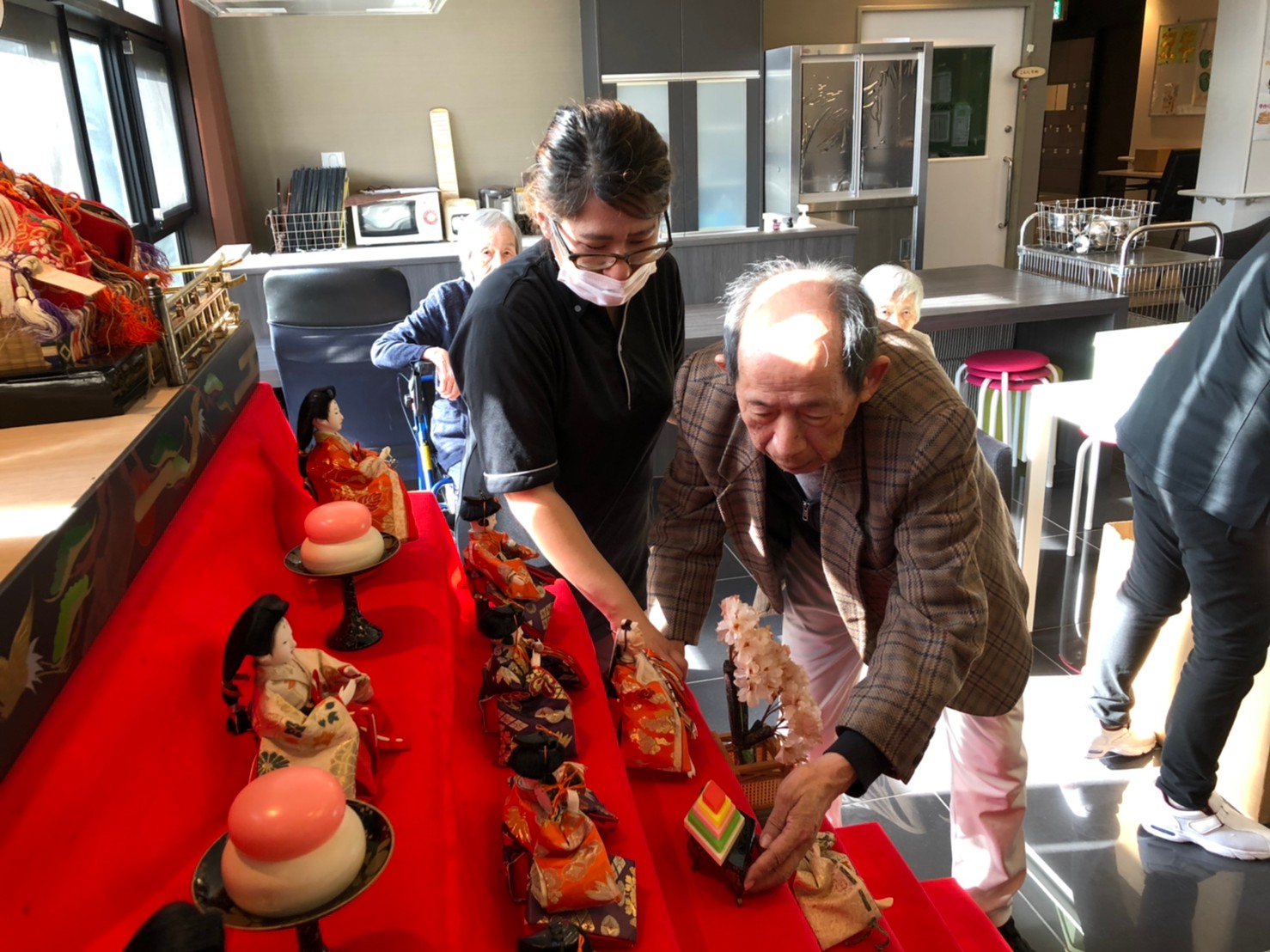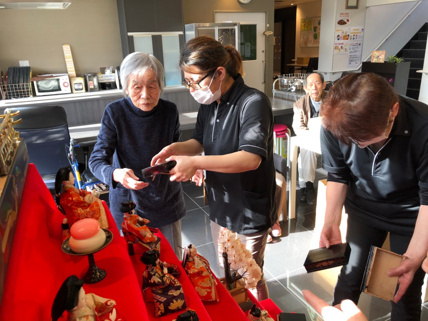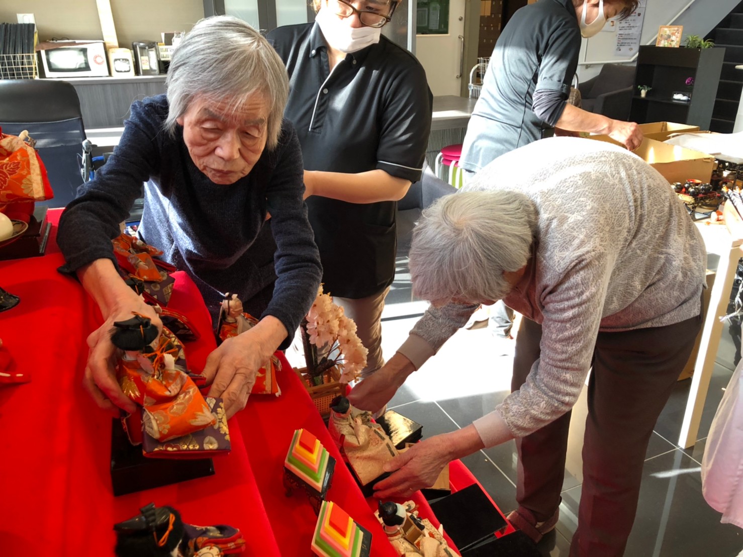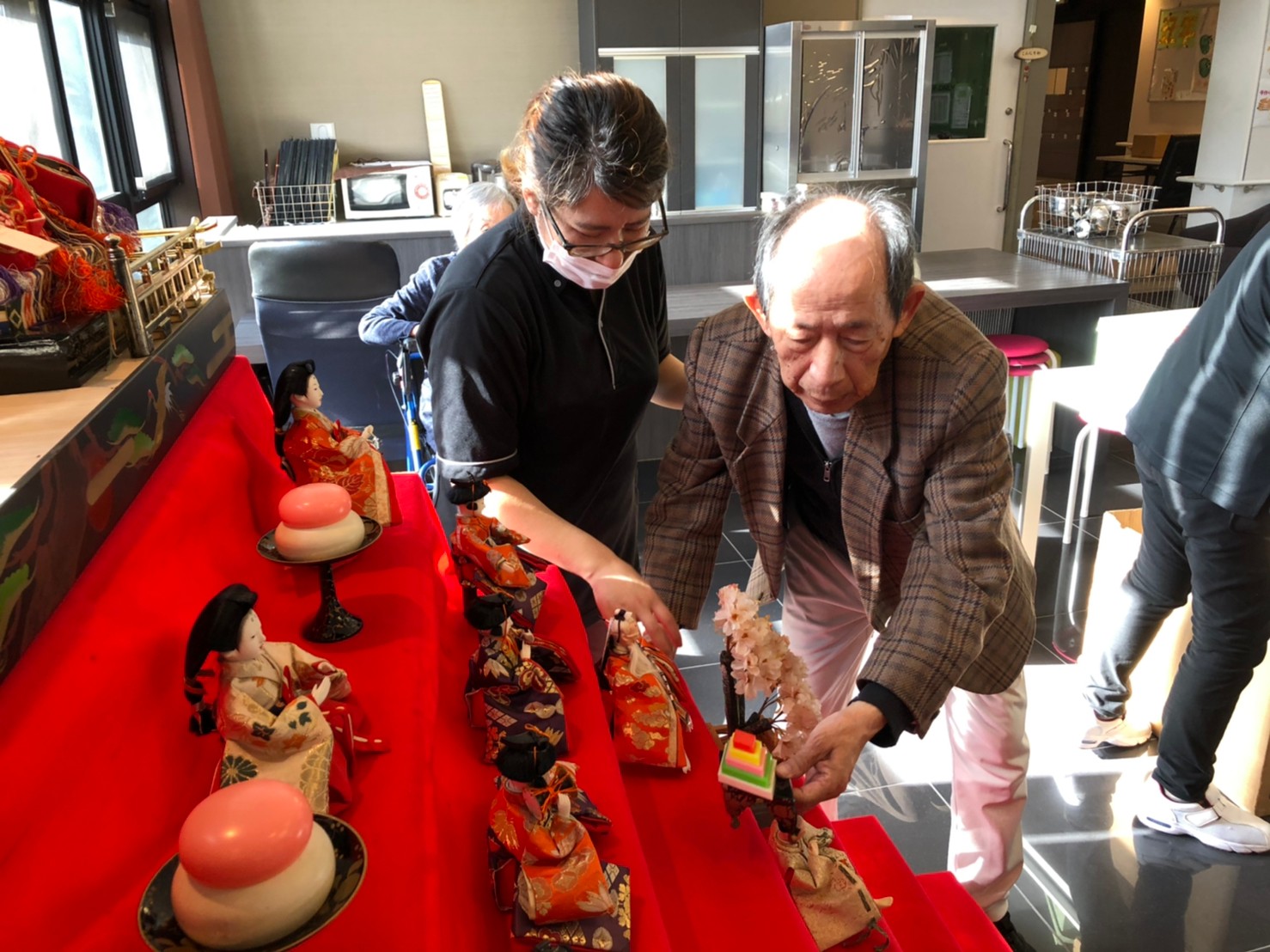 節分祭の興奮も冷めやらぬうちに次のイベントがやってきます。3月は桃の節句「ひな祭り」です。利用者さまがおひなさまの飾り付けをしてくださいました。私も小さい頃はひな祭りを過ぎてからお雛様を片付けると嫁に行き遅れるなんて祖母に言われ3月3日の夜遅くに慌てて片付けたものですが。それでもまだ独身なのは片付けが遅かったんでしょうか( ;∀;)。。(笑)