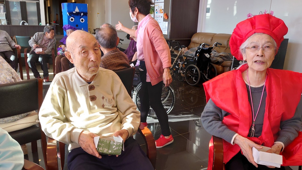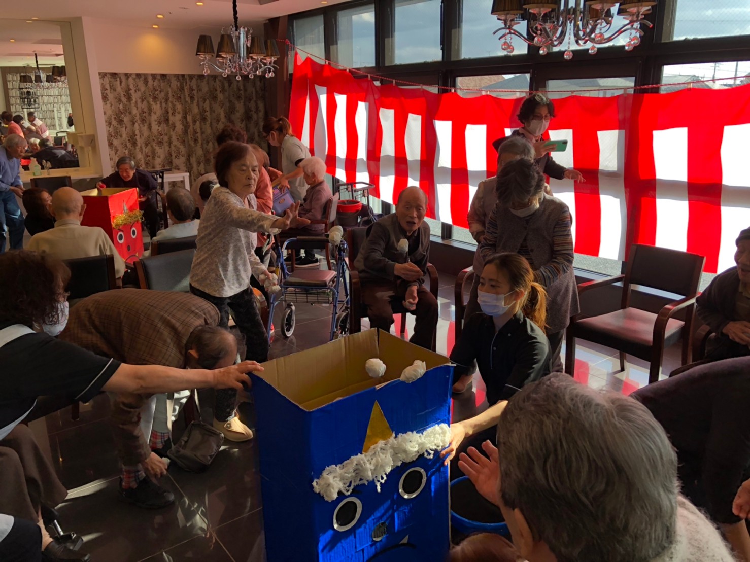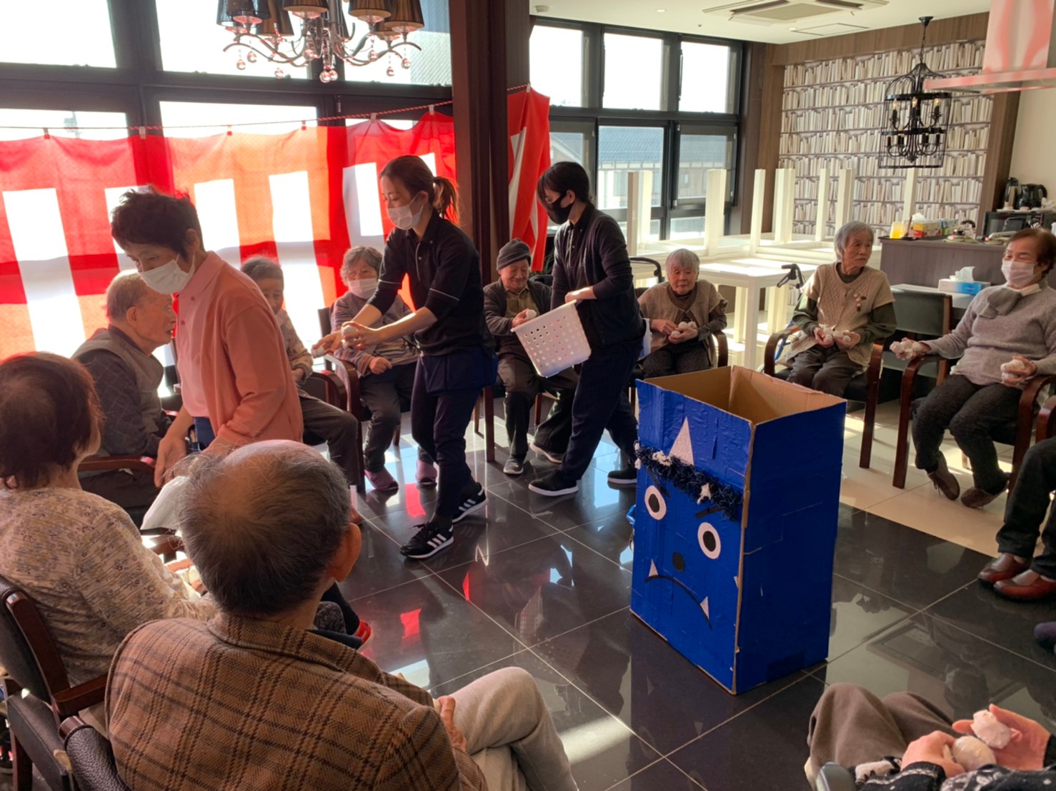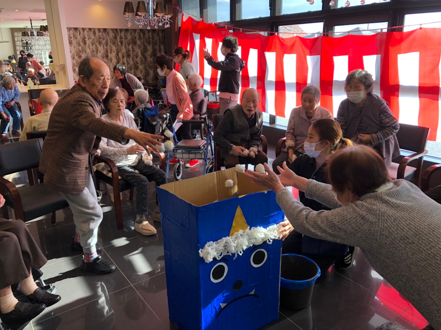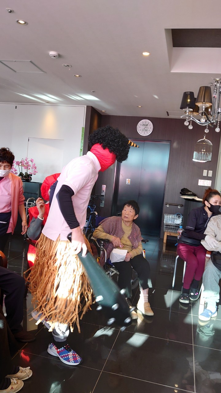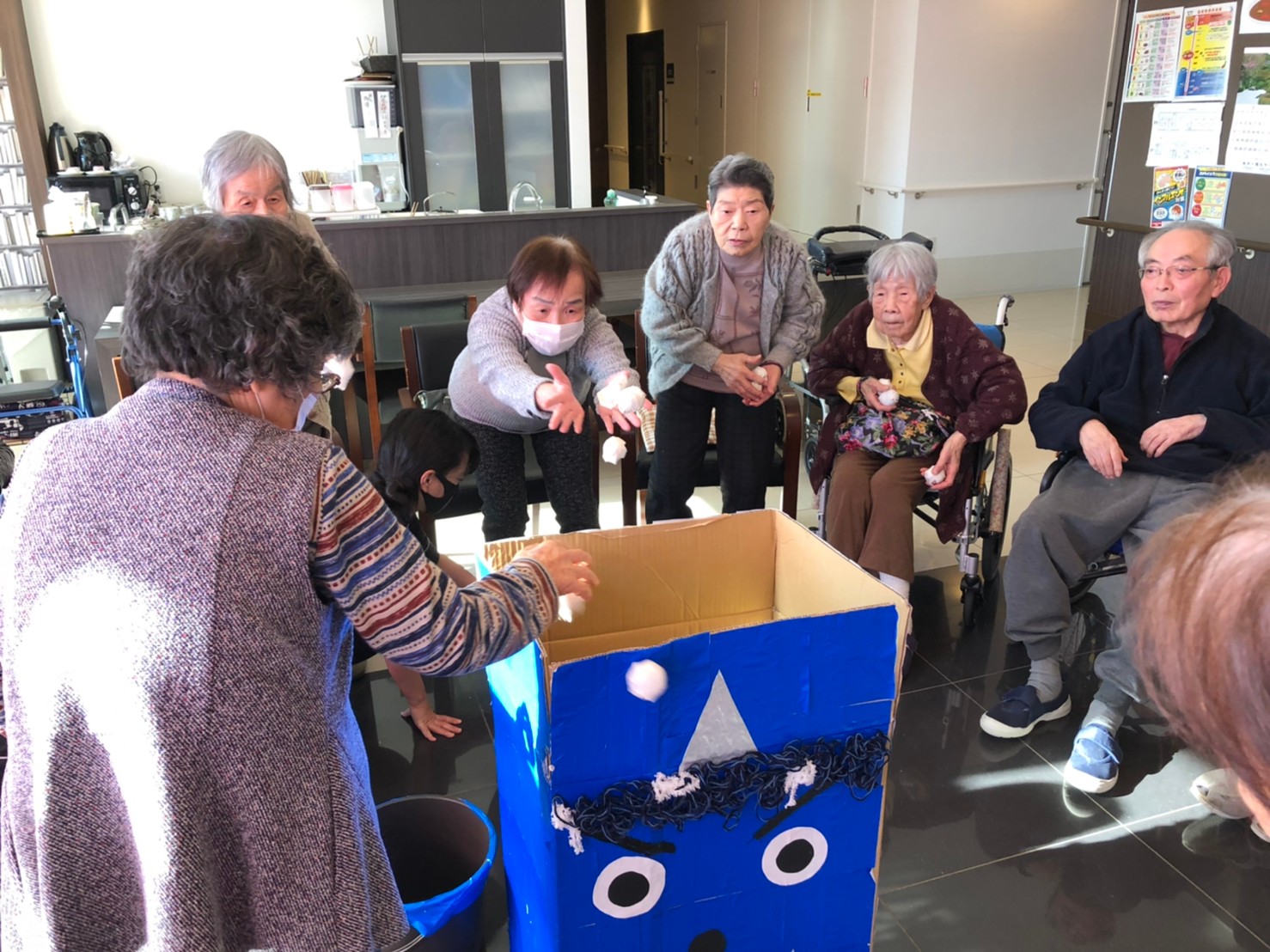 サニープレイス河瀬の月1イベントを本日開催いたしました。2月は節分祭として企画し、豆まきにちなんだミニ運動会を行いました。豆に見立てて玉入れやボーリングのピンを鬼に見立て倒しました。ちなみに玉入れに使った赤鬼のサニーちゃんと青鬼のプレイスくんは利用者さまとスタッフの共同制作です。そのあとは恒例の鬼退治です。今年から衣装も新調されたスタッフ扮する鬼に利用者さまに退治していただきました。悪さをする鬼がなぜか人気で利用者さまが握手をされました(笑)鬼の金棒は空気で膨らますビニール製ですのでご安心ください。最後はこのイベント大トリの福娘の登場です。社内選考会を何度もかさね、名誉ある今年の福娘に選ばれたスタッフが利用者さまとお一人ずつお話をしながら記念撮影をいたしました。ボクも来年の福娘選考会に応募すると言ったら、スタッフ全員から来年も鬼やで!と止められたのはここだけのお話です(‘Д’)