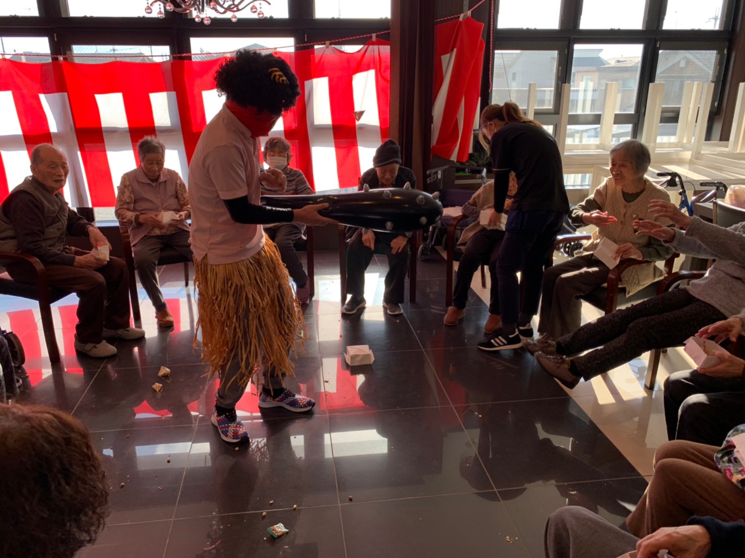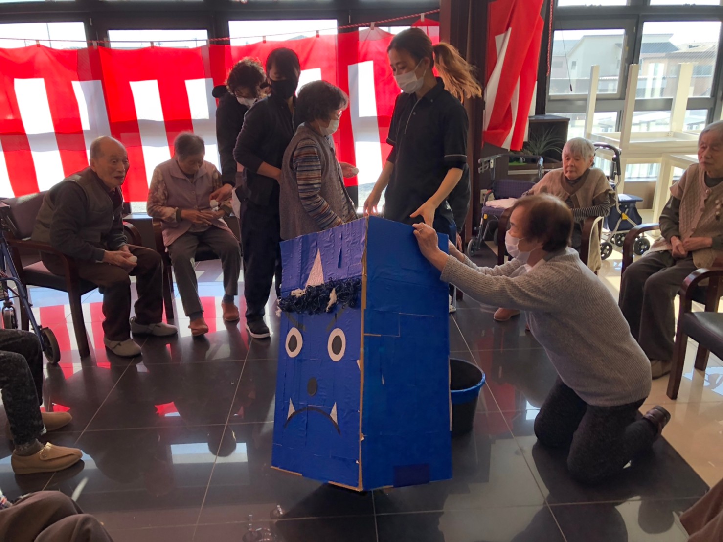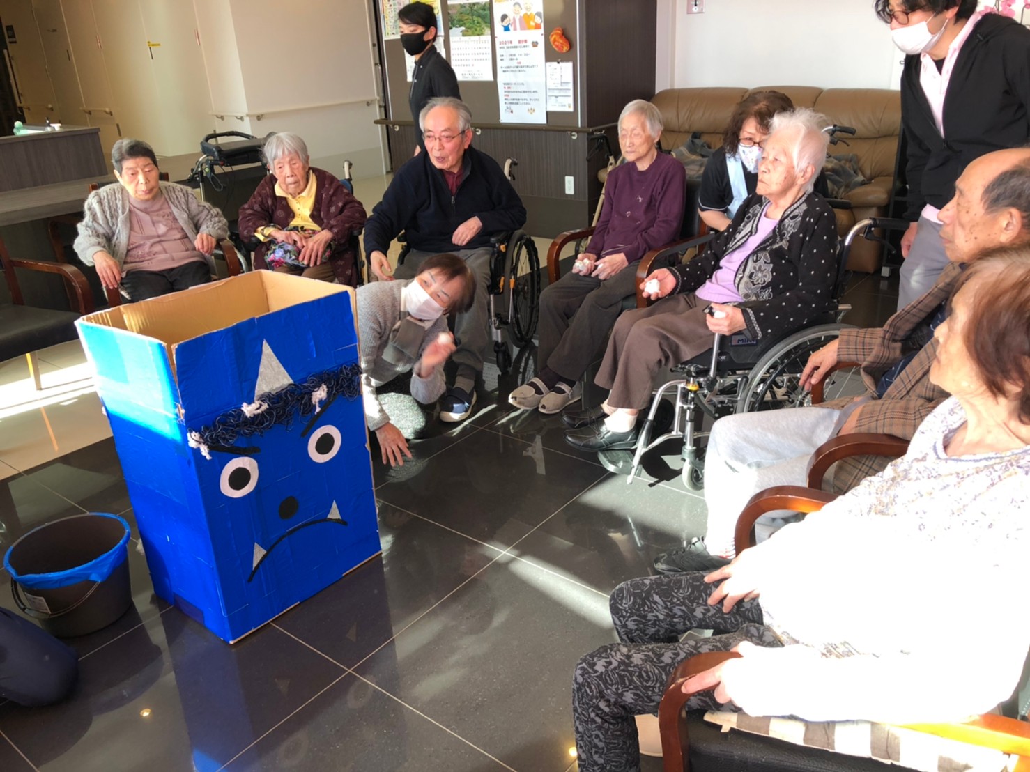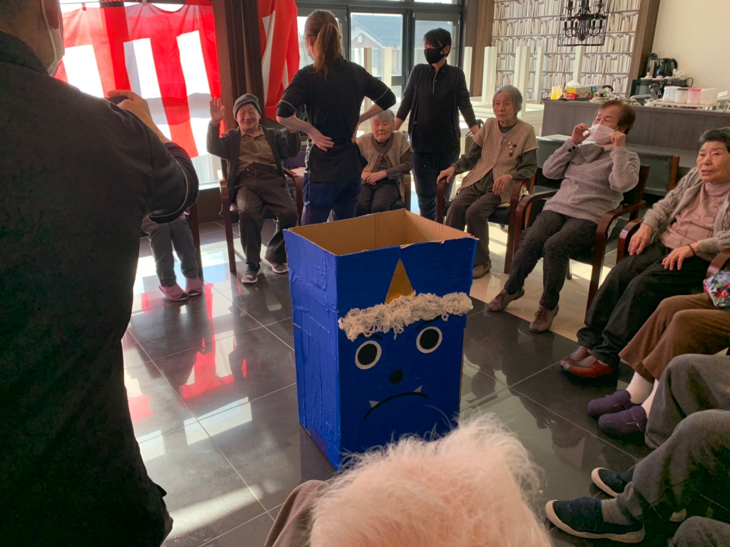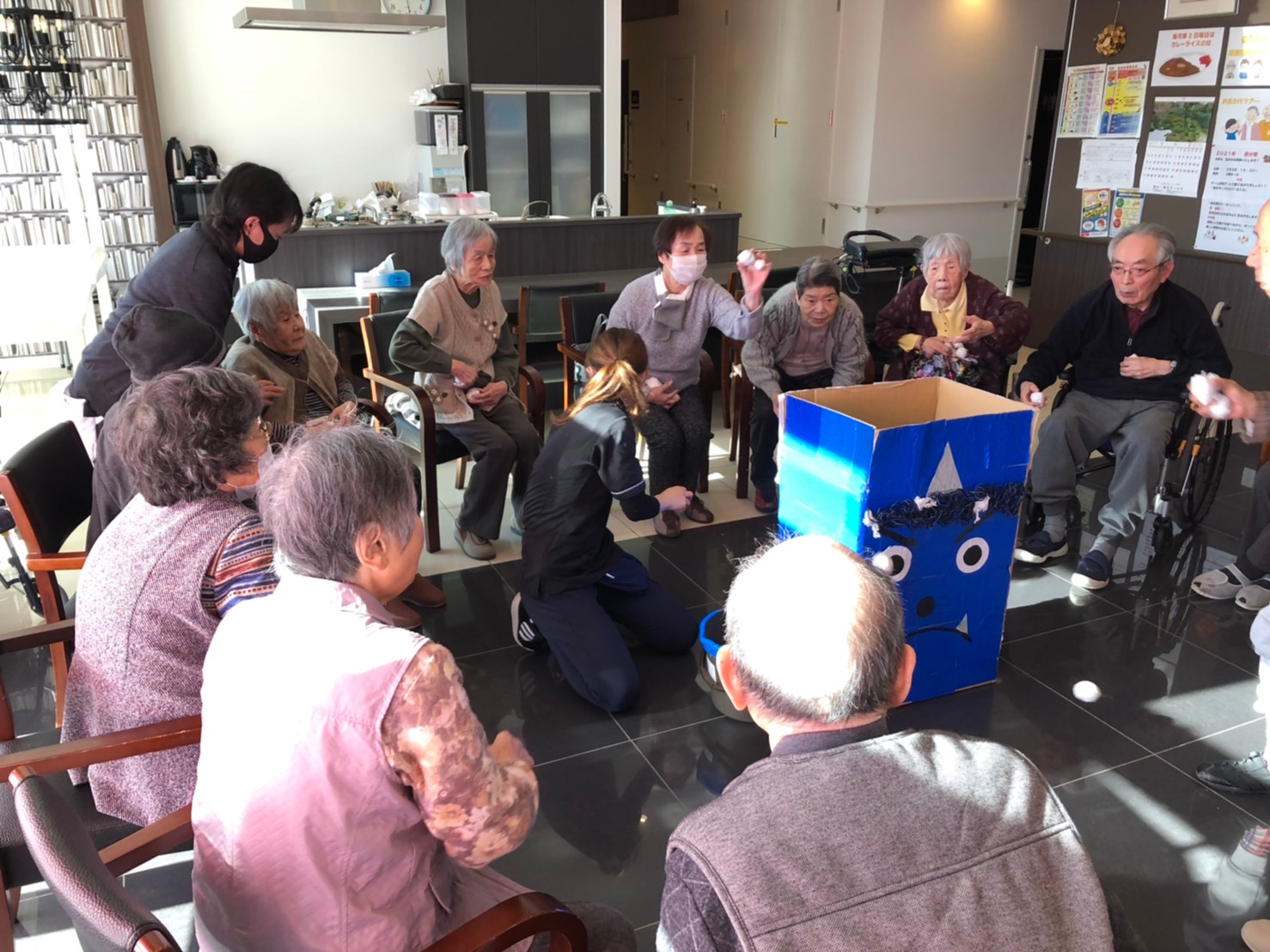サニープレイス河瀬の月1イベントを本日開催いたしました。2月は節分祭として企画し、豆まきにちなんだミニ運動会を行いました。豆に見立てて玉入れやボーリングのピンを鬼に見立て倒しました。ちなみに玉入れに使った赤鬼のサニーちゃんと青鬼のプレイスくんは利用者さまとスタッフの共同制作です。そのあとは恒例の鬼退治です。今年から衣装も新調されたスタッフ扮する鬼に利用者さまに退治していただきました。悪さをする鬼がなぜか人気で利用者さまが握手をされました(笑)鬼の金棒は空気で膨らますビニール製ですのでご安心ください。最後はこのイベント大トリの福娘の登場です。社内選考会を何度もかさね、名誉ある今年の福娘に選ばれたスタッフが利用者さまとお一人ずつお話をしながら記念撮影をいたしました。ボクも来年の福娘選考会に応募すると言ったら、スタッフ全員から来年も鬼やで!と止められたのはここだけのお話です(‘Д’)