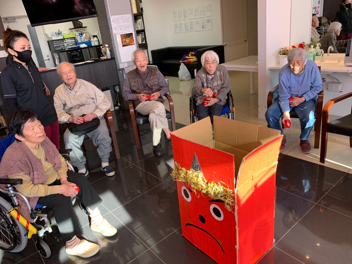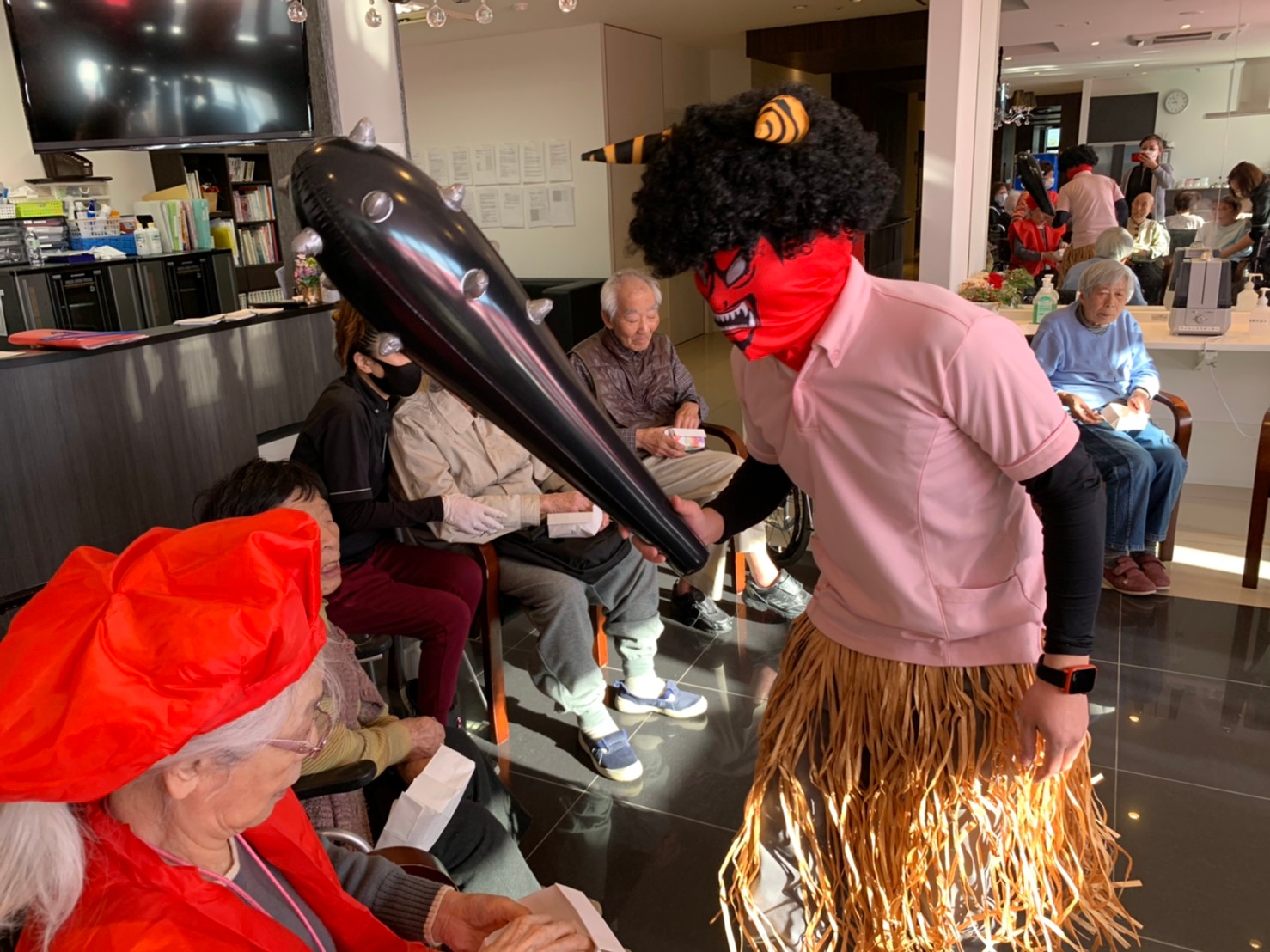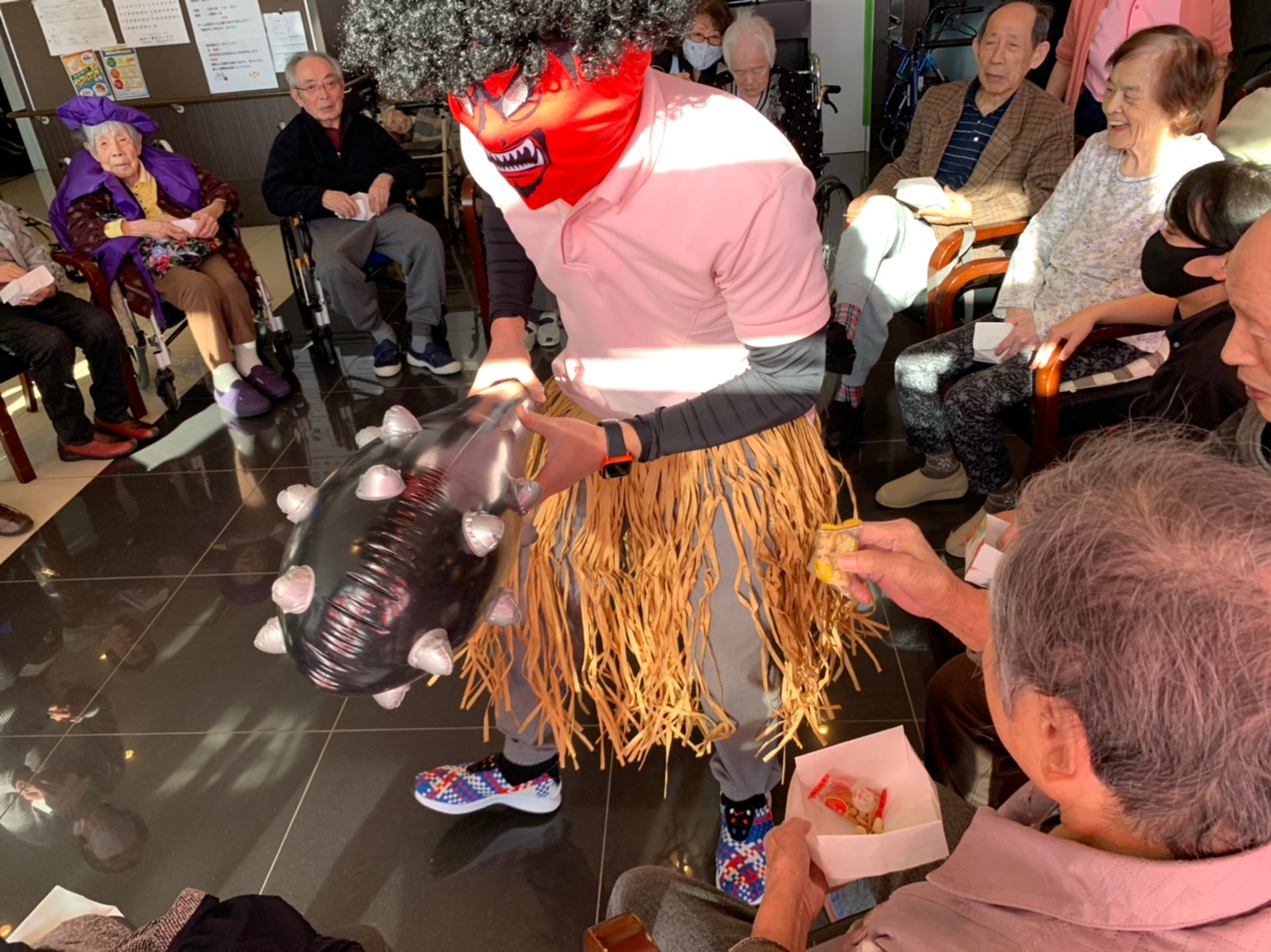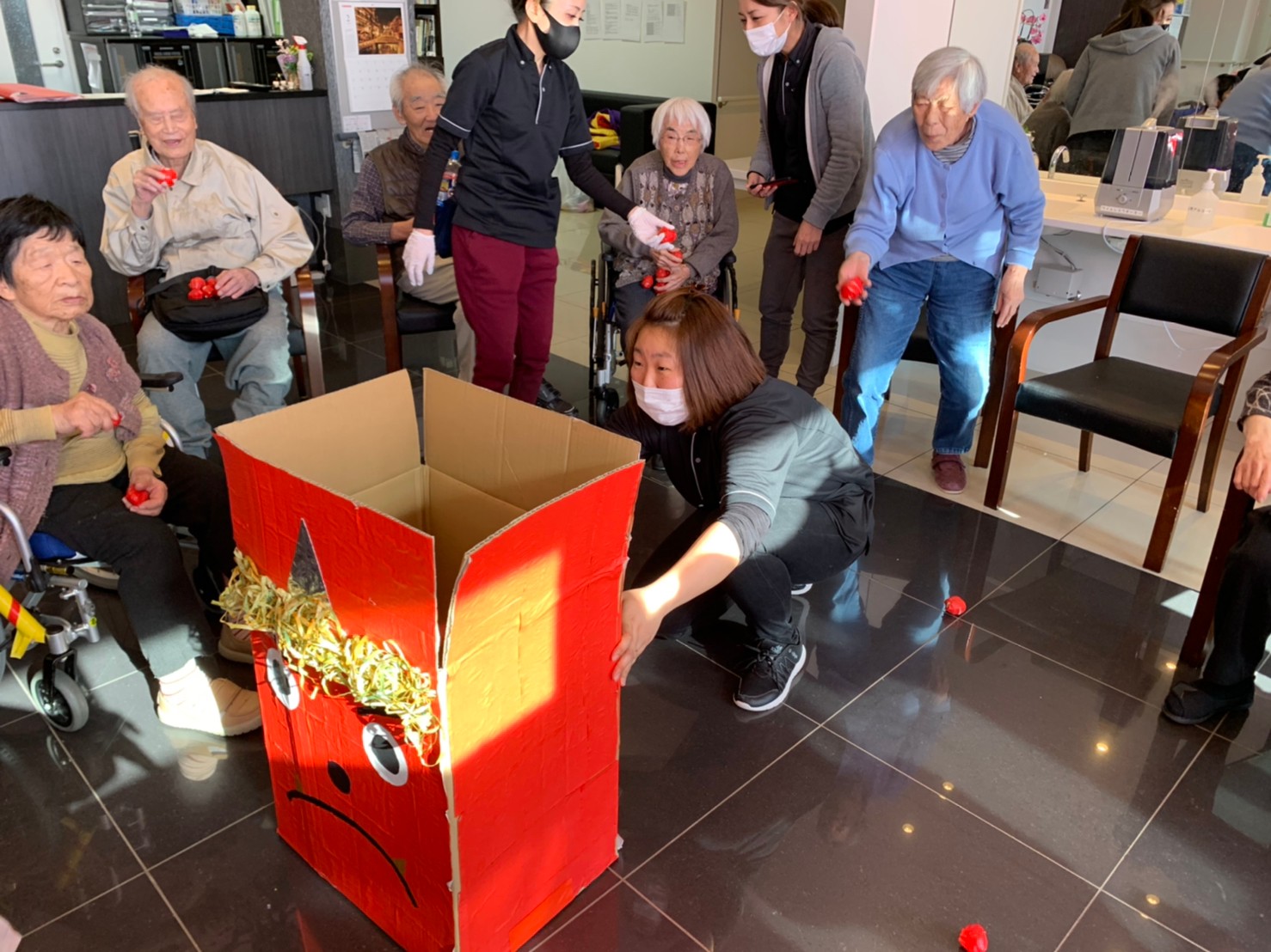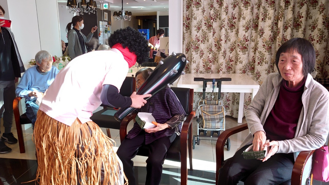 サニープレイス河瀬の月1イベントを本日開催いたしました。2月は節分祭として企画し、豆まきにちなんだミニ運動会を行いました。豆に見立てて玉入れやボーリングのピンを鬼に見立て倒しました。ちなみに玉入れに使った赤鬼のサニーちゃんと青鬼のプレイスくんは利用者さまとスタッフの共同制作です。そのあとは恒例の鬼退治です。今年から衣装も新調されたスタッフ扮する鬼に利用者さまに退治していただきました。悪さをする鬼がなぜか人気で利用者さまが握手をされました(笑)鬼の金棒は空気で膨らますビニール製ですのでご安心ください。最後はこのイベント大トリの福娘の登場です。社内選考会を何度もかさね、名誉ある今年の福娘に選ばれたスタッフが利用者さまとお一人ずつお話をしながら記念撮影をいたしました。ボクも来年の福娘選考会に応募すると言ったら、スタッフ全員から来年も鬼やで!と止められたのはここだけのお話です(‘Д’)