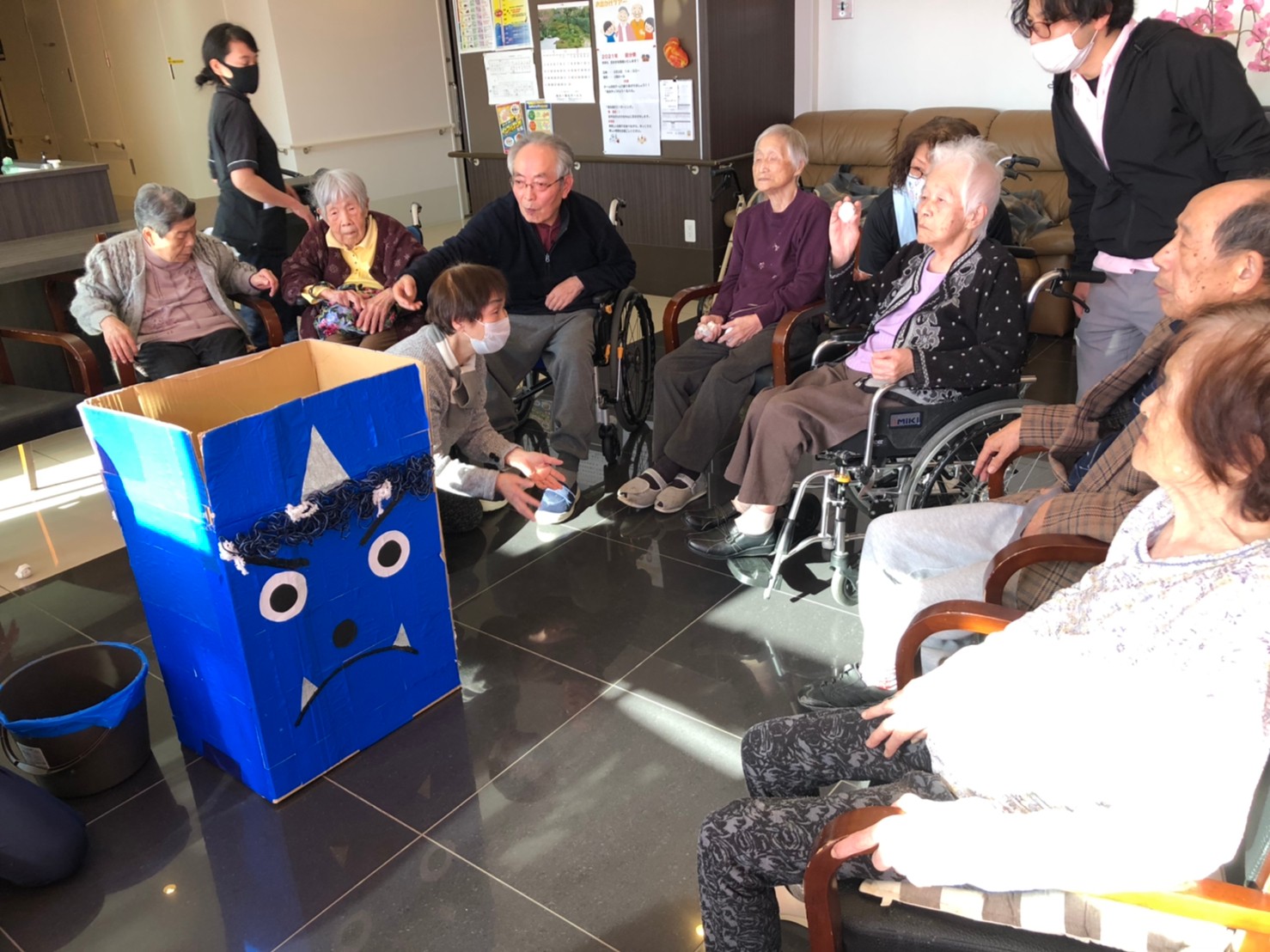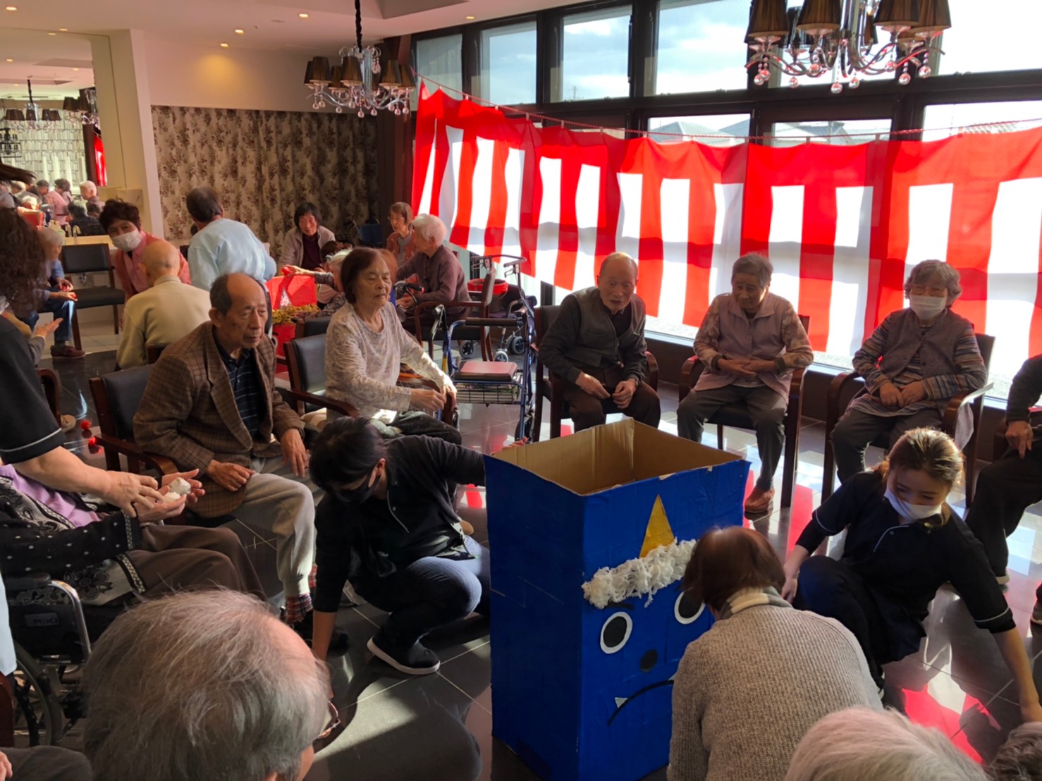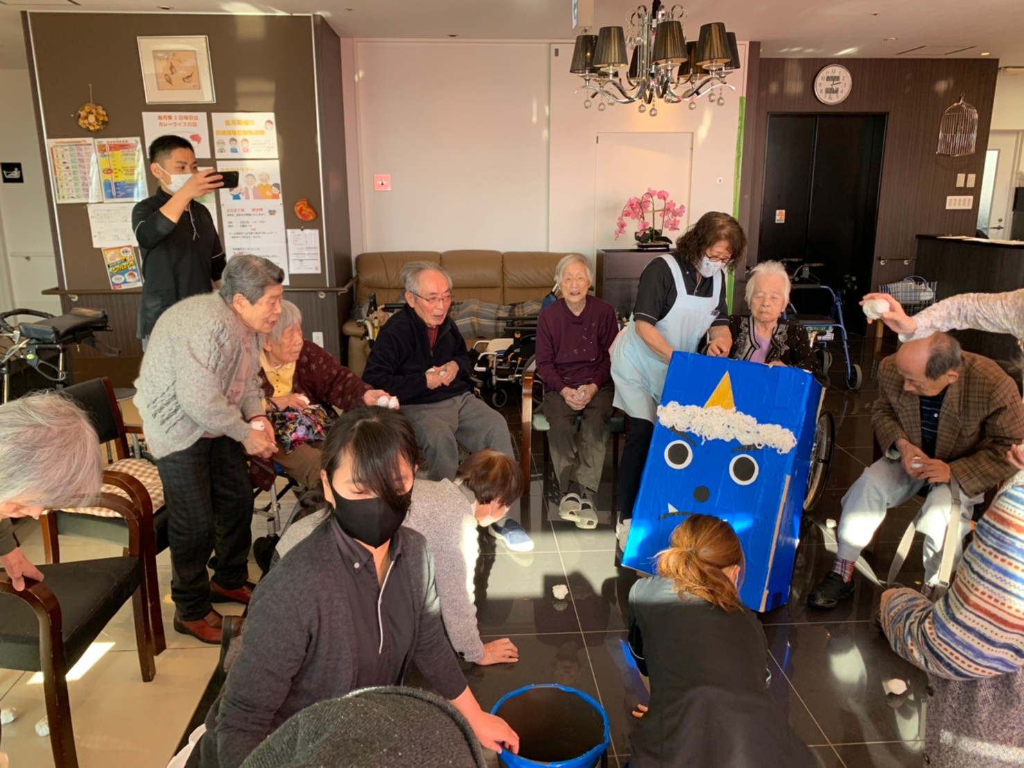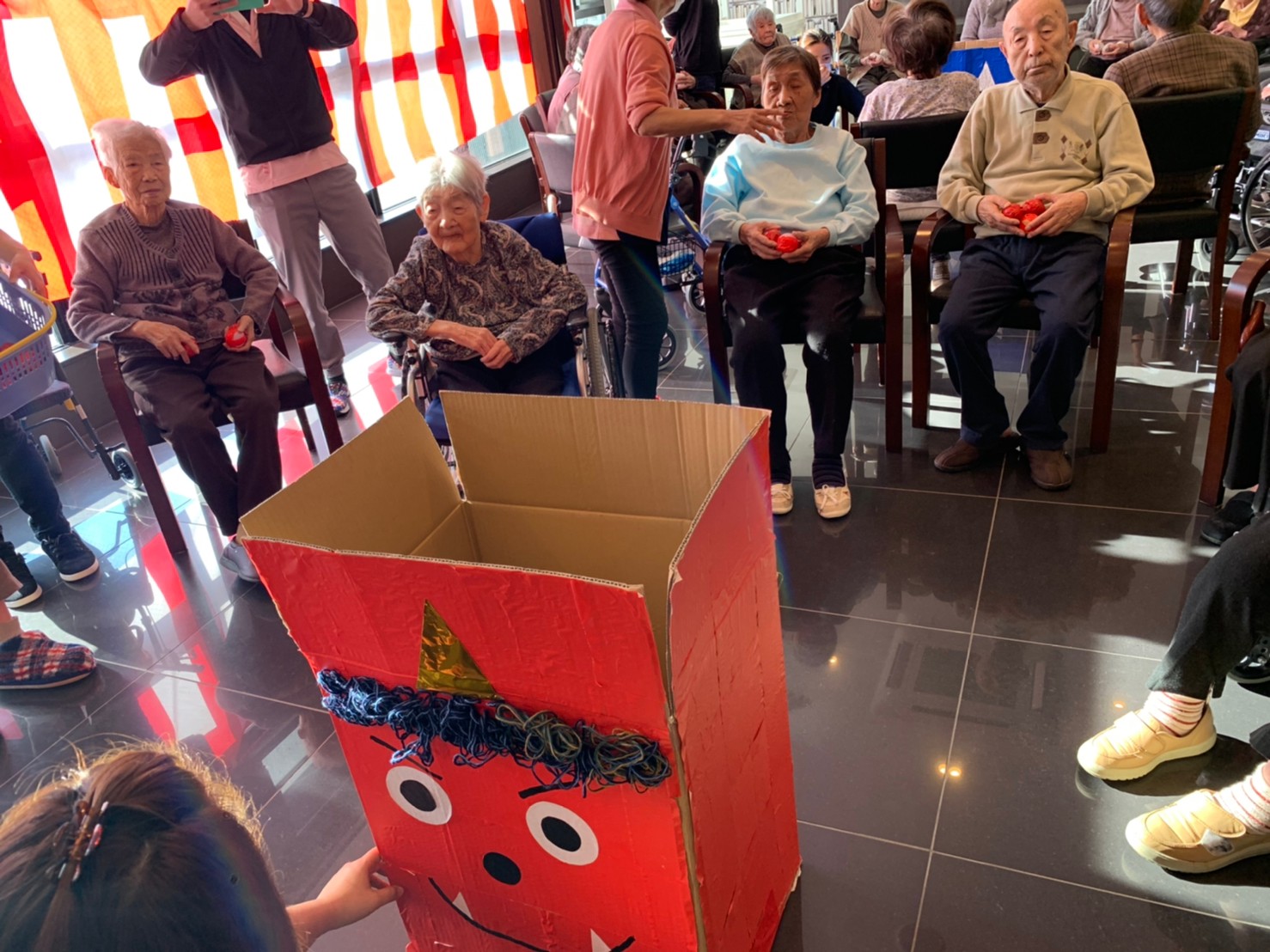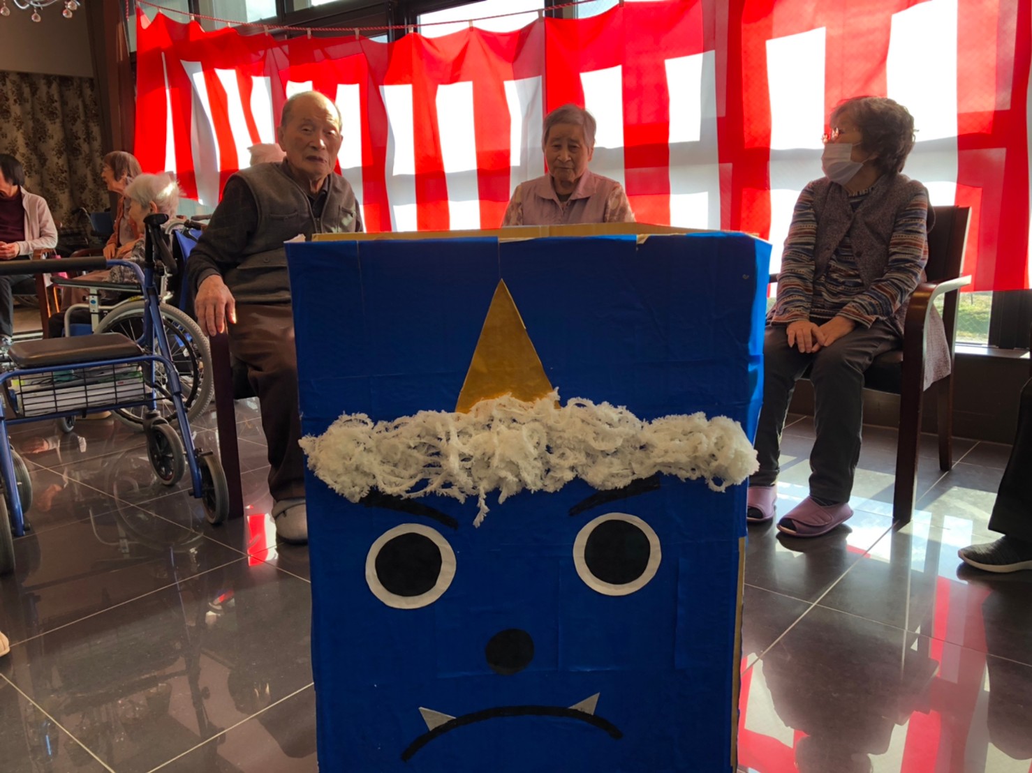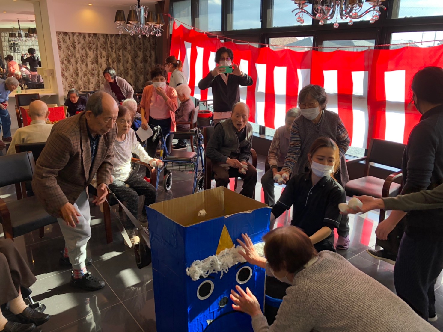 サニープレイス河瀬の月1イベントを本日開催いたしました。2月は節分祭として企画し、豆まきにちなんだミニ運動会を行いました。豆に見立てて玉入れやボーリングのピンを鬼に見立て倒しました。ちなみに玉入れに使った赤鬼のサニーちゃんと青鬼のプレイスくんは利用者さまとスタッフの共同制作です。そのあとは恒例の鬼退治です。今年から衣装も新調されたスタッフ扮する鬼に利用者さまに退治していただきました。悪さをする鬼がなぜか人気で利用者さまが握手をされました(笑)鬼の金棒は空気で膨らますビニール製ですのでご安心ください。最後はこのイベント大トリの福娘の登場です。社内選考会を何度もかさね、名誉ある今年の福娘に選ばれたスタッフが利用者さまとお一人ずつお話をしながら記念撮影をいたしました。ボクも来年の福娘選考会に応募すると言ったら、スタッフ全員から来年も鬼やで!と止められたのはここだけのお話です(‘Д’)