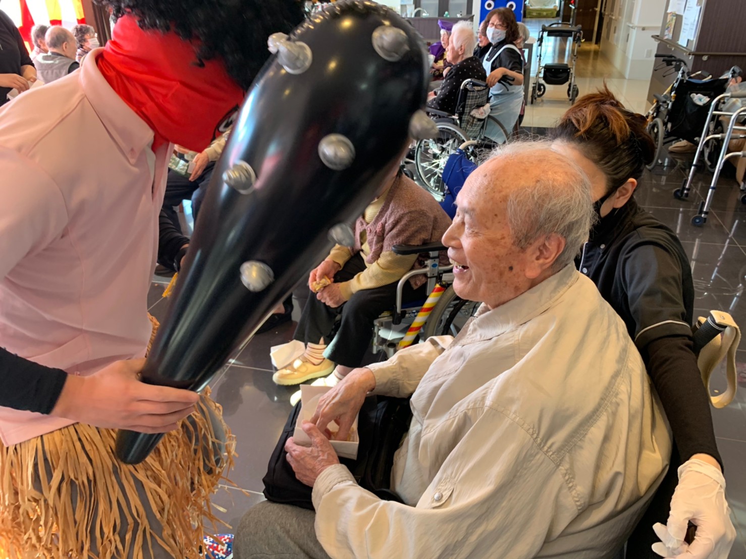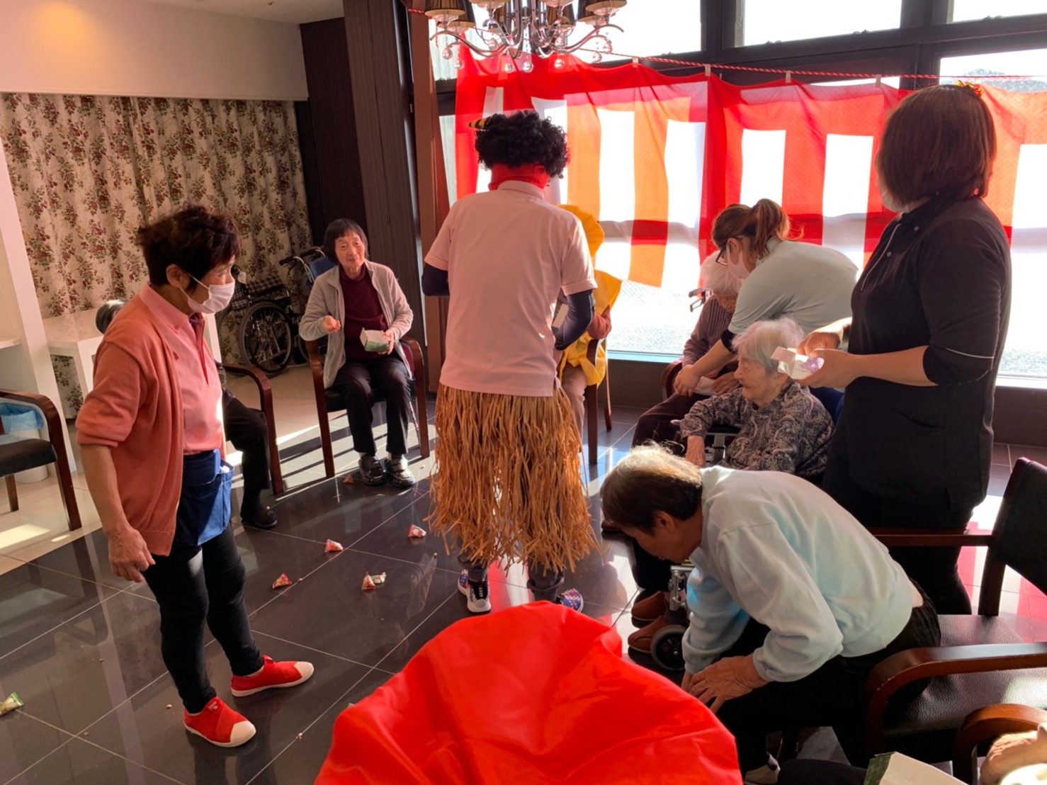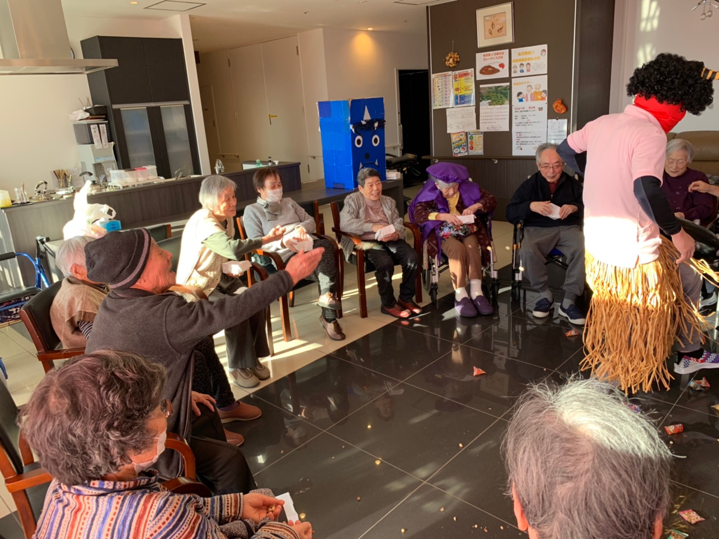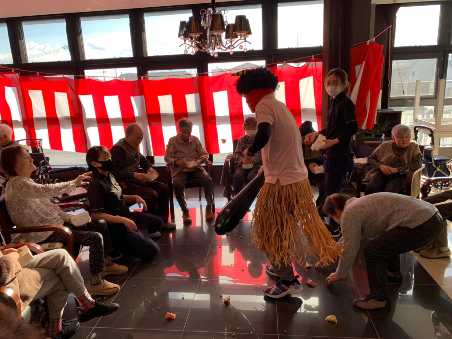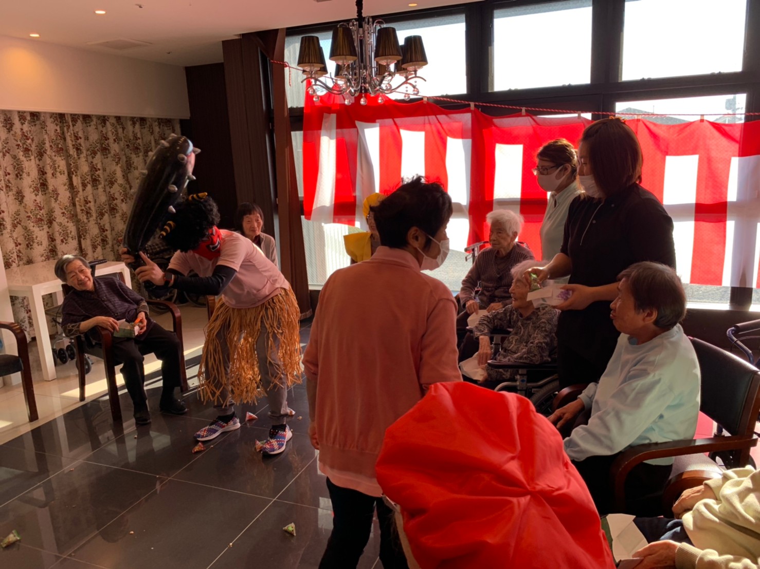 サニープレイス河瀬の月1イベントを本日開催いたしました。2月は節分祭として企画し、豆まきにちなんだミニ運動会を行いました。豆に見立てて玉入れやボーリングのピンを鬼に見立て倒しました。ちなみに玉入れに使った赤鬼のサニーちゃんと青鬼のプレイスくんは利用者さまとスタッフの共同制作です。そのあとは恒例の鬼退治です。今年から衣装も新調されたスタッフ扮する鬼に利用者さまに退治していただきました。悪さをする鬼がなぜか人気で利用者さまが握手をされました(笑)鬼の金棒は空気で膨らますビニール製ですのでご安心ください。最後はこのイベント大トリの福娘の登場です。社内選考会を何度もかさね、名誉ある今年の福娘に選ばれたスタッフが利用者さまとお一人ずつお話をしながら記念撮影をいたしました。ボクも来年の福娘選考会に応募すると言ったら、スタッフ全員から来年も鬼やで!と止められたのはここだけのお話です(‘Д’)
