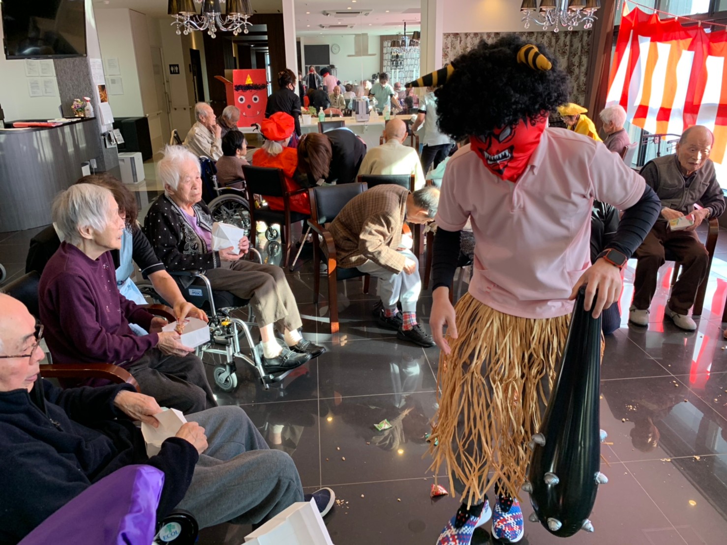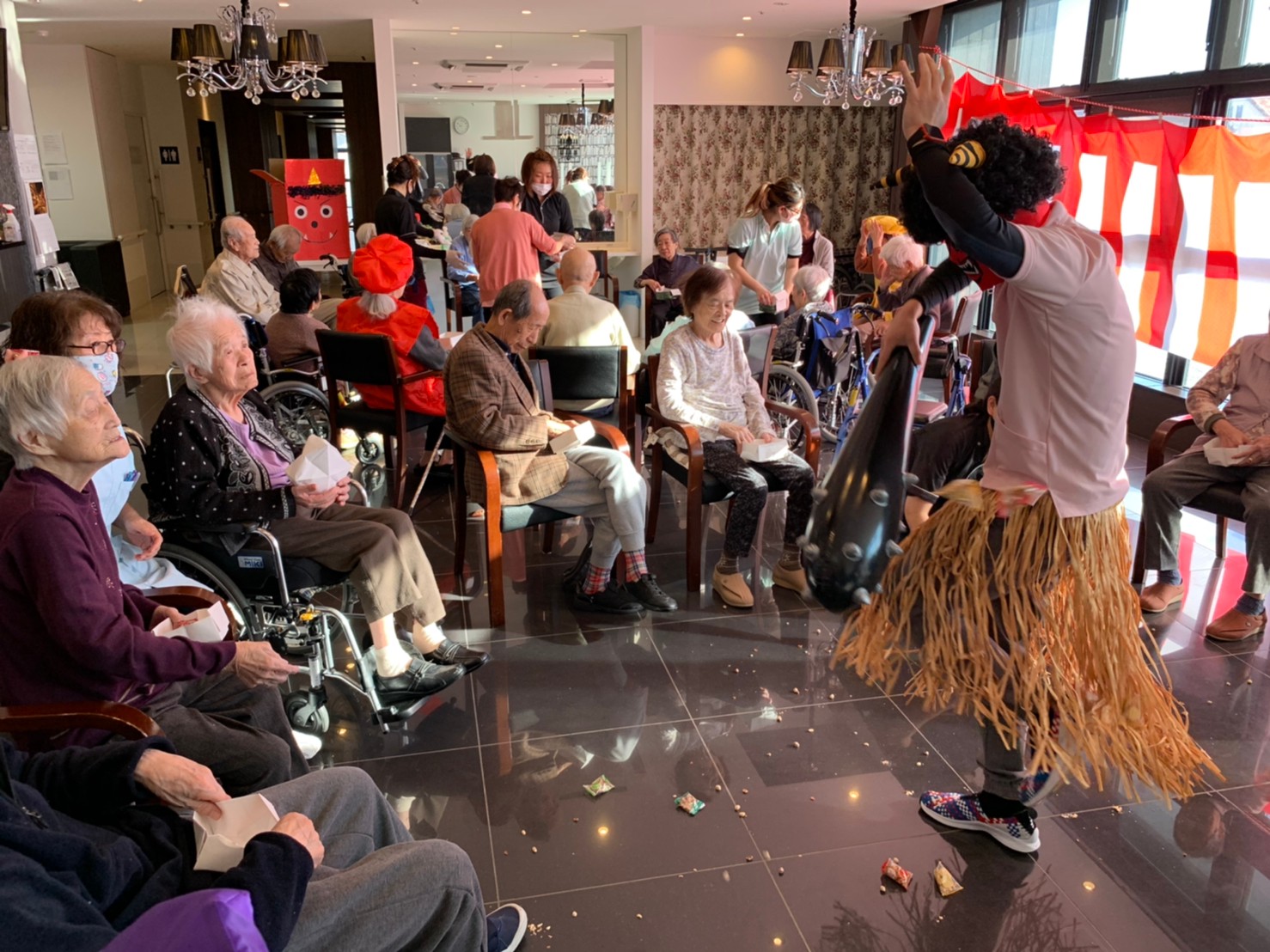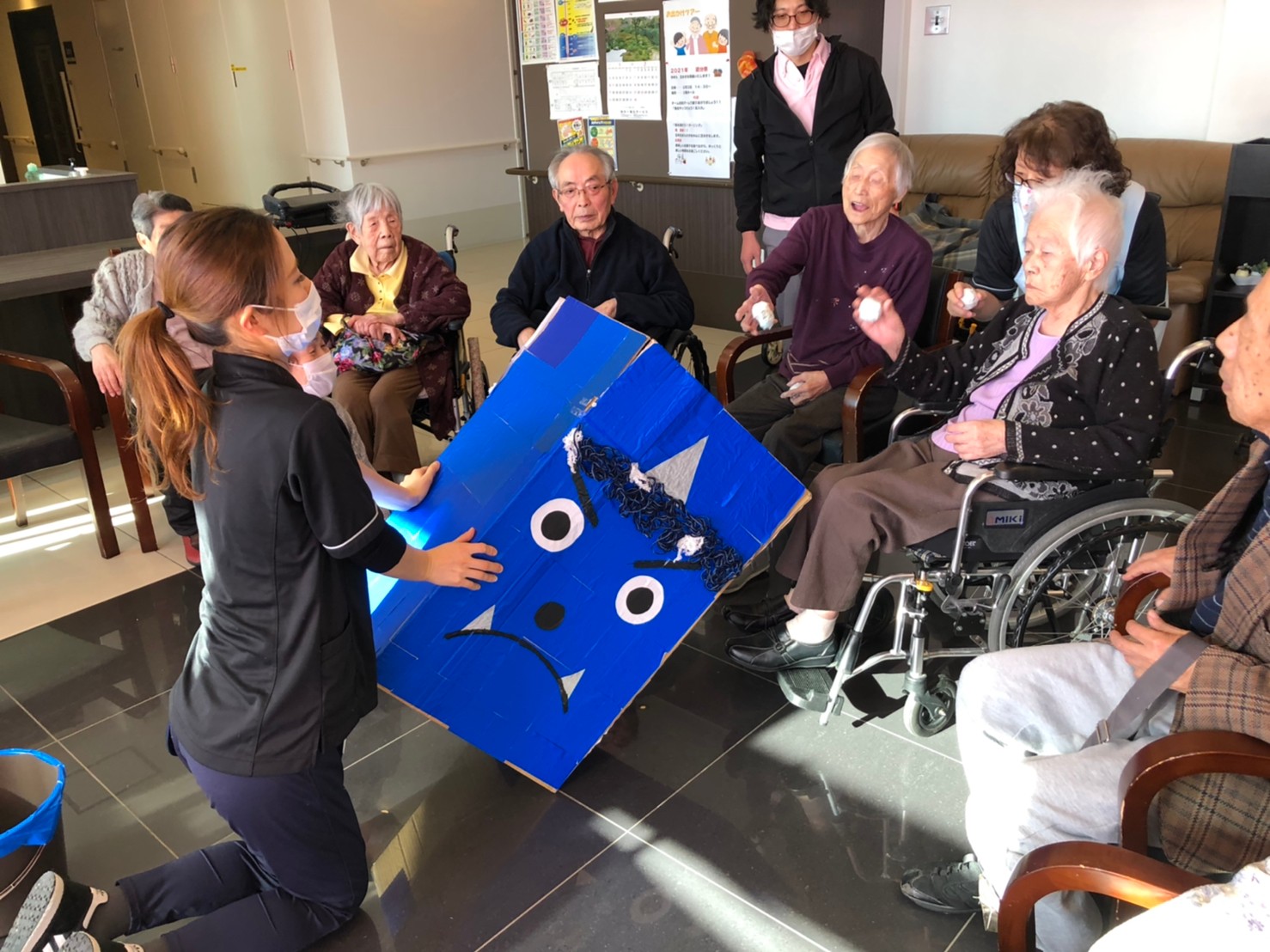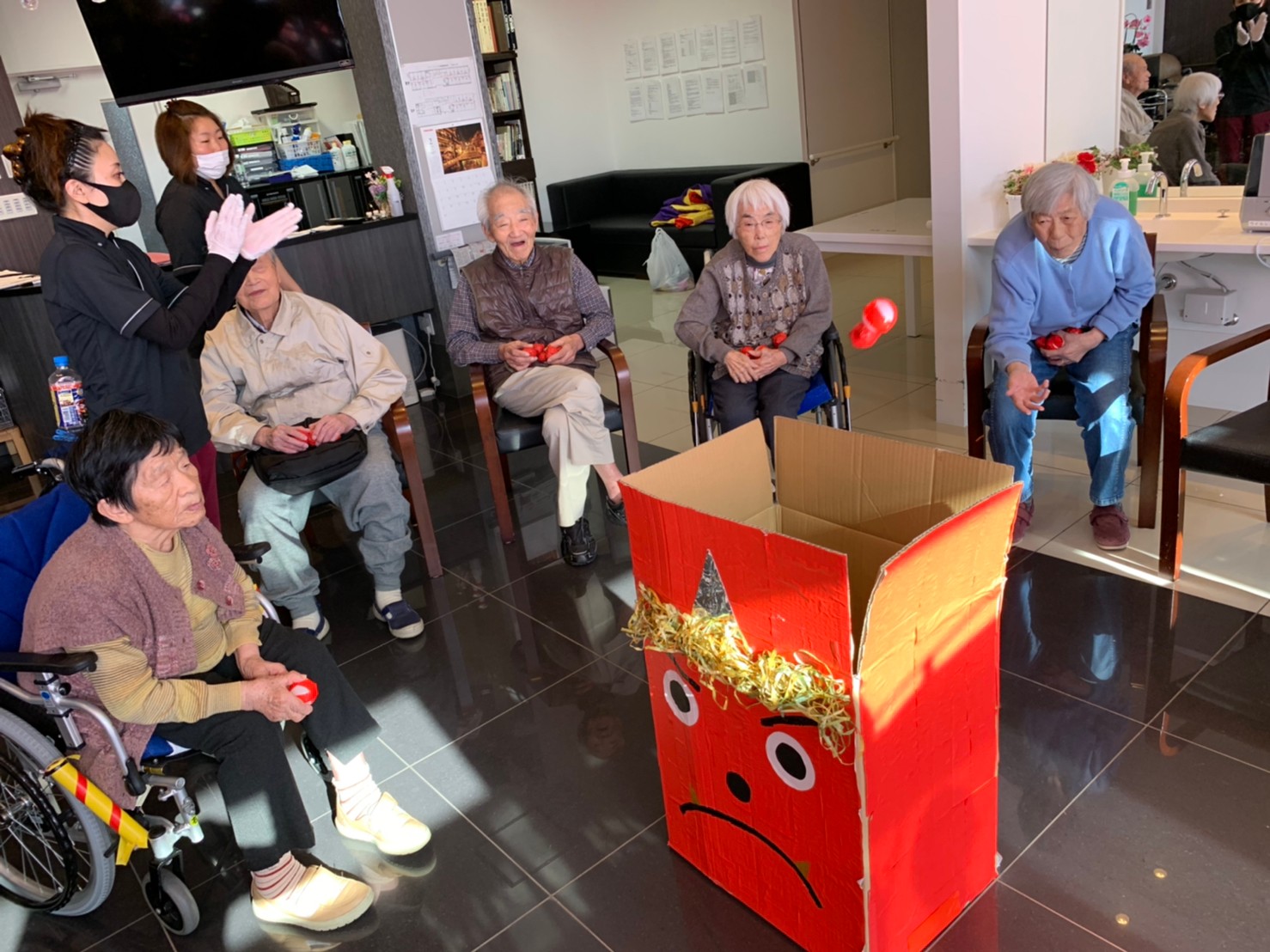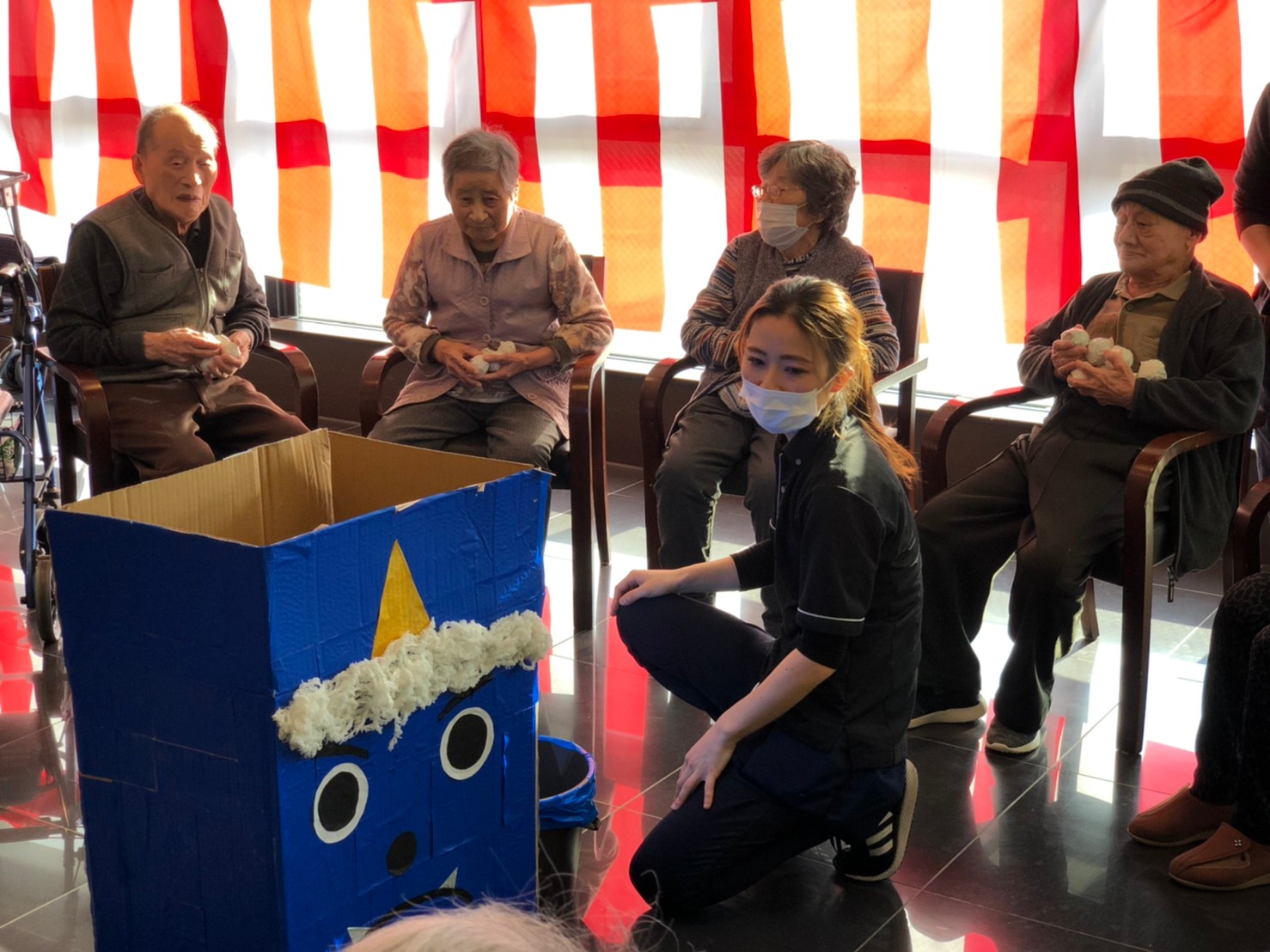 サニープレイス河瀬の月1イベントを本日開催いたしました。2月は節分祭として企画し、豆まきにちなんだミニ運動会を行いました。豆に見立てて玉入れやボーリングのピンを鬼に見立て倒しました。ちなみに玉入れに使った赤鬼のサニーちゃんと青鬼のプレイスくんは利用者さまとスタッフの共同制作です。そのあとは恒例の鬼退治です。今年から衣装も新調されたスタッフ扮する鬼に利用者さまに退治していただきました。悪さをする鬼がなぜか人気で利用者さまが握手をされました(笑)鬼の金棒は空気で膨らますビニール製ですのでご安心ください。最後はこのイベント大トリの福娘の登場です。社内選考会を何度もかさね、名誉ある今年の福娘に選ばれたスタッフが利用者さまとお一人ずつお話をしながら記念撮影をいたしました。ボクも来年の福娘選考会に応募すると言ったら、スタッフ全員から来年も鬼やで!と止められたのはここだけのお話です(‘Д’)