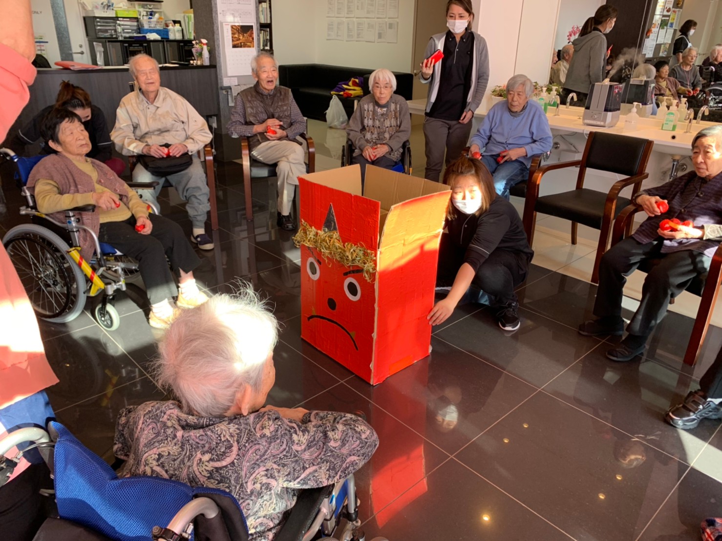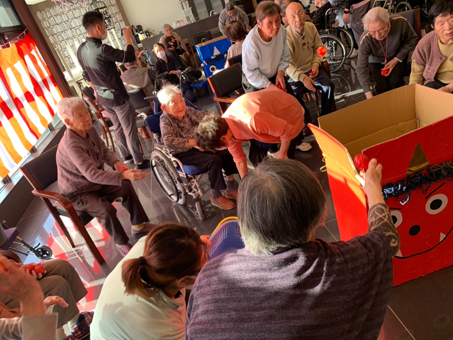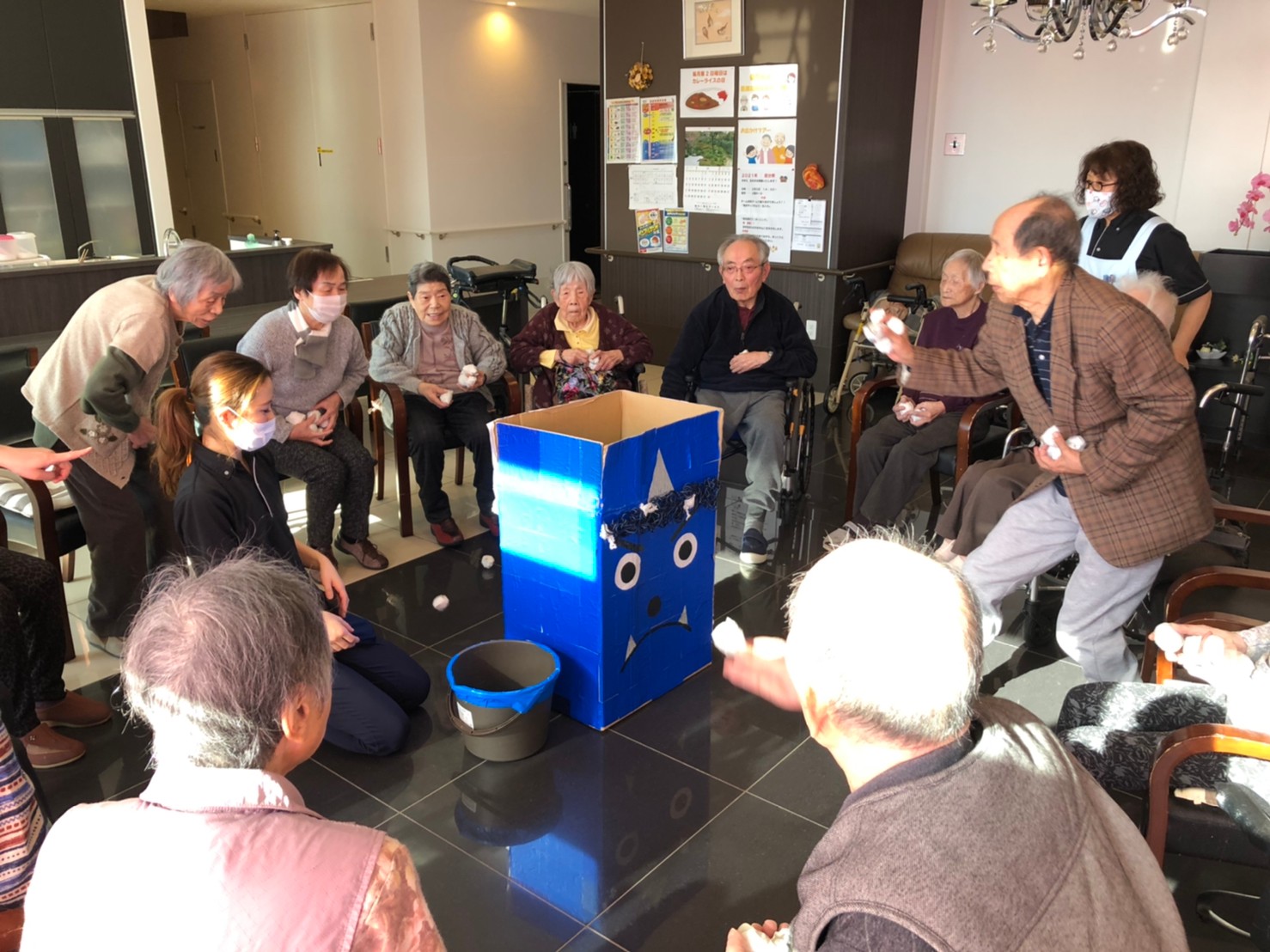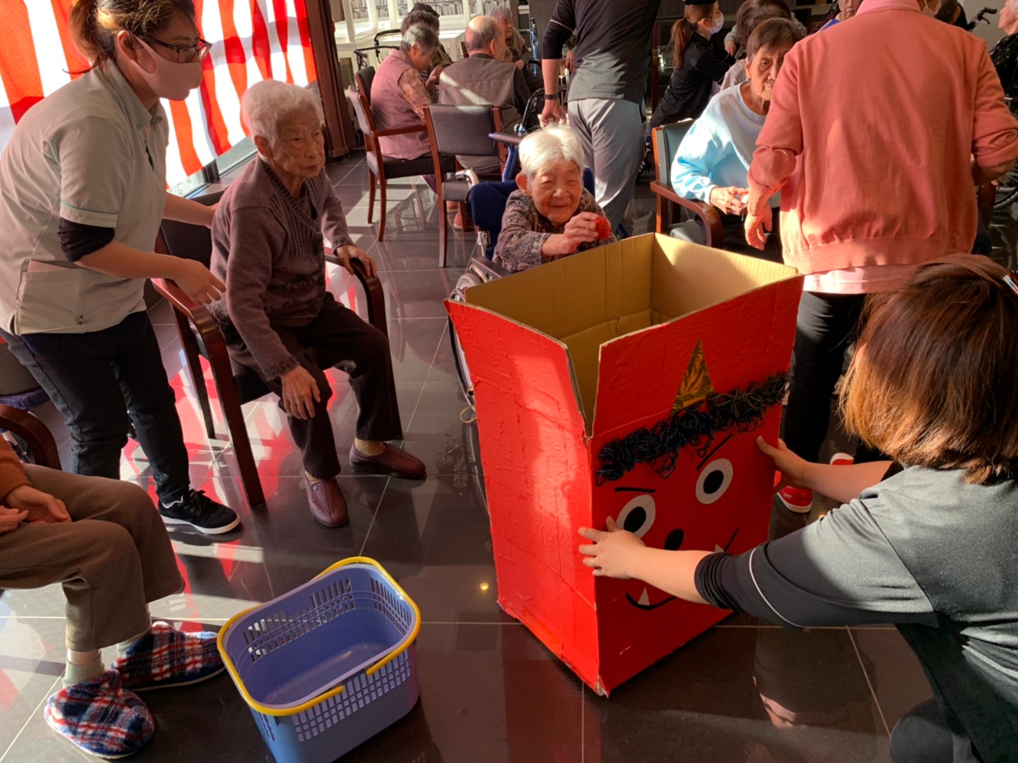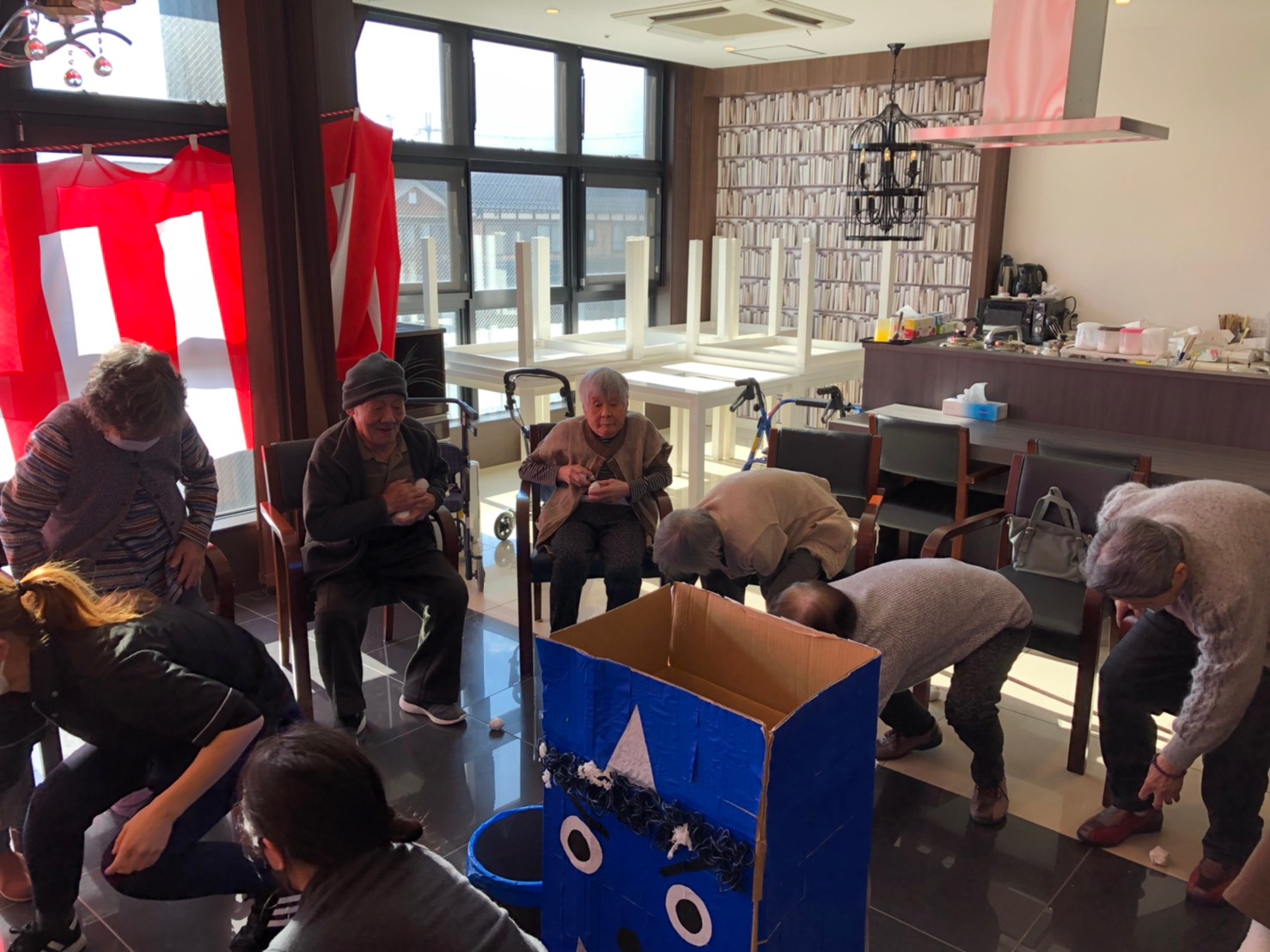 サニープレイス河瀬の月1イベントを本日開催いたしました。2月は節分祭として企画し、豆まきにちなんだミニ運動会を行いました。豆に見立てて玉入れやボーリングのピンを鬼に見立て倒しました。ちなみに玉入れに使った赤鬼のサニーちゃんと青鬼のプレイスくんは利用者さまとスタッフの共同制作です。そのあとは恒例の鬼退治です。今年から衣装も新調されたスタッフ扮する鬼に利用者さまに退治していただきました。悪さをする鬼がなぜか人気で利用者さまが握手をされました(笑)鬼の金棒は空気で膨らますビニール製ですのでご安心ください。最後はこのイベント大トリの福娘の登場です。社内選考会を何度もかさね、名誉ある今年の福娘に選ばれたスタッフが利用者さまとお一人ずつお話をしながら記念撮影をいたしました。ボクも来年の福娘選考会に応募すると言ったら、スタッフ全員から来年も鬼やで!と止められたのはここだけのお話です(‘Д’)