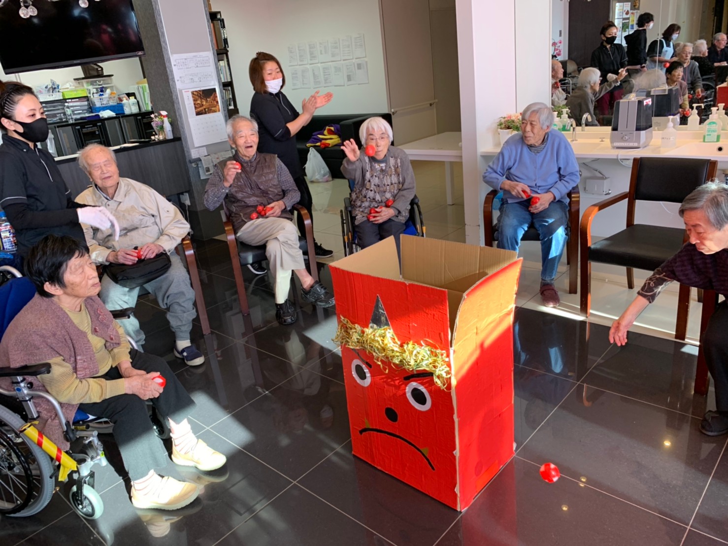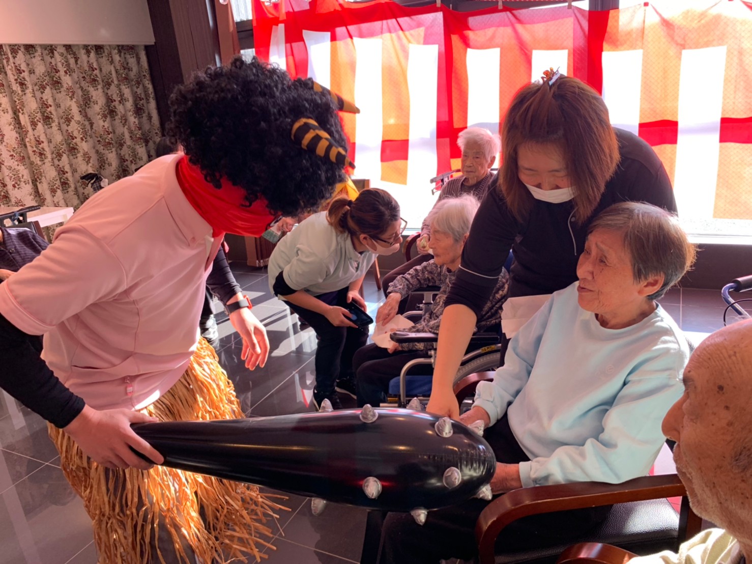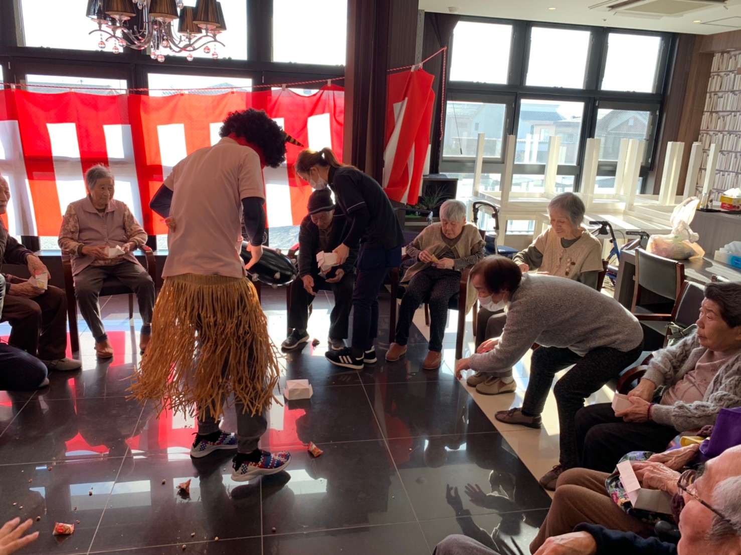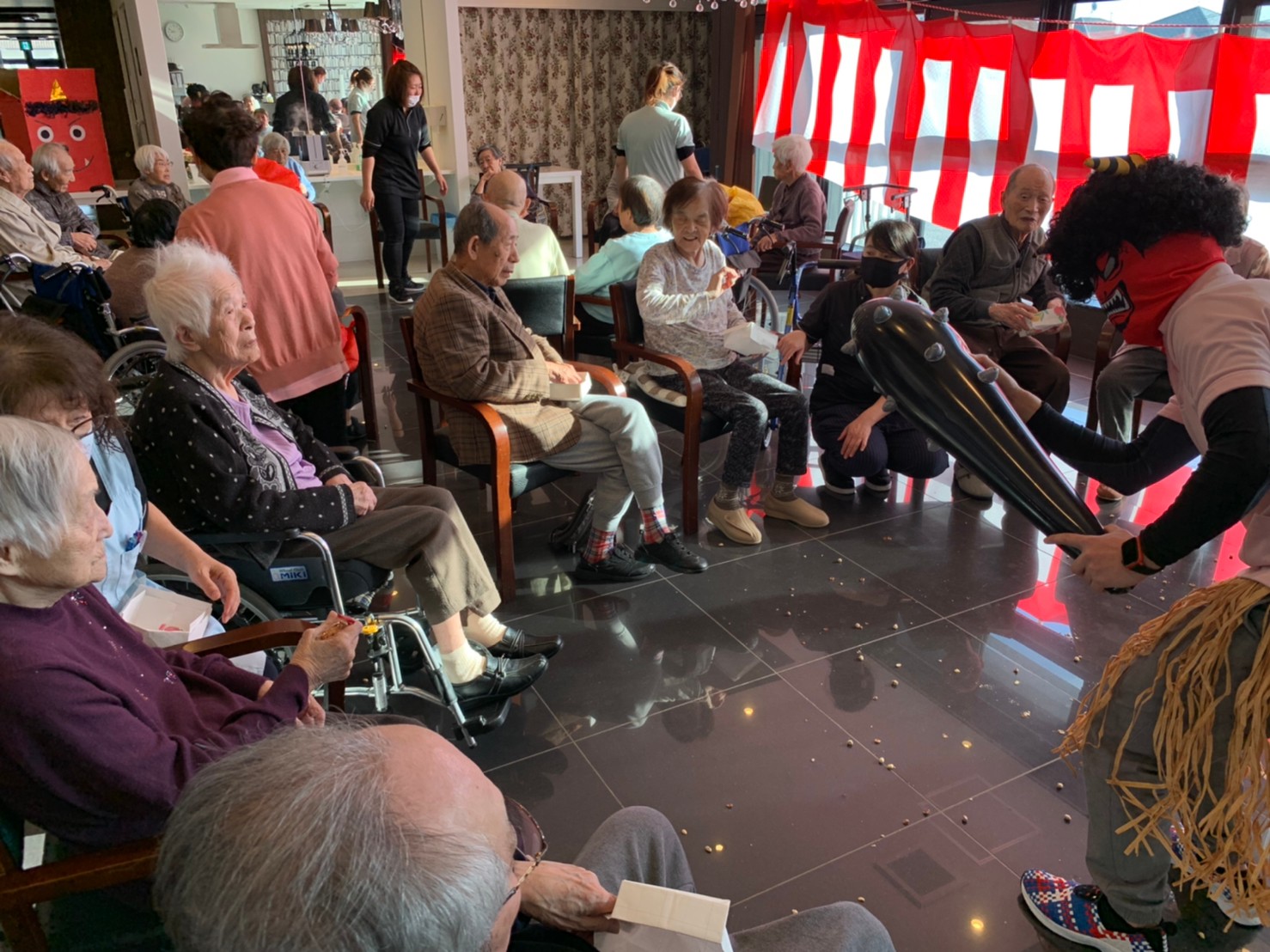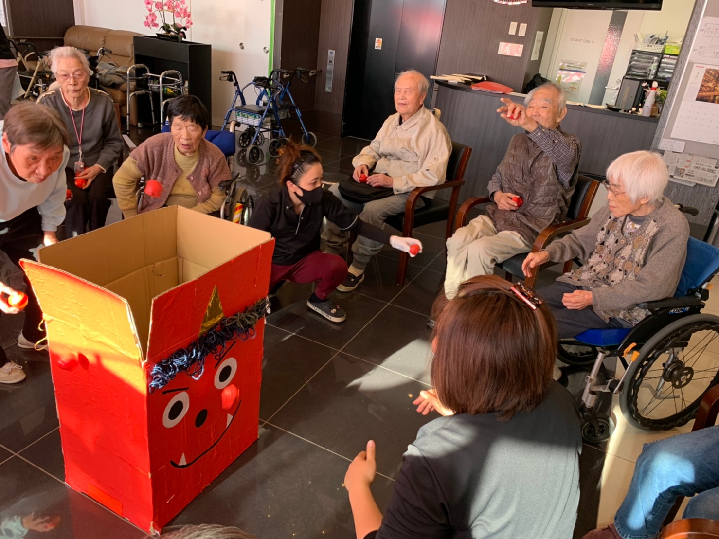 サニープレイス河瀬の月1イベントを本日開催いたしました。2月は節分祭として企画し、豆まきにちなんだミニ運動会を行いました。豆に見立てて玉入れやボーリングのピンを鬼に見立て倒しました。ちなみに玉入れに使った赤鬼のサニーちゃんと青鬼のプレイスくんは利用者さまとスタッフの共同制作です。そのあとは恒例の鬼退治です。今年から衣装も新調されたスタッフ扮する鬼に利用者さまに退治していただきました。悪さをする鬼がなぜか人気で利用者さまが握手をされました(笑)鬼の金棒は空気で膨らますビニール製ですのでご安心ください。最後はこのイベント大トリの福娘の登場です。社内選考会を何度もかさね、名誉ある今年の福娘に選ばれたスタッフが利用者さまとお一人ずつお話をしながら記念撮影をいたしました。ボクも来年の福娘選考会に応募すると言ったら、スタッフ全員から来年も鬼やで!と止められたのはここだけのお話です(‘Д’)