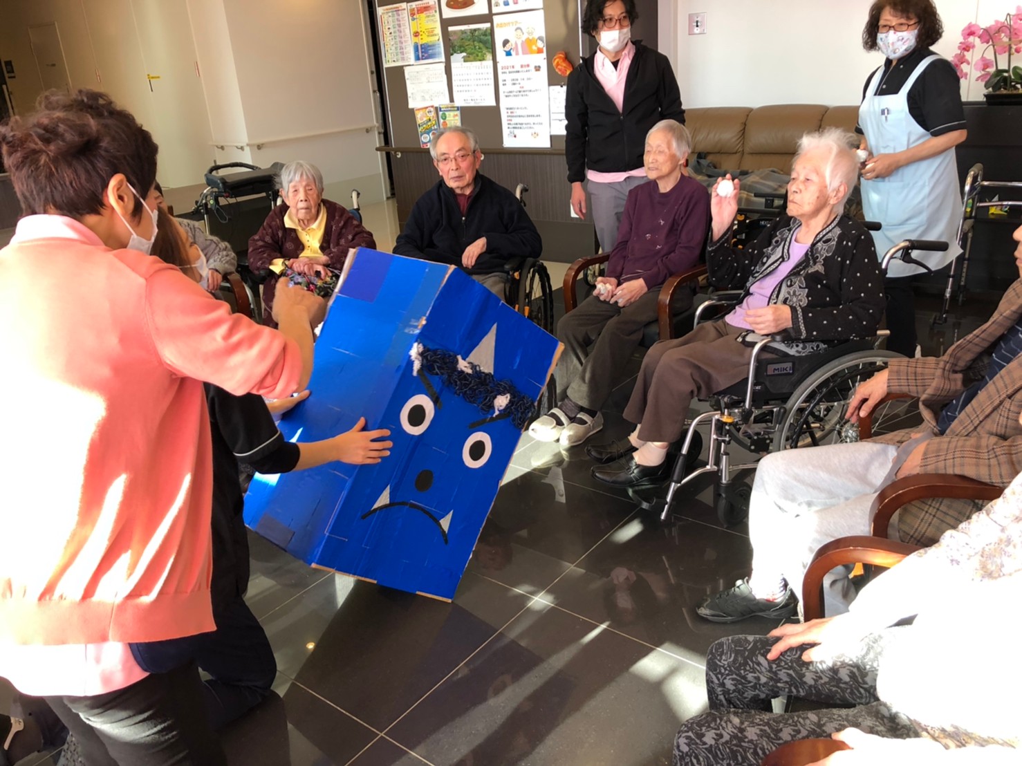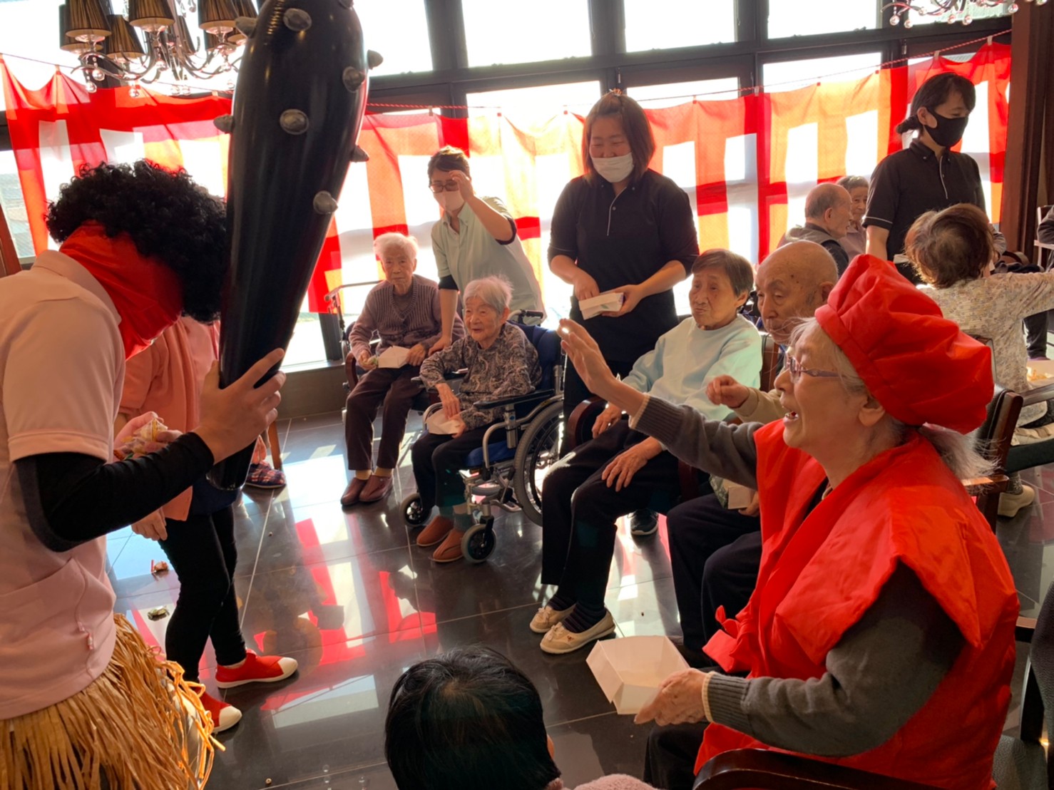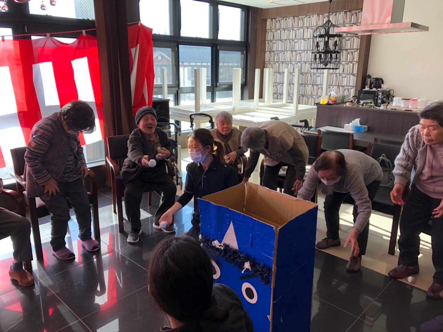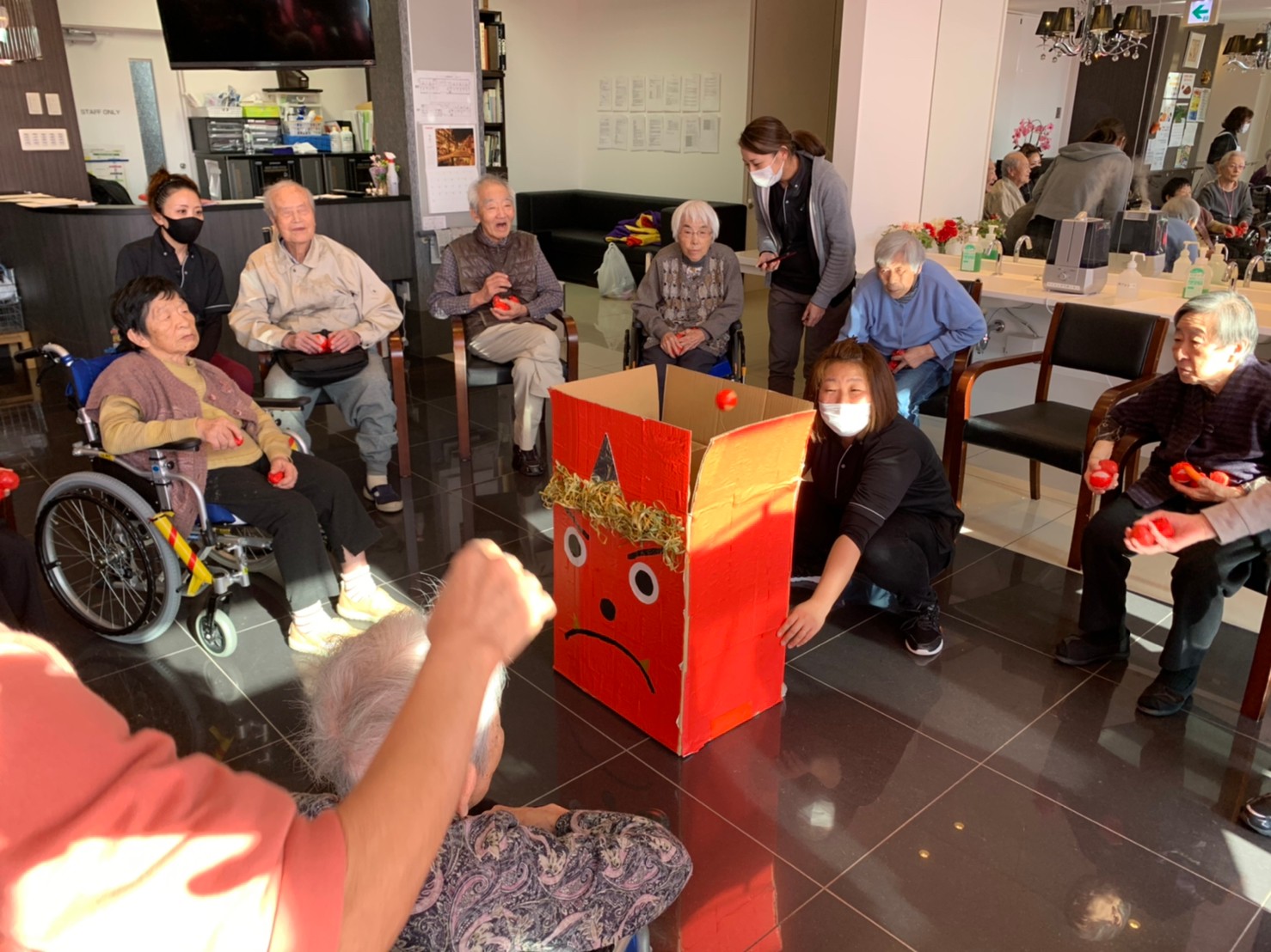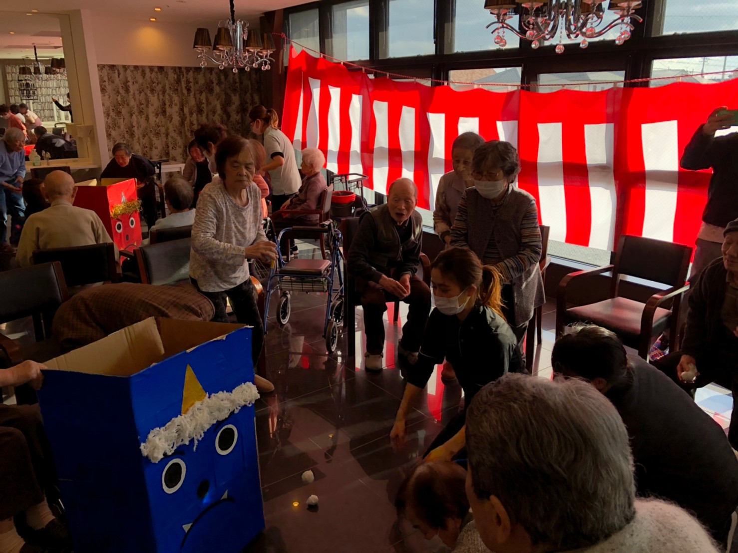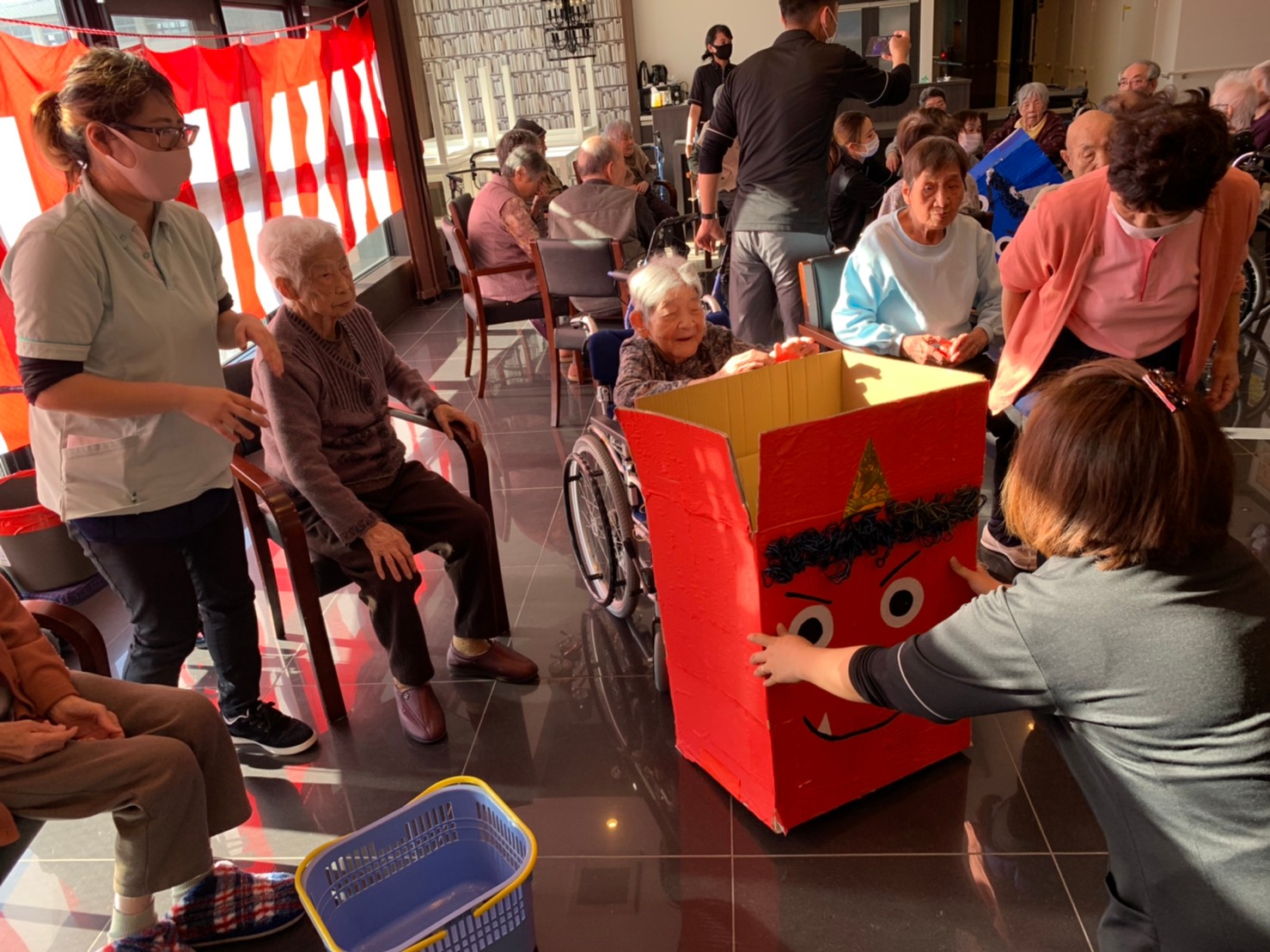 サニープレイス河瀬の月1イベントを本日開催いたしました。2月は節分祭として企画し、豆まきにちなんだミニ運動会を行いました。豆に見立てて玉入れやボーリングのピンを鬼に見立て倒しました。ちなみに玉入れに使った赤鬼のサニーちゃんと青鬼のプレイスくんは利用者さまとスタッフの共同制作です。そのあとは恒例の鬼退治です。今年から衣装も新調されたスタッフ扮する鬼に利用者さまに退治していただきました。悪さをする鬼がなぜか人気で利用者さまが握手をされました(笑)鬼の金棒は空気で膨らますビニール製ですのでご安心ください。最後はこのイベント大トリの福娘の登場です。社内選考会を何度もかさね、名誉ある今年の福娘に選ばれたスタッフが利用者さまとお一人ずつお話をしながら記念撮影をいたしました。ボクも来年の福娘選考会に応募すると言ったら、スタッフ全員から来年も鬼やで!と止められたのはここだけのお話です(‘Д’)