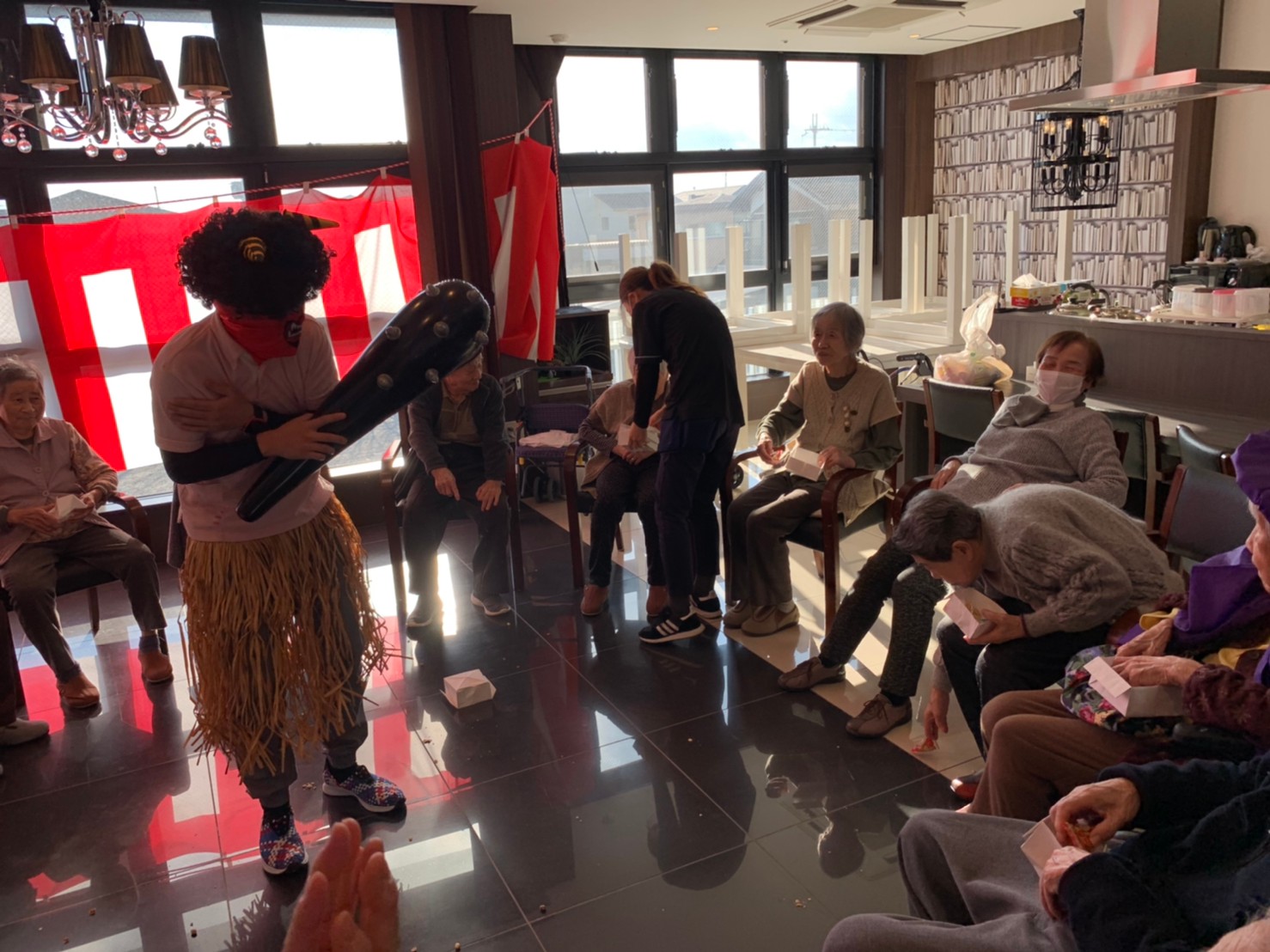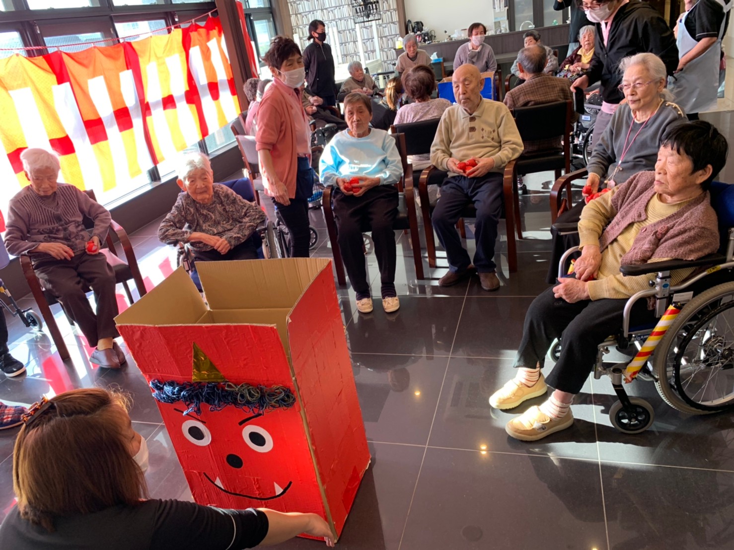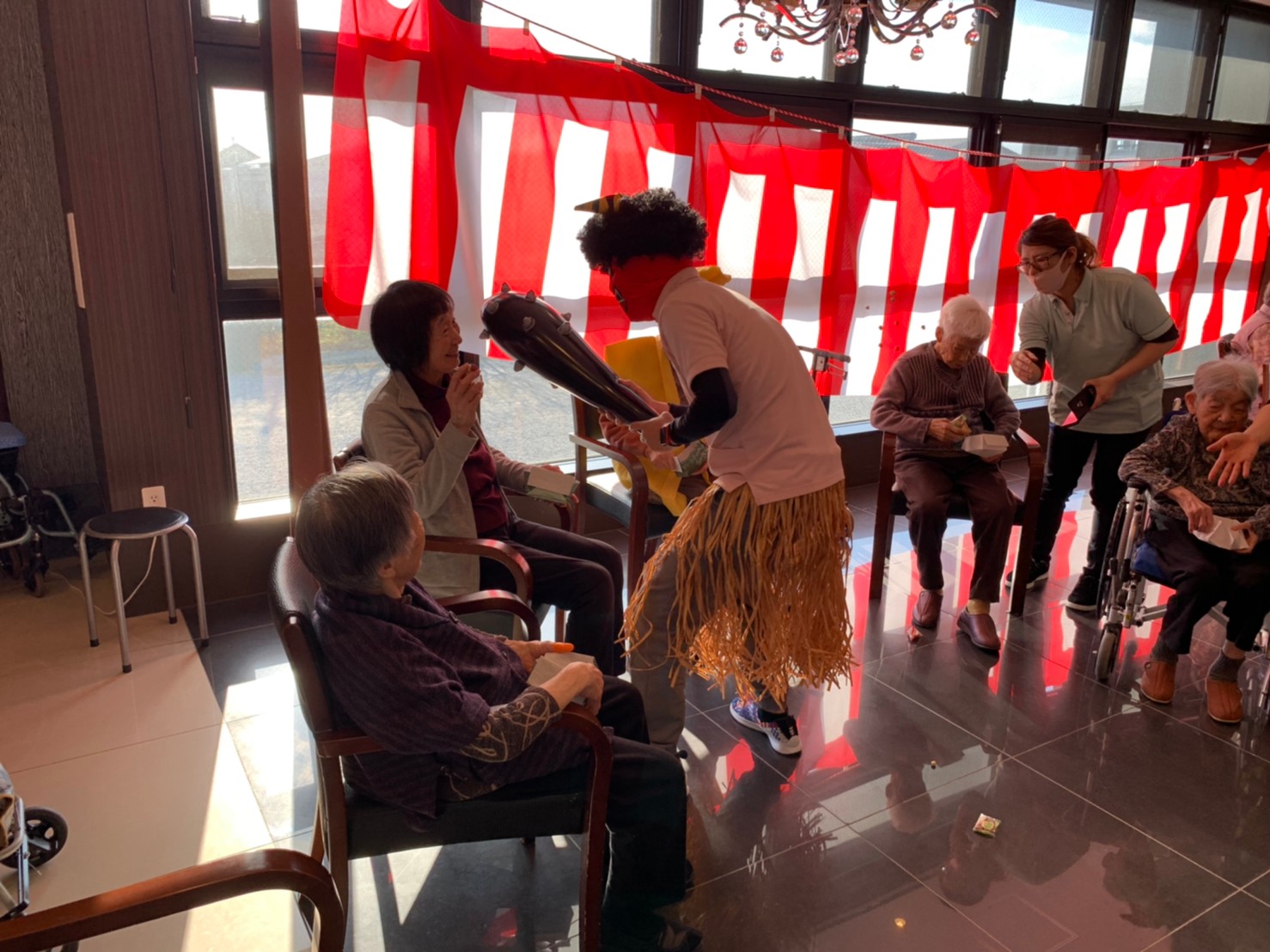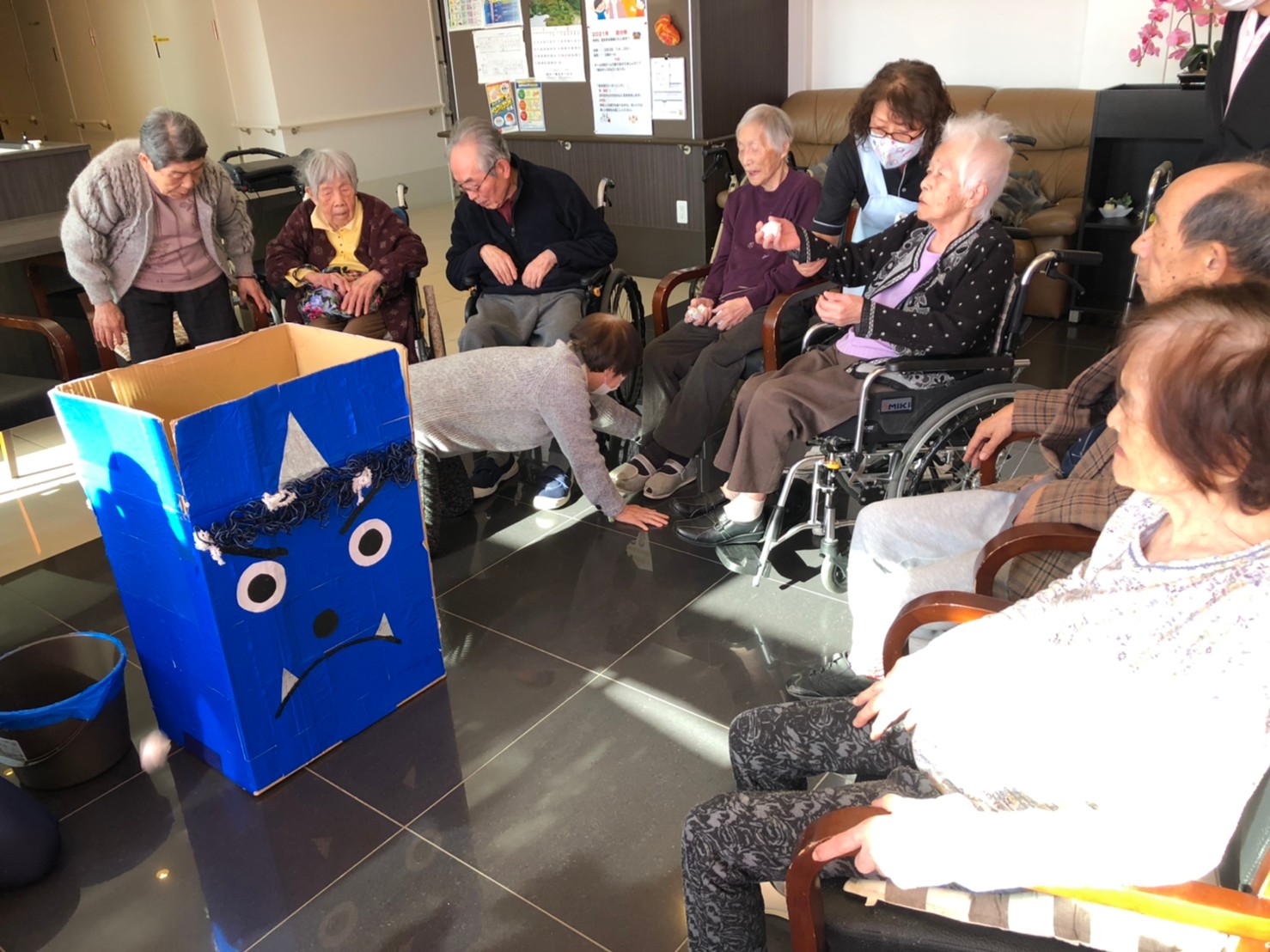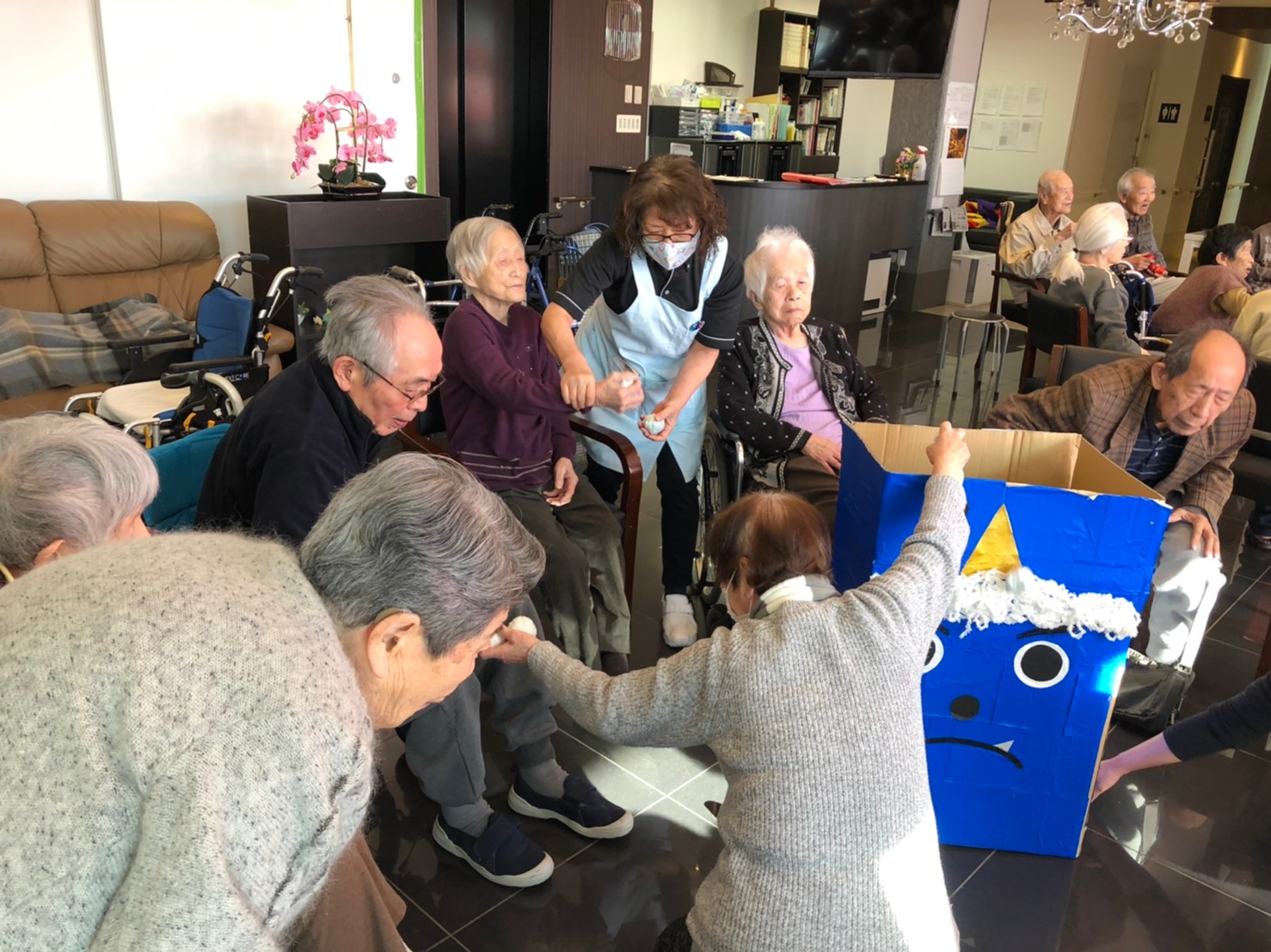 サニープレイス河瀬の月1イベントを本日開催いたしました。2月は節分祭として企画し、豆まきにちなんだミニ運動会を行いました。豆に見立てて玉入れやボーリングのピンを鬼に見立て倒しました。ちなみに玉入れに使った赤鬼のサニーちゃんと青鬼のプレイスくんは利用者さまとスタッフの共同制作です。そのあとは恒例の鬼退治です。今年から衣装も新調されたスタッフ扮する鬼に利用者さまに退治していただきました。悪さをする鬼がなぜか人気で利用者さまが握手をされました(笑)鬼の金棒は空気で膨らますビニール製ですのでご安心ください。最後はこのイベント大トリの福娘の登場です。社内選考会を何度もかさね、名誉ある今年の福娘に選ばれたスタッフが利用者さまとお一人ずつお話をしながら記念撮影をいたしました。ボクも来年の福娘選考会に応募すると言ったら、スタッフ全員から来年も鬼やで!と止められたのはここだけのお話です(‘Д’)