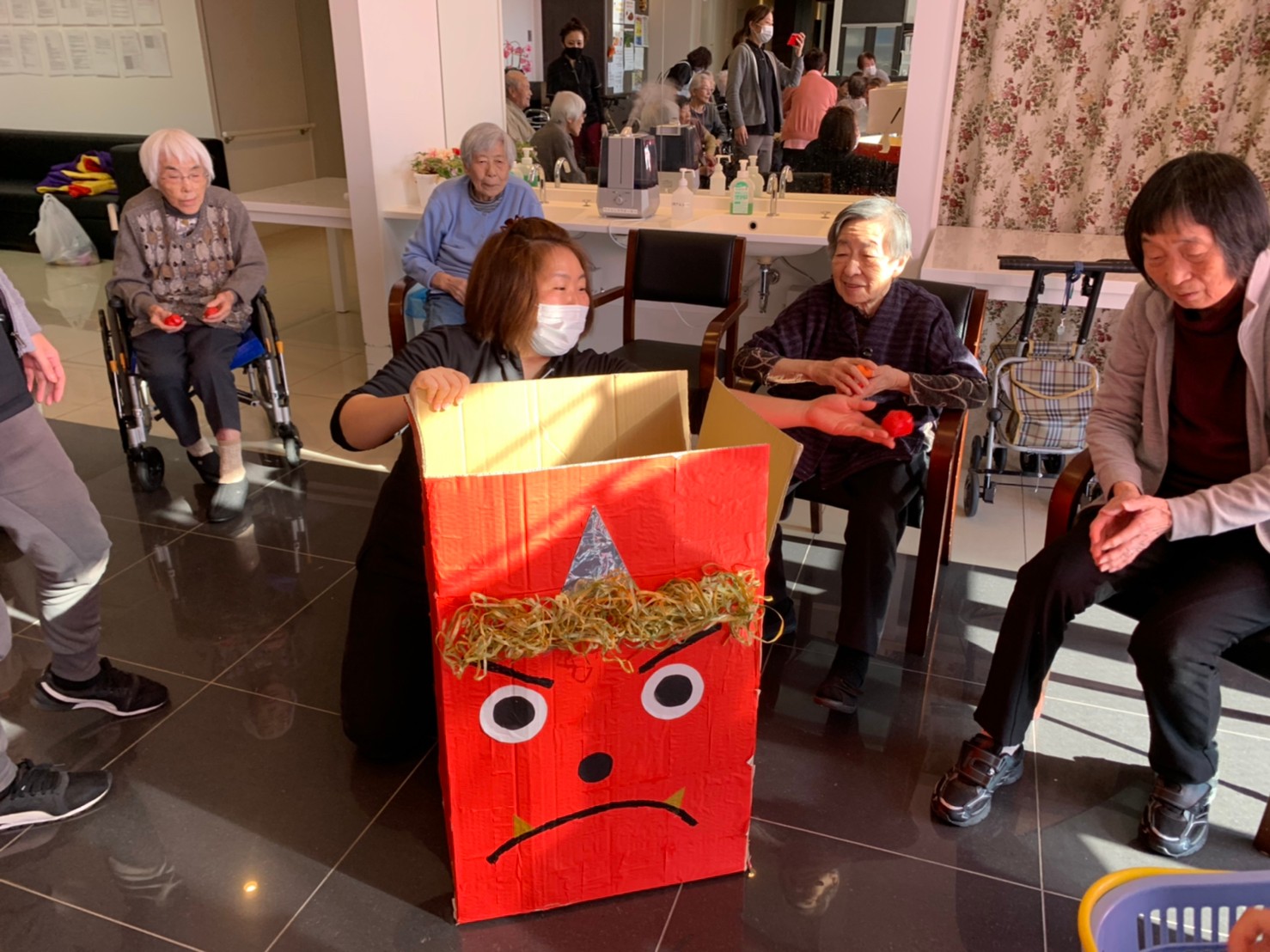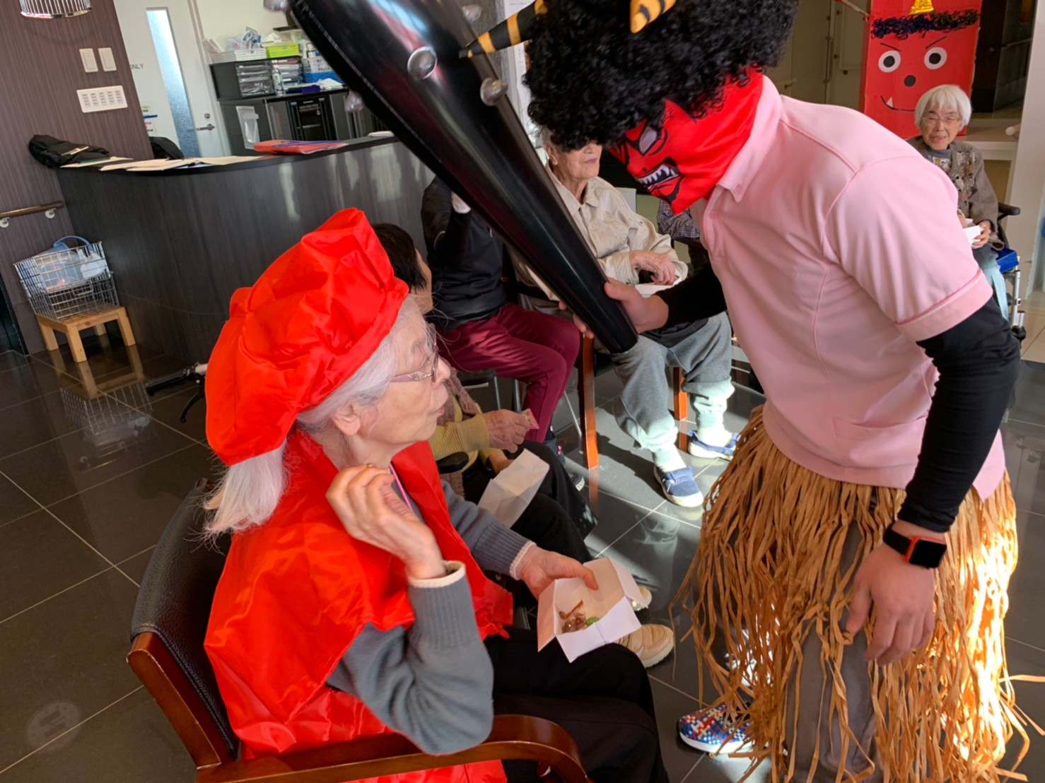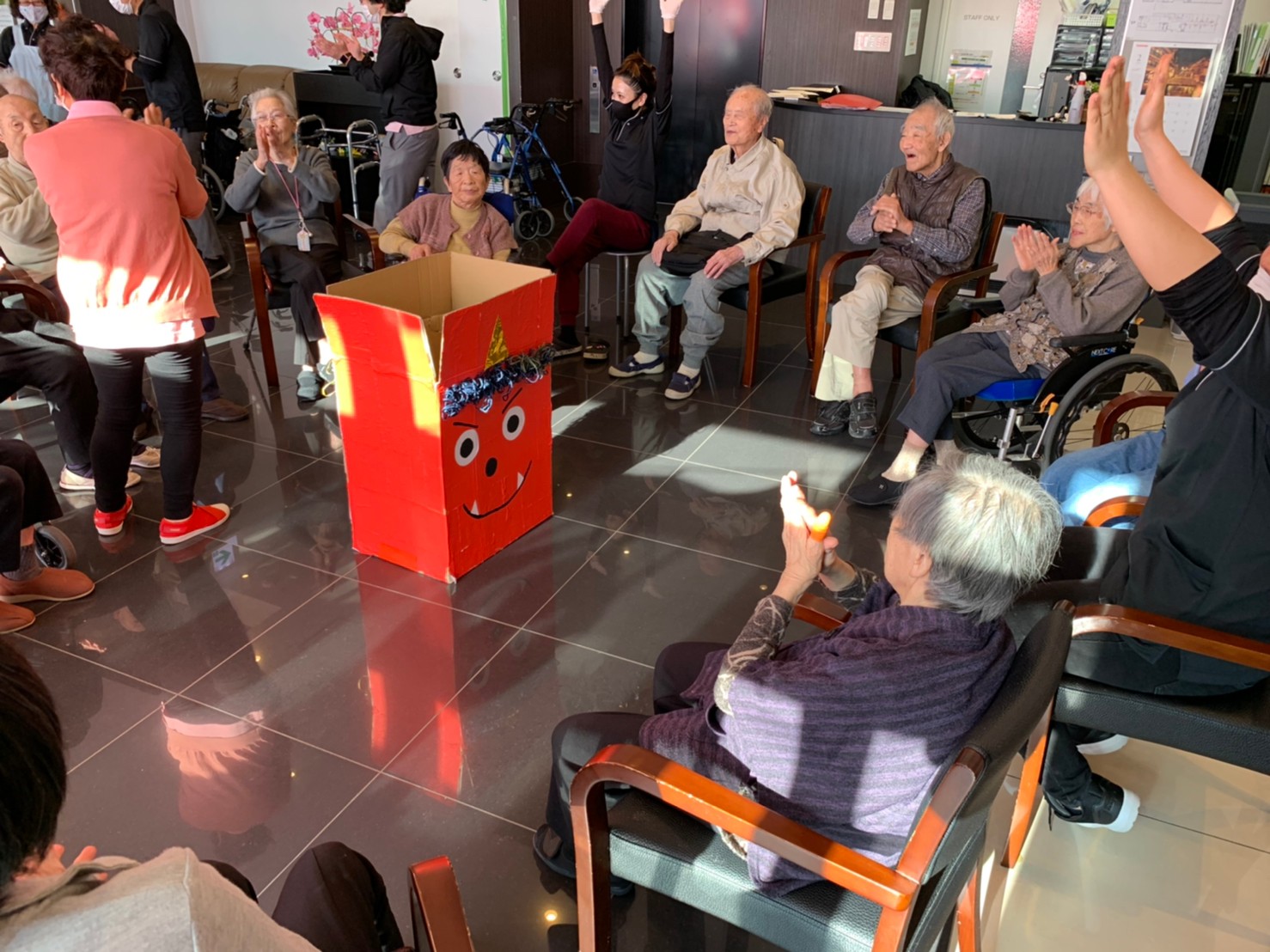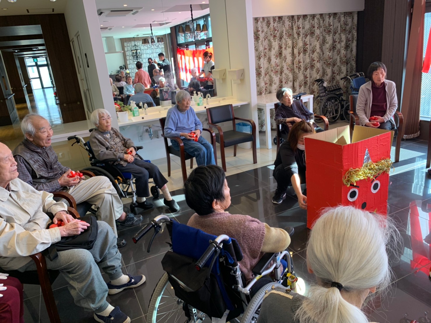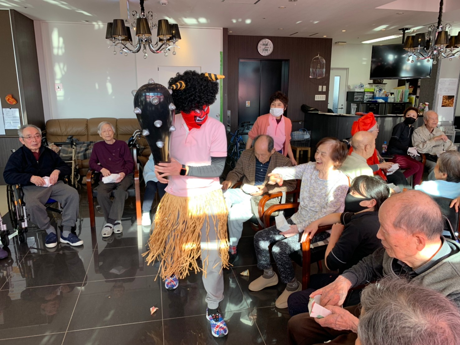 サニープレイス河瀬の月1イベントを本日開催いたしました。2月は節分祭として企画し、豆まきにちなんだミニ運動会を行いました。豆に見立てて玉入れやボーリングのピンを鬼に見立て倒しました。ちなみに玉入れに使った赤鬼のサニーちゃんと青鬼のプレイスくんは利用者さまとスタッフの共同制作です。そのあとは恒例の鬼退治です。今年から衣装も新調されたスタッフ扮する鬼に利用者さまに退治していただきました。悪さをする鬼がなぜか人気で利用者さまが握手をされました(笑)鬼の金棒は空気で膨らますビニール製ですのでご安心ください。最後はこのイベント大トリの福娘の登場です。社内選考会を何度もかさね、名誉ある今年の福娘に選ばれたスタッフが利用者さまとお一人ずつお話をしながら記念撮影をいたしました。ボクも来年の福娘選考会に応募すると言ったら、スタッフ全員から来年も鬼やで!と止められたのはここだけのお話です(‘Д’)