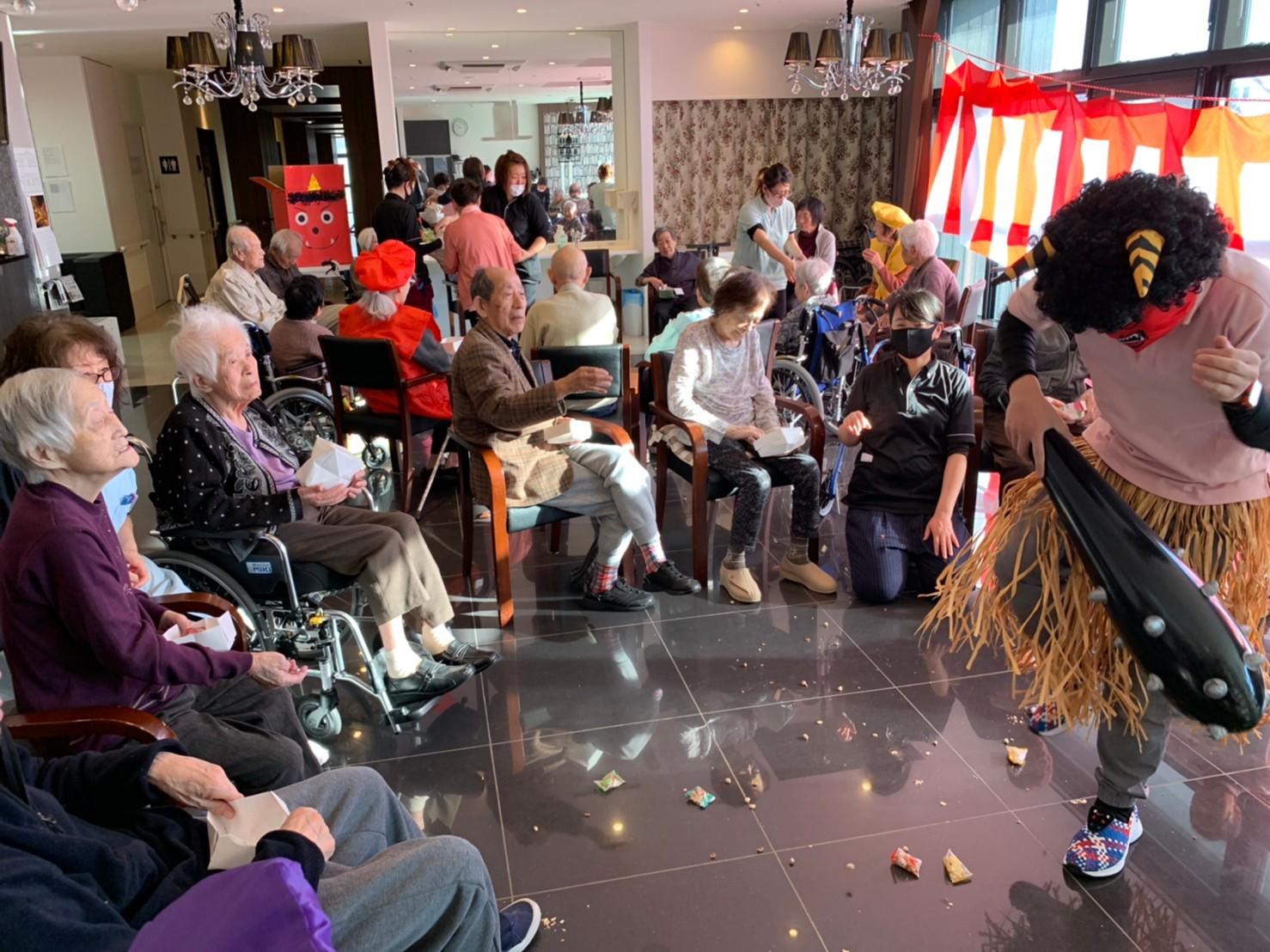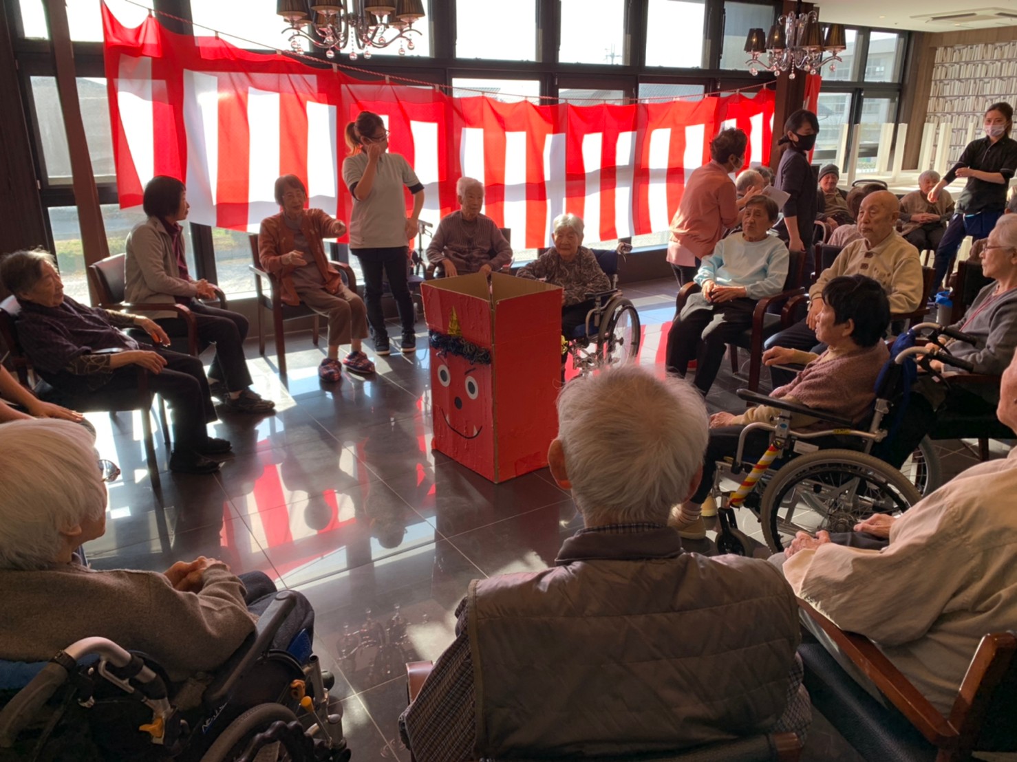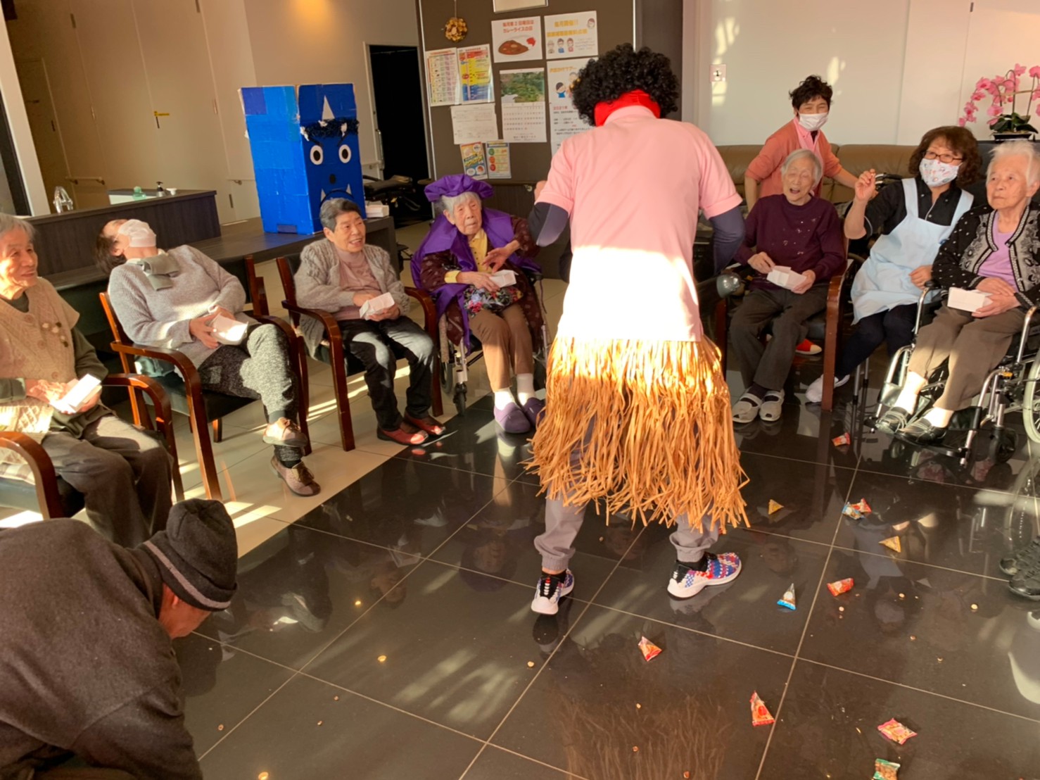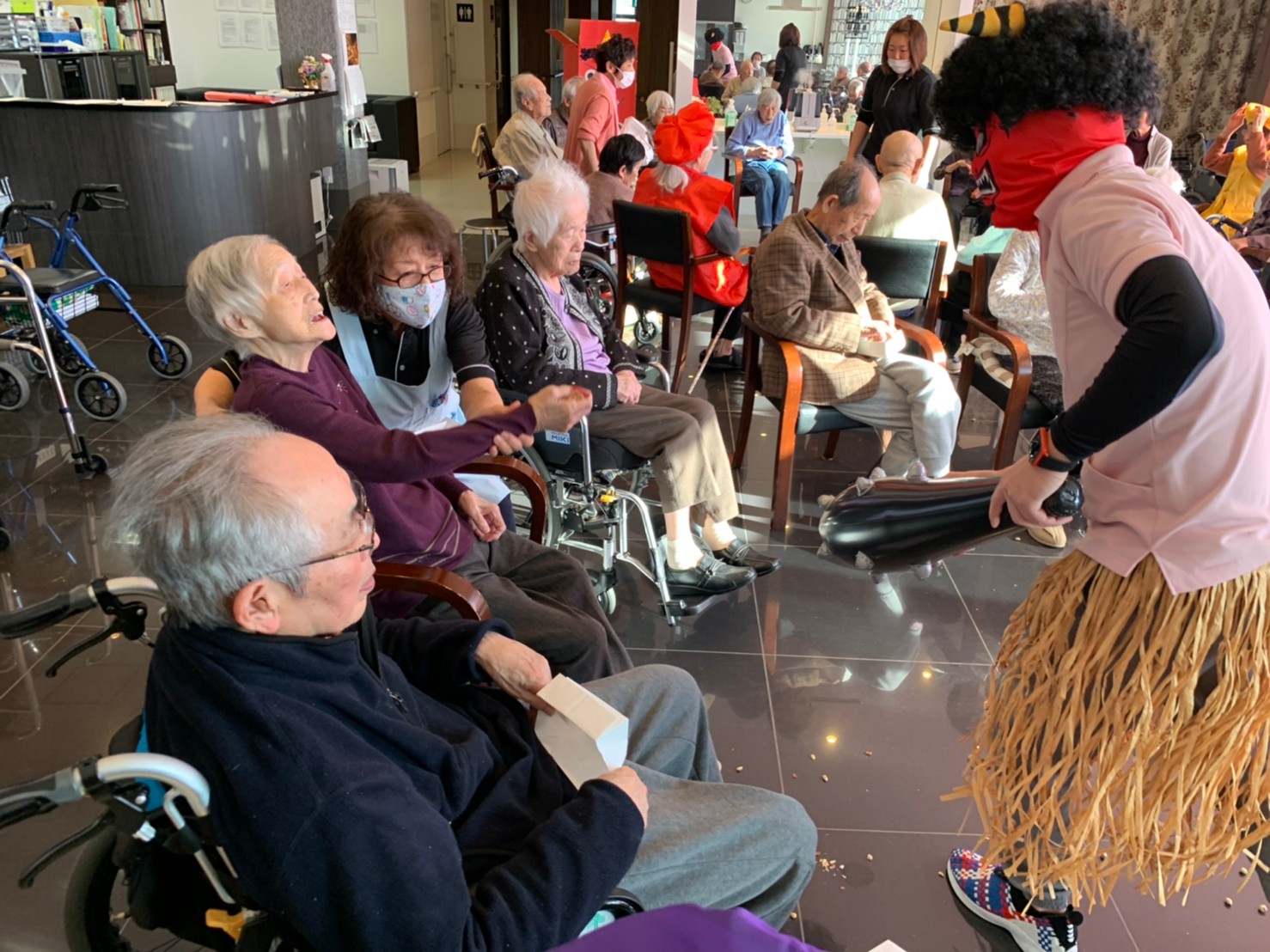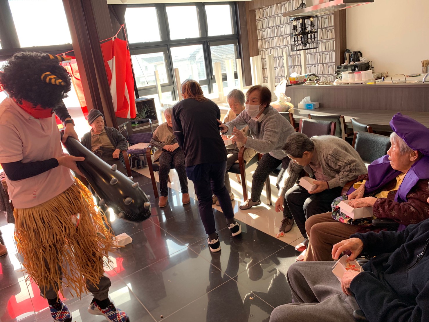 サニープレイス河瀬の月1イベントを本日開催いたしました。2月は節分祭として企画し、豆まきにちなんだミニ運動会を行いました。豆に見立てて玉入れやボーリングのピンを鬼に見立て倒しました。ちなみに玉入れに使った赤鬼のサニーちゃんと青鬼のプレイスくんは利用者さまとスタッフの共同制作です。そのあとは恒例の鬼退治です。今年から衣装も新調されたスタッフ扮する鬼に利用者さまに退治していただきました。悪さをする鬼がなぜか人気で利用者さまが握手をされました(笑)鬼の金棒は空気で膨らますビニール製ですのでご安心ください。最後はこのイベント大トリの福娘の登場です。社内選考会を何度もかさね、名誉ある今年の福娘に選ばれたスタッフが利用者さまとお一人ずつお話をしながら記念撮影をいたしました。ボクも来年の福娘選考会に応募すると言ったら、スタッフ全員から来年も鬼やで!と止められたのはここだけのお話です(‘Д’)