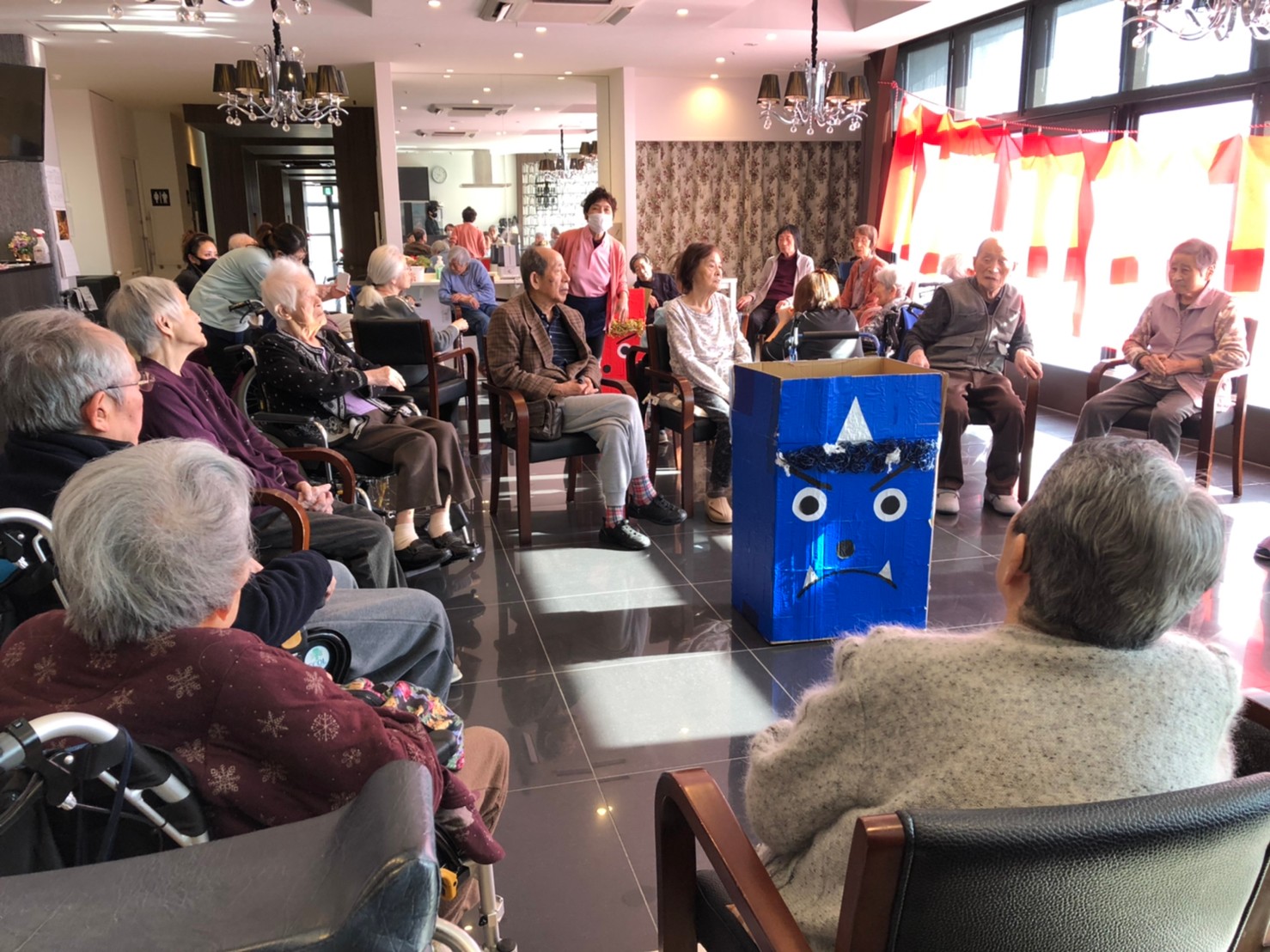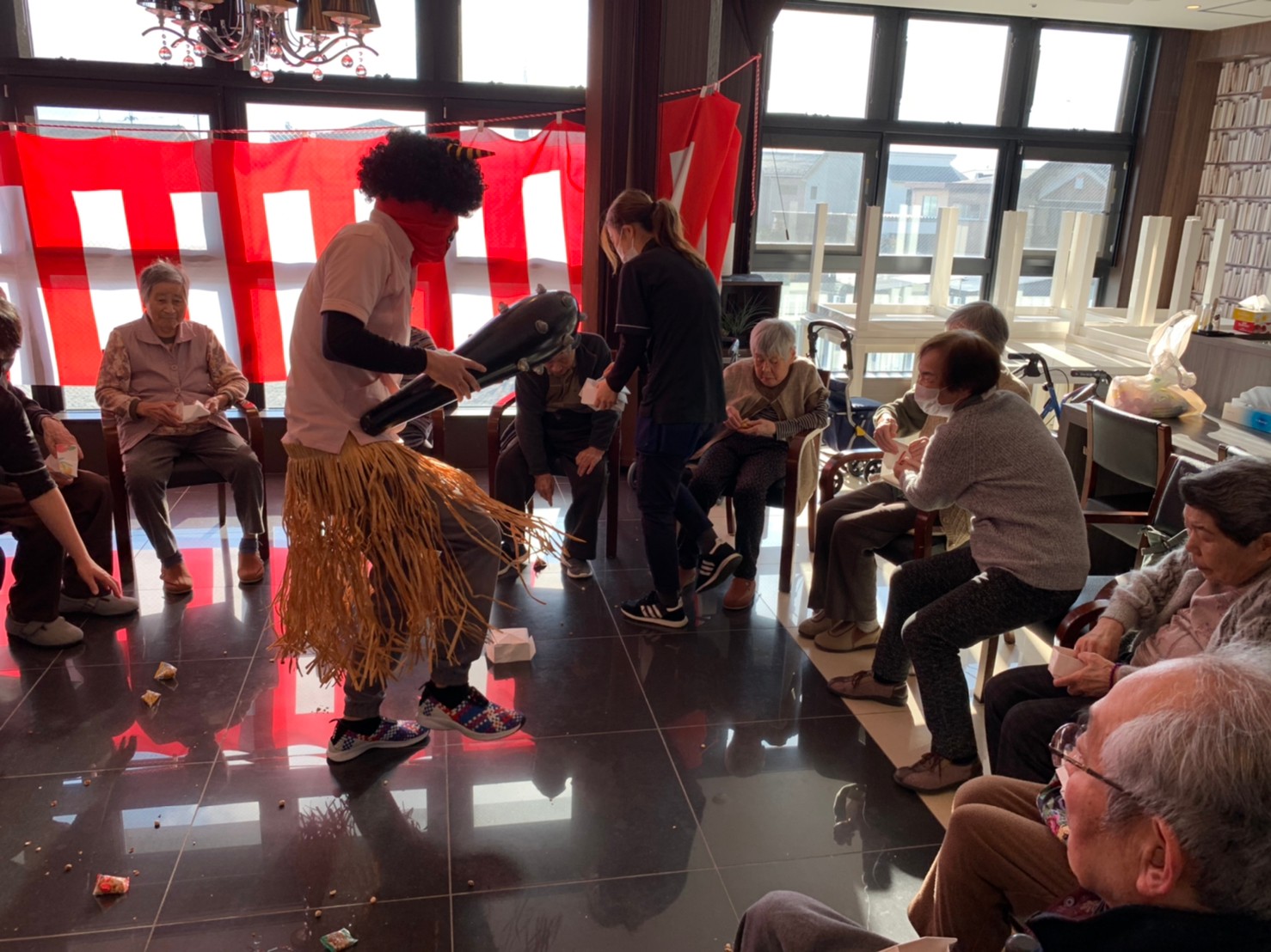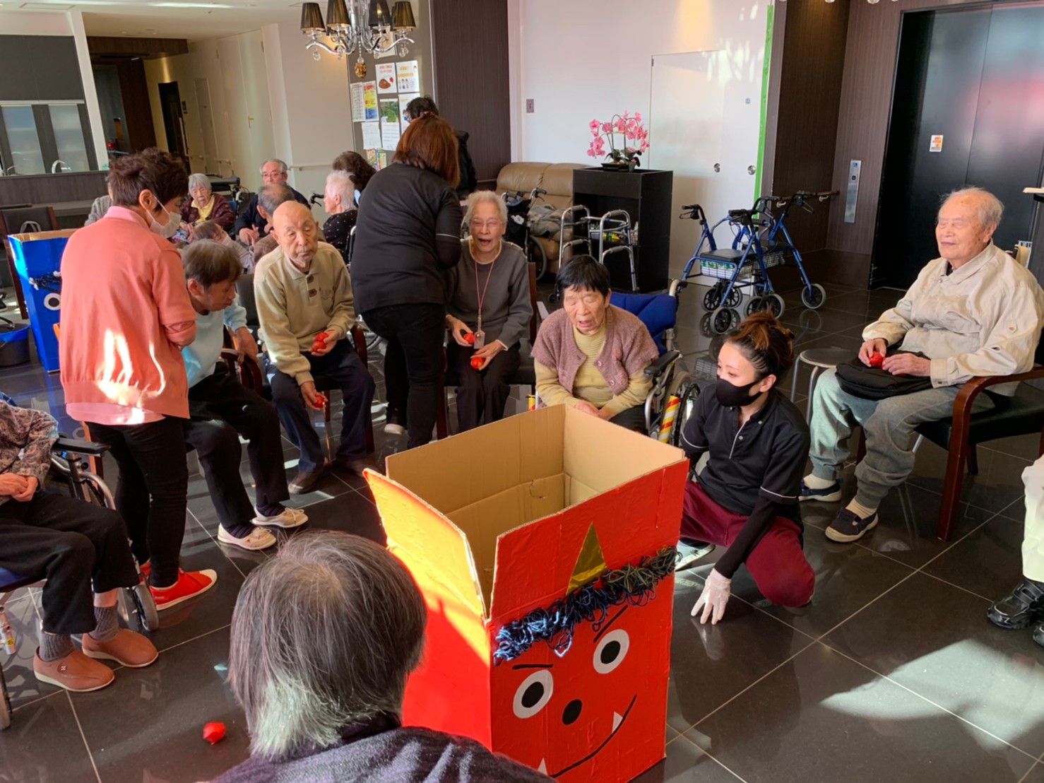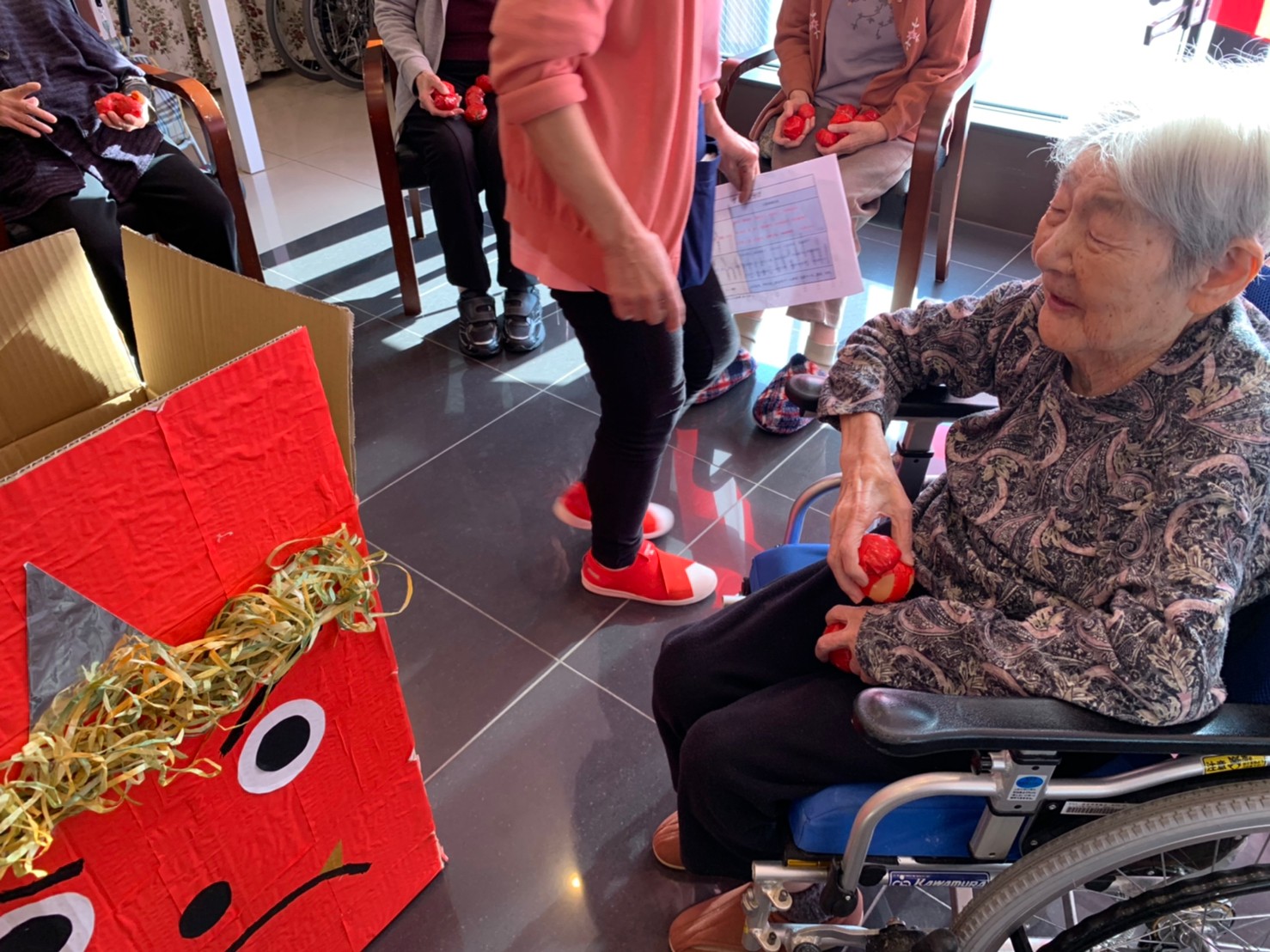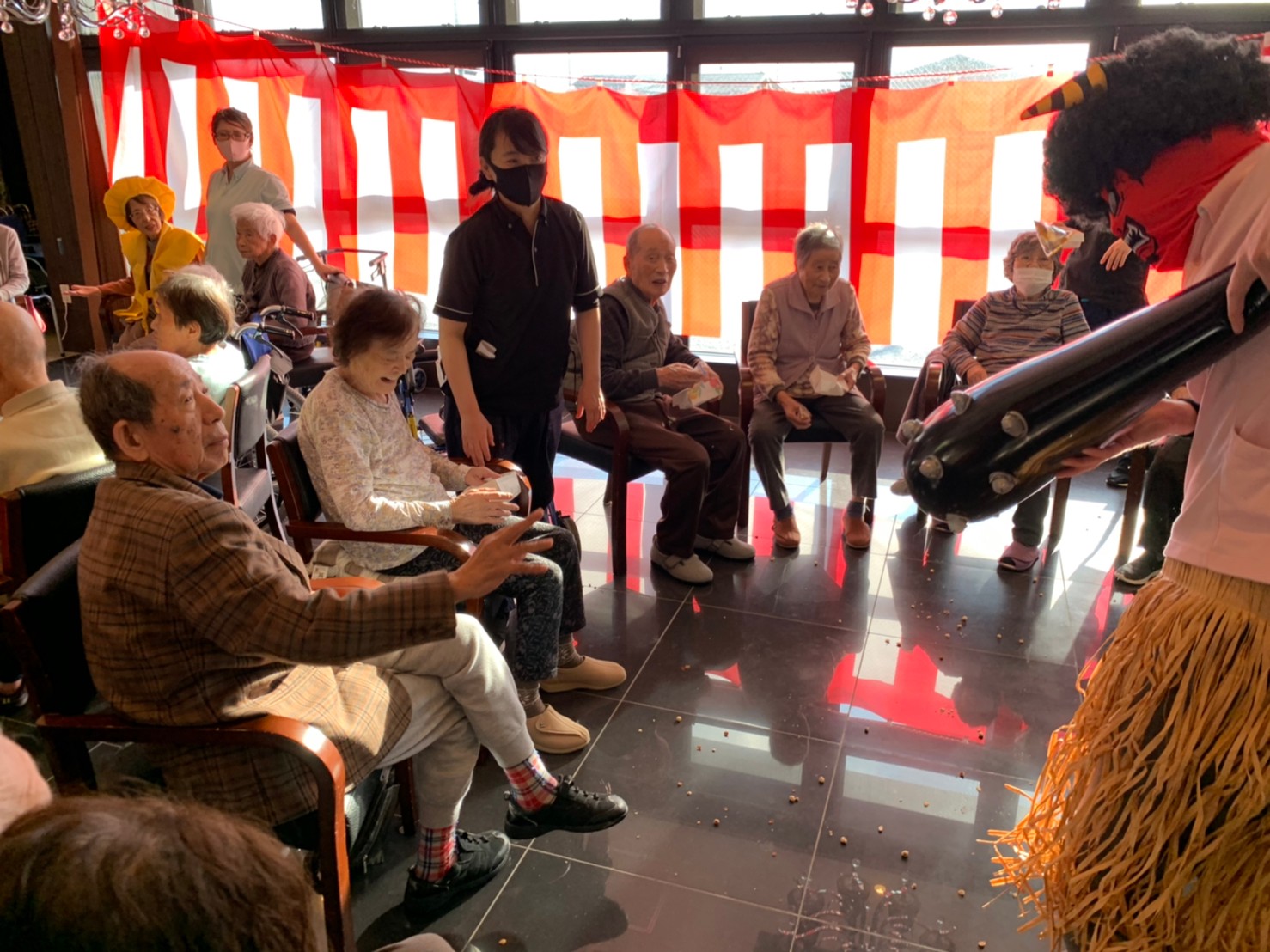 サニープレイス河瀬の月1イベントを本日開催いたしました。2月は節分祭として企画し、豆まきにちなんだミニ運動会を行いました。豆に見立てて玉入れやボーリングのピンを鬼に見立て倒しました。ちなみに玉入れに使った赤鬼のサニーちゃんと青鬼のプレイスくんは利用者さまとスタッフの共同制作です。そのあとは恒例の鬼退治です。今年から衣装も新調されたスタッフ扮する鬼に利用者さまに退治していただきました。悪さをする鬼がなぜか人気で利用者さまが握手をされました(笑)鬼の金棒は空気で膨らますビニール製ですのでご安心ください。最後はこのイベント大トリの福娘の登場です。社内選考会を何度もかさね、名誉ある今年の福娘に選ばれたスタッフが利用者さまとお一人ずつお話をしながら記念撮影をいたしました。ボクも来年の福娘選考会に応募すると言ったら、スタッフ全員から来年も鬼やで!と止められたのはここだけのお話です(‘Д’)