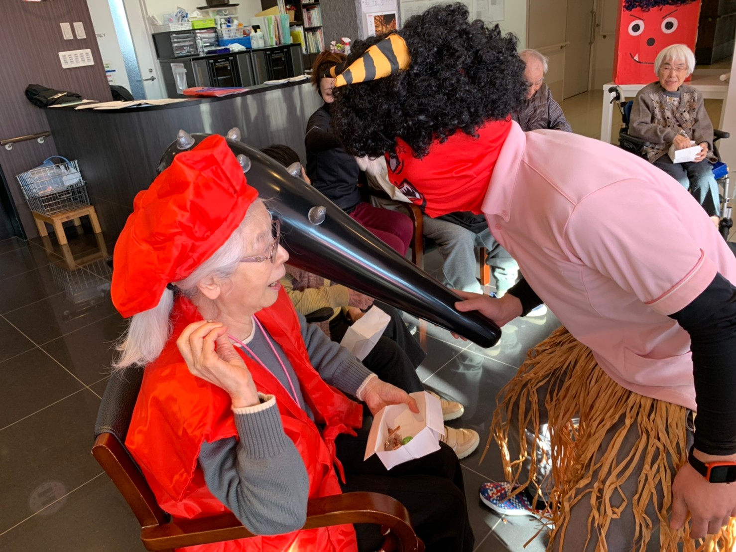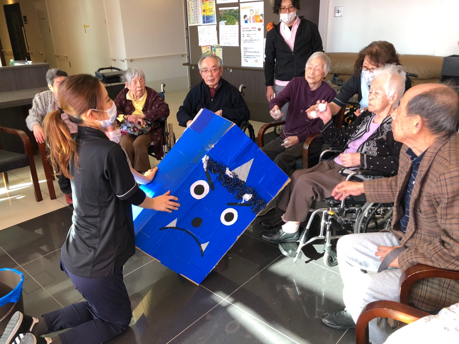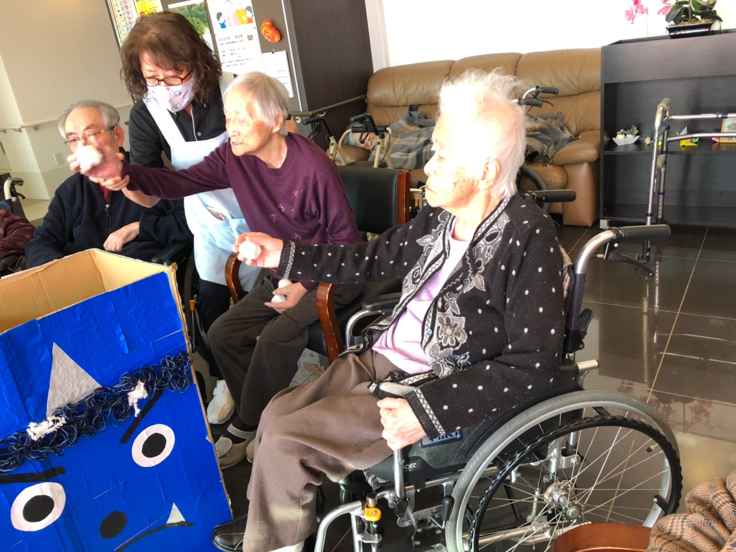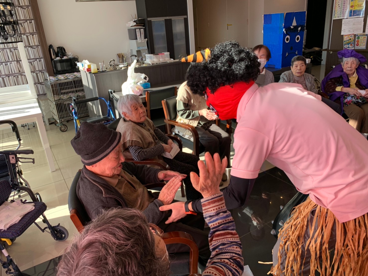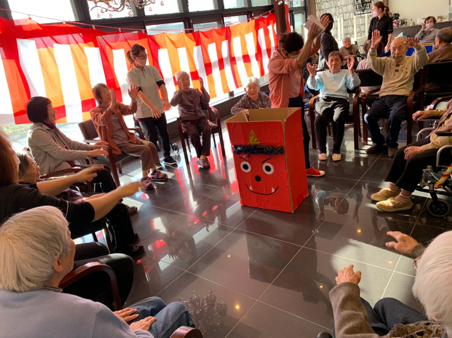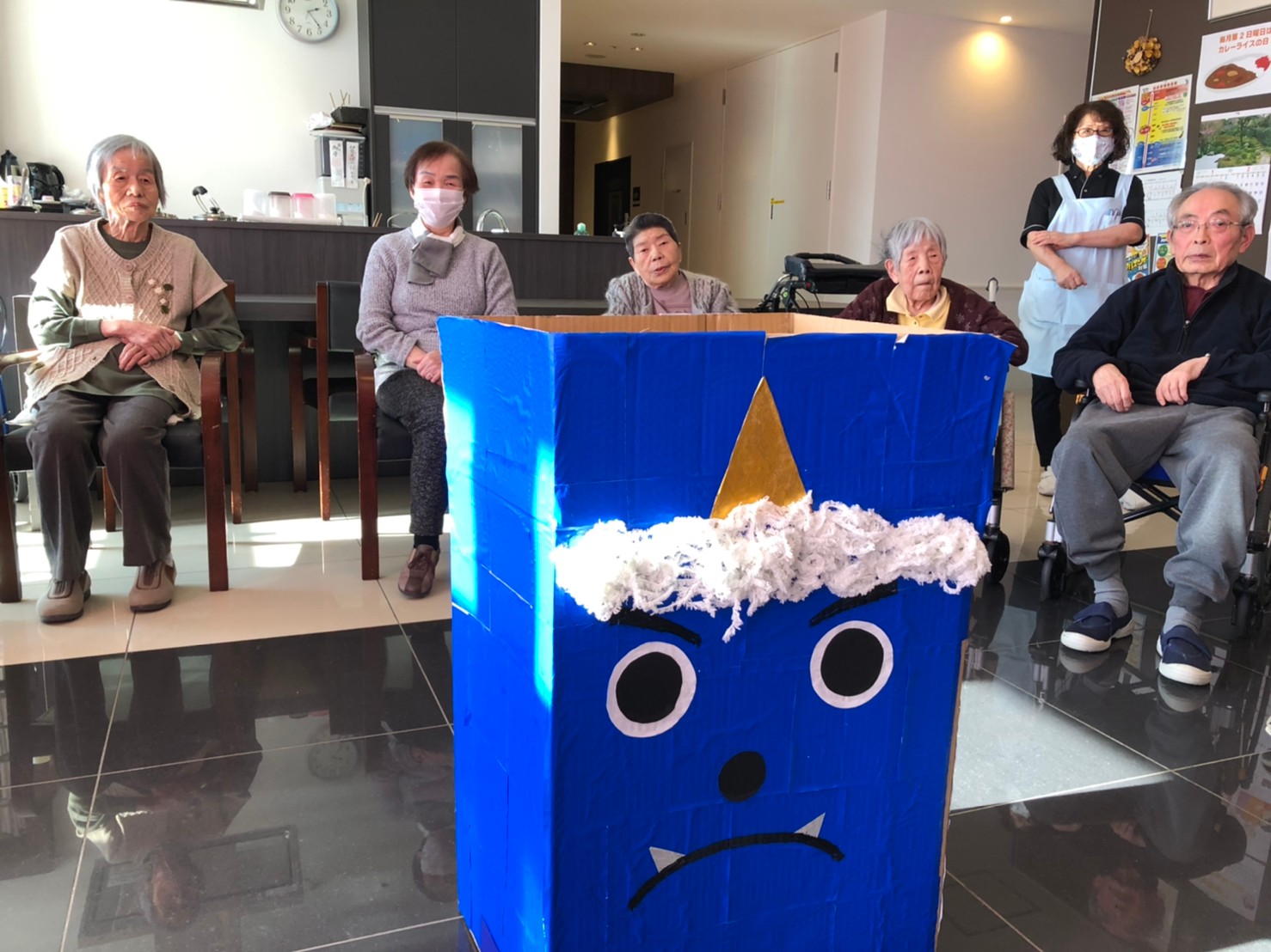 サニープレイス河瀬の月1イベントを本日開催いたしました。2月は節分祭として企画し、豆まきにちなんだミニ運動会を行いました。豆に見立てて玉入れやボーリングのピンを鬼に見立て倒しました。ちなみに玉入れに使った赤鬼のサニーちゃんと青鬼のプレイスくんは利用者さまとスタッフの共同制作です。そのあとは恒例の鬼退治です。今年から衣装も新調されたスタッフ扮する鬼に利用者さまに退治していただきました。悪さをする鬼がなぜか人気で利用者さまが握手をされました(笑)鬼の金棒は空気で膨らますビニール製ですのでご安心ください。最後はこのイベント大トリの福娘の登場です。社内選考会を何度もかさね、名誉ある今年の福娘に選ばれたスタッフが利用者さまとお一人ずつお話をしながら記念撮影をいたしました。ボクも来年の福娘選考会に応募すると言ったら、スタッフ全員から来年も鬼やで!と止められたのはここだけのお話です(‘Д’)