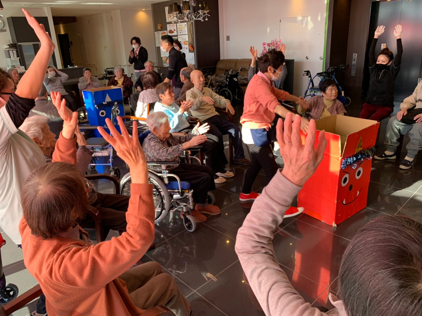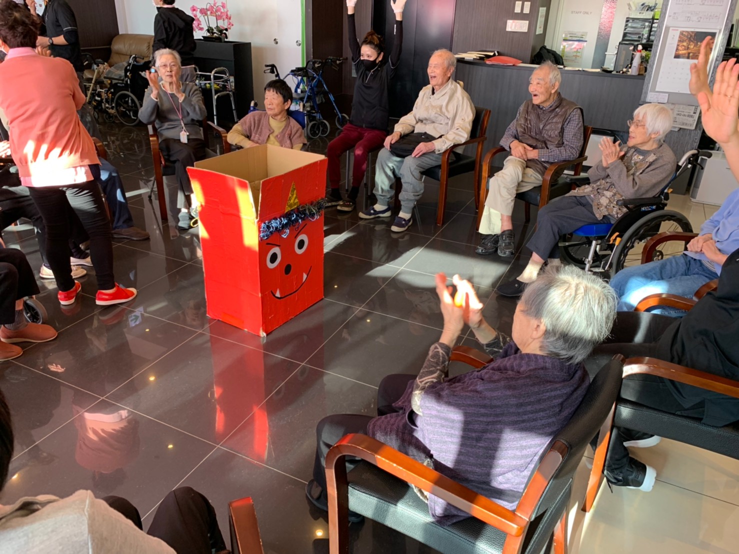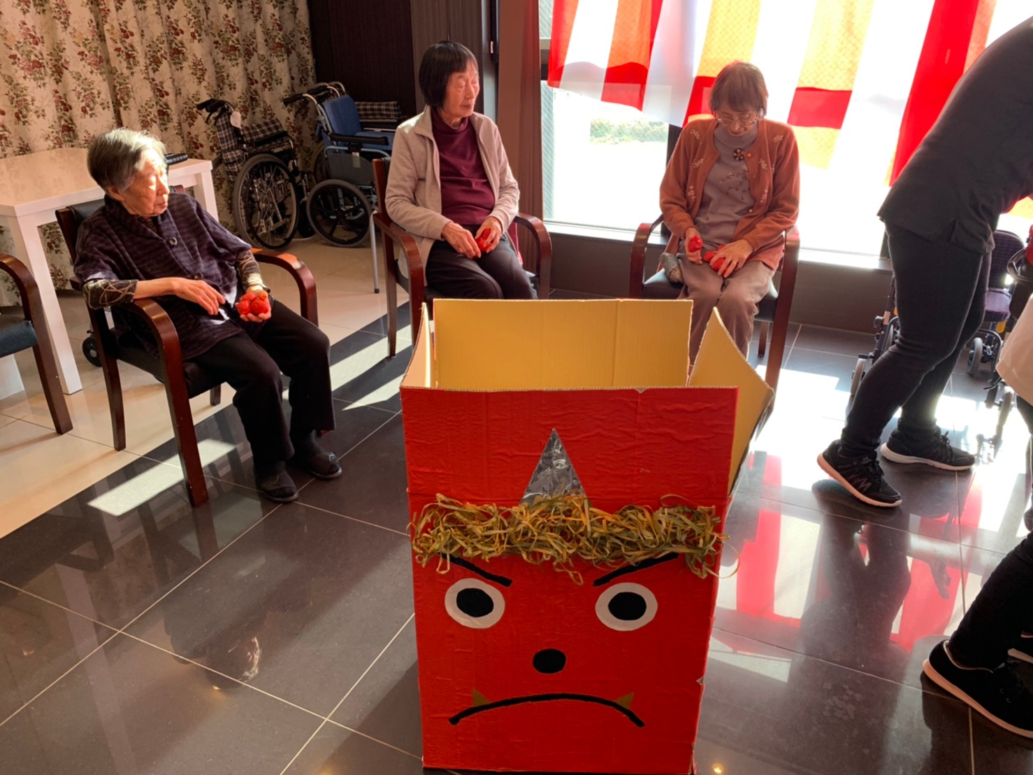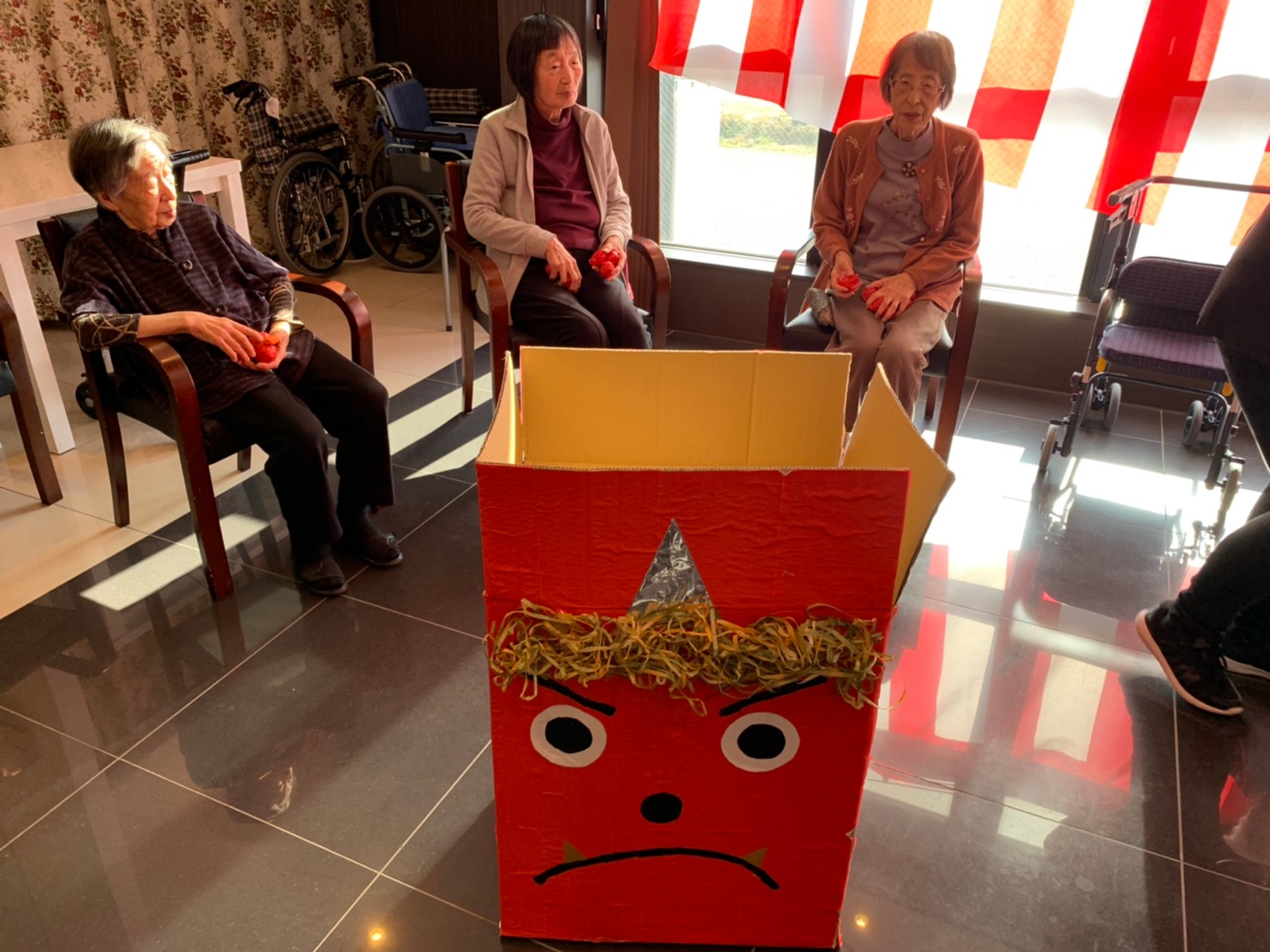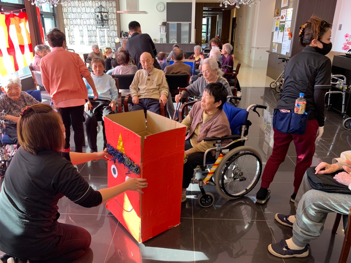 サニープレイス河瀬の月1イベントを本日開催いたしました。2月は節分祭として企画し、豆まきにちなんだミニ運動会を行いました。豆に見立てて玉入れやボーリングのピンを鬼に見立て倒しました。ちなみに玉入れに使った赤鬼のサニーちゃんと青鬼のプレイスくんは利用者さまとスタッフの共同制作です。そのあとは恒例の鬼退治です。今年から衣装も新調されたスタッフ扮する鬼に利用者さまに退治していただきました。悪さをする鬼がなぜか人気で利用者さまが握手をされました(笑)鬼の金棒は空気で膨らますビニール製ですのでご安心ください。最後はこのイベント大トリの福娘の登場です。社内選考会を何度もかさね、名誉ある今年の福娘に選ばれたスタッフが利用者さまとお一人ずつお話をしながら記念撮影をいたしました。ボクも来年の福娘選考会に応募すると言ったら、スタッフ全員から来年も鬼やで!と止められたのはここだけのお話です(‘Д’)