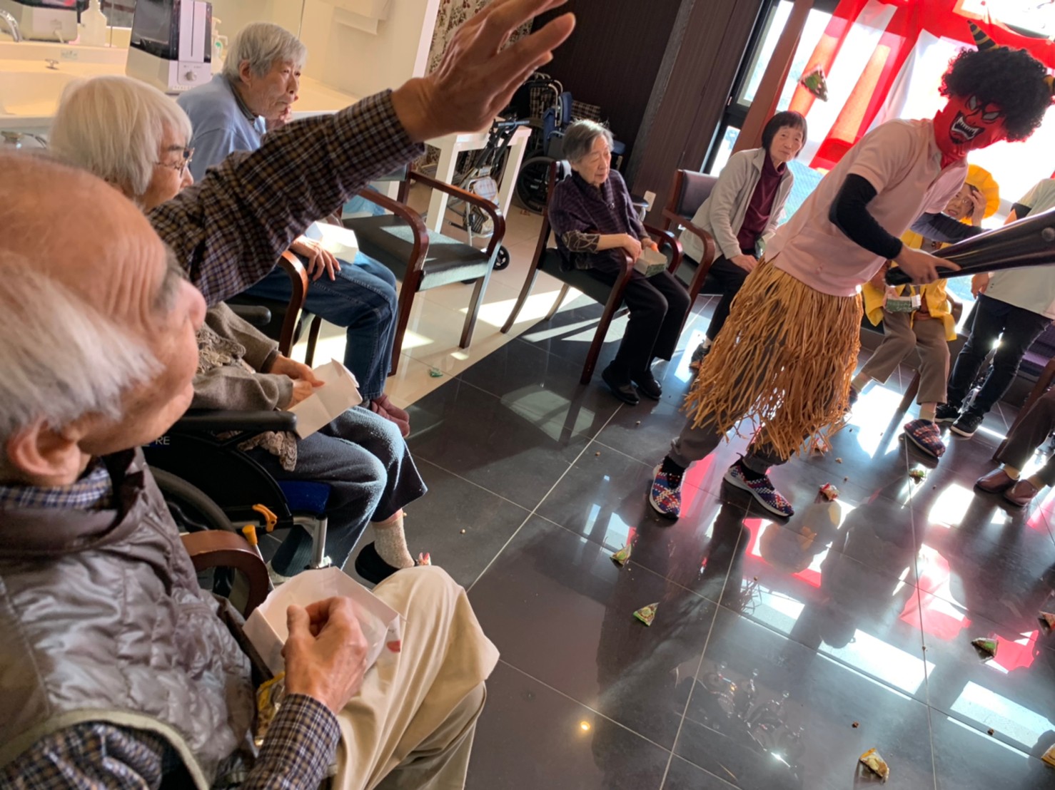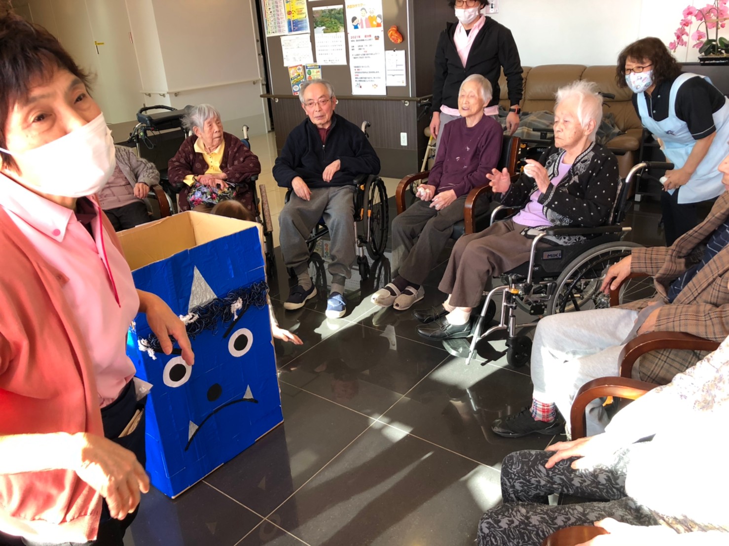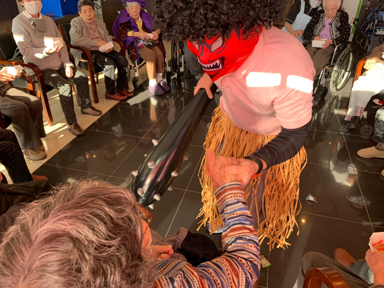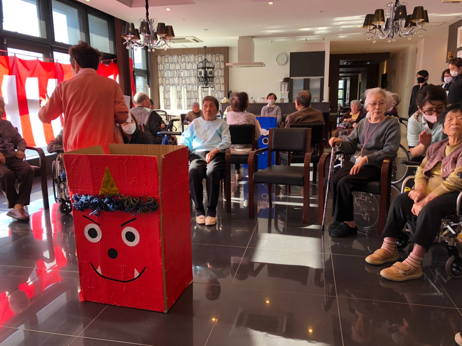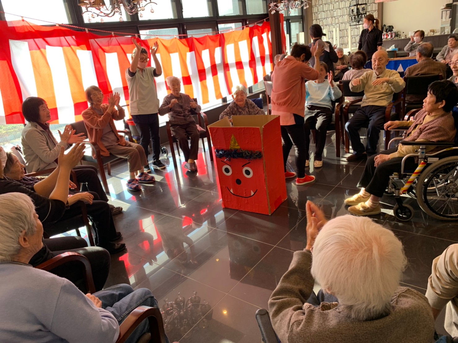 サニープレイス河瀬の月1イベントを本日開催いたしました。2月は節分祭として企画し、豆まきにちなんだミニ運動会を行いました。豆に見立てて玉入れやボーリングのピンを鬼に見立て倒しました。ちなみに玉入れに使った赤鬼のサニーちゃんと青鬼のプレイスくんは利用者さまとスタッフの共同制作です。そのあとは恒例の鬼退治です。今年から衣装も新調されたスタッフ扮する鬼に利用者さまに退治していただきました。悪さをする鬼がなぜか人気で利用者さまが握手をされました(笑)鬼の金棒は空気で膨らますビニール製ですのでご安心ください。最後はこのイベント大トリの福娘の登場です。社内選考会を何度もかさね、名誉ある今年の福娘に選ばれたスタッフが利用者さまとお一人ずつお話をしながら記念撮影をいたしました。ボクも来年の福娘選考会に応募すると言ったら、スタッフ全員から来年も鬼やで!と止められたのはここだけのお話です(‘Д’)
