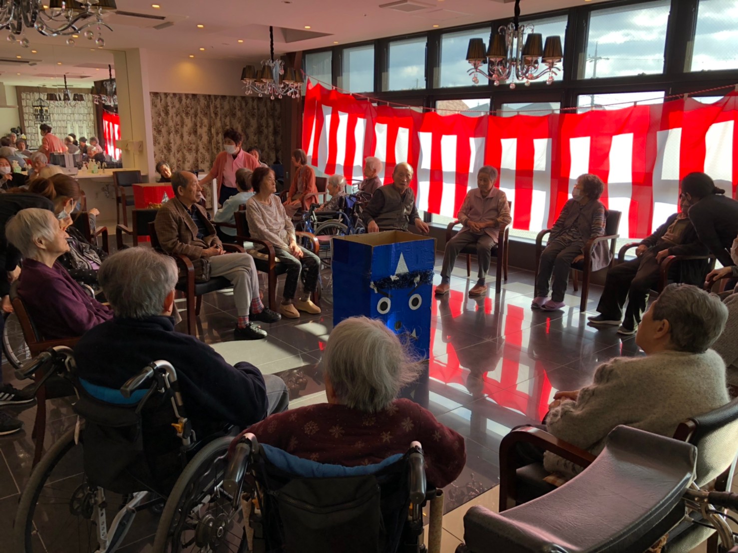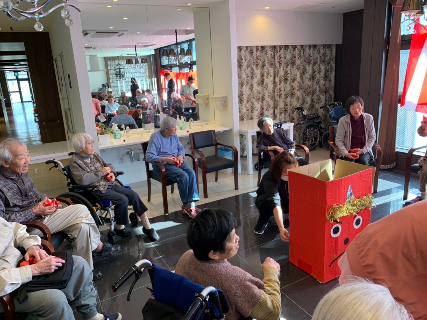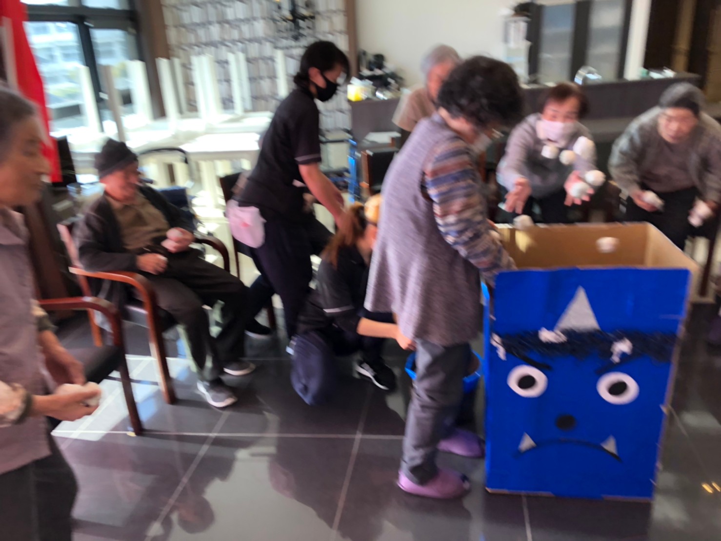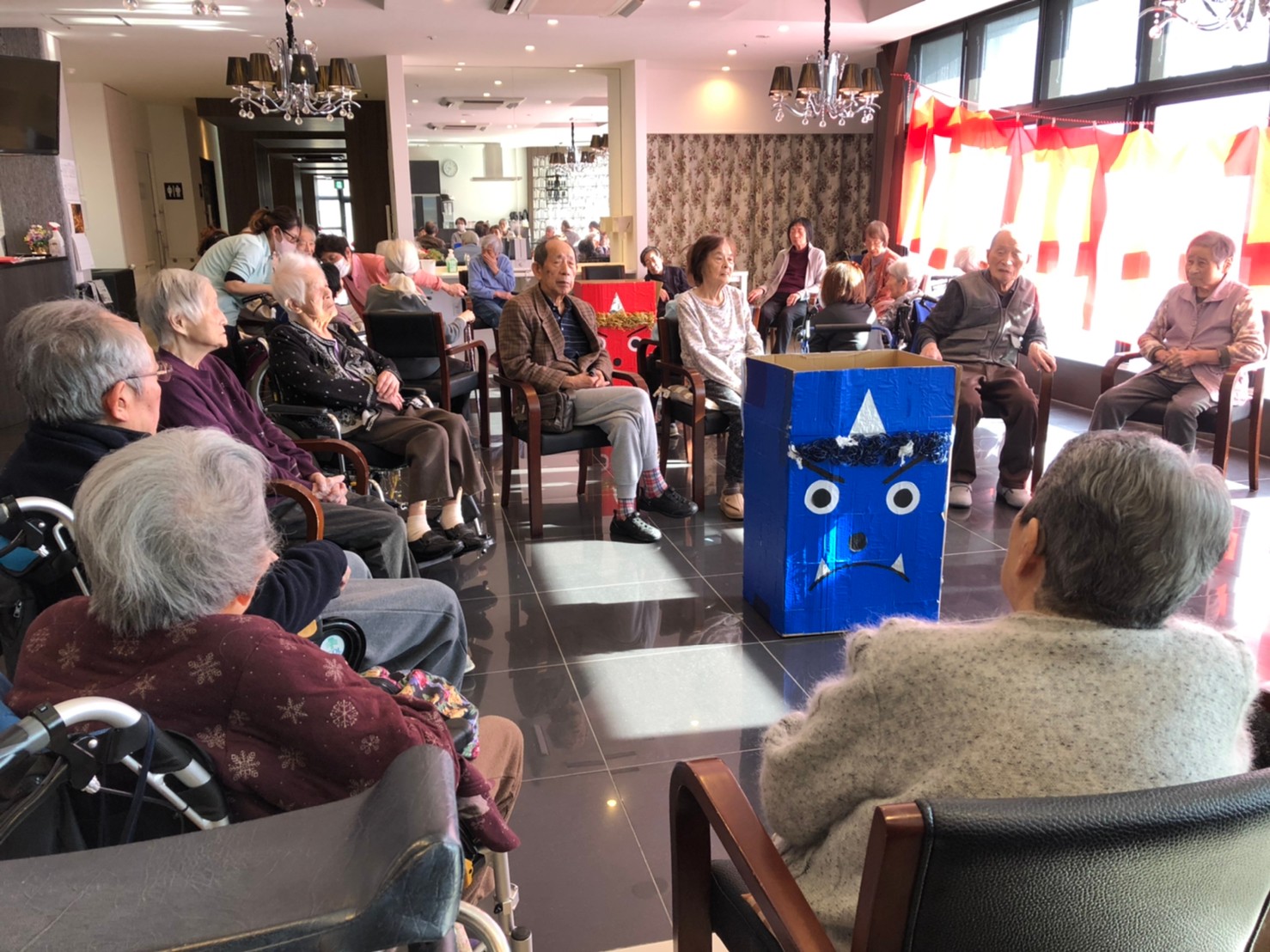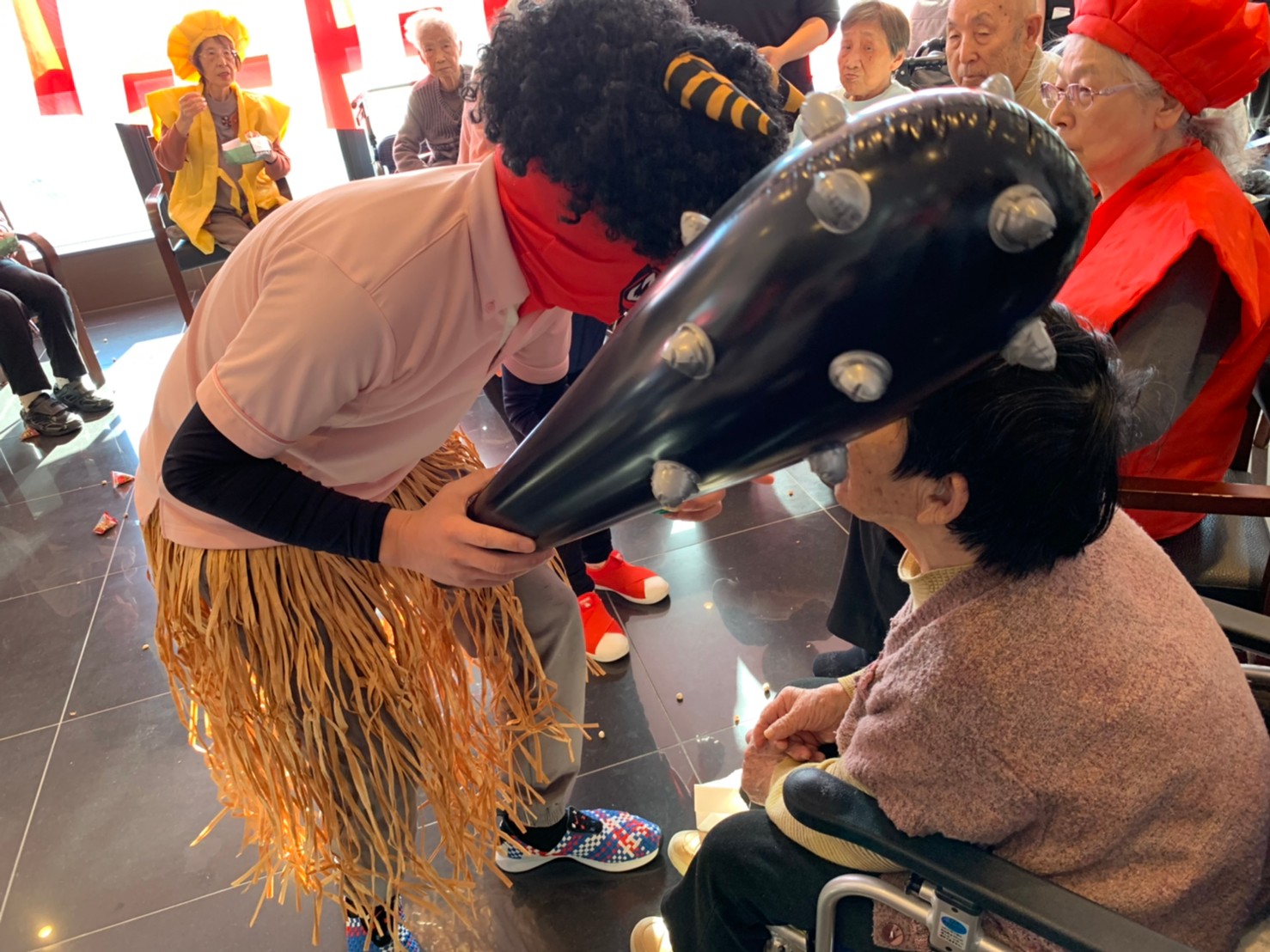 サニープレイス河瀬の月1イベントを本日開催いたしました。2月は節分祭として企画し、豆まきにちなんだミニ運動会を行いました。豆に見立てて玉入れやボーリングのピンを鬼に見立て倒しました。ちなみに玉入れに使った赤鬼のサニーちゃんと青鬼のプレイスくんは利用者さまとスタッフの共同制作です。そのあとは恒例の鬼退治です。今年から衣装も新調されたスタッフ扮する鬼に利用者さまに退治していただきました。悪さをする鬼がなぜか人気で利用者さまが握手をされました(笑)鬼の金棒は空気で膨らますビニール製ですのでご安心ください。最後はこのイベント大トリの福娘の登場です。社内選考会を何度もかさね、名誉ある今年の福娘に選ばれたスタッフが利用者さまとお一人ずつお話をしながら記念撮影をいたしました。ボクも来年の福娘選考会に応募すると言ったら、スタッフ全員から来年も鬼やで!と止められたのはここだけのお話です(‘Д’)