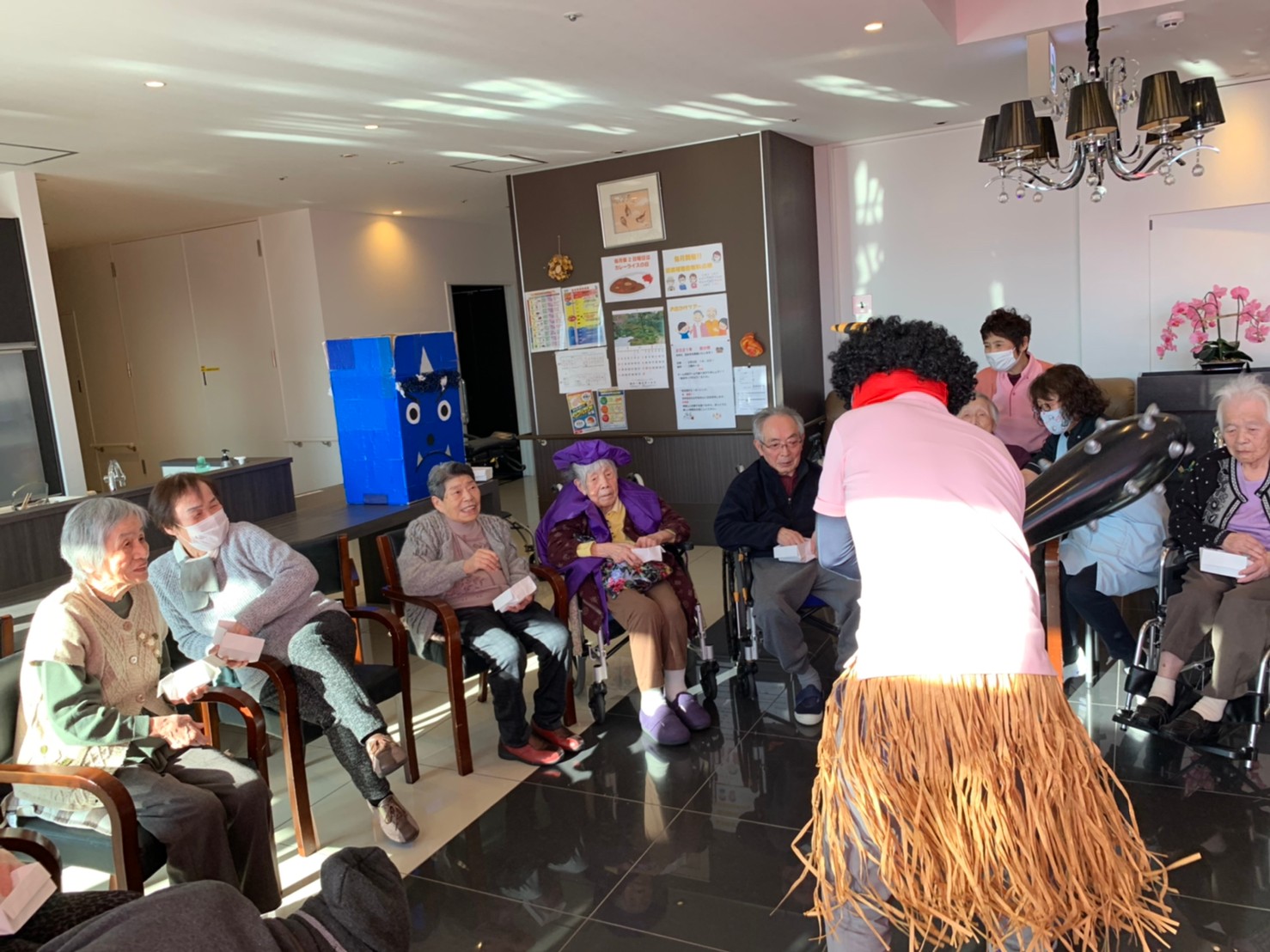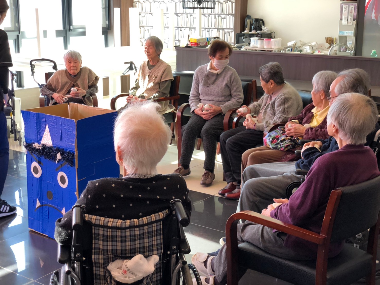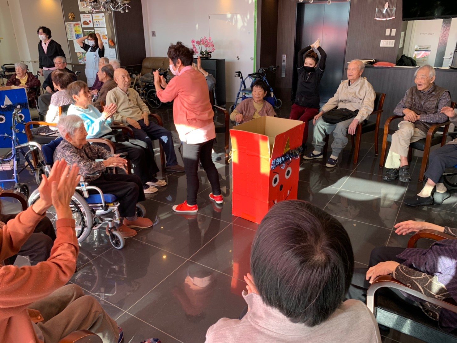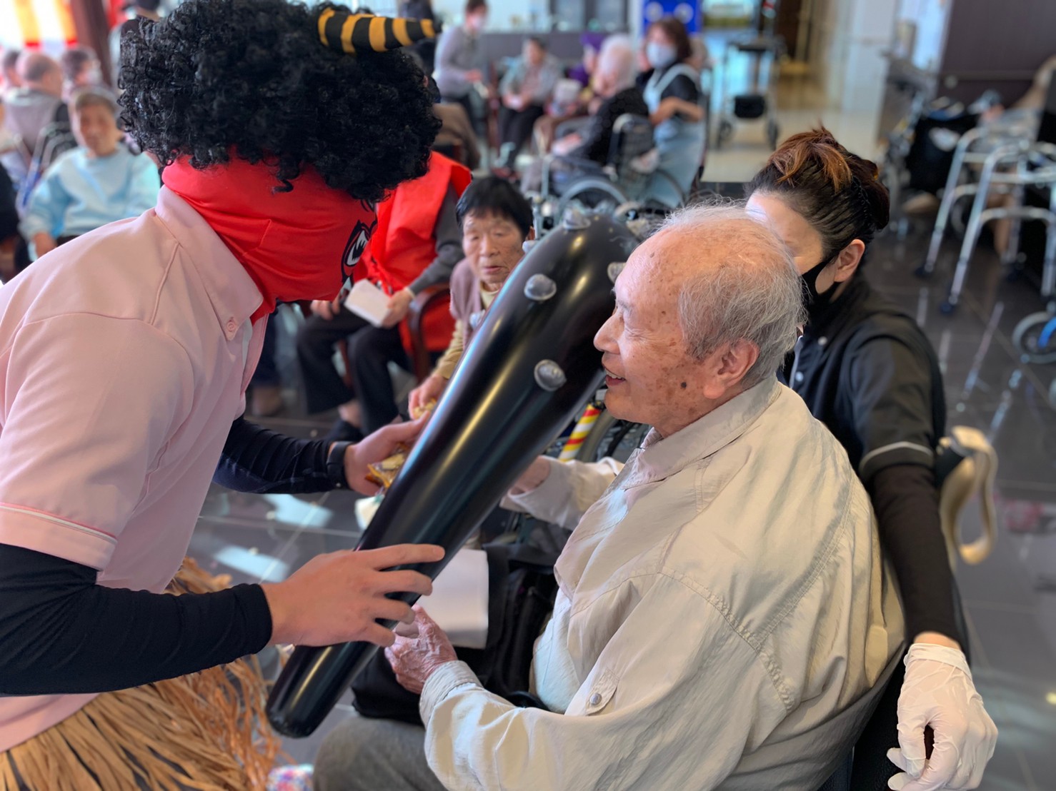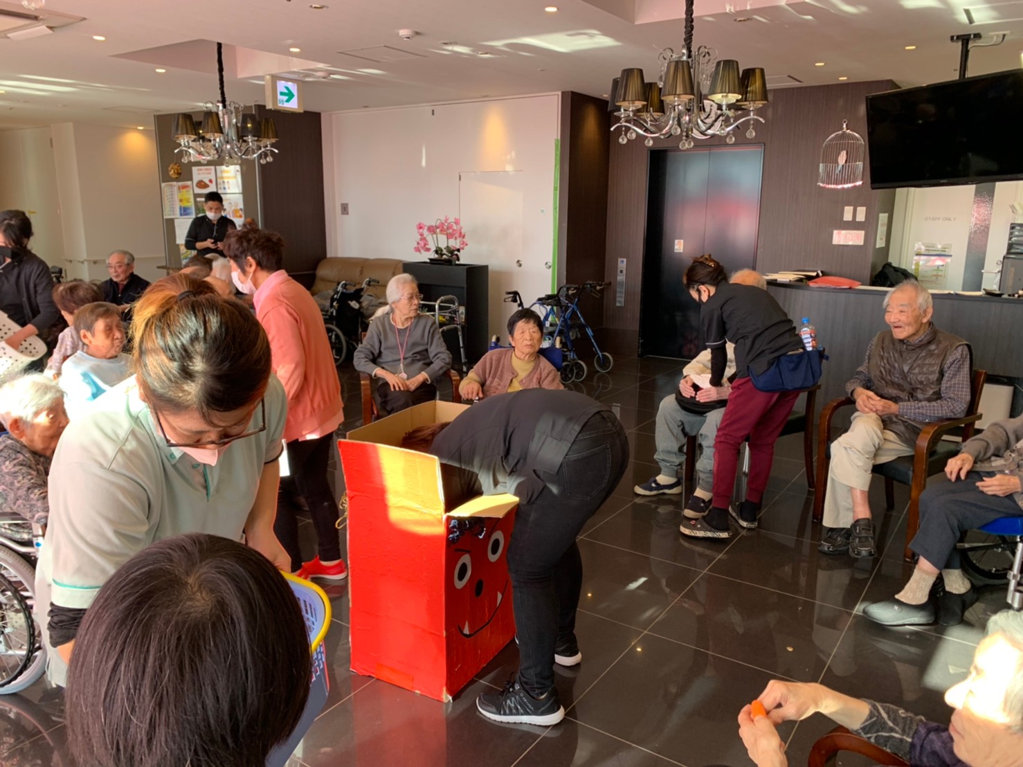 サニープレイス河瀬の月1イベントを本日開催いたしました。2月は節分祭として企画し、豆まきにちなんだミニ運動会を行いました。豆に見立てて玉入れやボーリングのピンを鬼に見立て倒しました。ちなみに玉入れに使った赤鬼のサニーちゃんと青鬼のプレイスくんは利用者さまとスタッフの共同制作です。そのあとは恒例の鬼退治です。今年から衣装も新調されたスタッフ扮する鬼に利用者さまに退治していただきました。悪さをする鬼がなぜか人気で利用者さまが握手をされました(笑)鬼の金棒は空気で膨らますビニール製ですのでご安心ください。最後はこのイベント大トリの福娘の登場です。社内選考会を何度もかさね、名誉ある今年の福娘に選ばれたスタッフが利用者さまとお一人ずつお話をしながら記念撮影をいたしました。ボクも来年の福娘選考会に応募すると言ったら、スタッフ全員から来年も鬼やで!と止められたのはここだけのお話です(‘Д’)