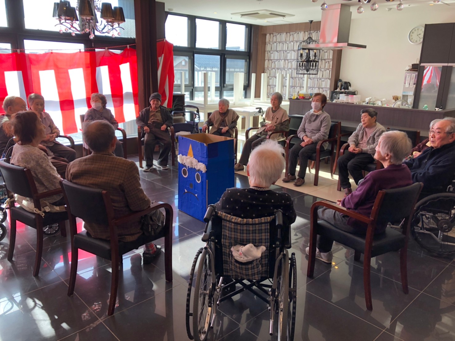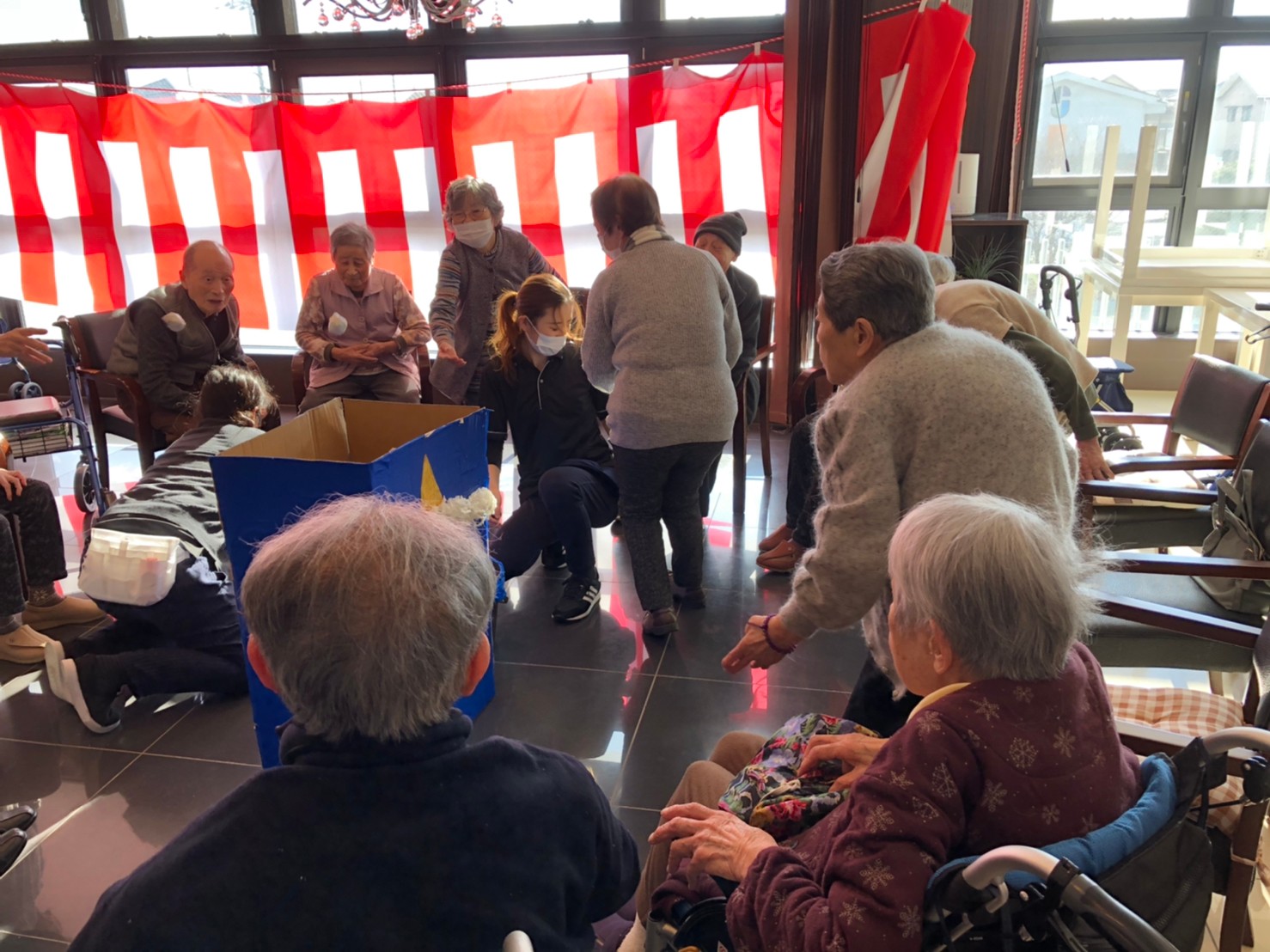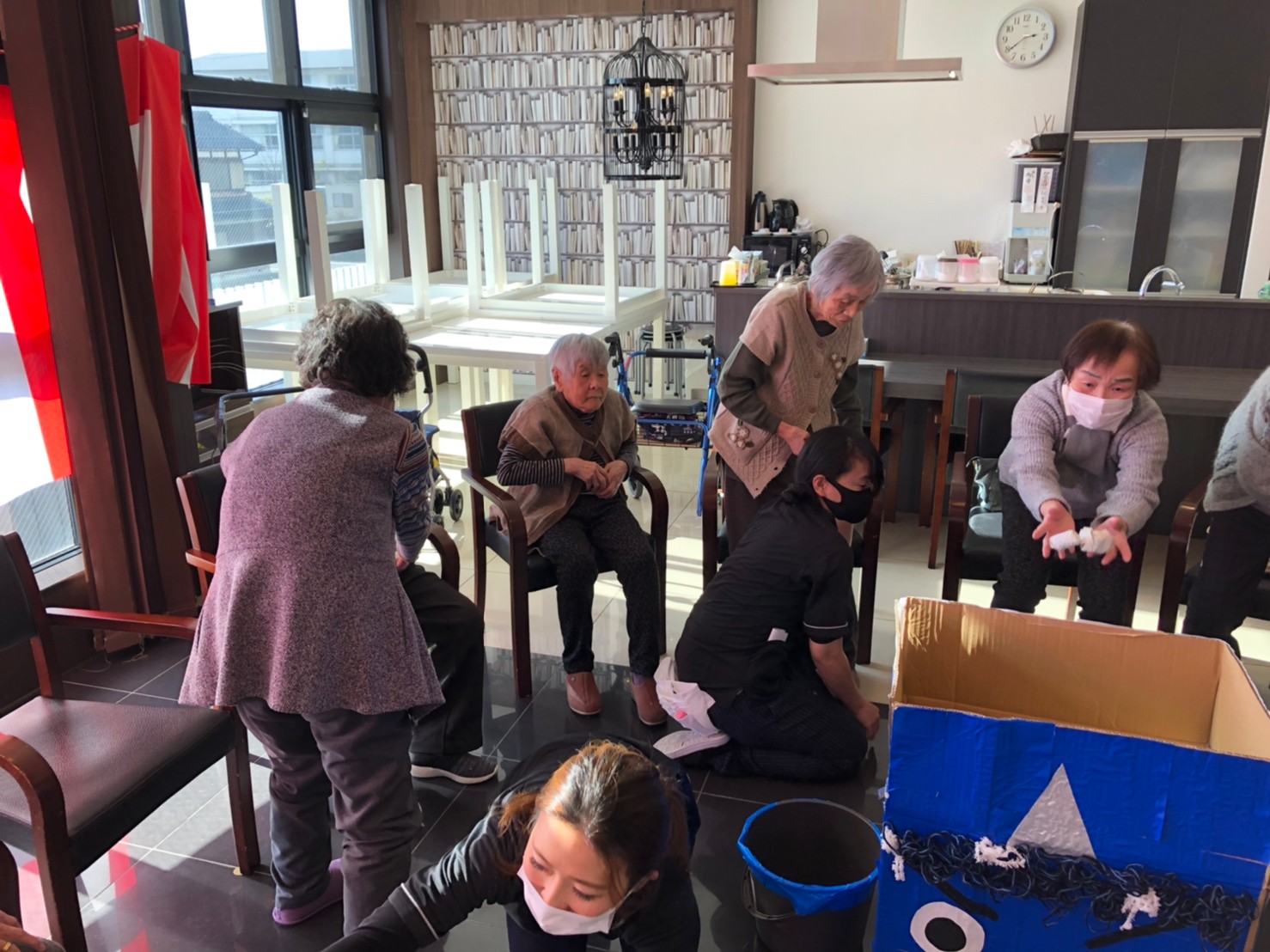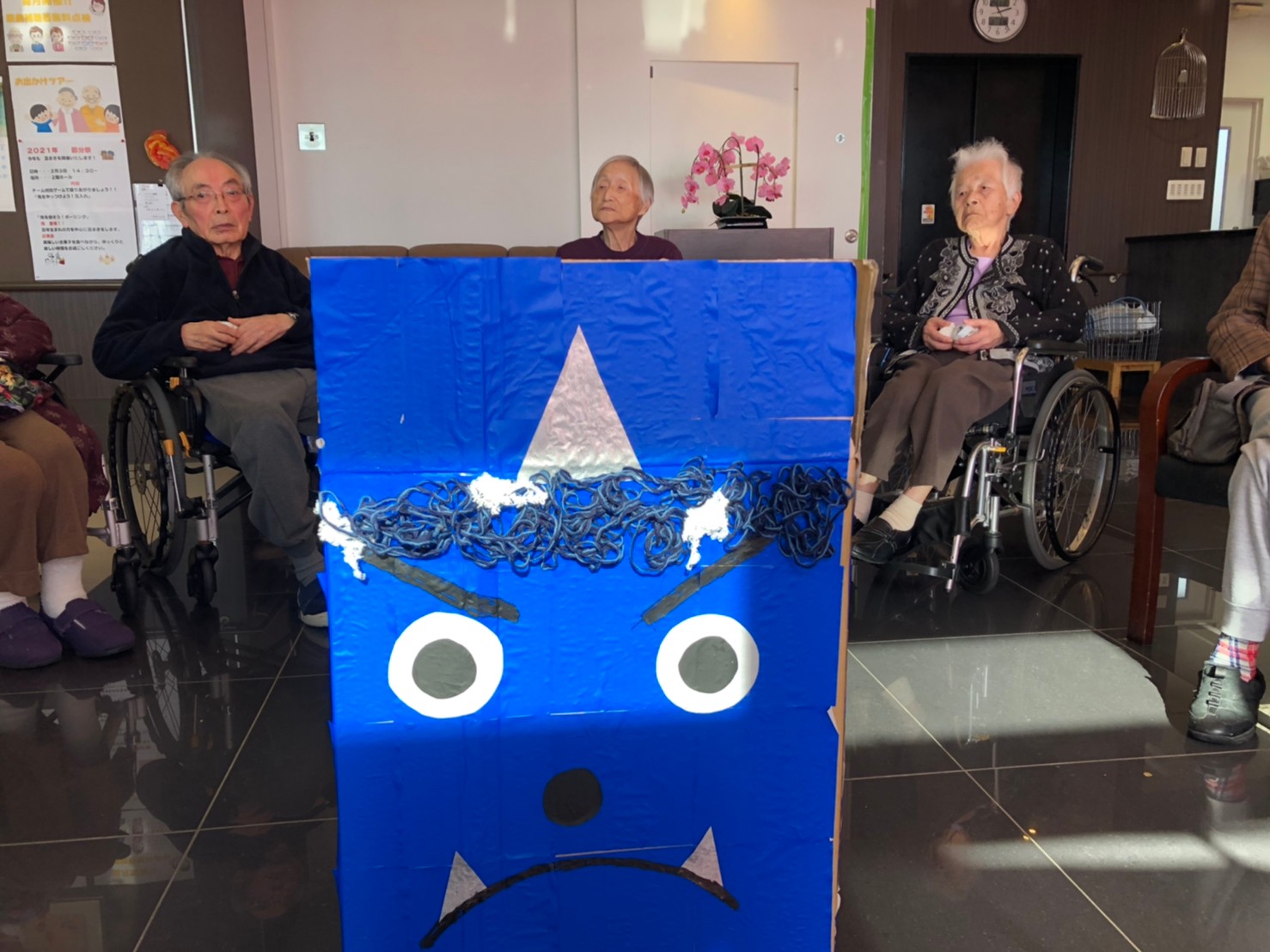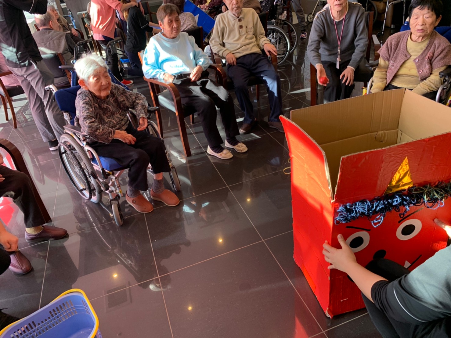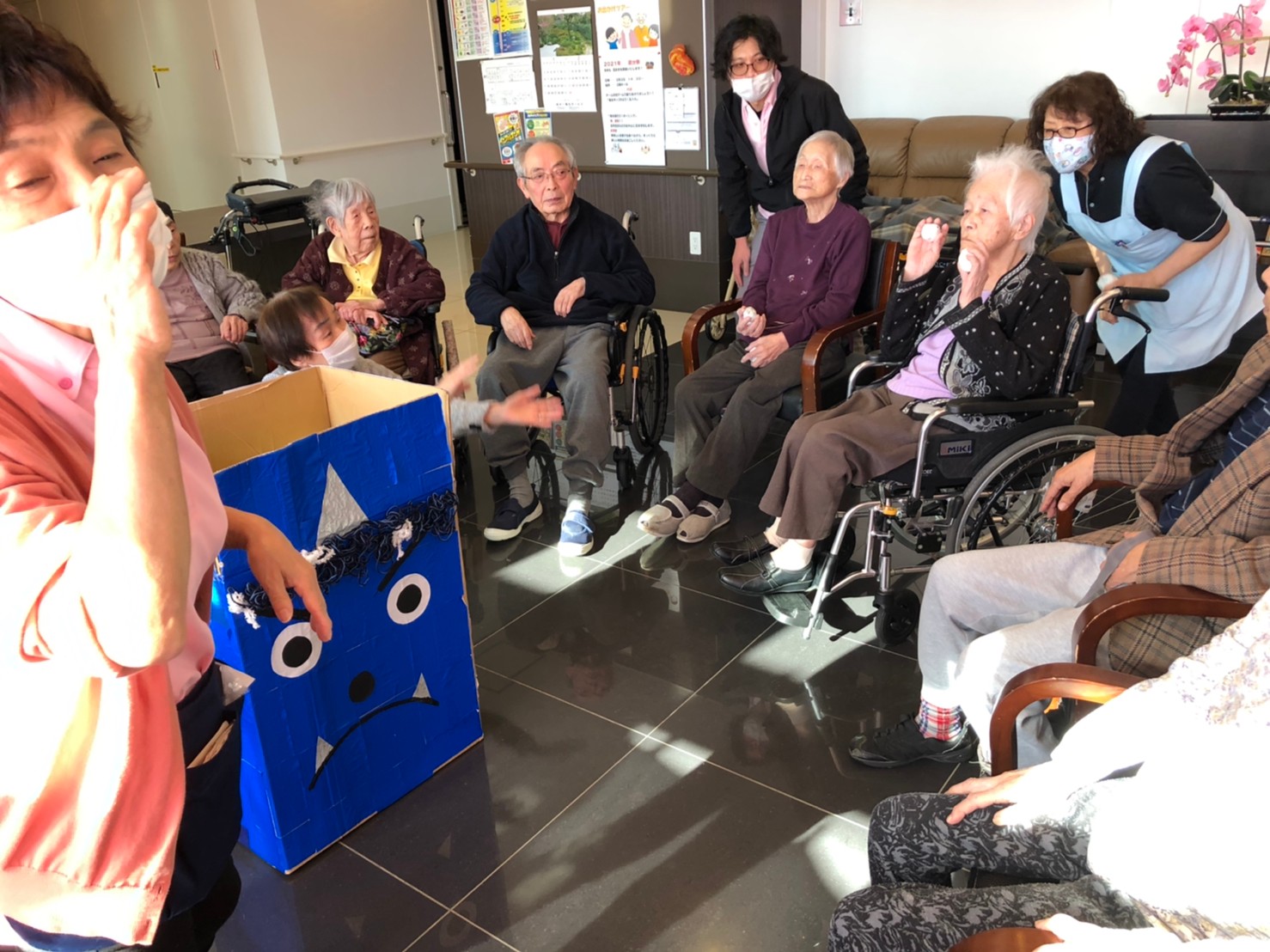 サニープレイス河瀬の月1イベントを本日開催いたしました。2月は節分祭として企画し、豆まきにちなんだミニ運動会を行いました。豆に見立てて玉入れやボーリングのピンを鬼に見立て倒しました。ちなみに玉入れに使った赤鬼のサニーちゃんと青鬼のプレイスくんは利用者さまとスタッフの共同制作です。そのあとは恒例の鬼退治です。今年から衣装も新調されたスタッフ扮する鬼に利用者さまに退治していただきました。悪さをする鬼がなぜか人気で利用者さまが握手をされました(笑)鬼の金棒は空気で膨らますビニール製ですのでご安心ください。最後はこのイベント大トリの福娘の登場です。社内選考会を何度もかさね、名誉ある今年の福娘に選ばれたスタッフが利用者さまとお一人ずつお話をしながら記念撮影をいたしました。ボクも来年の福娘選考会に応募すると言ったら、スタッフ全員から来年も鬼やで!と止められたのはここだけのお話です(‘Д’)